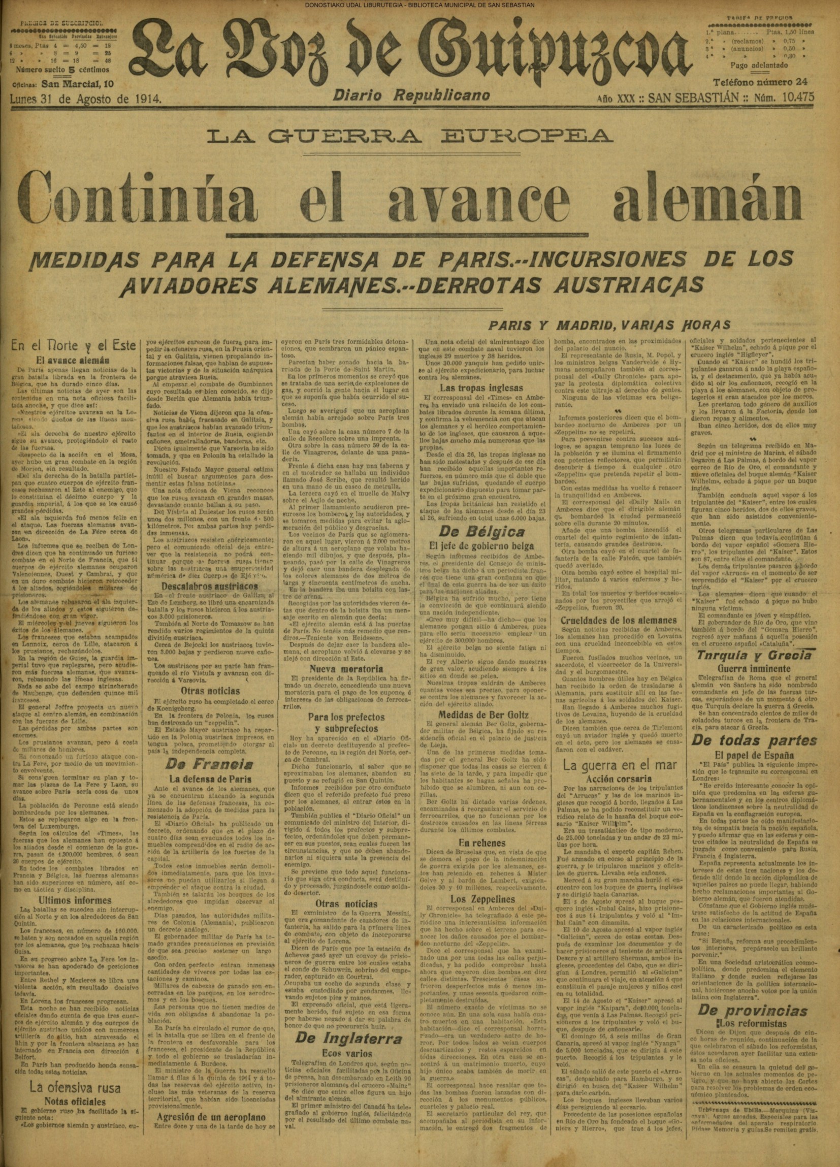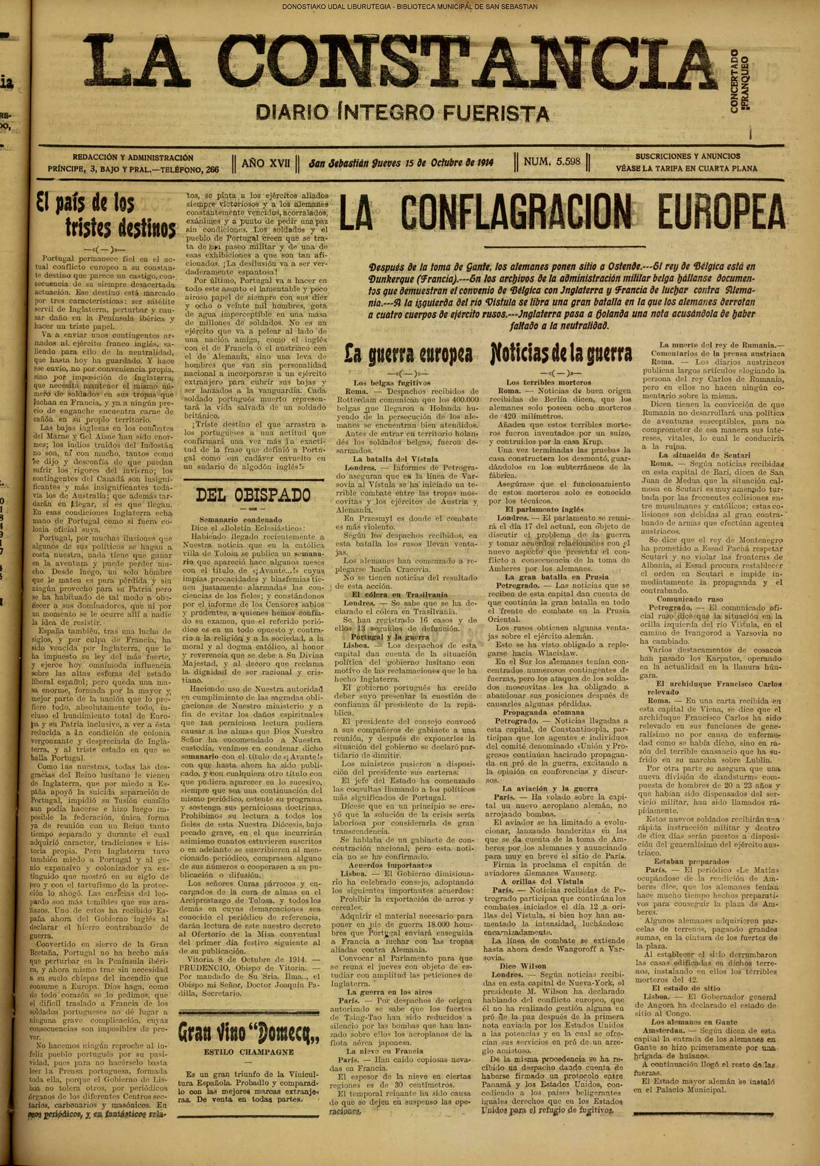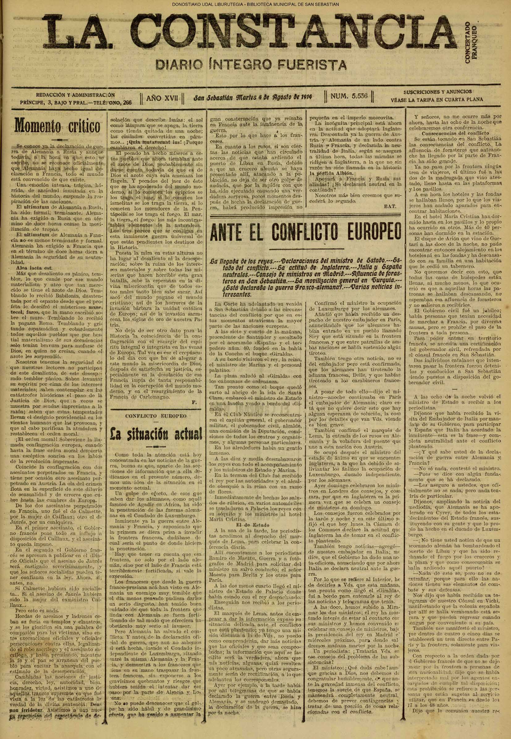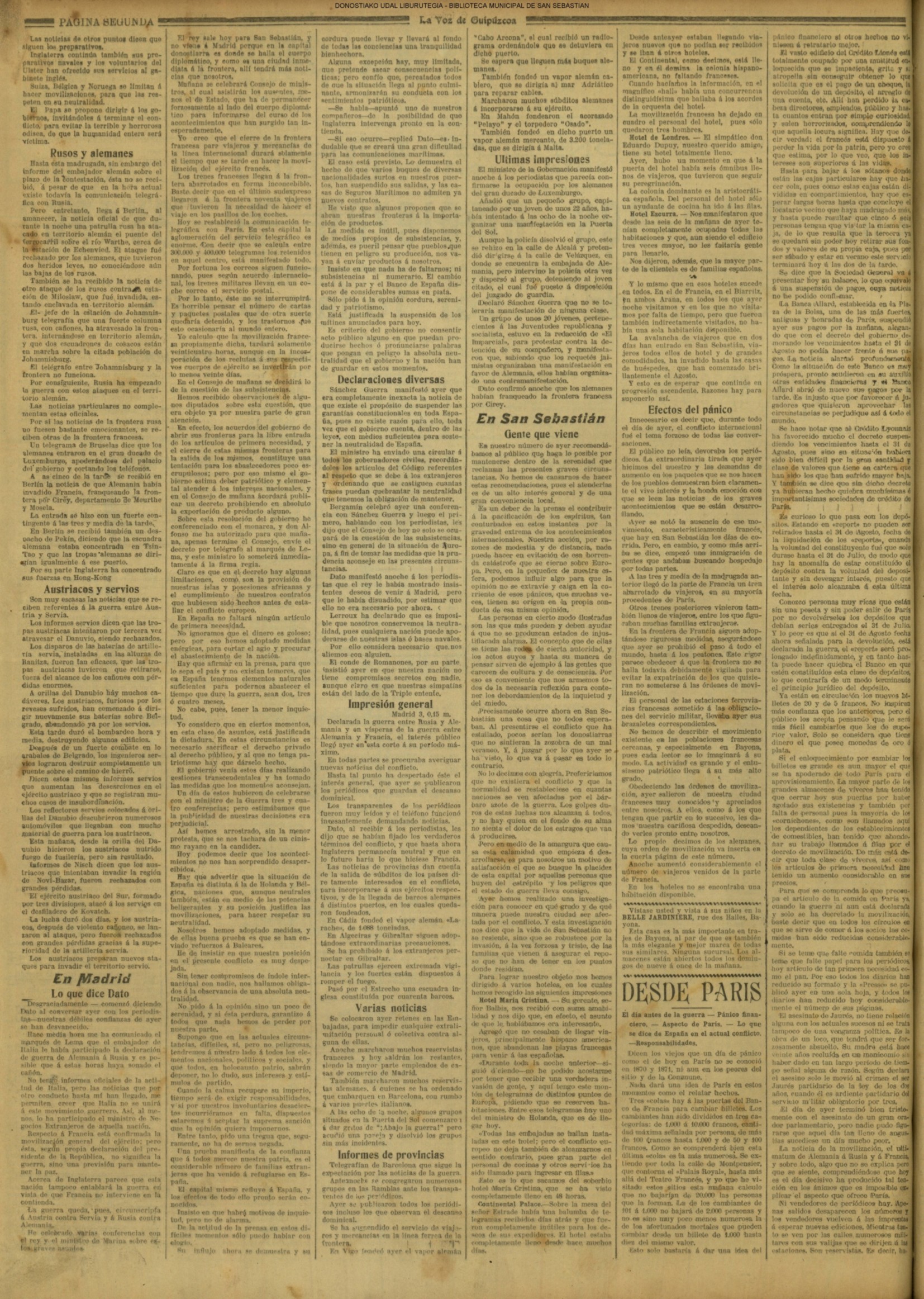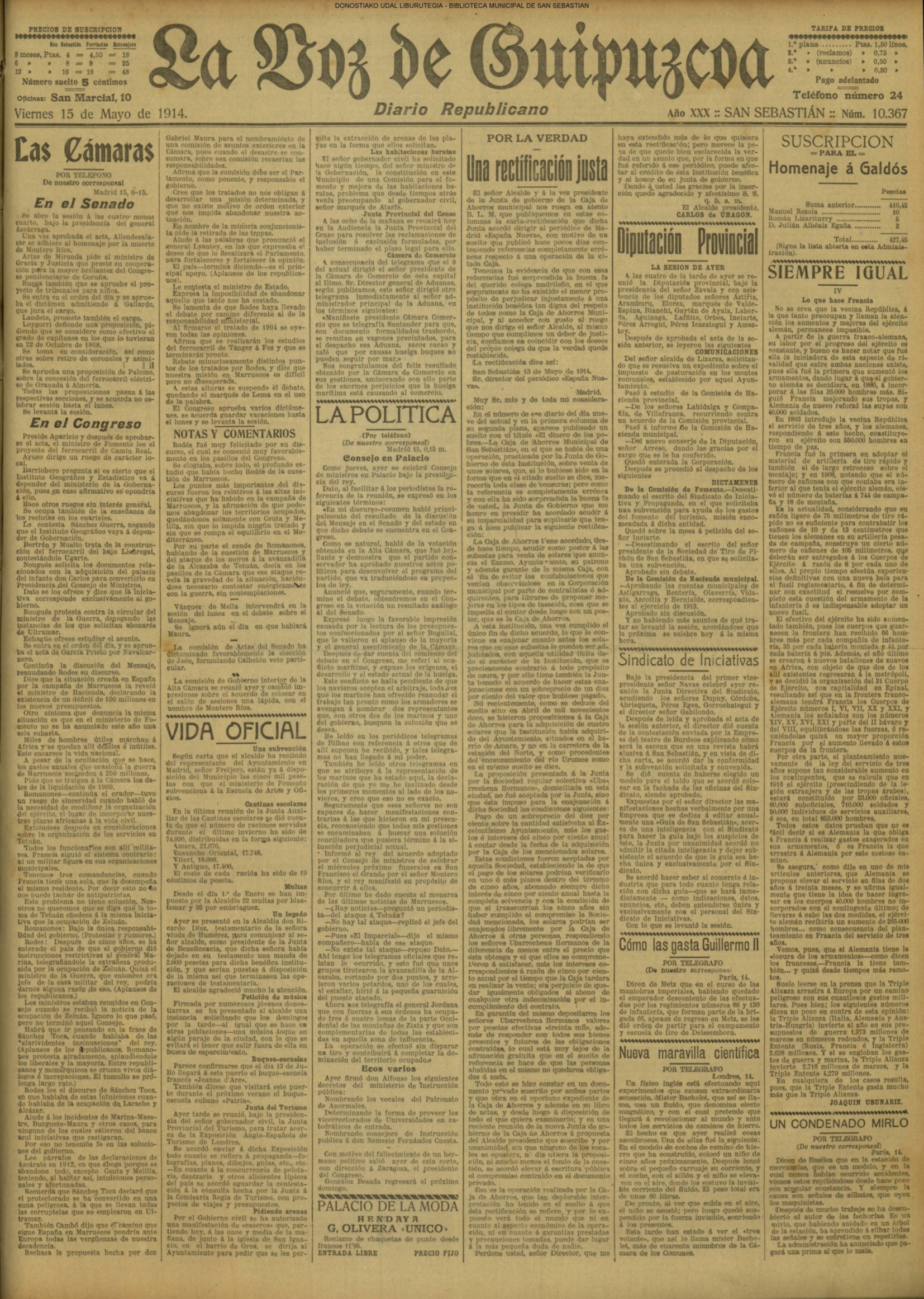 Con la venia del tiempo - que no está, ciertamente, para otorgar muchos favores - el pueblo donostiarra se entregará hoy a las alegrias propias de la fiesta de su patrón y de su nombre : ¡San Sebastián! Un motivo de duelo suprime este año la clásica tamborrada; pero no por eso faltarán festejos que puedan divertir a los vecinos..... que tengan humor para ello. A las diez de la mañana, la banda municipal recorrerá las calles de la ciudad, tocando diana. Se lanzarán también cohetes en la abundancia que se pueda. A las diez y media, el Ayuntamiento en corporación y con maceros, se dirigira a la iglesia de Santa María para asistir a la misa mayor. A las once se verificará el acto de descubrir la lápida colocada en la casa donde vivió el maestro donostiarra Sarriegui. La comitiva saldrá de la Plaza de la Constitución, forméndola representaciones de todas las sociedades de recreo y elementos populares. Irá también la Comisión de Fomento y marcharán a la cabeza el Orfeón Donostiarra y la Banda Municipal, ejecutando ésta durante el trayecto la gran marcha de Gounod. Al descubrirse la lápida cantará el Orfeón la célebre composición vasca del malogrado maestro, titulada "Illunabarra", y la banda ejecutará la marcha de San Sebastián. La Comisión de Fomento estará representada por los señores Nerecán, Pena, Kutz, Saralegui y Delaunet. El señor Nerecán hará uso de la palabra y pronunciará un discurso alusivo al acto. La Sociedad recreativa "Euskal-billera" que se halla situada frente a la casa donde se coloca la lápida, como homenaje al finado maestro, pone a disposición de la comisión municipal su sala, y estará debidamente engalanada, con colgaduras con fleco negro y bandera a media asta con crespón de luto. En el salón de esta popular sociedad se hallarán todos los miembros de la Junta de Festejos, ostentando las nuevas insignias de la asociación. Luego se verificará el regreso en el mismo orden. A las nueve de la noche, se verificará el gran banquete tradicional en la veterana Sociedad donostiarra "Unión Artesana" siendo presidido por el alcalde señor Uhagón. De nueve a once la banda "Iru-chulo" amenizará la plazuela de Lasala, y a las mismas horas lo hará la denominada "La Armonía", en la Plaza de la Constitución. Habrá, claro está, iluminaciones y baile, y cuanto se pida dentro de lo que se pueda dar. Se dará rancho extraordinario a los presos de la cárcel.