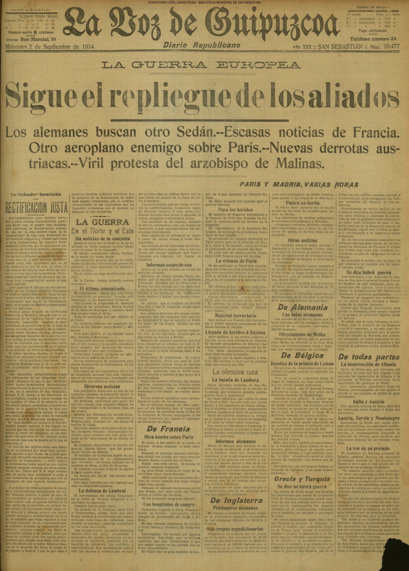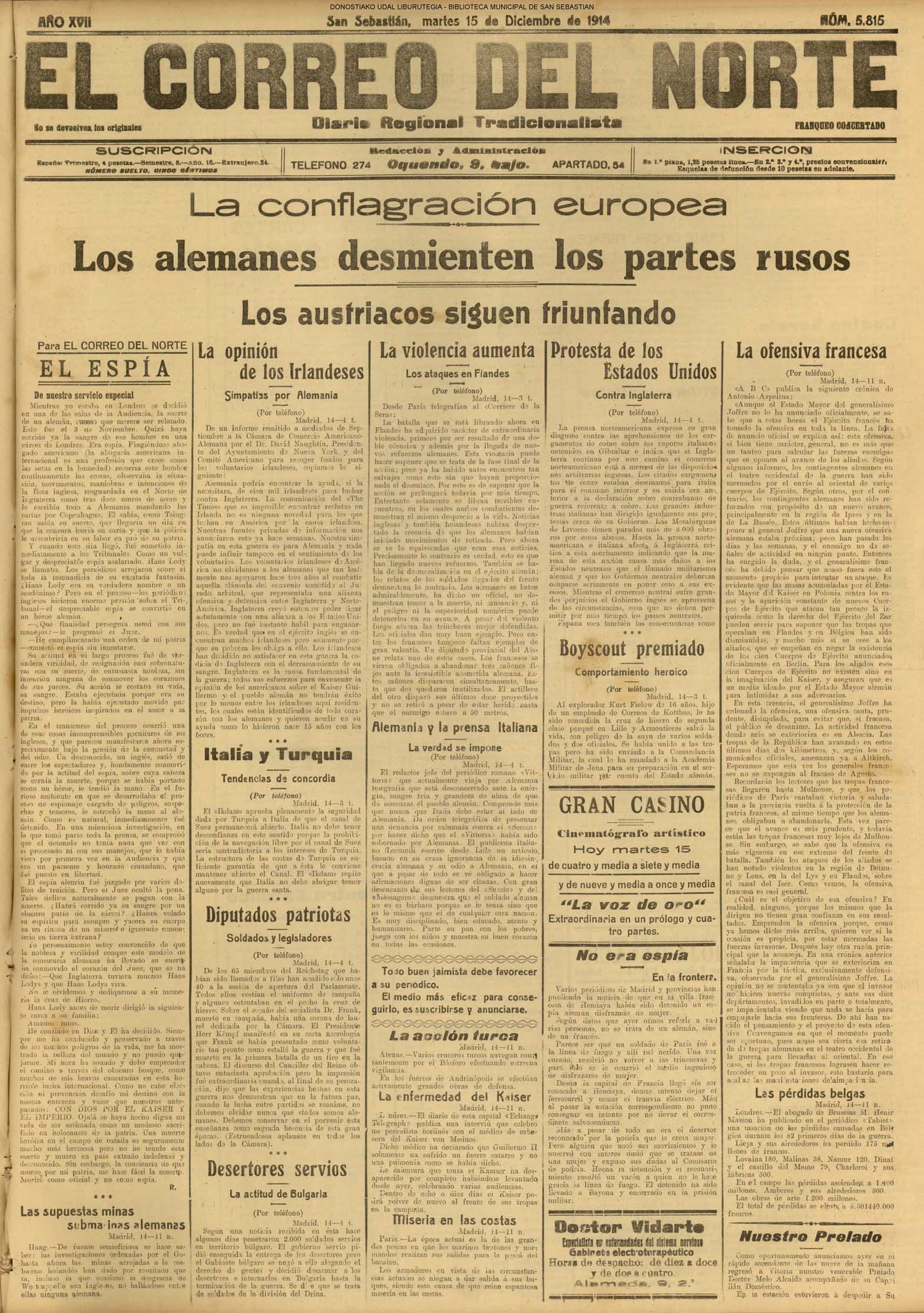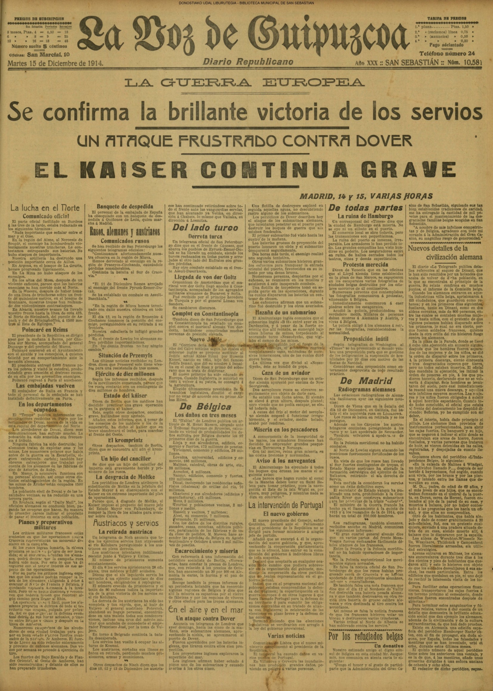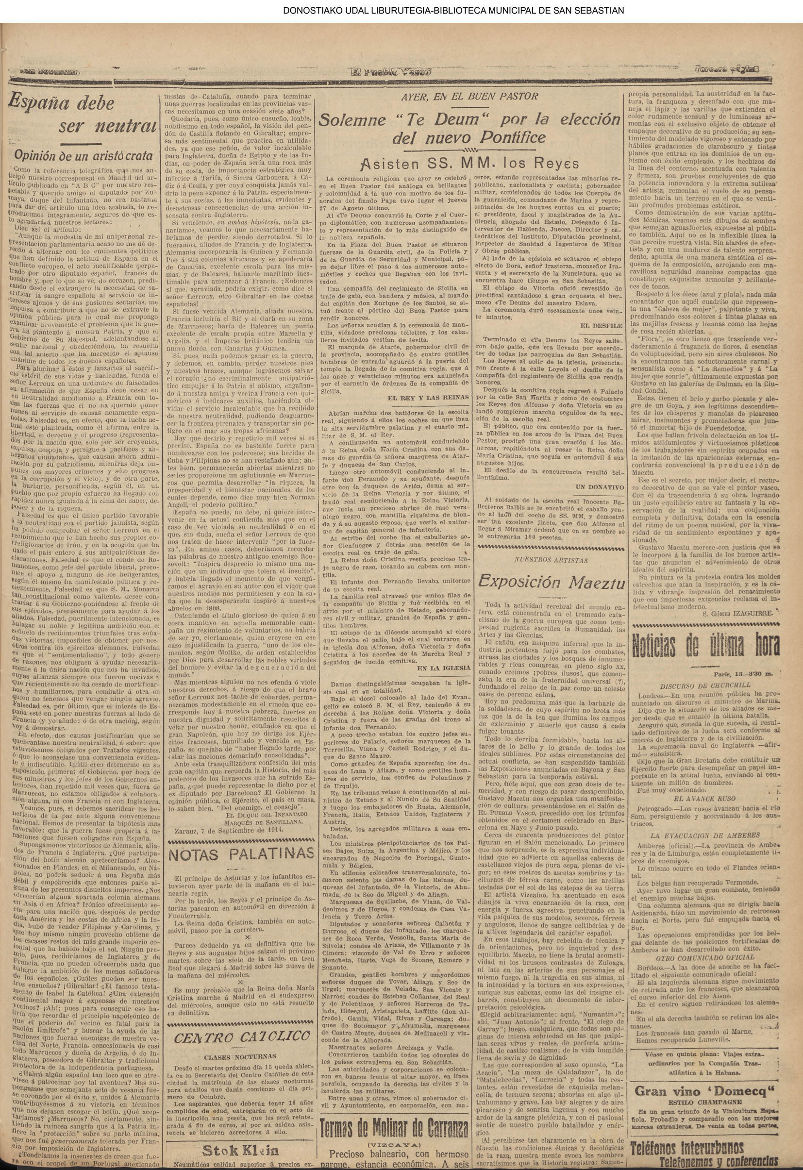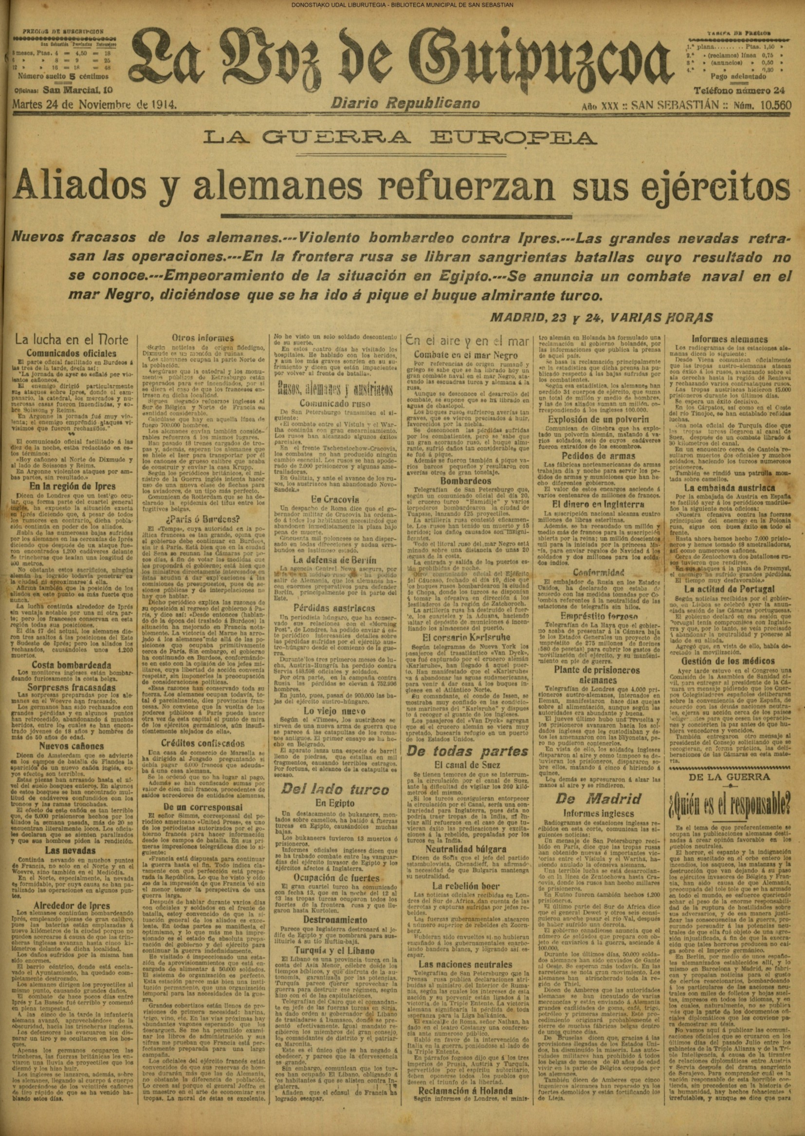 Con la venia del tiempo - que no está, ciertamente, para otorgar muchos favores - el pueblo donostiarra se entregará hoy a las alegrias propias de la fiesta de su patrón y de su nombre : ¡San Sebastián! Un motivo de duelo suprime este año la clásica tamborrada; pero no por eso faltarán festejos que puedan divertir a los vecinos..... que tengan humor para ello. A las diez de la mañana, la banda municipal recorrerá las calles de la ciudad, tocando diana. Se lanzarán también cohetes en la abundancia que se pueda. A las diez y media, el Ayuntamiento en corporación y con maceros, se dirigira a la iglesia de Santa María para asistir a la misa mayor. A las once se verificará el acto de descubrir la lápida colocada en la casa donde vivió el maestro donostiarra Sarriegui. La comitiva saldrá de la Plaza de la Constitución, forméndola representaciones de todas las sociedades de recreo y elementos populares. Irá también la Comisión de Fomento y marcharán a la cabeza el Orfeón Donostiarra y la Banda Municipal, ejecutando ésta durante el trayecto la gran marcha de Gounod. Al descubrirse la lápida cantará el Orfeón la célebre composición vasca del malogrado maestro, titulada "Illunabarra", y la banda ejecutará la marcha de San Sebastián. La Comisión de Fomento estará representada por los señores Nerecán, Pena, Kutz, Saralegui y Delaunet. El señor Nerecán hará uso de la palabra y pronunciará un discurso alusivo al acto. La Sociedad recreativa "Euskal-billera" que se halla situada frente a la casa donde se coloca la lápida, como homenaje al finado maestro, pone a disposición de la comisión municipal su sala, y estará debidamente engalanada, con colgaduras con fleco negro y bandera a media asta con crespón de luto. En el salón de esta popular sociedad se hallarán todos los miembros de la Junta de Festejos, ostentando las nuevas insignias de la asociación. Luego se verificará el regreso en el mismo orden. A las nueve de la noche, se verificará el gran banquete tradicional en la veterana Sociedad donostiarra "Unión Artesana" siendo presidido por el alcalde señor Uhagón. De nueve a once la banda "Iru-chulo" amenizará la plazuela de Lasala, y a las mismas horas lo hará la denominada "La Armonía", en la Plaza de la Constitución. Habrá, claro está, iluminaciones y baile, y cuanto se pida dentro de lo que se pueda dar. Se dará rancho extraordinario a los presos de la cárcel.