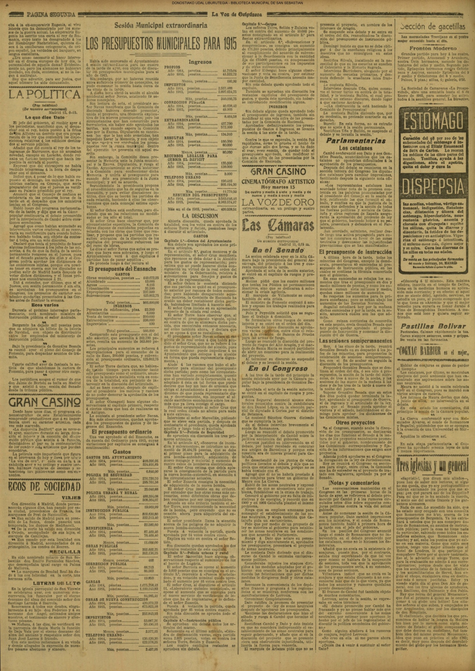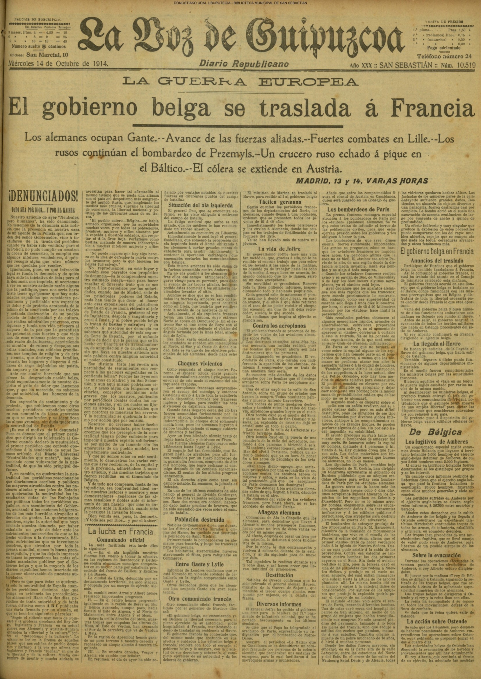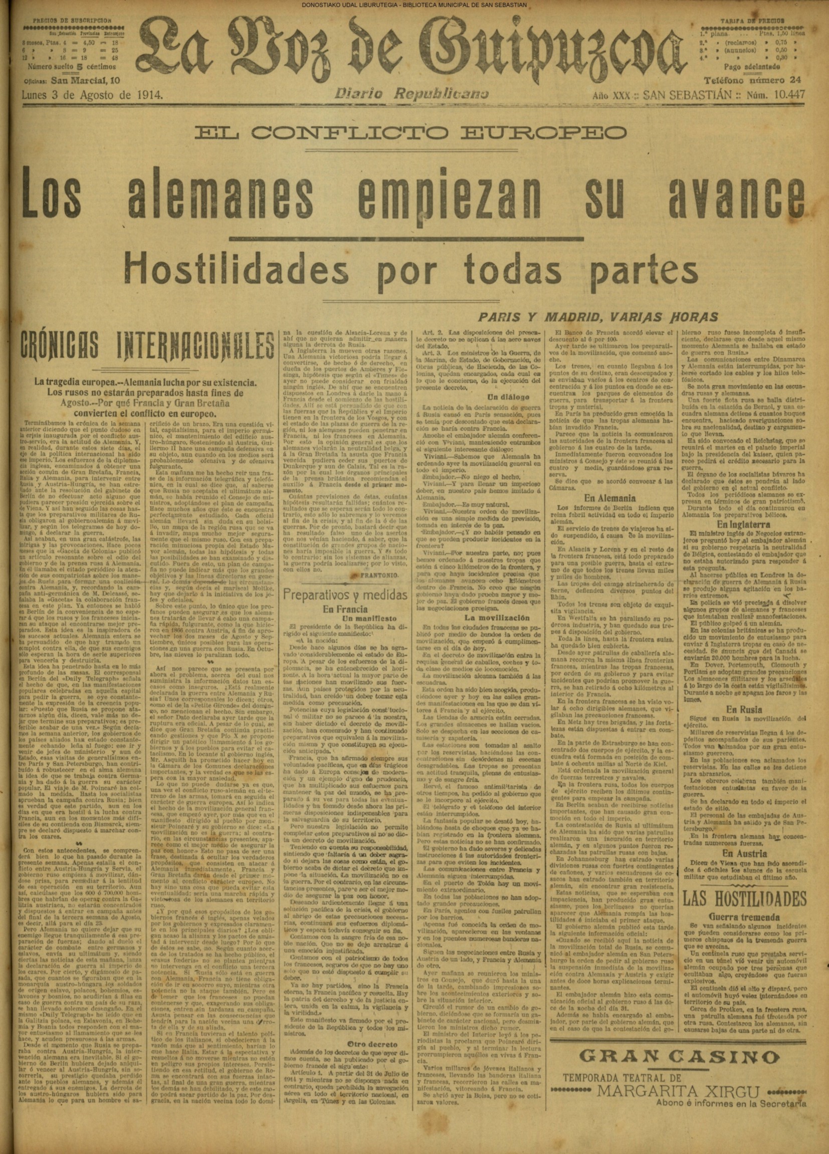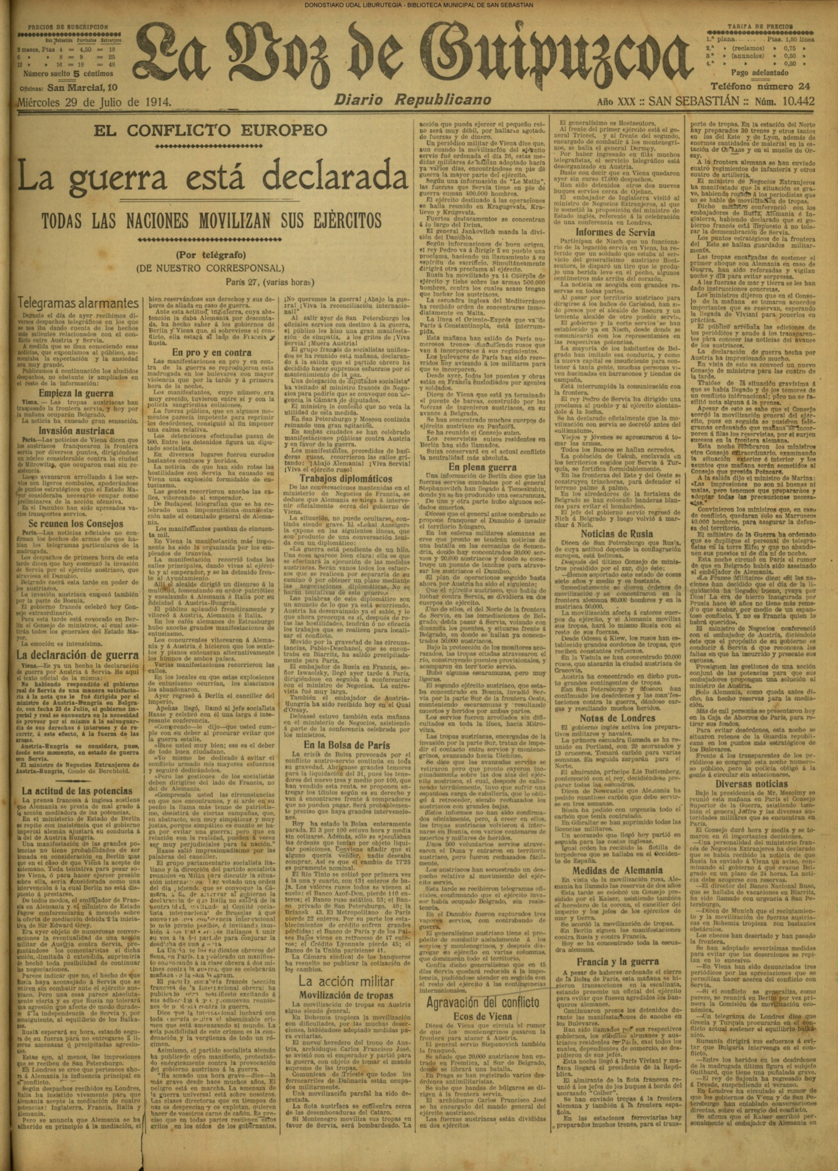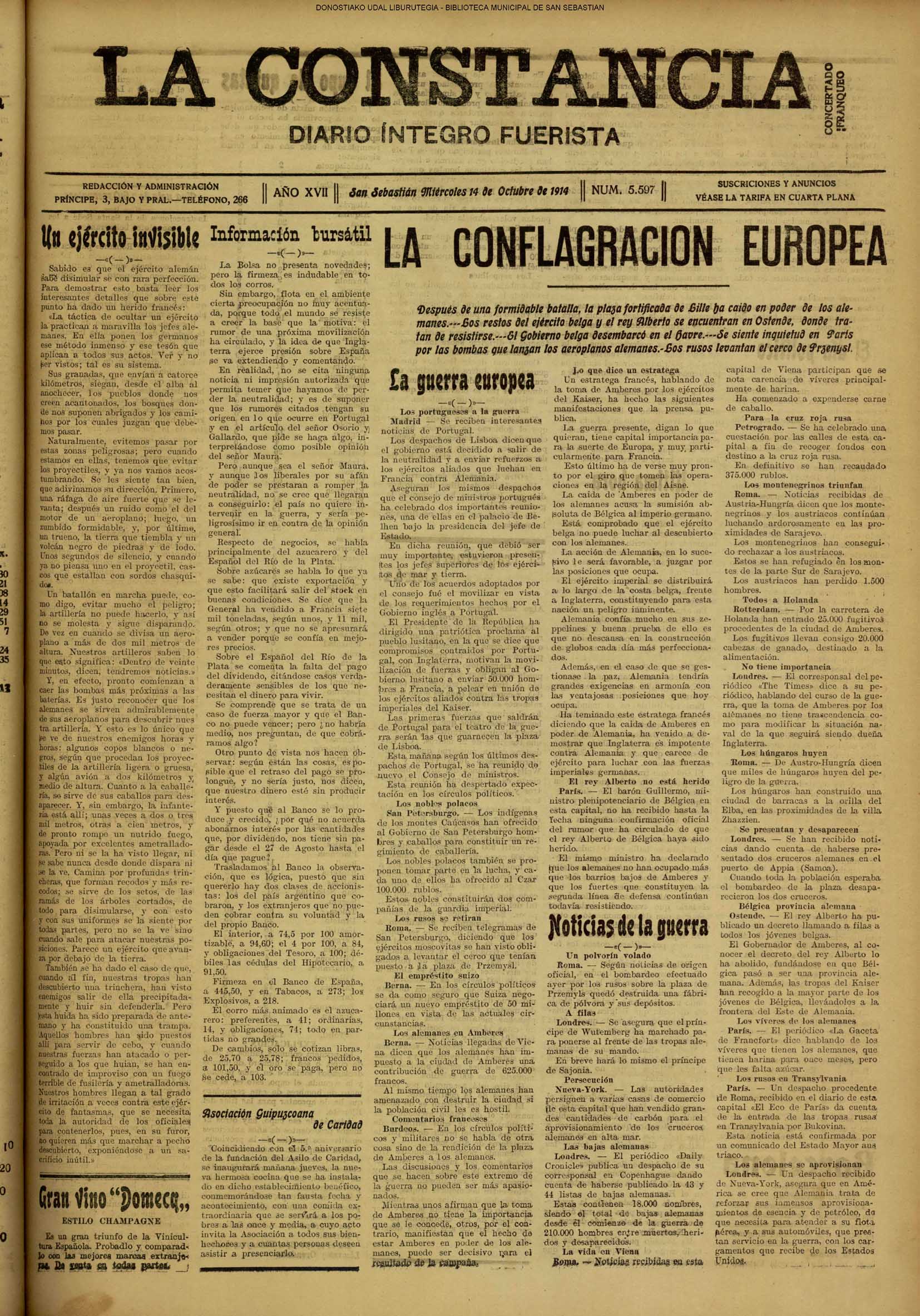 Con la venia del tiempo - que no está, ciertamente, para otorgar muchos favores - el pueblo donostiarra se entregará hoy a las alegrias propias de la fiesta de su patrón y de su nombre : ¡San Sebastián! Un motivo de duelo suprime este año la clásica tamborrada; pero no por eso faltarán festejos que puedan divertir a los vecinos..... que tengan humor para ello. A las diez de la mañana, la banda municipal recorrerá las calles de la ciudad, tocando diana. Se lanzarán también cohetes en la abundancia que se pueda. A las diez y media, el Ayuntamiento en corporación y con maceros, se dirigira a la iglesia de Santa María para asistir a la misa mayor. A las once se verificará el acto de descubrir la lápida colocada en la casa donde vivió el maestro donostiarra Sarriegui. La comitiva saldrá de la Plaza de la Constitución, forméndola representaciones de todas las sociedades de recreo y elementos populares. Irá también la Comisión de Fomento y marcharán a la cabeza el Orfeón Donostiarra y la Banda Municipal, ejecutando ésta durante el trayecto la gran marcha de Gounod. Al descubrirse la lápida cantará el Orfeón la célebre composición vasca del malogrado maestro, titulada "Illunabarra", y la banda ejecutará la marcha de San Sebastián. La Comisión de Fomento estará representada por los señores Nerecán, Pena, Kutz, Saralegui y Delaunet. El señor Nerecán hará uso de la palabra y pronunciará un discurso alusivo al acto. La Sociedad recreativa "Euskal-billera" que se halla situada frente a la casa donde se coloca la lápida, como homenaje al finado maestro, pone a disposición de la comisión municipal su sala, y estará debidamente engalanada, con colgaduras con fleco negro y bandera a media asta con crespón de luto. En el salón de esta popular sociedad se hallarán todos los miembros de la Junta de Festejos, ostentando las nuevas insignias de la asociación. Luego se verificará el regreso en el mismo orden. A las nueve de la noche, se verificará el gran banquete tradicional en la veterana Sociedad donostiarra "Unión Artesana" siendo presidido por el alcalde señor Uhagón. De nueve a once la banda "Iru-chulo" amenizará la plazuela de Lasala, y a las mismas horas lo hará la denominada "La Armonía", en la Plaza de la Constitución. Habrá, claro está, iluminaciones y baile, y cuanto se pida dentro de lo que se pueda dar. Se dará rancho extraordinario a los presos de la cárcel.