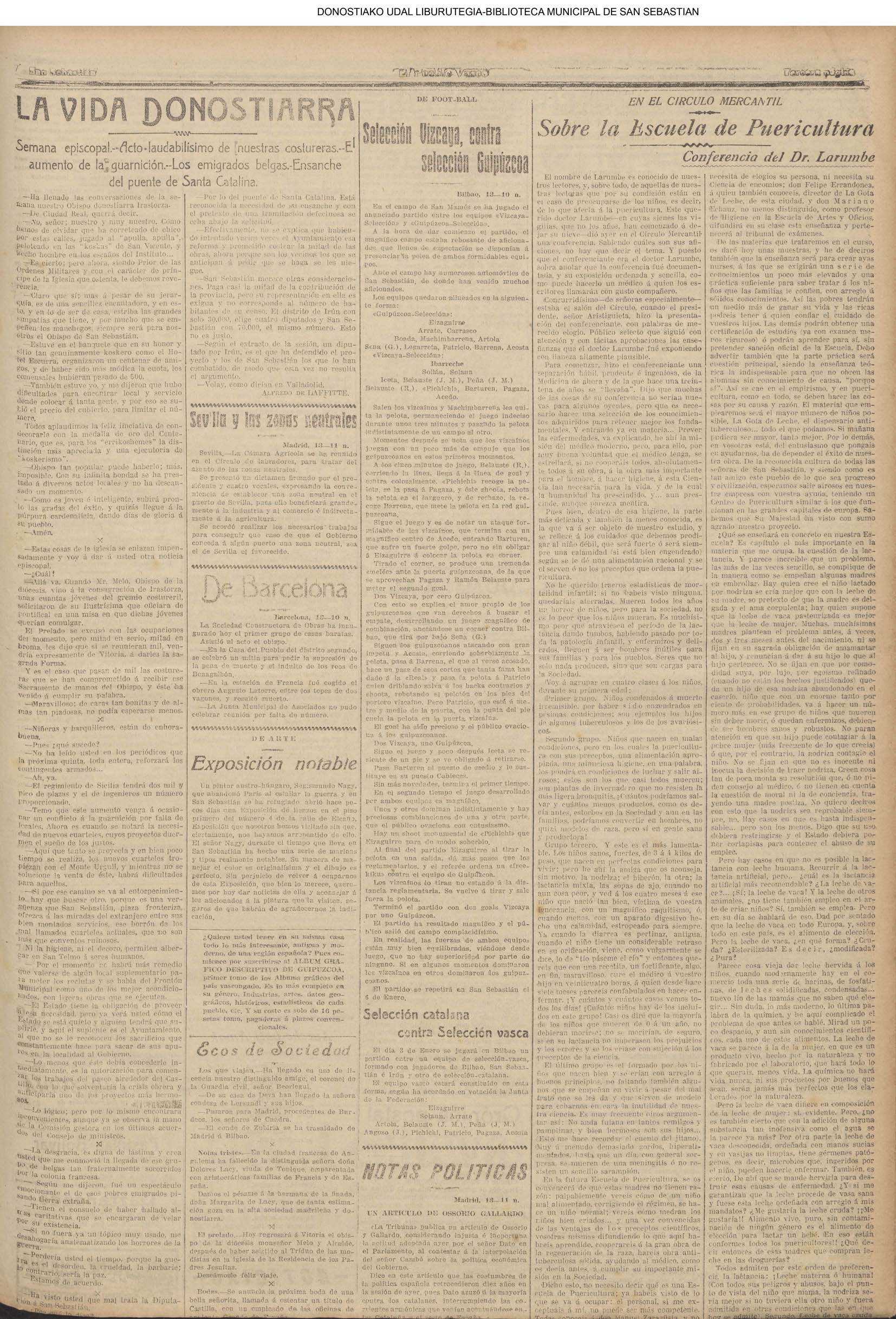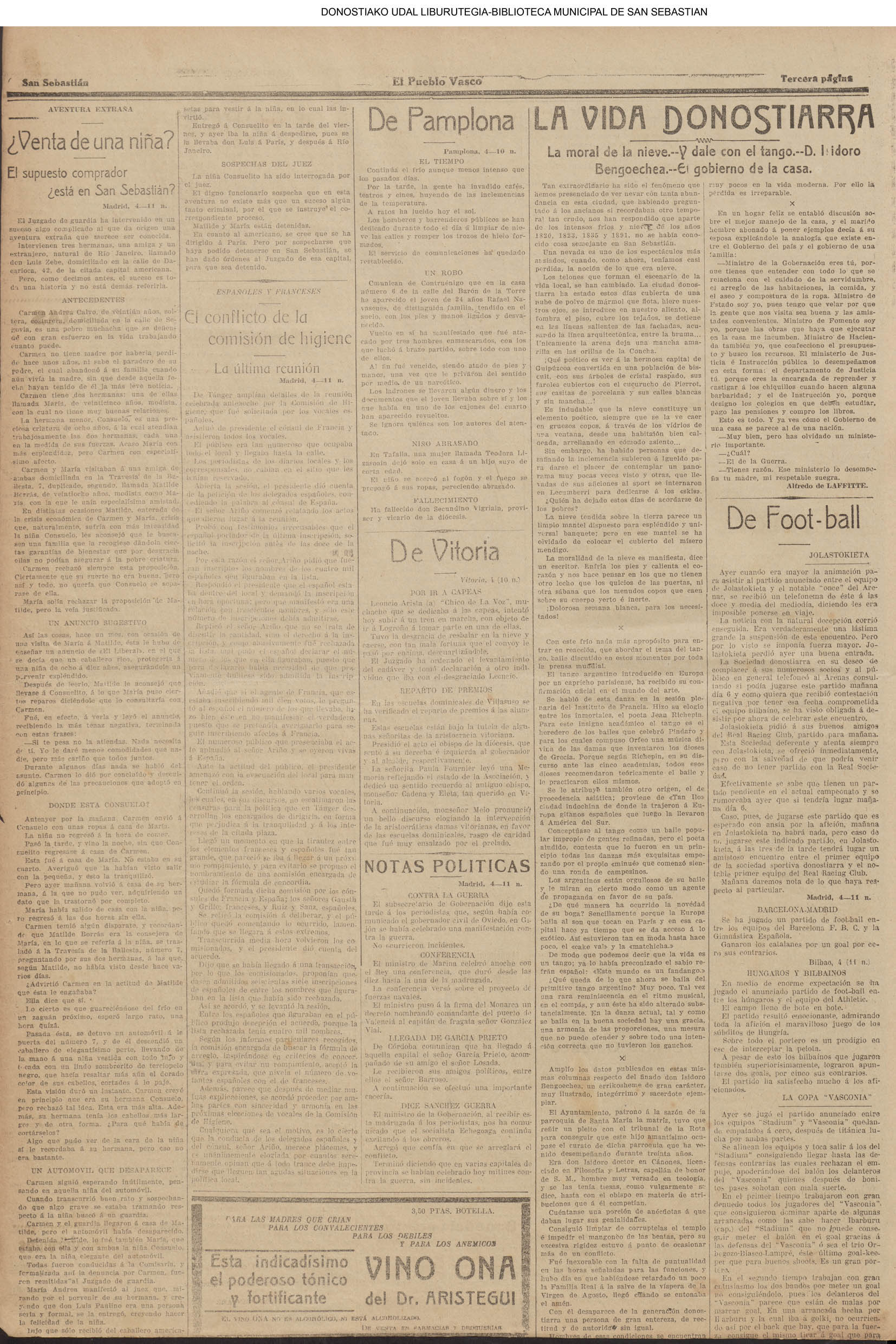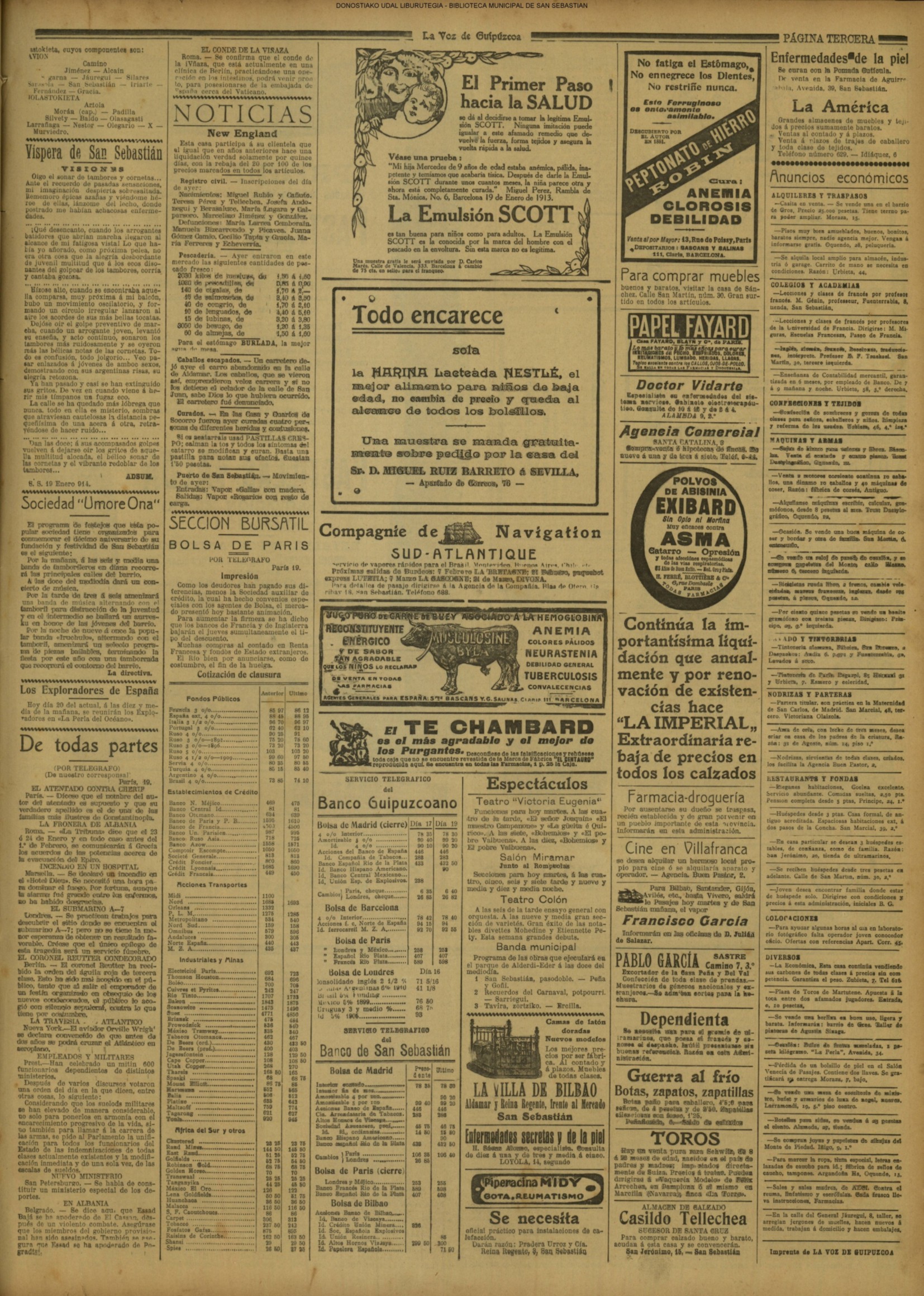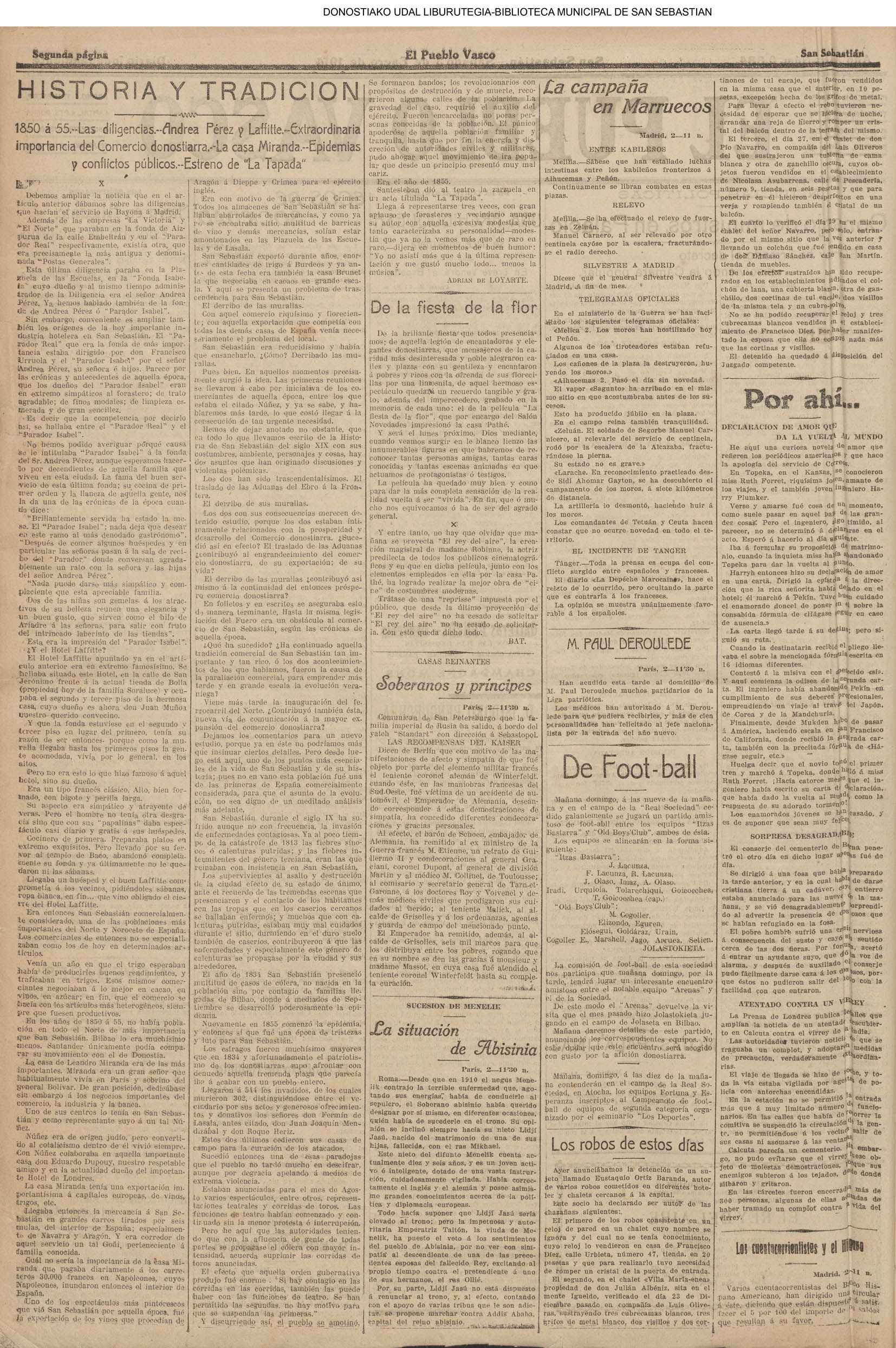 05.01 - LA VIDA DONOSTIARRA.- La moral de la nieve.- Y dale con el tango.- Don Isidoro Bengoechea.- El gobierno de la casa. 12.01 - LA VIDA DONOSTIARRA .- Una excursión a la montaña.- En busca de nieve.- Deportes sobre la misma.- Dialogando.- El retorno. 19.01 - LA VIDA DONOSTIARRA.- Qué frío.- Cómo le combatiremos antes.- Homenaje a Sarriegui.- Espectáculos a granel.- El nuevo Pastor de almas.- Manifestación de duelo.- Aceite de hígado de bacalao. 26.01 - LA VIDA DONOSTIARRA.- (Diálogos en el tranvía de la frontera) |