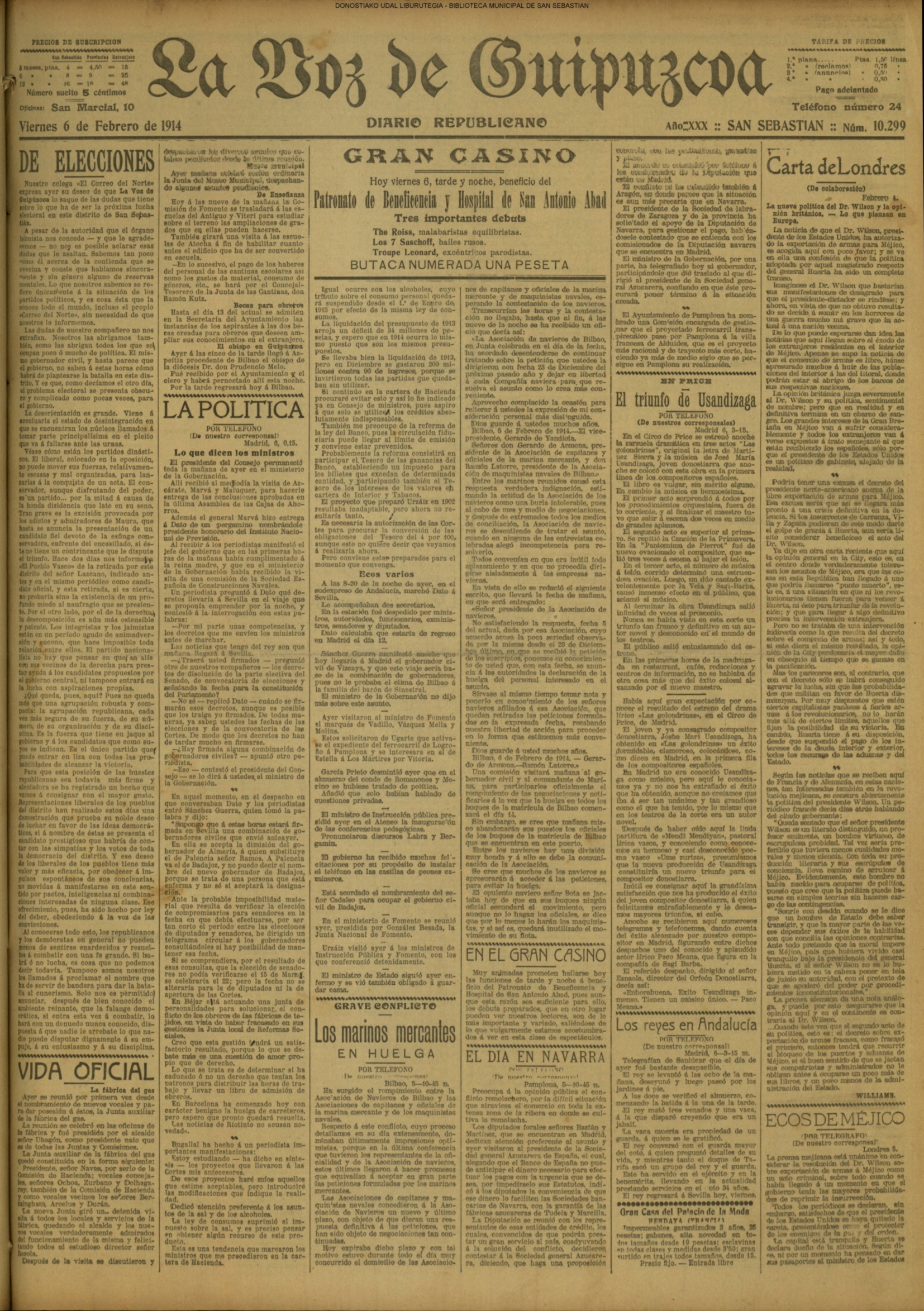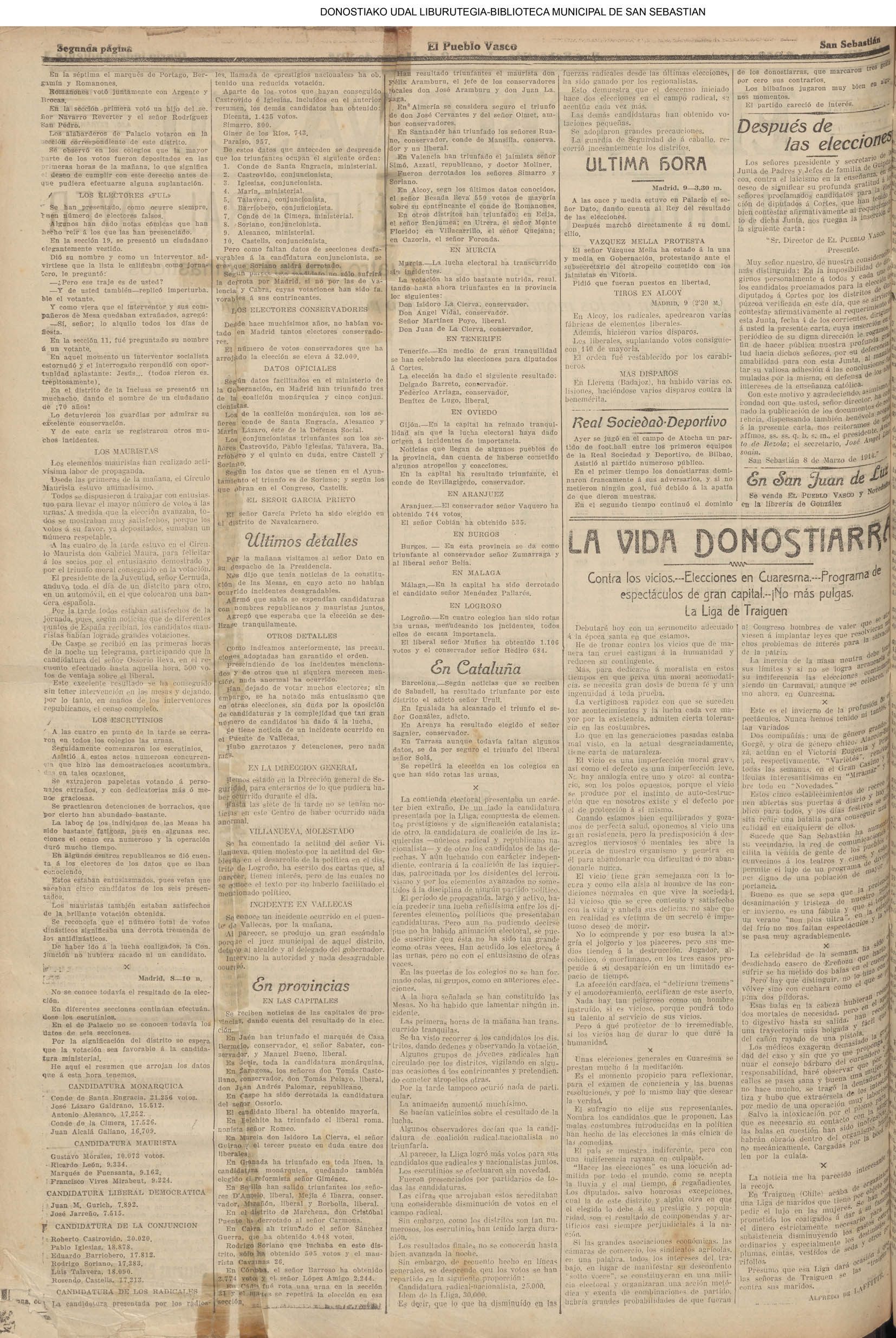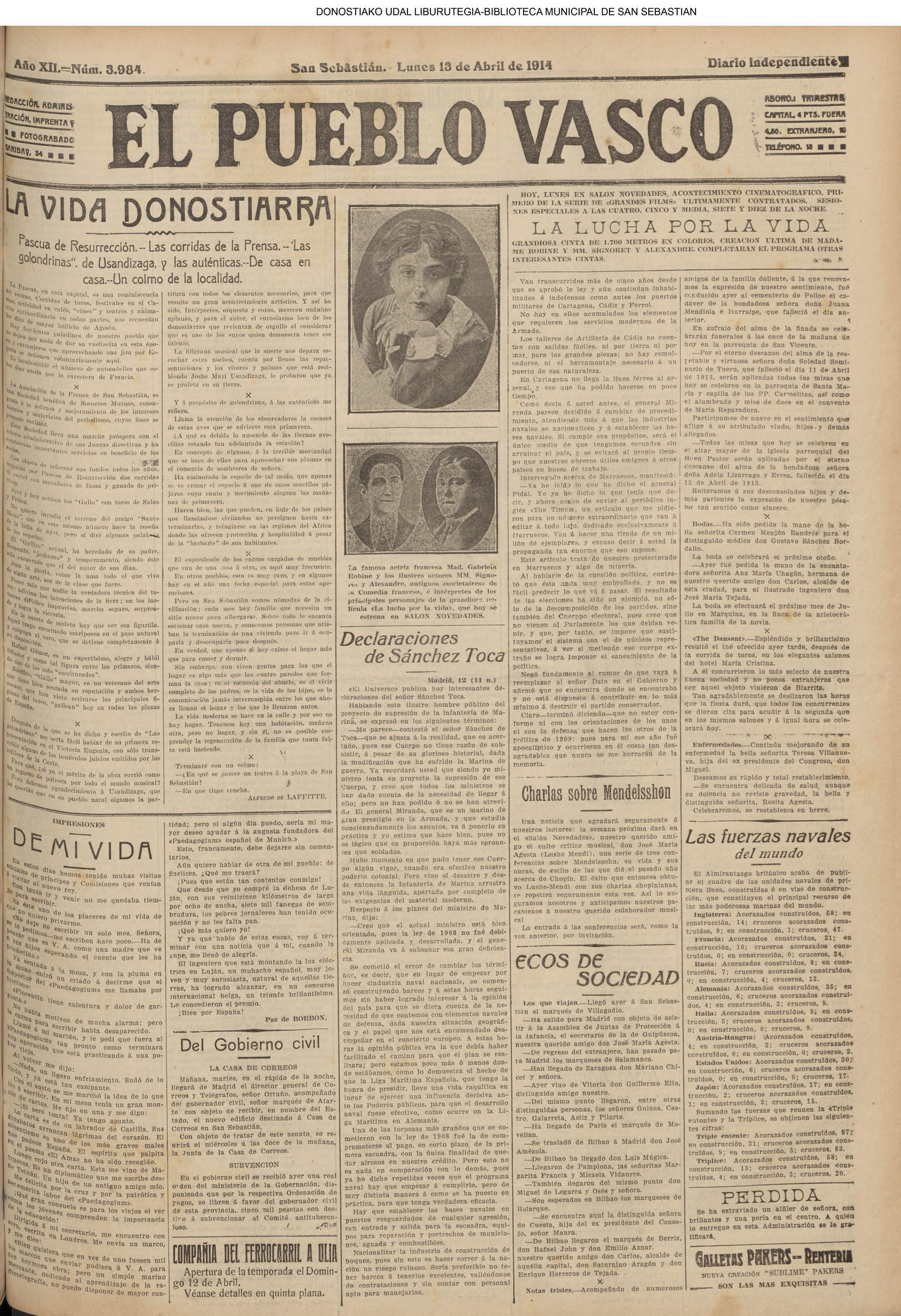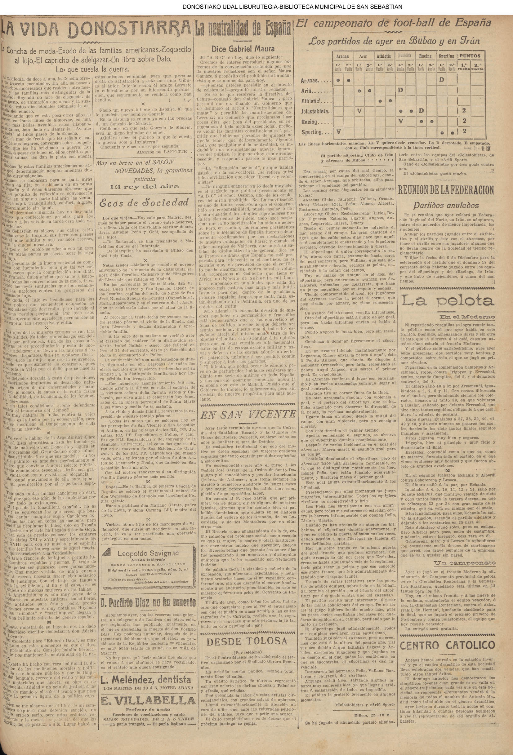 05.01 - LA VIDA DONOSTIARRA.- La moral de la nieve.- Y dale con el tango.- Don Isidoro Bengoechea.- El gobierno de la casa. 12.01 - LA VIDA DONOSTIARRA .- Una excursión a la montaña.- En busca de nieve.- Deportes sobre la misma.- Dialogando.- El retorno. 19.01 - LA VIDA DONOSTIARRA.- Qué frío.- Cómo le combatiremos antes.- Homenaje a Sarriegui.- Espectáculos a granel.- El nuevo Pastor de almas.- Manifestación de duelo.- Aceite de hígado de bacalao. 26.01 - LA VIDA DONOSTIARRA.- (Diálogos en el tranvía de la frontera) |
