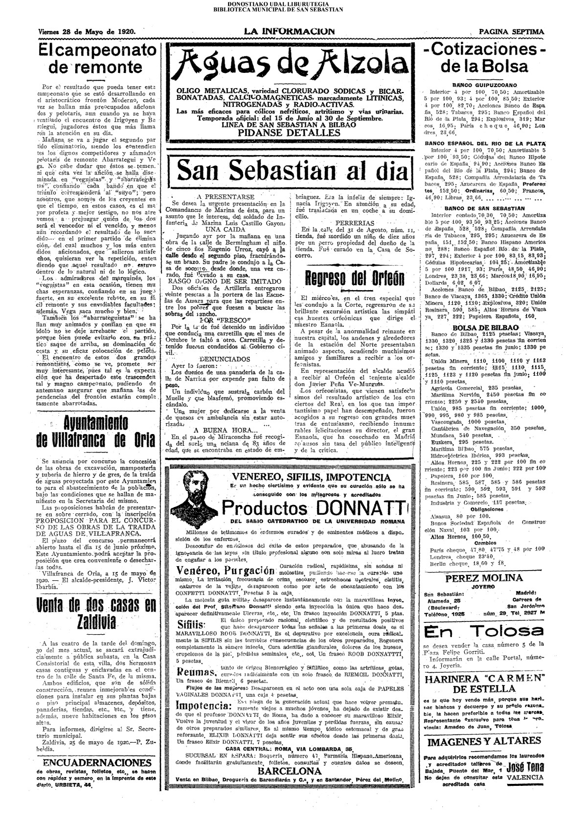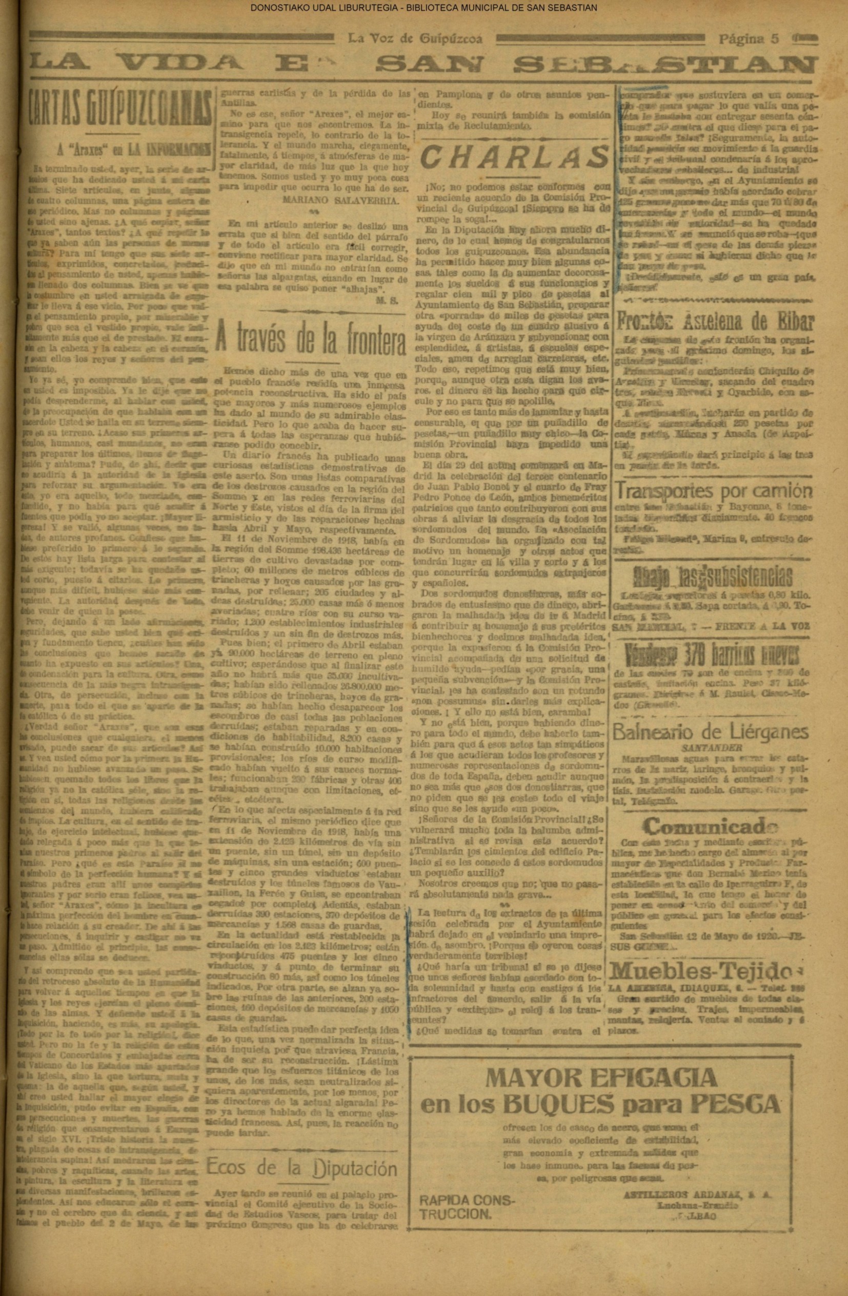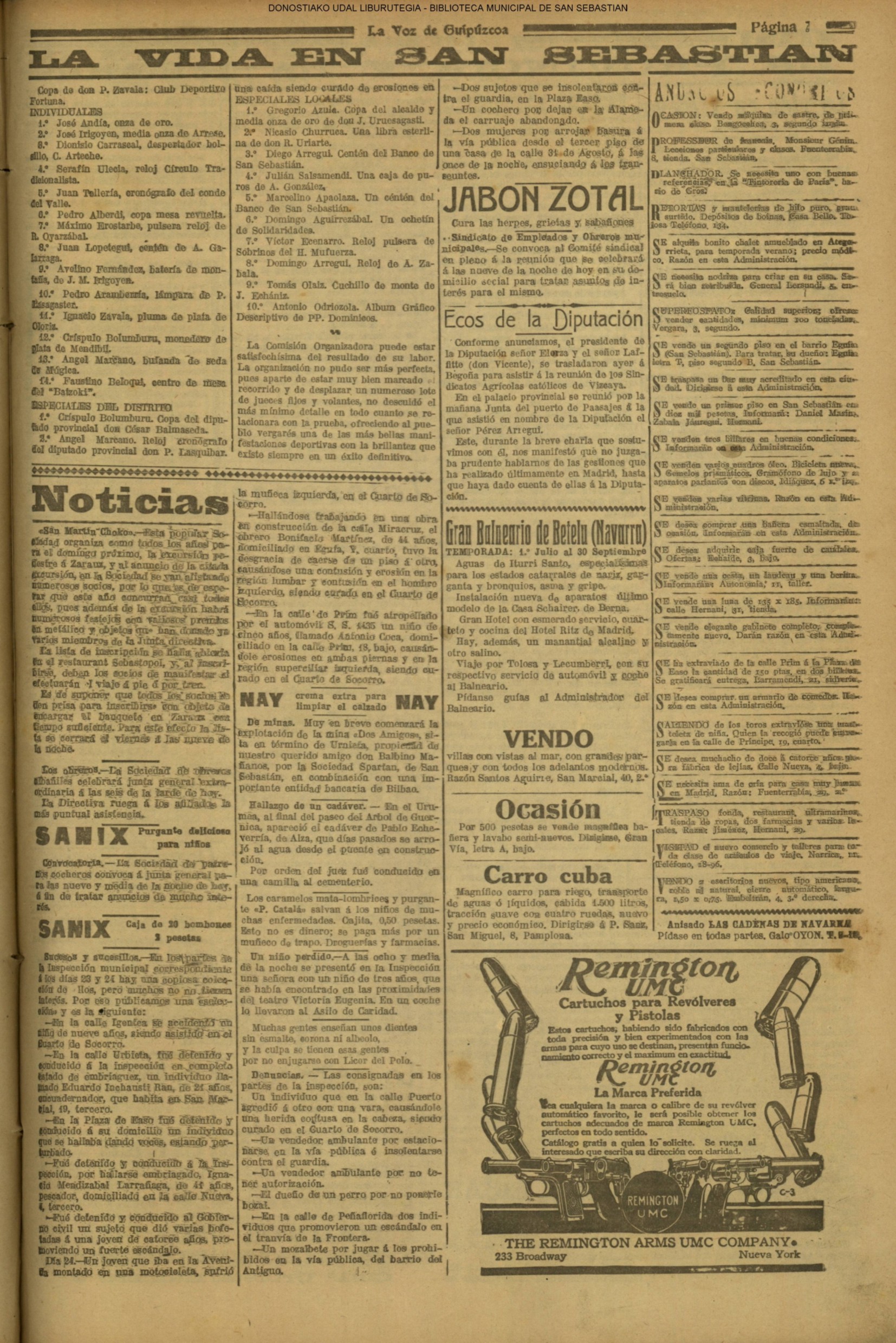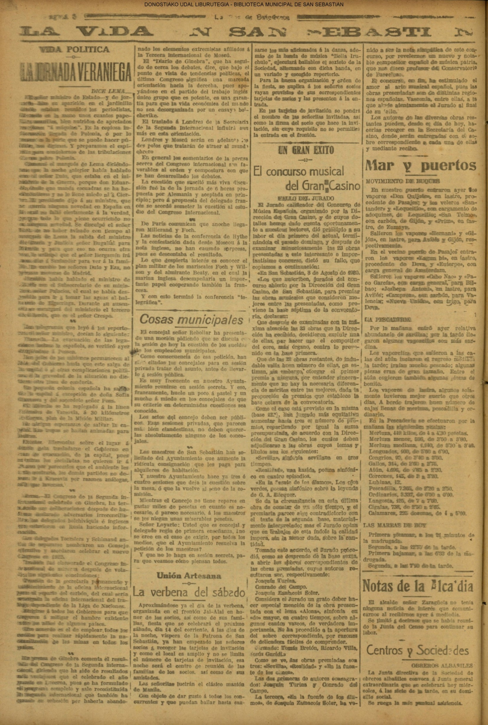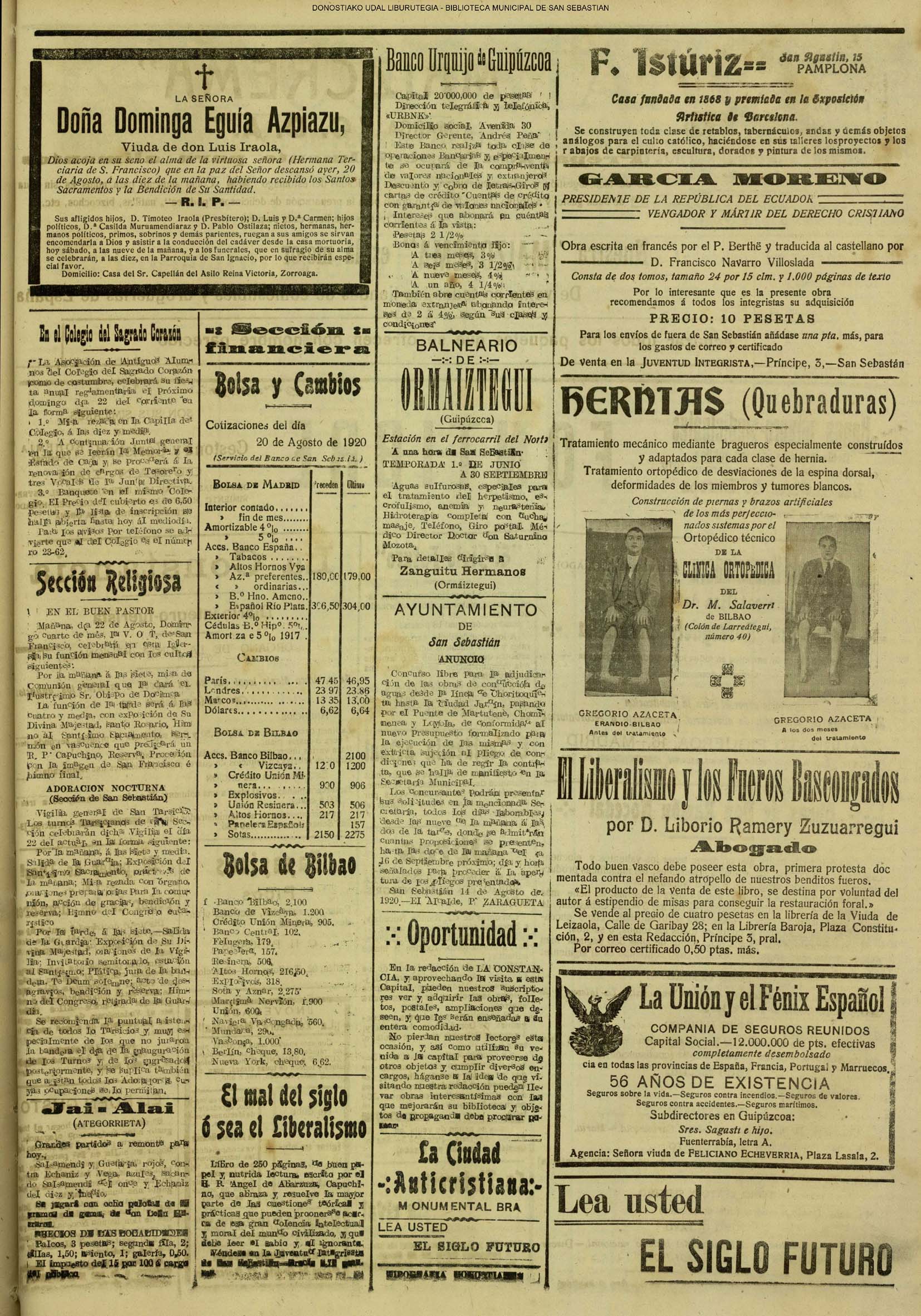 | Ayuntamiento de San Sebastián.—Concurso libre para la adjudicación de las obras de conducción de aguas desde la linea de Choritoquieta hasta la Ciudad-Jardín, pasando por el puente de Martutene, Chominenea y Loyola, de conformidad al nuevo presupuesto formalizado para la ejecución de las mismas y con estricta sujeción al pliego de condiciones que ha de regir la contrata que se halla de manifiesto en la Secretaria municipal. Los concursantes podrán presentar sus solicitudes en la mencionada Secretaria todos los días laborables, desde las nueve de la mañana a las dos de la tarde, donde se admitirán cuantas proposiciones se presenten hasta las doce de la mañana del día 16 de septiembre próximo; dia y hora señalados para proceder a la apertura de los pliegos presentados. San Sebastián, 14 de agosto de 1920.—El alcalde, Pedro Zaragüeta. (La Construcción moderna. 30/8/1920, no. 16.,p.18) |