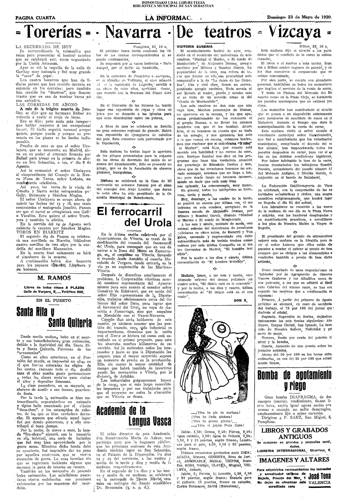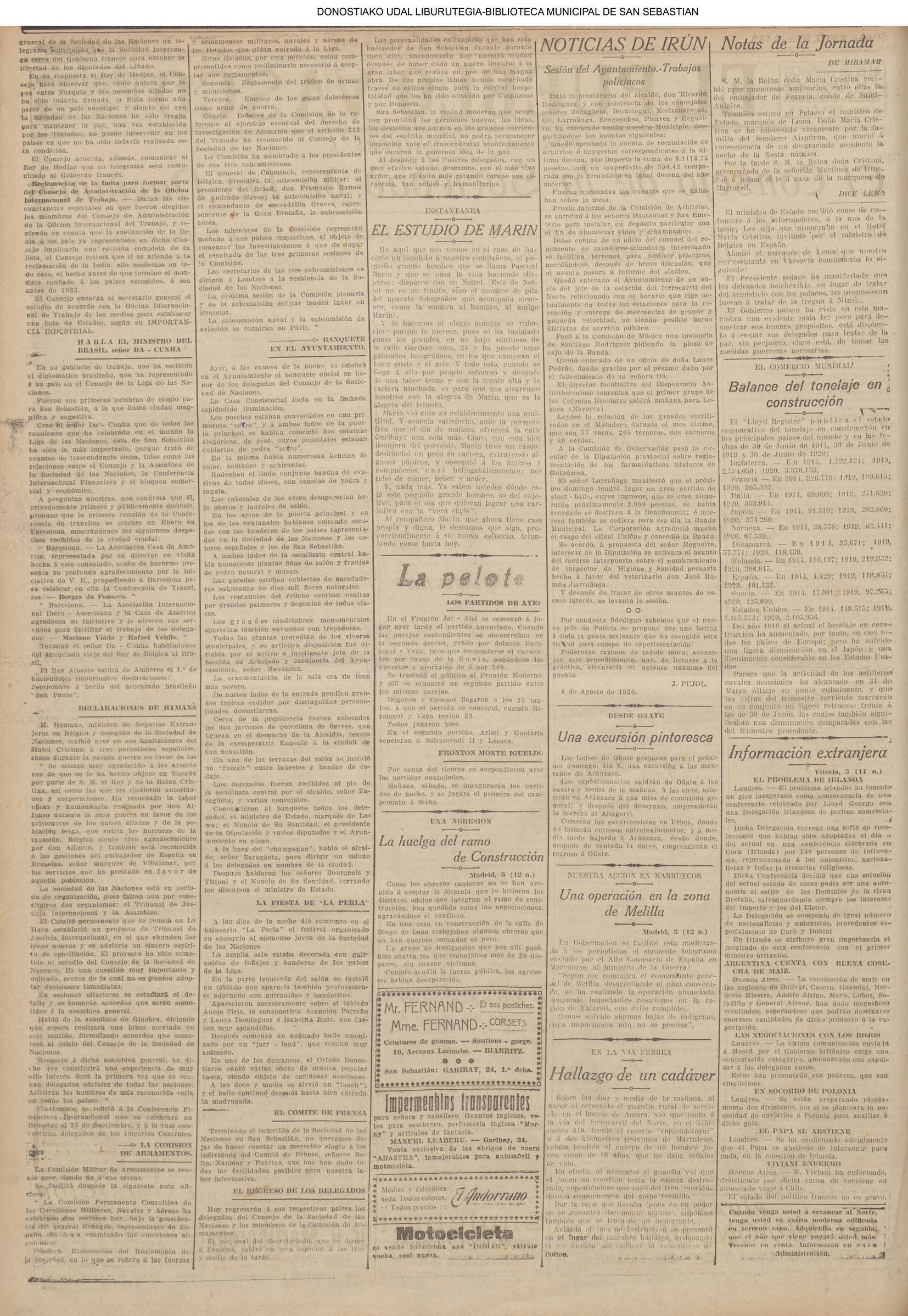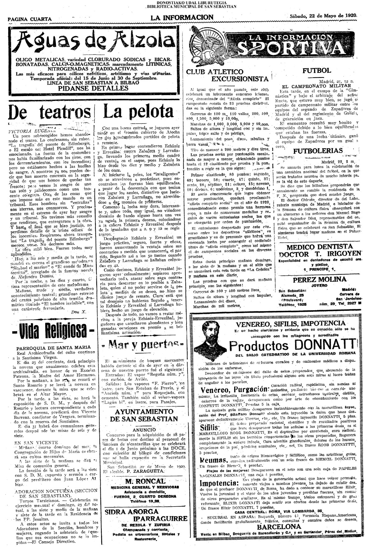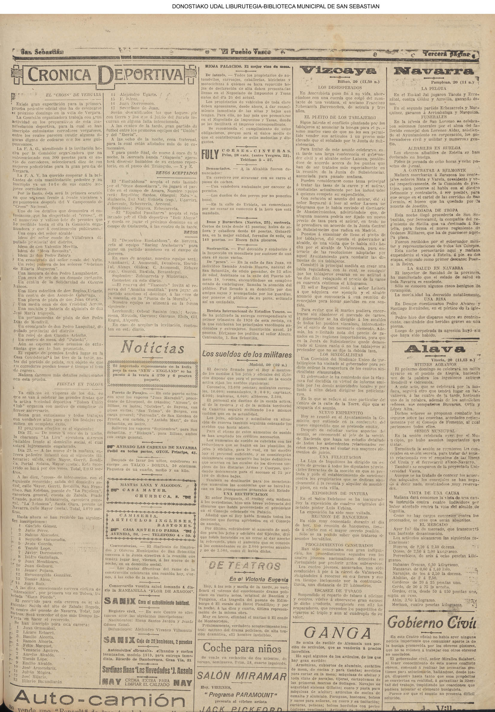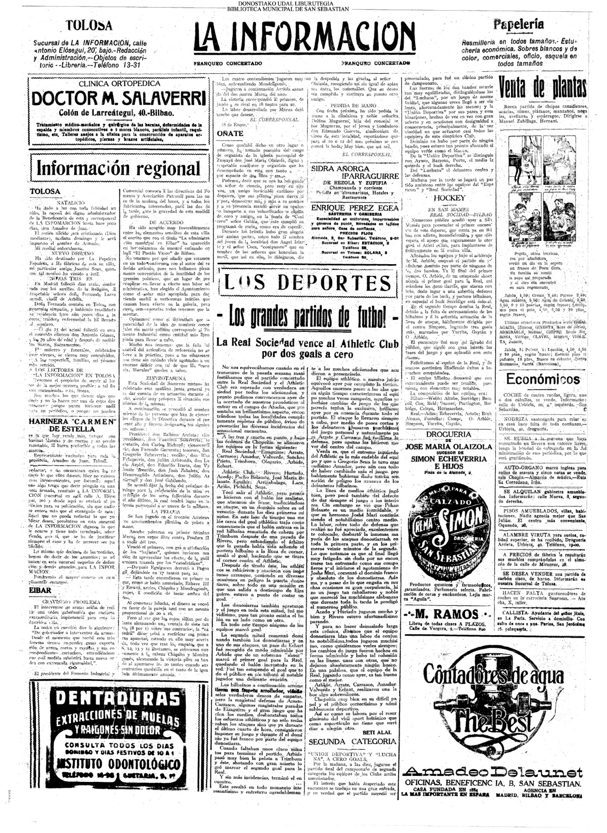 | Ayuntamiento de San Sebastián.—Concurso libre para la adjudicación de las obras de conducción de aguas desde la linea de Choritoquieta hasta la Ciudad-Jardín, pasando por el puente de Martutene, Chominenea y Loyola, de conformidad al nuevo presupuesto formalizado para la ejecución de las mismas y con estricta sujeción al pliego de condiciones que ha de regir la contrata que se halla de manifiesto en la Secretaria municipal. Los concursantes podrán presentar sus solicitudes en la mencionada Secretaria todos los días laborables, desde las nueve de la mañana a las dos de la tarde, donde se admitirán cuantas proposiciones se presenten hasta las doce de la mañana del día 16 de septiembre próximo; dia y hora señalados para proceder a la apertura de los pliegos presentados. San Sebastián, 14 de agosto de 1920.—El alcalde, Pedro Zaragüeta. (La Construcción moderna. 30/8/1920, no. 16.,p.18) |