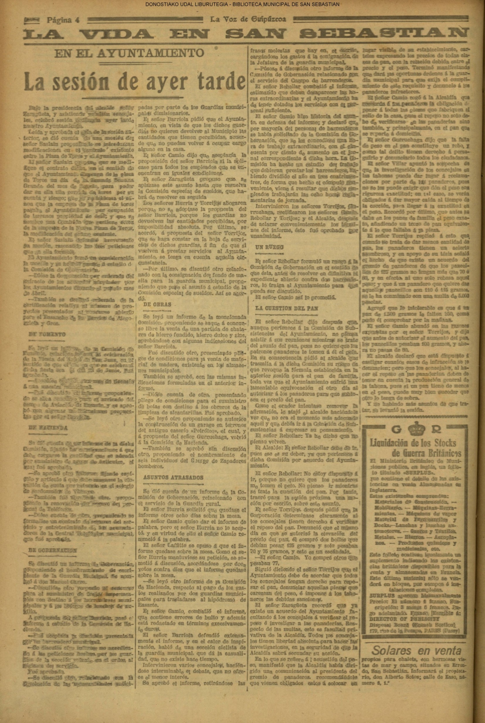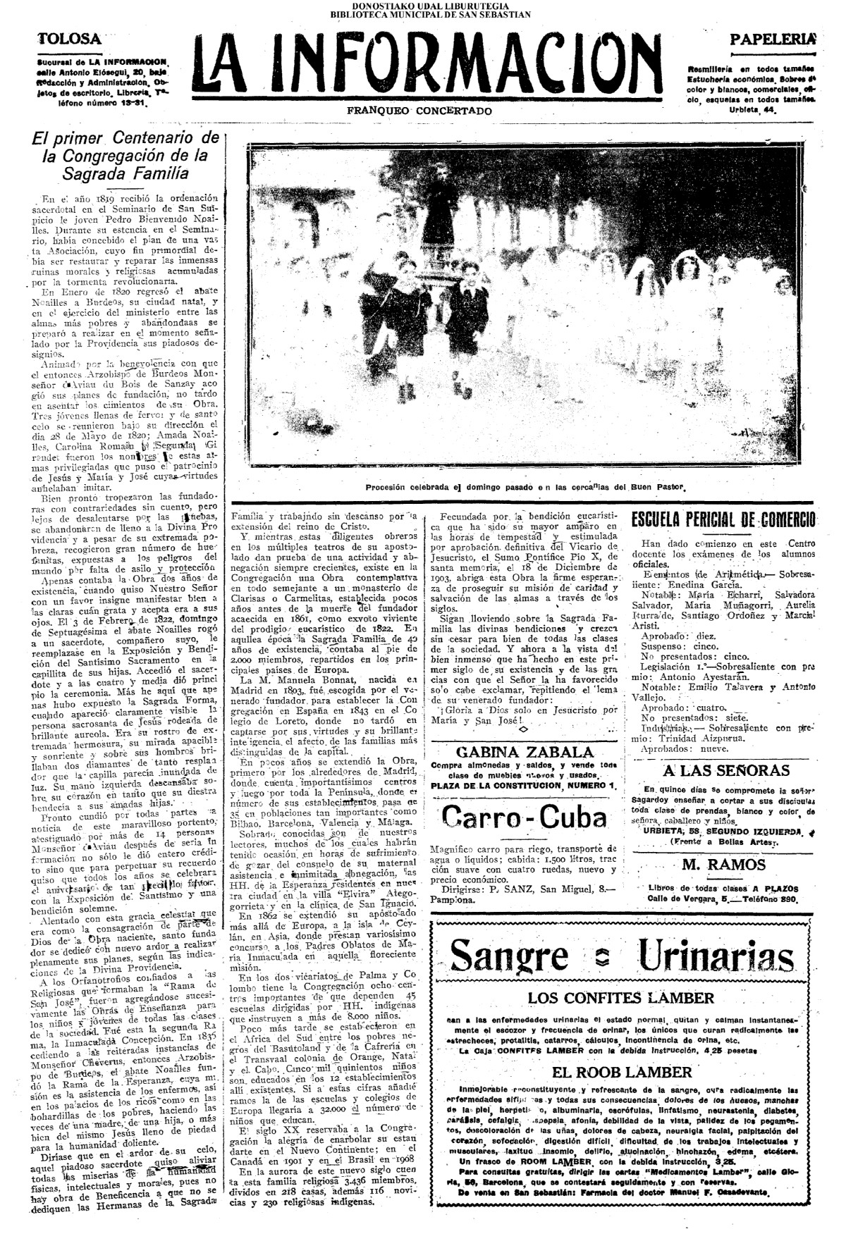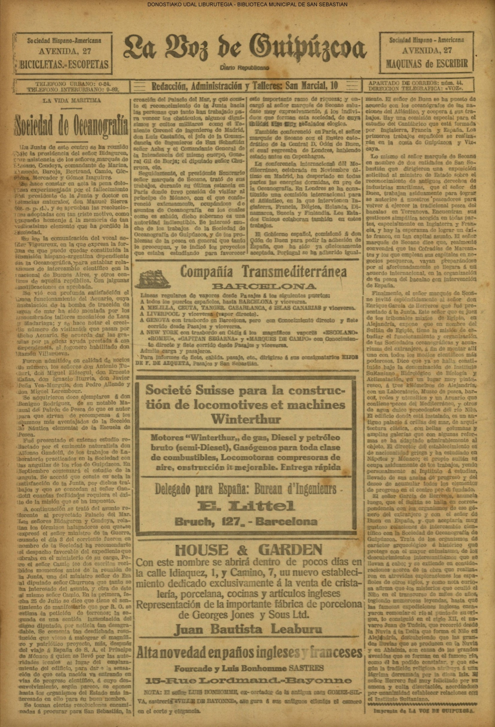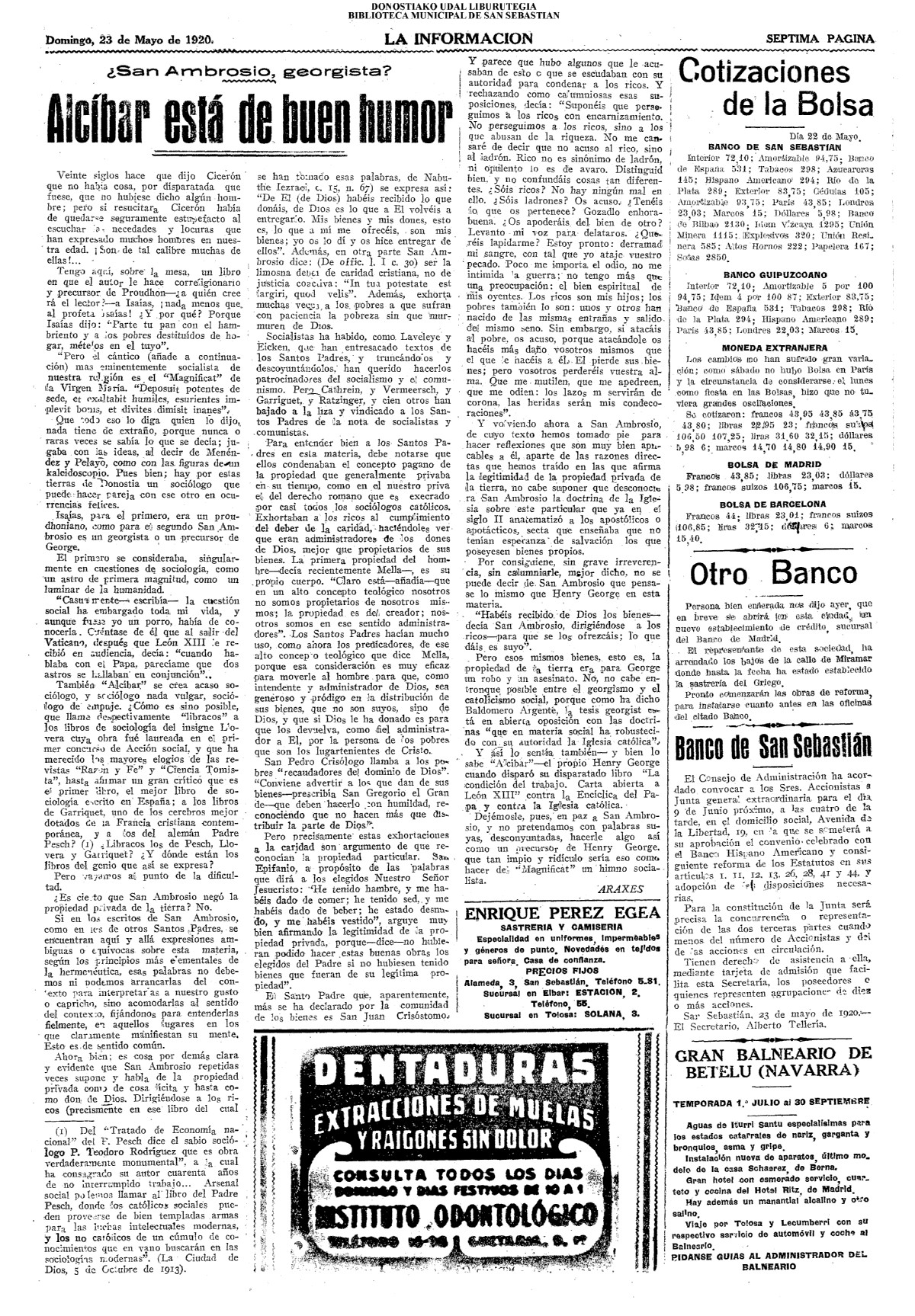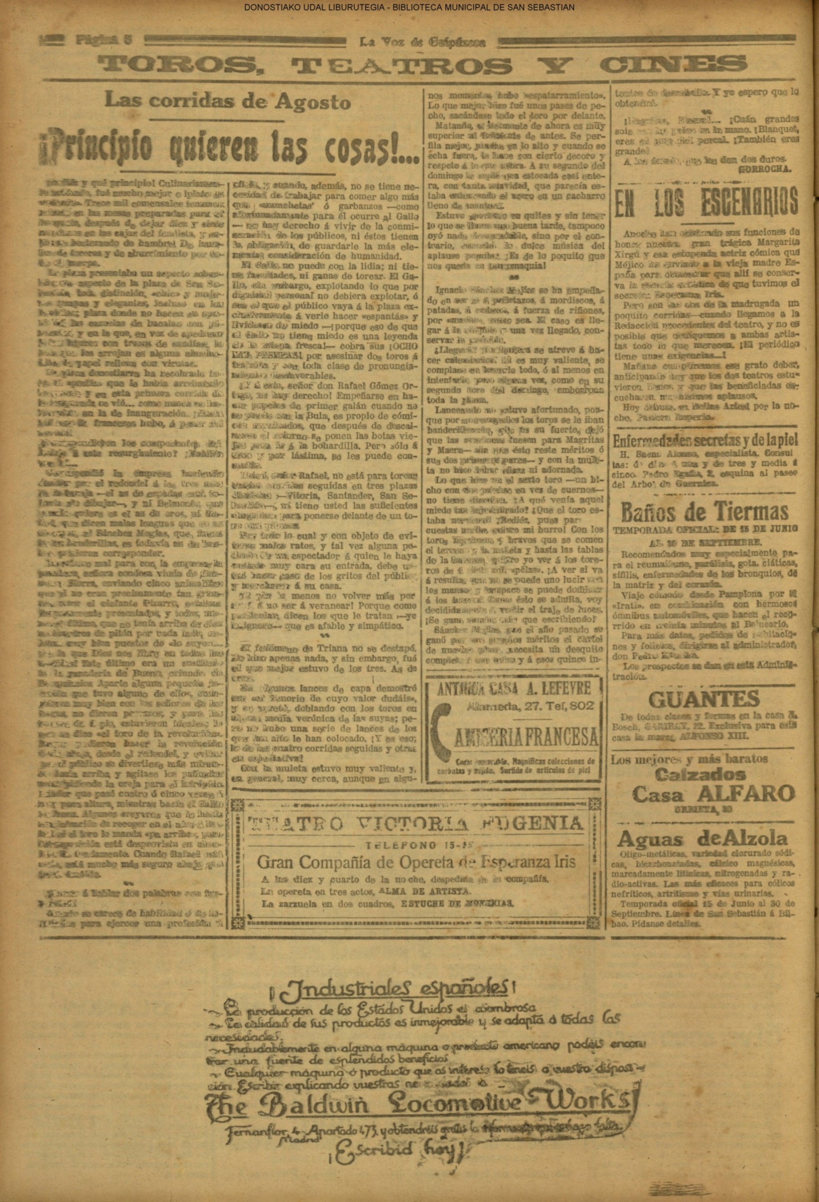 | Ayuntamiento de San Sebastián.—Concurso libre para la adjudicación de las obras de conducción de aguas desde la linea de Choritoquieta hasta la Ciudad-Jardín, pasando por el puente de Martutene, Chominenea y Loyola, de conformidad al nuevo presupuesto formalizado para la ejecución de las mismas y con estricta sujeción al pliego de condiciones que ha de regir la contrata que se halla de manifiesto en la Secretaria municipal. Los concursantes podrán presentar sus solicitudes en la mencionada Secretaria todos los días laborables, desde las nueve de la mañana a las dos de la tarde, donde se admitirán cuantas proposiciones se presenten hasta las doce de la mañana del día 16 de septiembre próximo; dia y hora señalados para proceder a la apertura de los pliegos presentados. San Sebastián, 14 de agosto de 1920.—El alcalde, Pedro Zaragüeta. (La Construcción moderna. 30/8/1920, no. 16.,p.18) |
