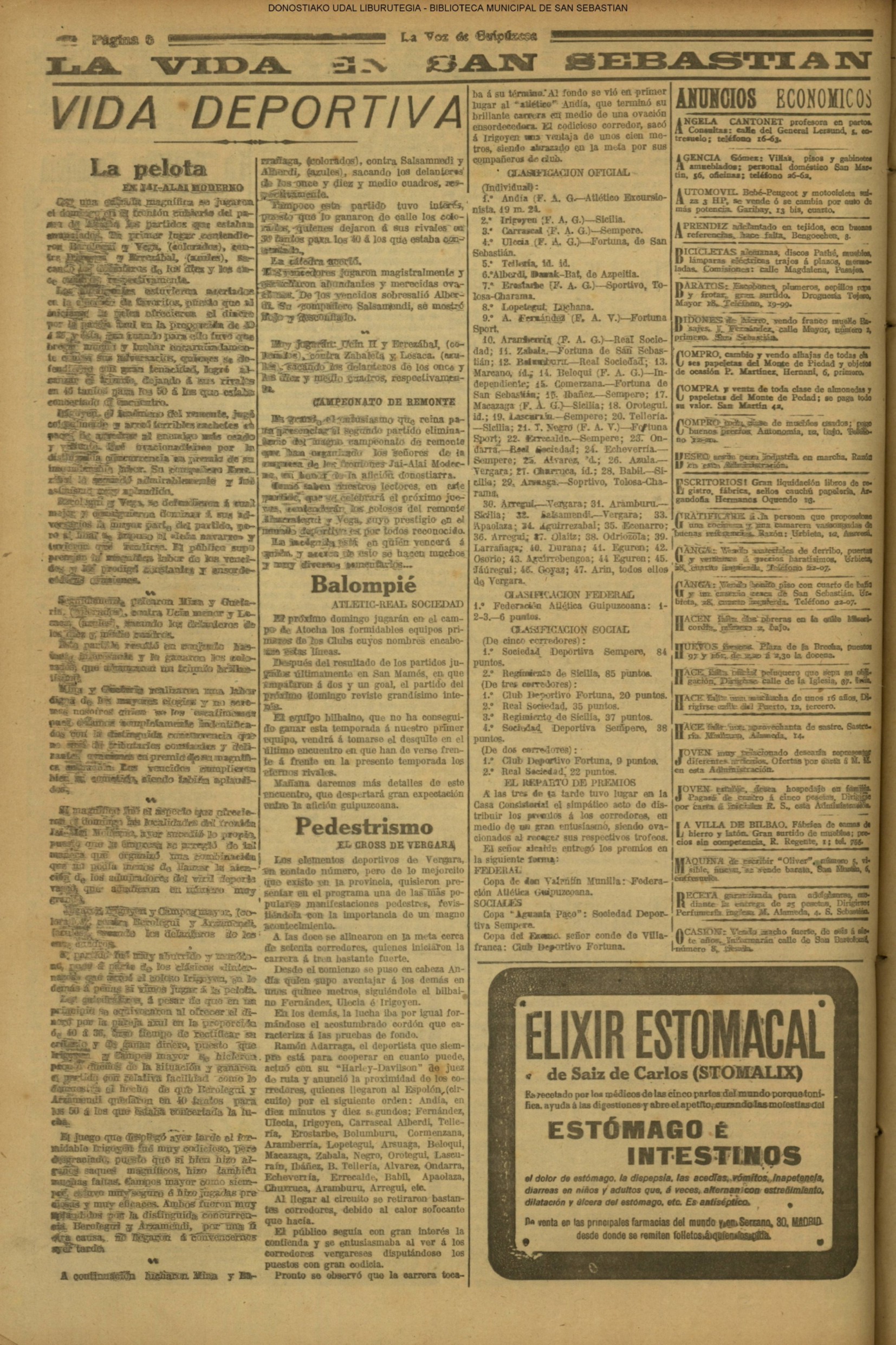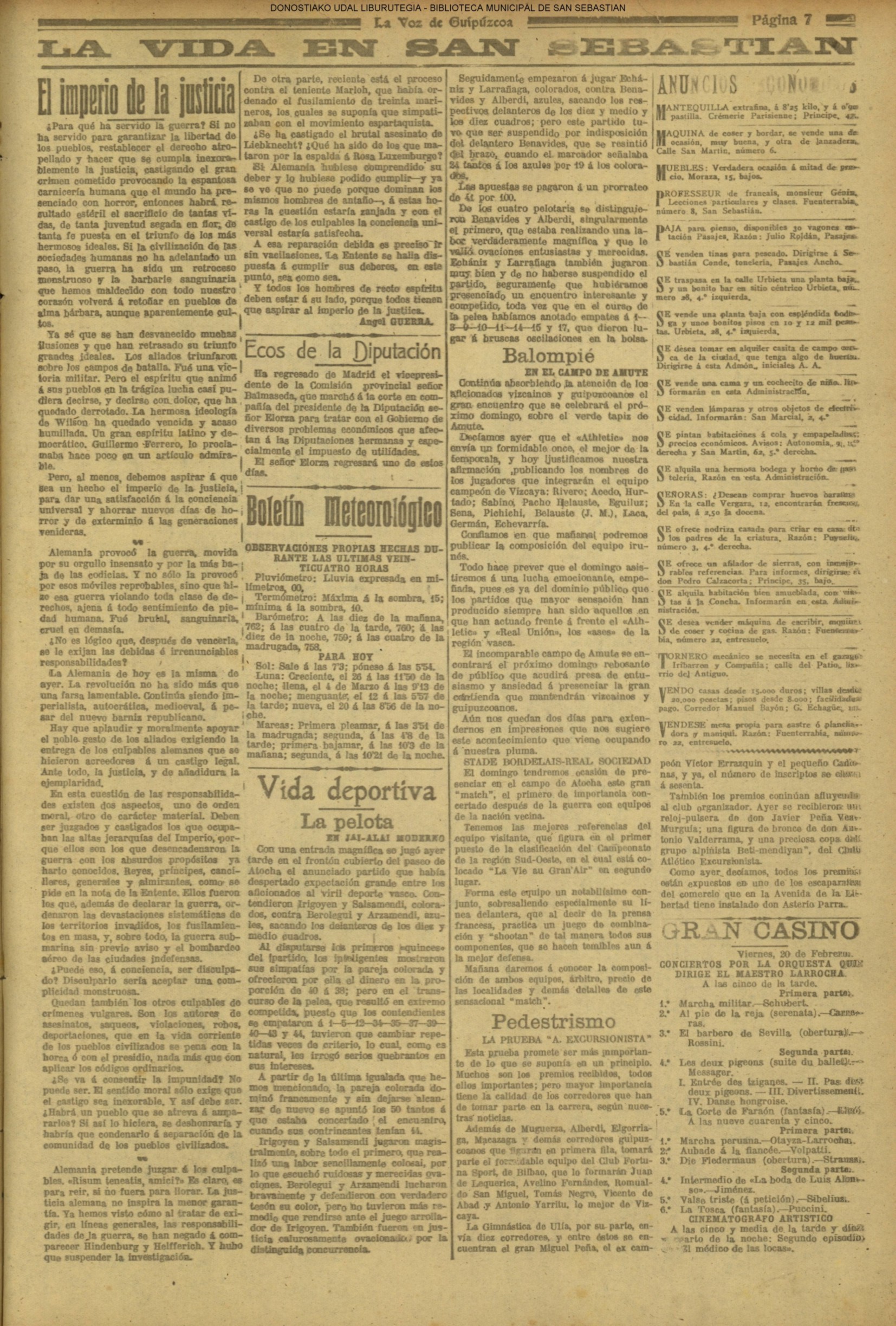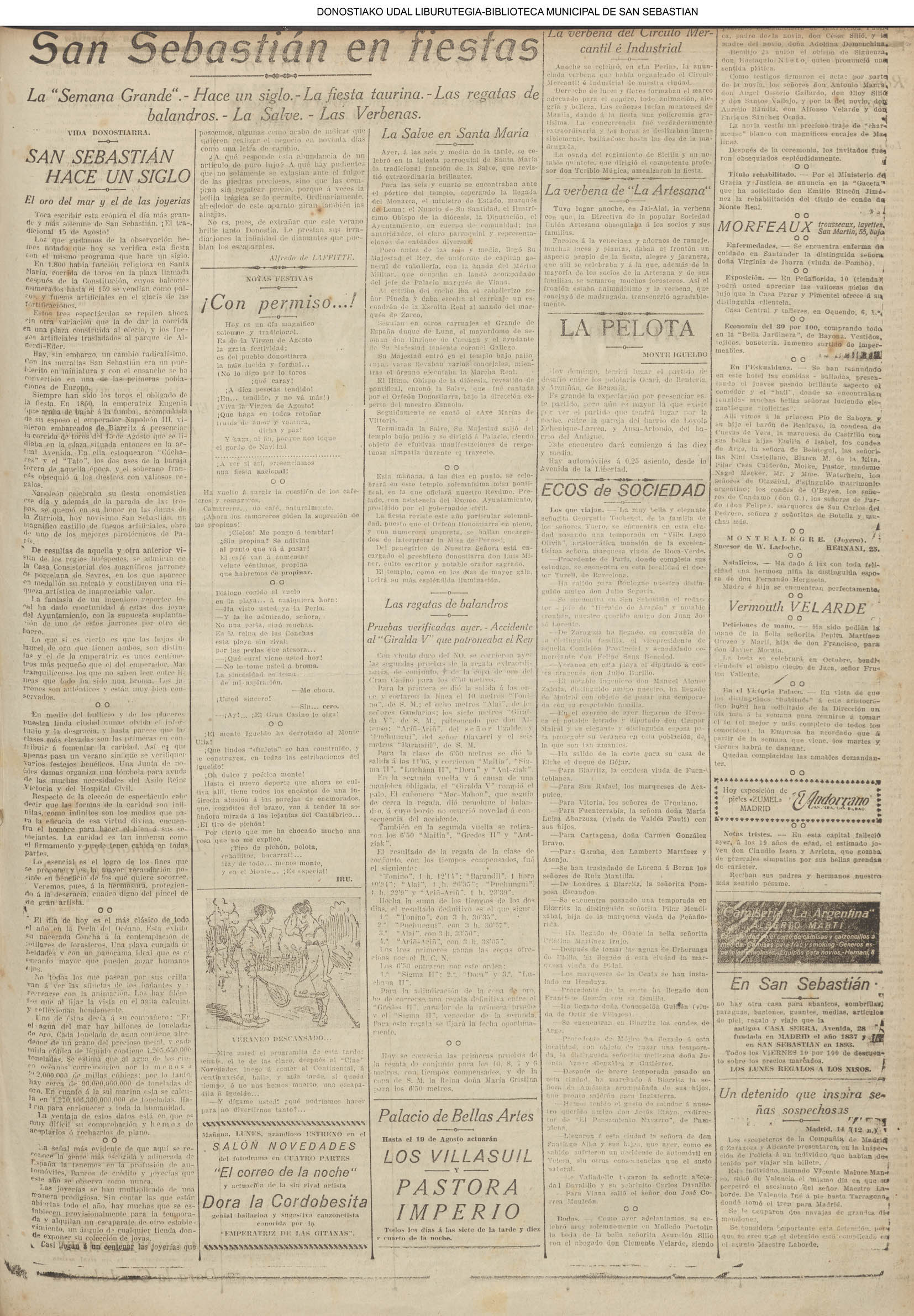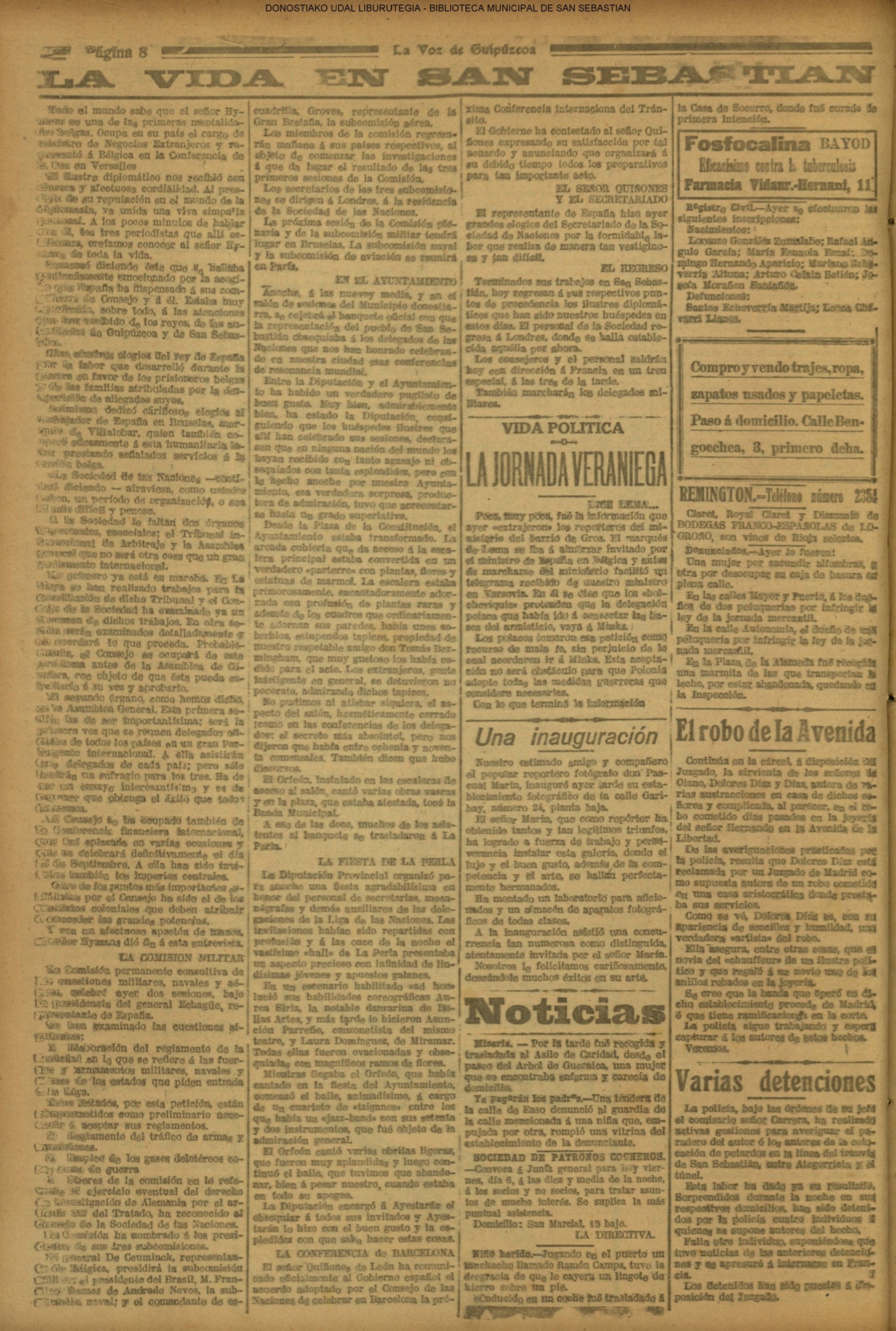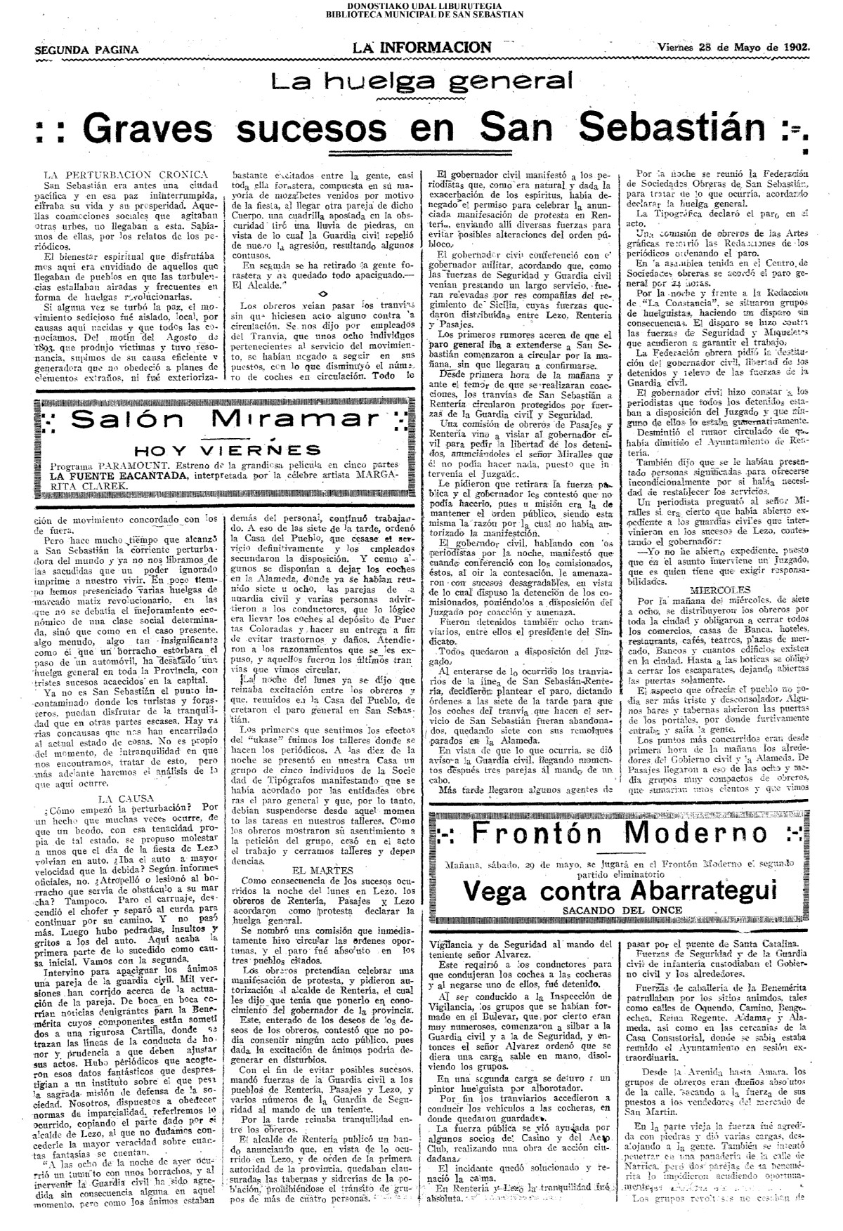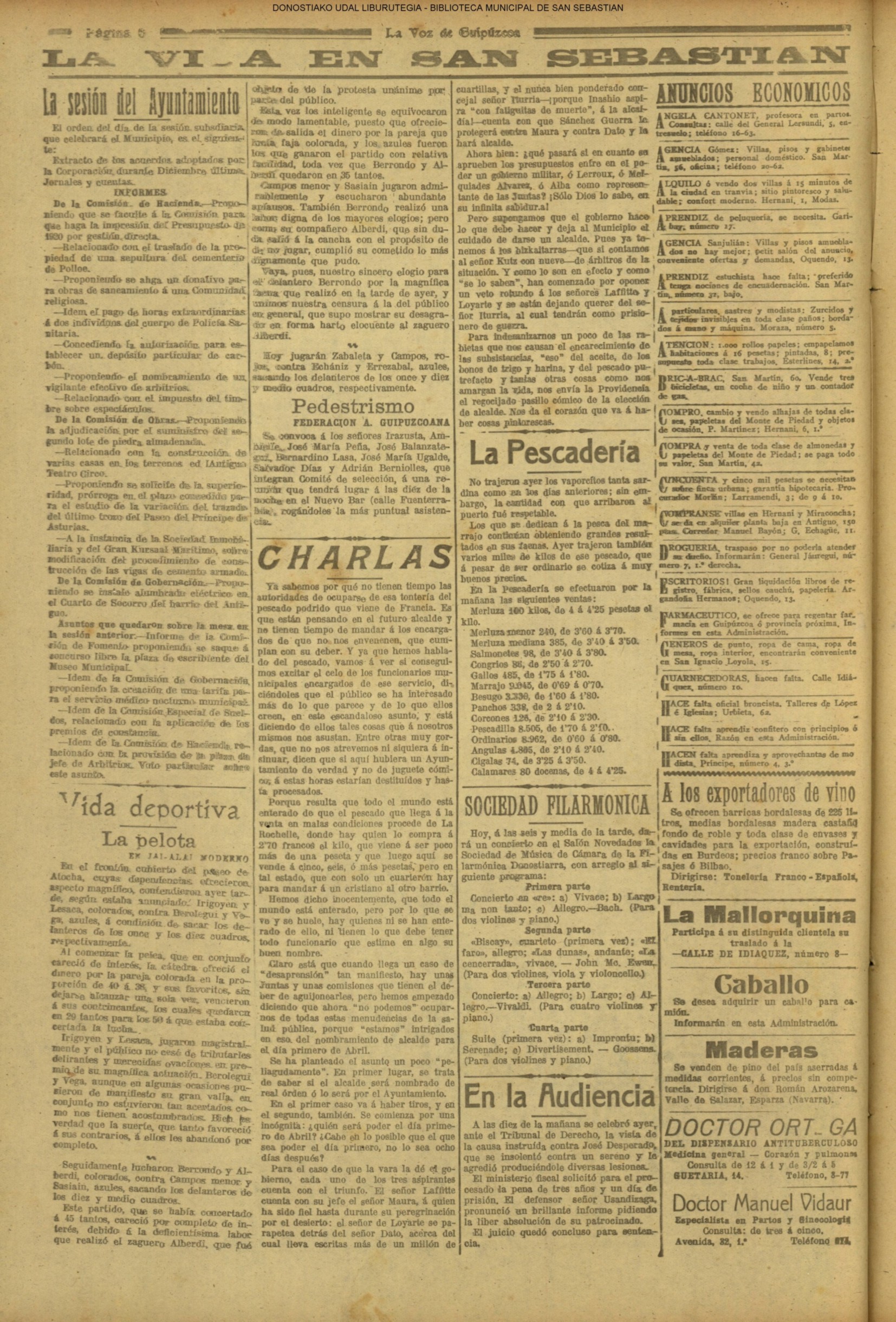 | Ayuntamiento de San Sebastián.—Concurso libre para la adjudicación de las obras de conducción de aguas desde la linea de Choritoquieta hasta la Ciudad-Jardín, pasando por el puente de Martutene, Chominenea y Loyola, de conformidad al nuevo presupuesto formalizado para la ejecución de las mismas y con estricta sujeción al pliego de condiciones que ha de regir la contrata que se halla de manifiesto en la Secretaria municipal. Los concursantes podrán presentar sus solicitudes en la mencionada Secretaria todos los días laborables, desde las nueve de la mañana a las dos de la tarde, donde se admitirán cuantas proposiciones se presenten hasta las doce de la mañana del día 16 de septiembre próximo; dia y hora señalados para proceder a la apertura de los pliegos presentados. San Sebastián, 14 de agosto de 1920.—El alcalde, Pedro Zaragüeta. (La Construcción moderna. 30/8/1920, no. 16.,p.18) |