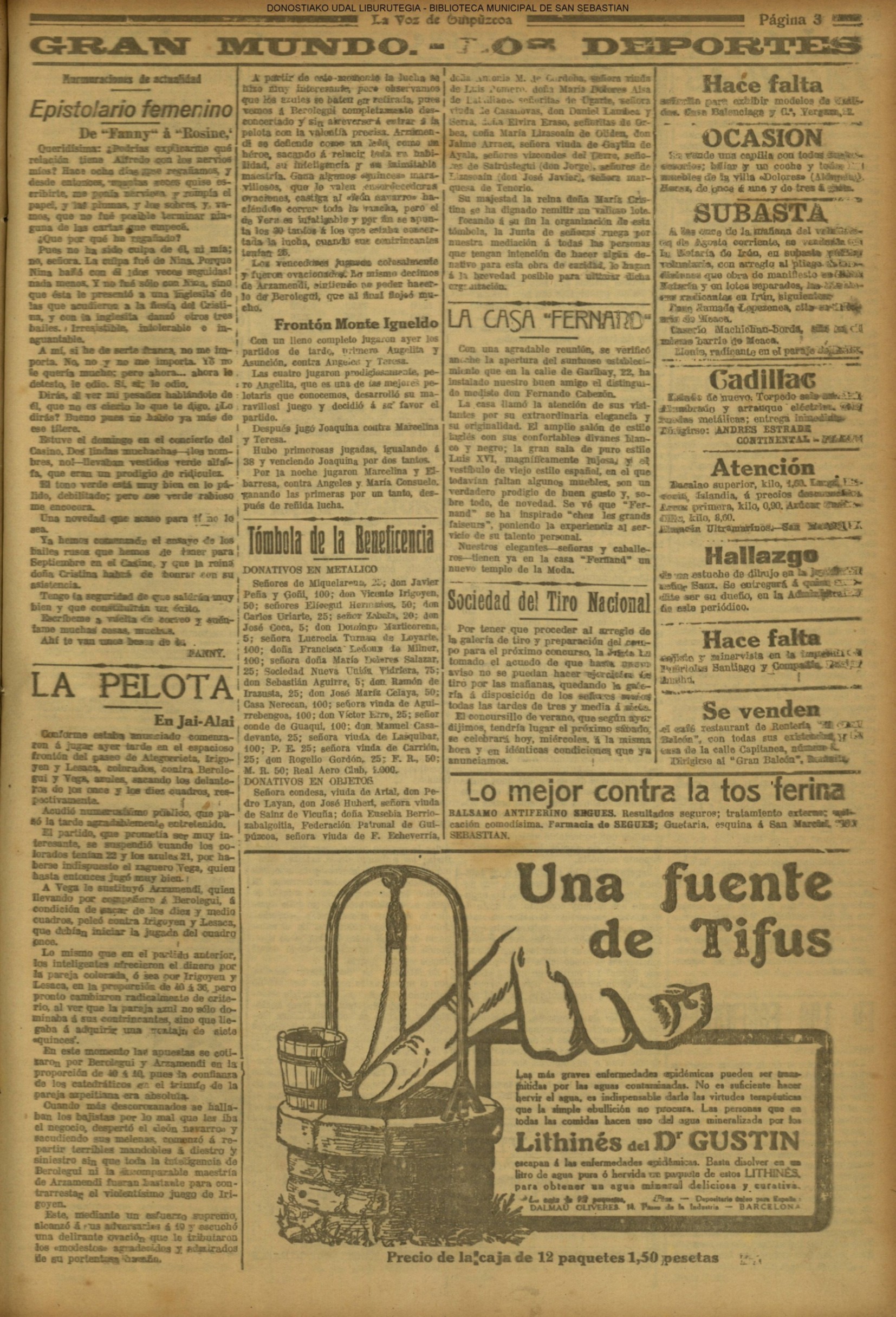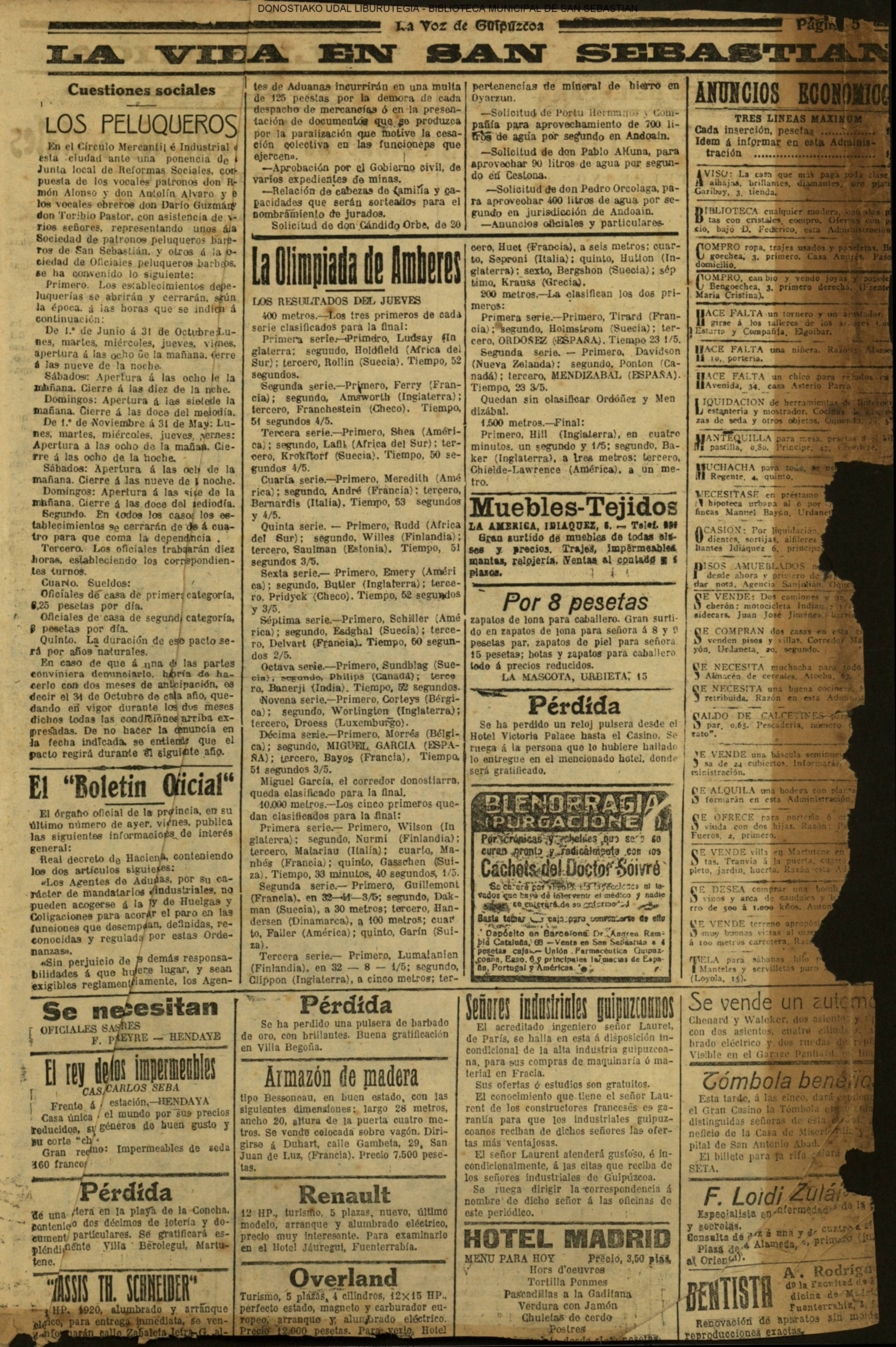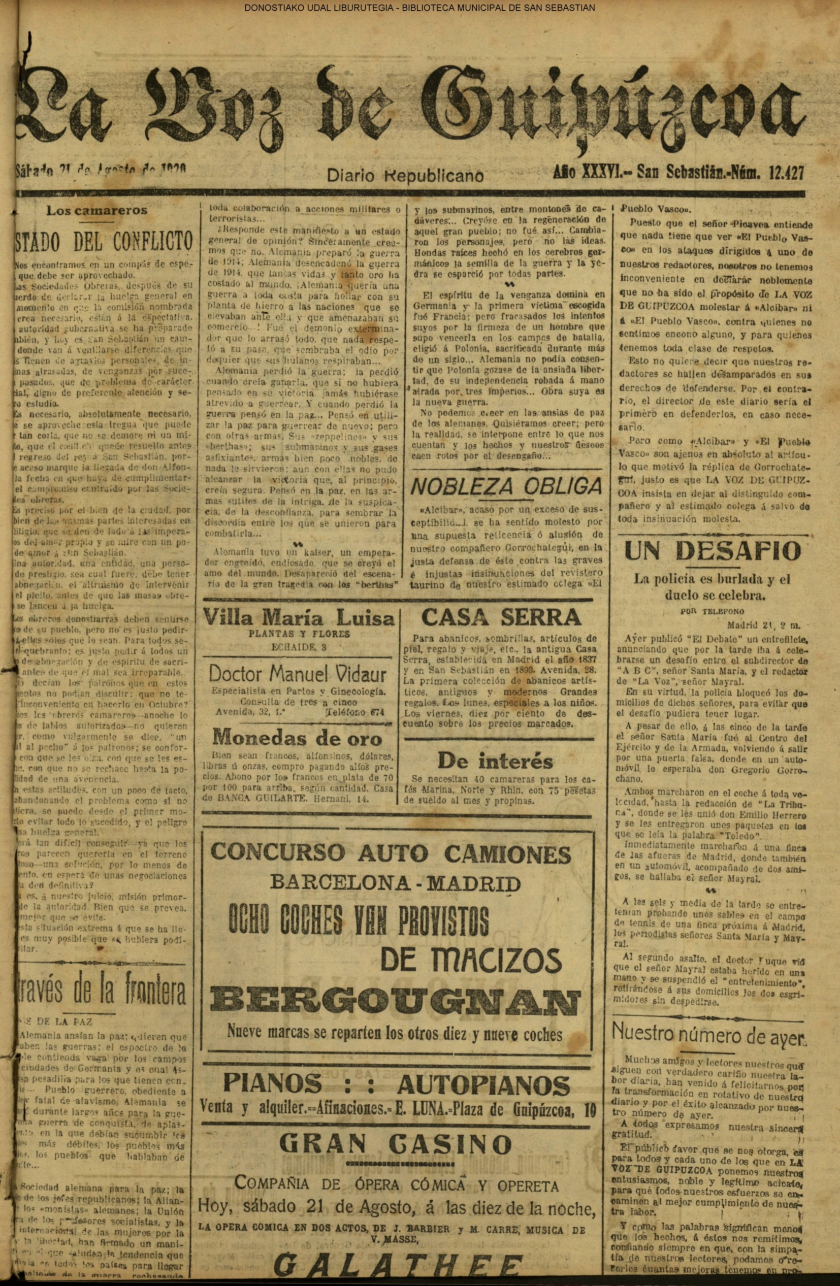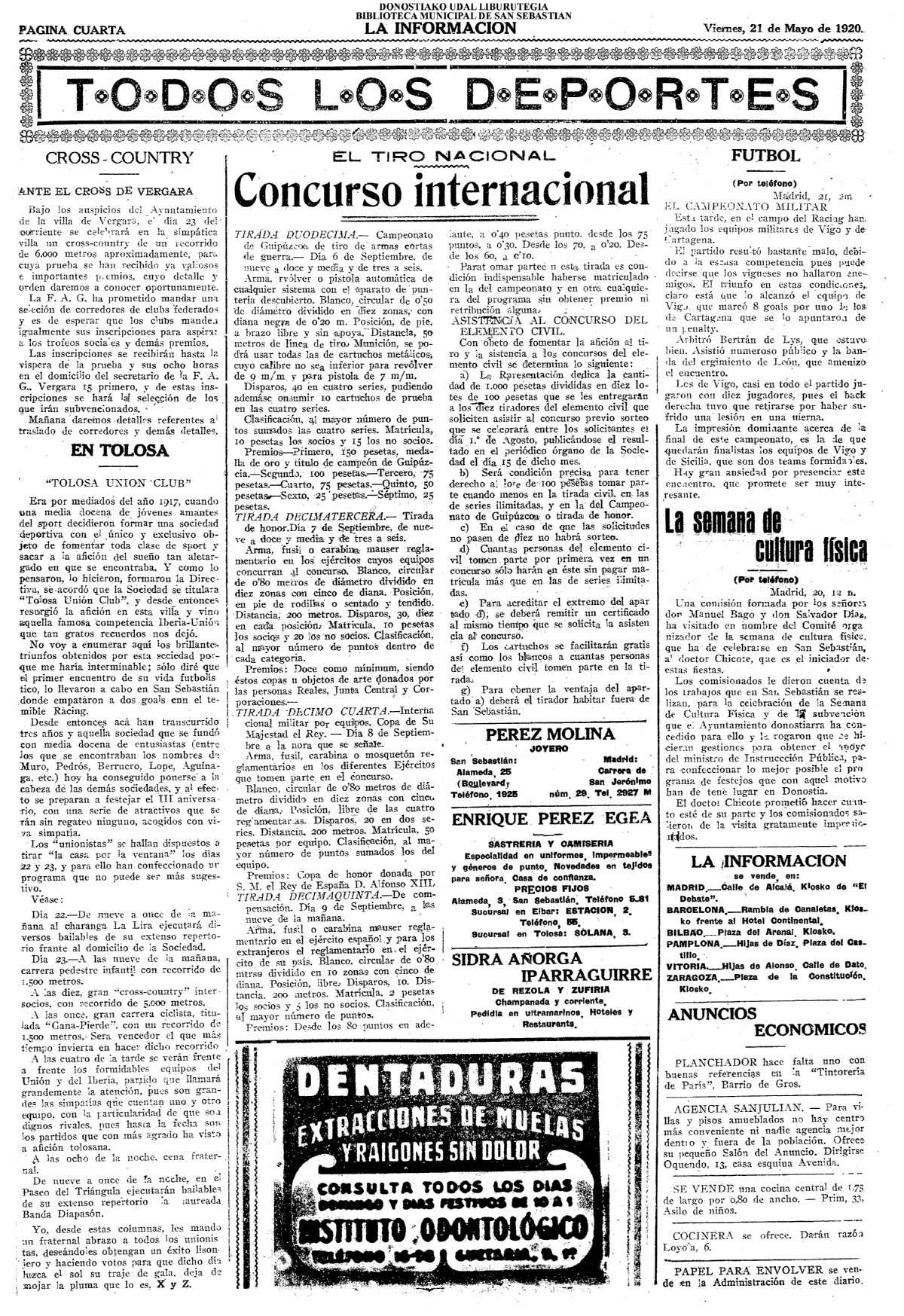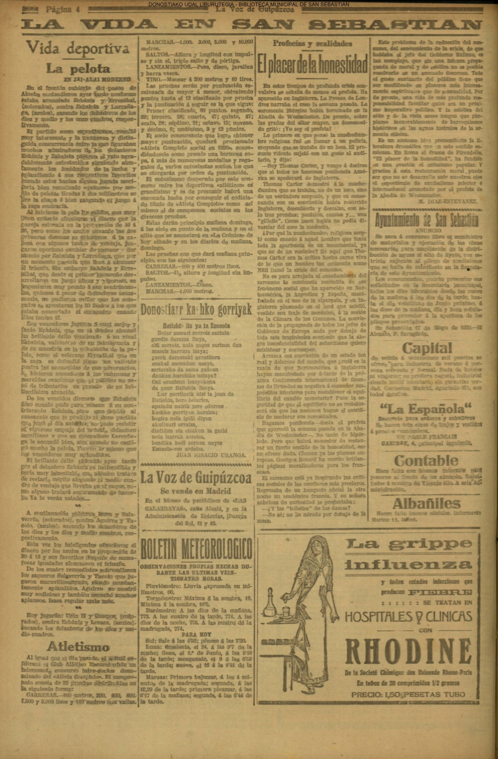 | Ayuntamiento de San Sebastián.—Concurso libre para la adjudicación de las obras de conducción de aguas desde la linea de Choritoquieta hasta la Ciudad-Jardín, pasando por el puente de Martutene, Chominenea y Loyola, de conformidad al nuevo presupuesto formalizado para la ejecución de las mismas y con estricta sujeción al pliego de condiciones que ha de regir la contrata que se halla de manifiesto en la Secretaria municipal. Los concursantes podrán presentar sus solicitudes en la mencionada Secretaria todos los días laborables, desde las nueve de la mañana a las dos de la tarde, donde se admitirán cuantas proposiciones se presenten hasta las doce de la mañana del día 16 de septiembre próximo; dia y hora señalados para proceder a la apertura de los pliegos presentados. San Sebastián, 14 de agosto de 1920.—El alcalde, Pedro Zaragüeta. (La Construcción moderna. 30/8/1920, no. 16.,p.18) |