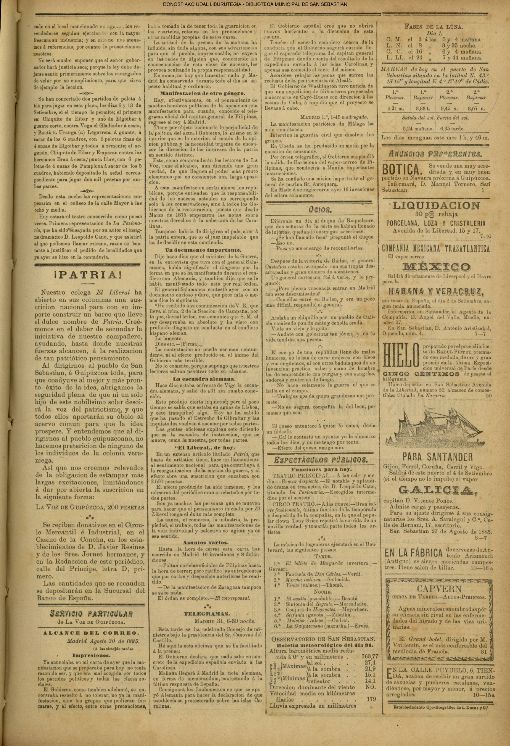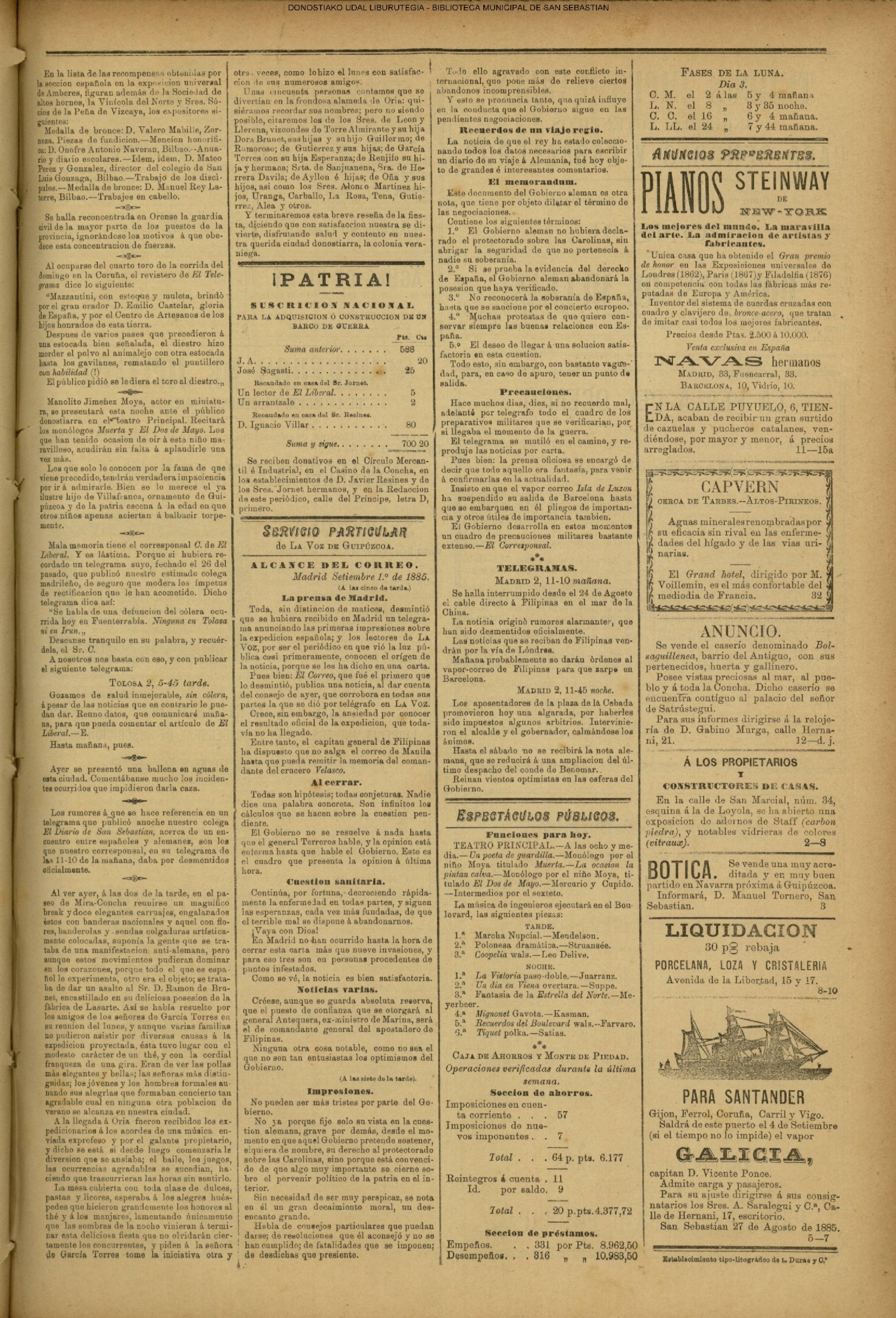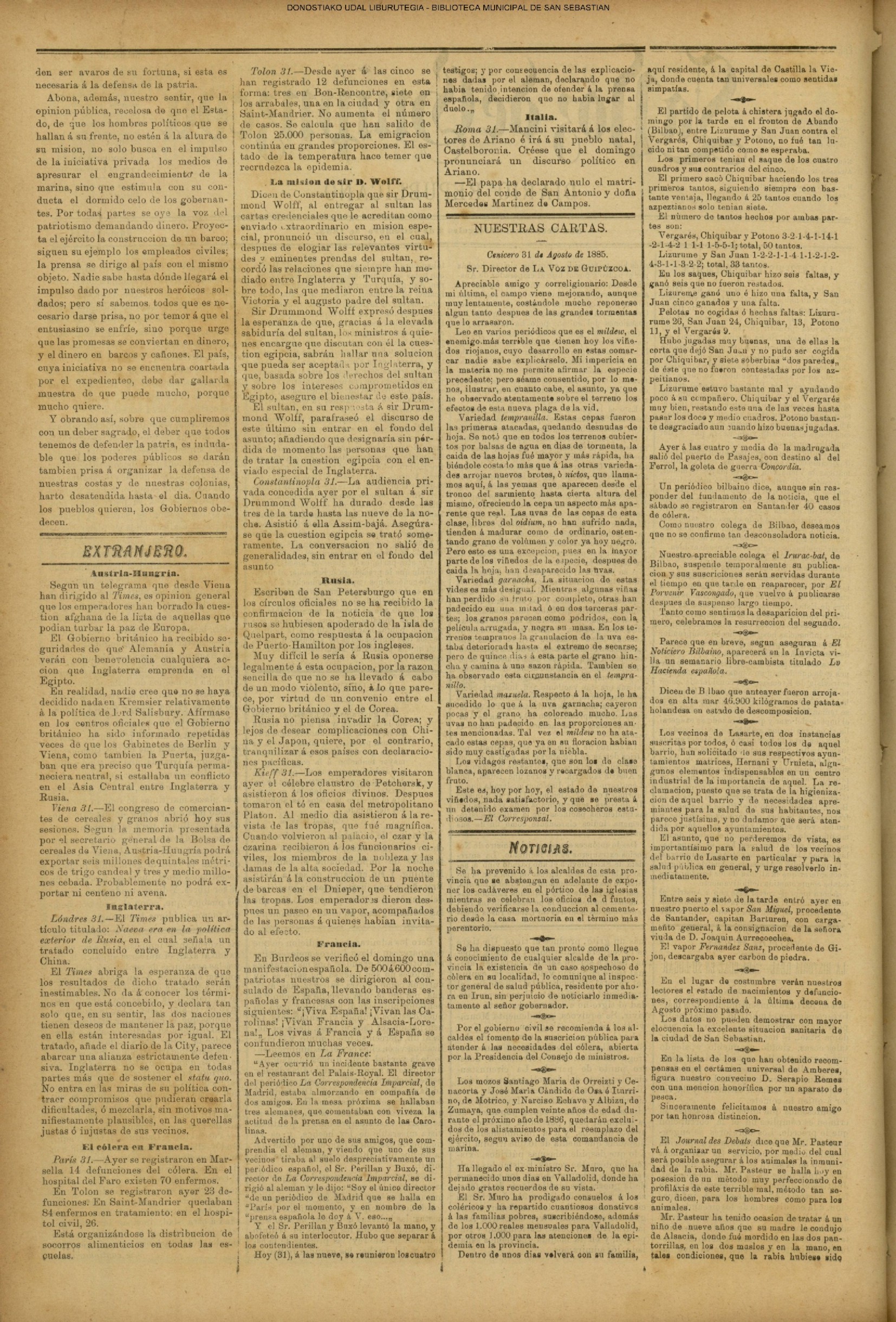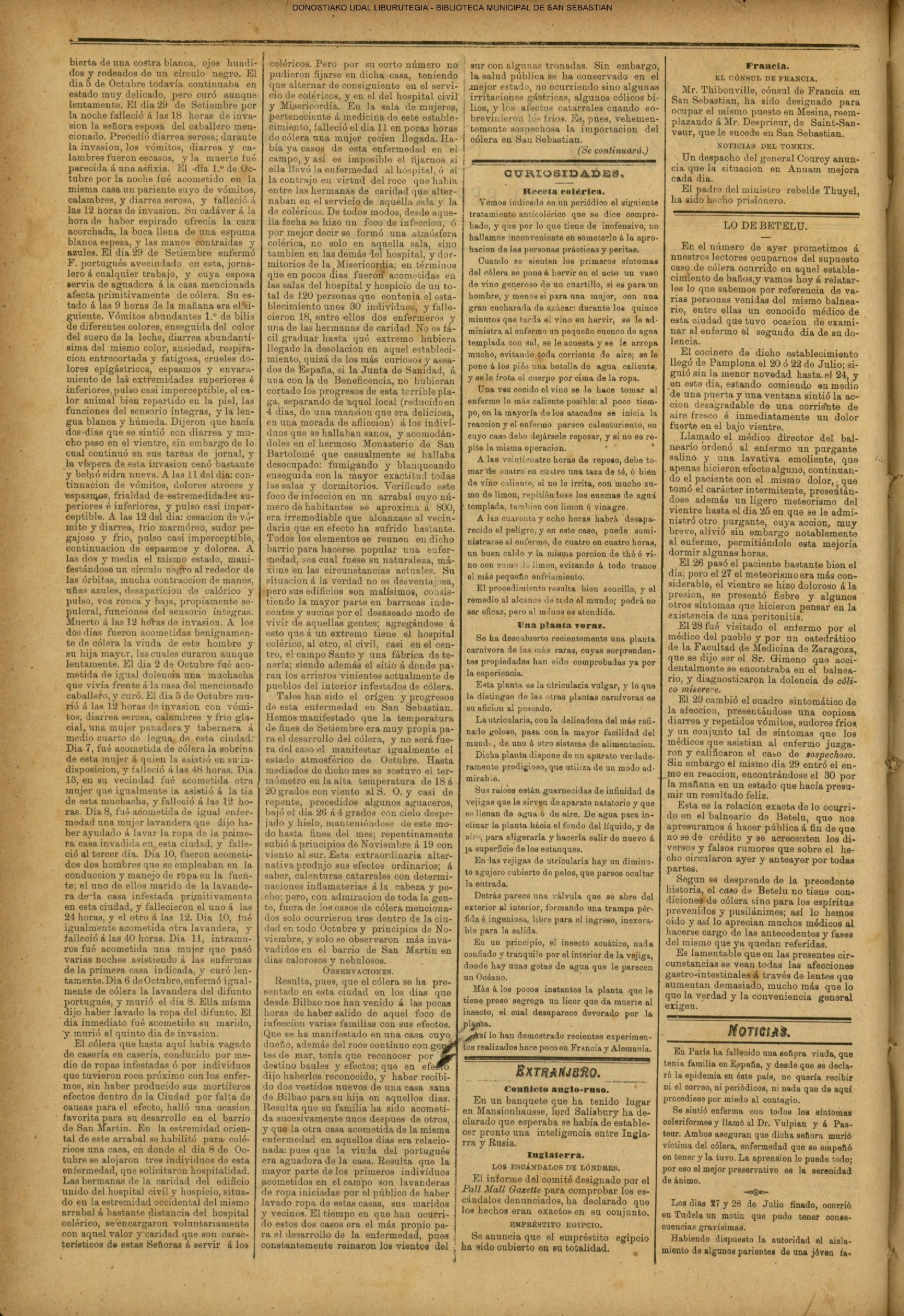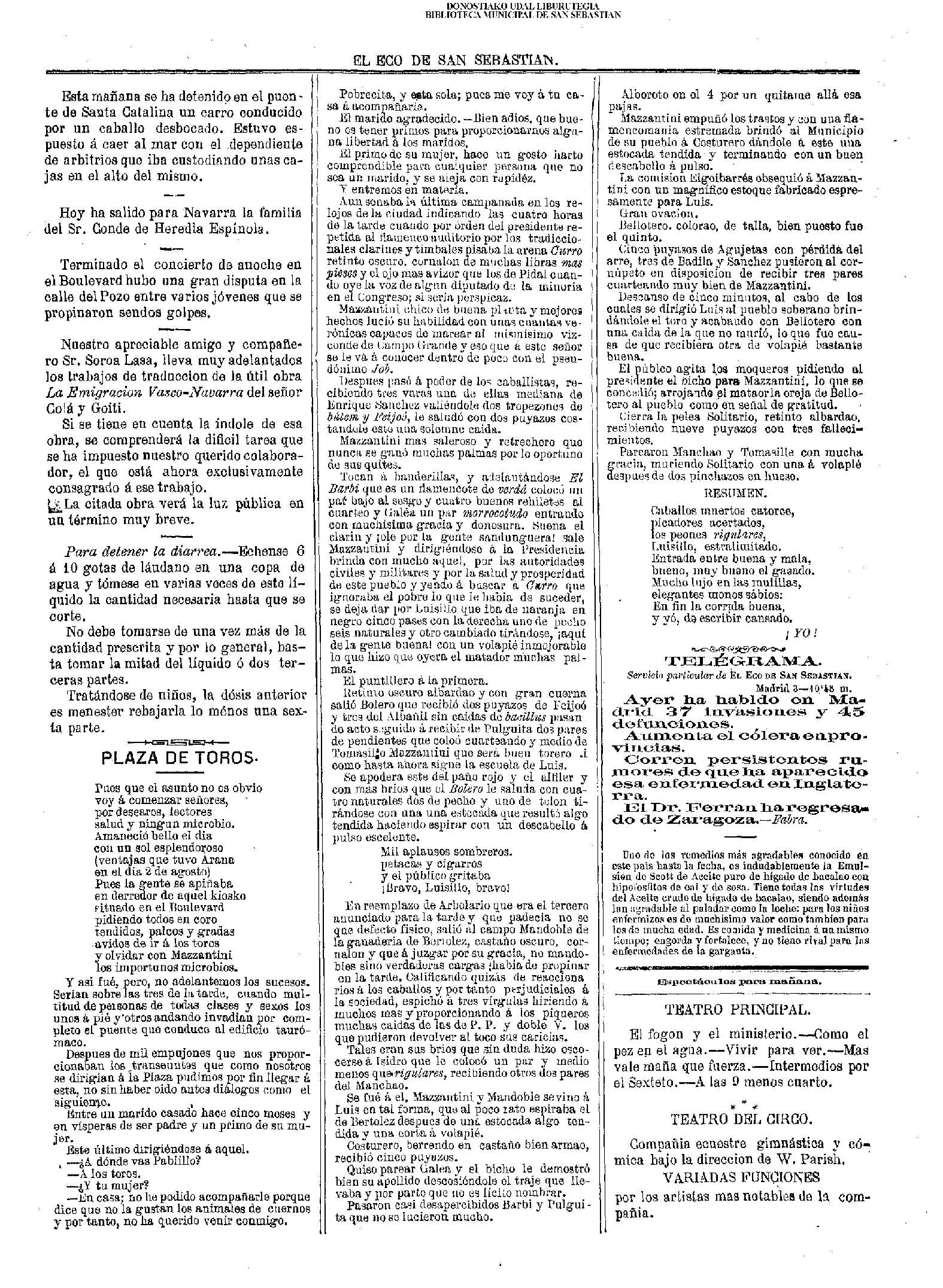 A la vez, probablemente, tendrá lugar con gran ceremonia la imposición de la cruz de Beneficencia al director de dichas obras, D. Sebastián Cámio, y a los contramaestres Francisco Mambrona y Vicente Urresti, quienes la tienen justamente ganada por actos heroicos de valor, llevados a cabo en la terrible barra del Urumea.