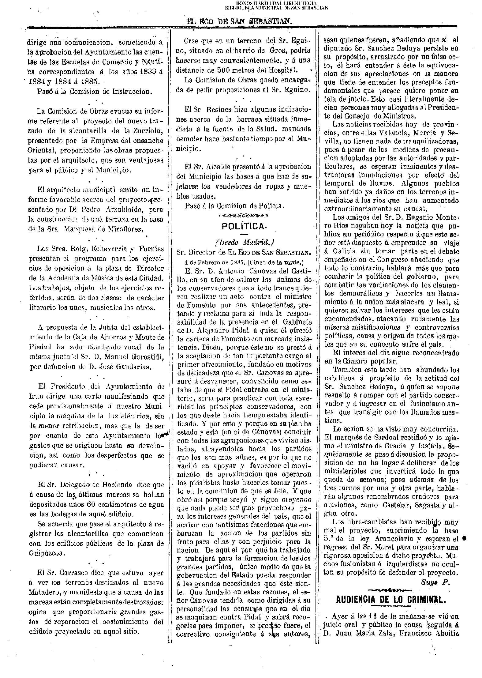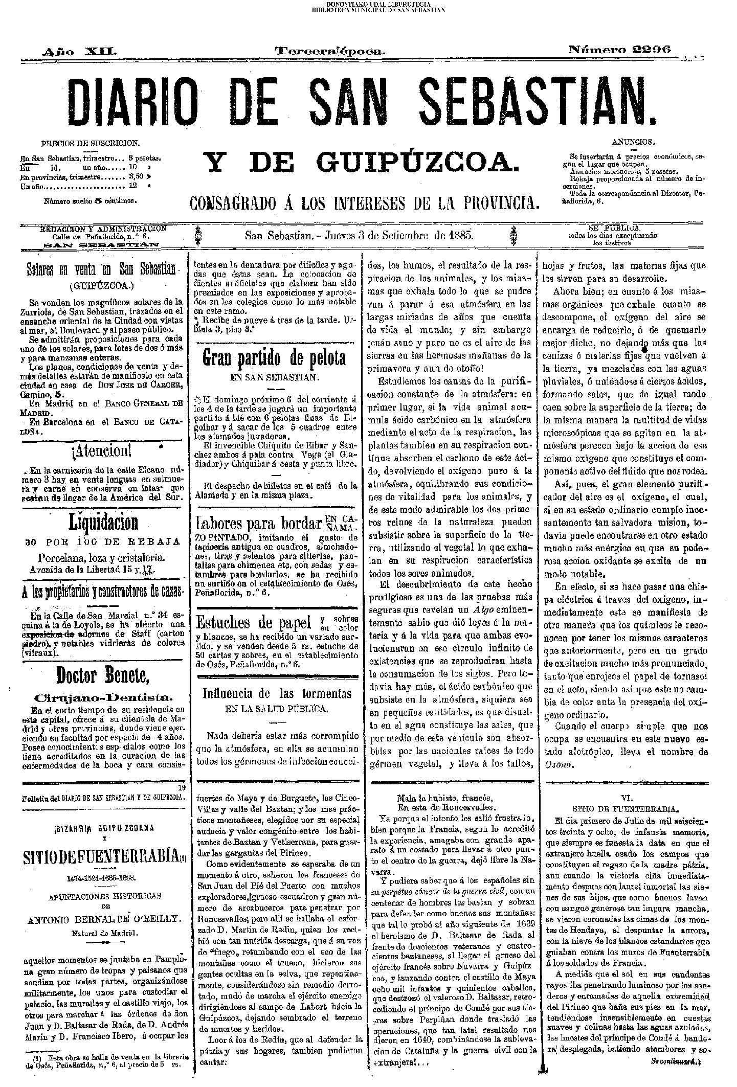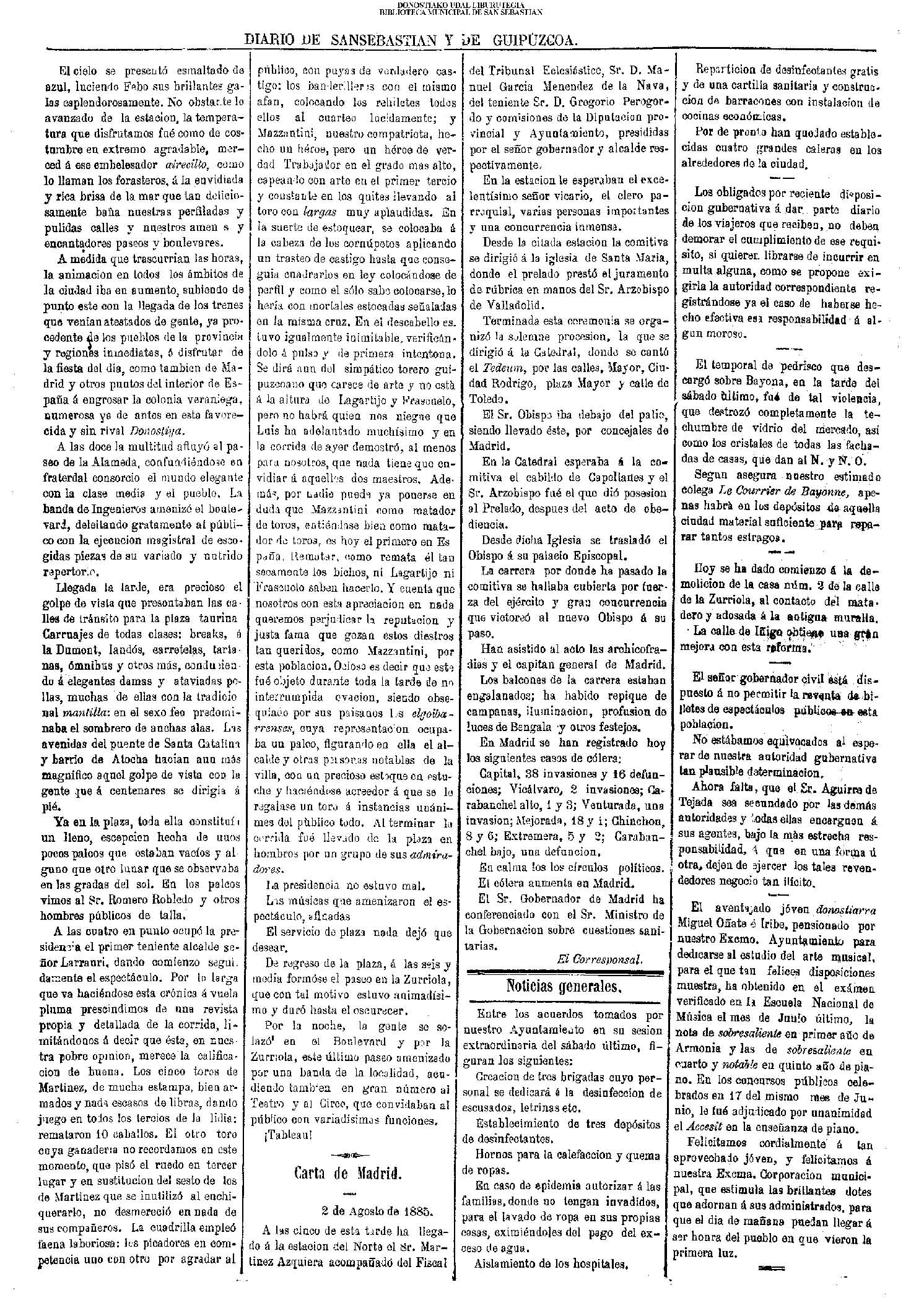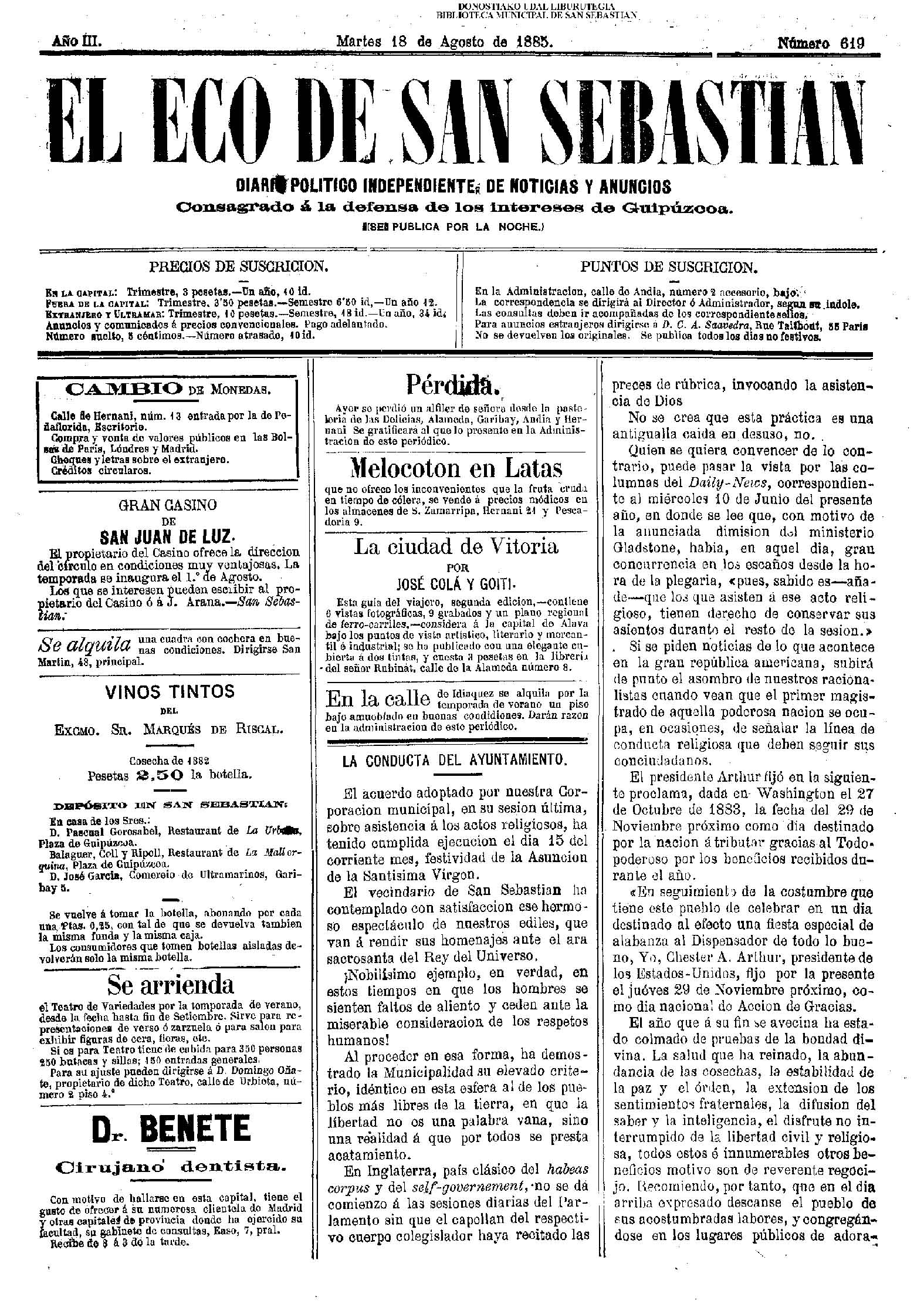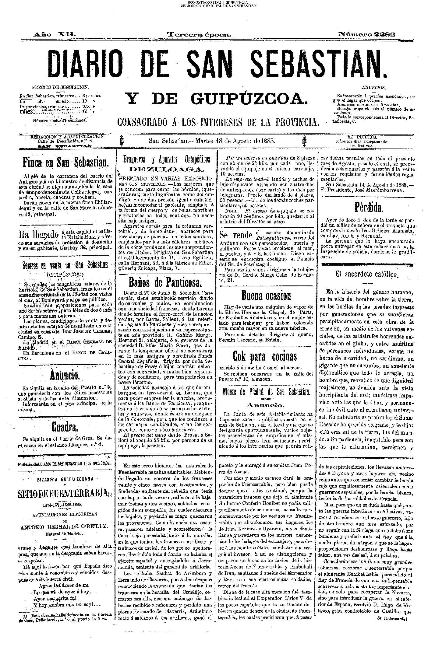 El año pasado se tenía todo preparado para que S. M. el Rey, en su viaje de Gijón a ésta, pusiera la última piedra de las obras; este verano, si D. Alfonso XII vuelve a Betelu y visita & esta capital, se le suplicará que coloque la primera del puente proyectado, después que los terrenos sean bendecidos.