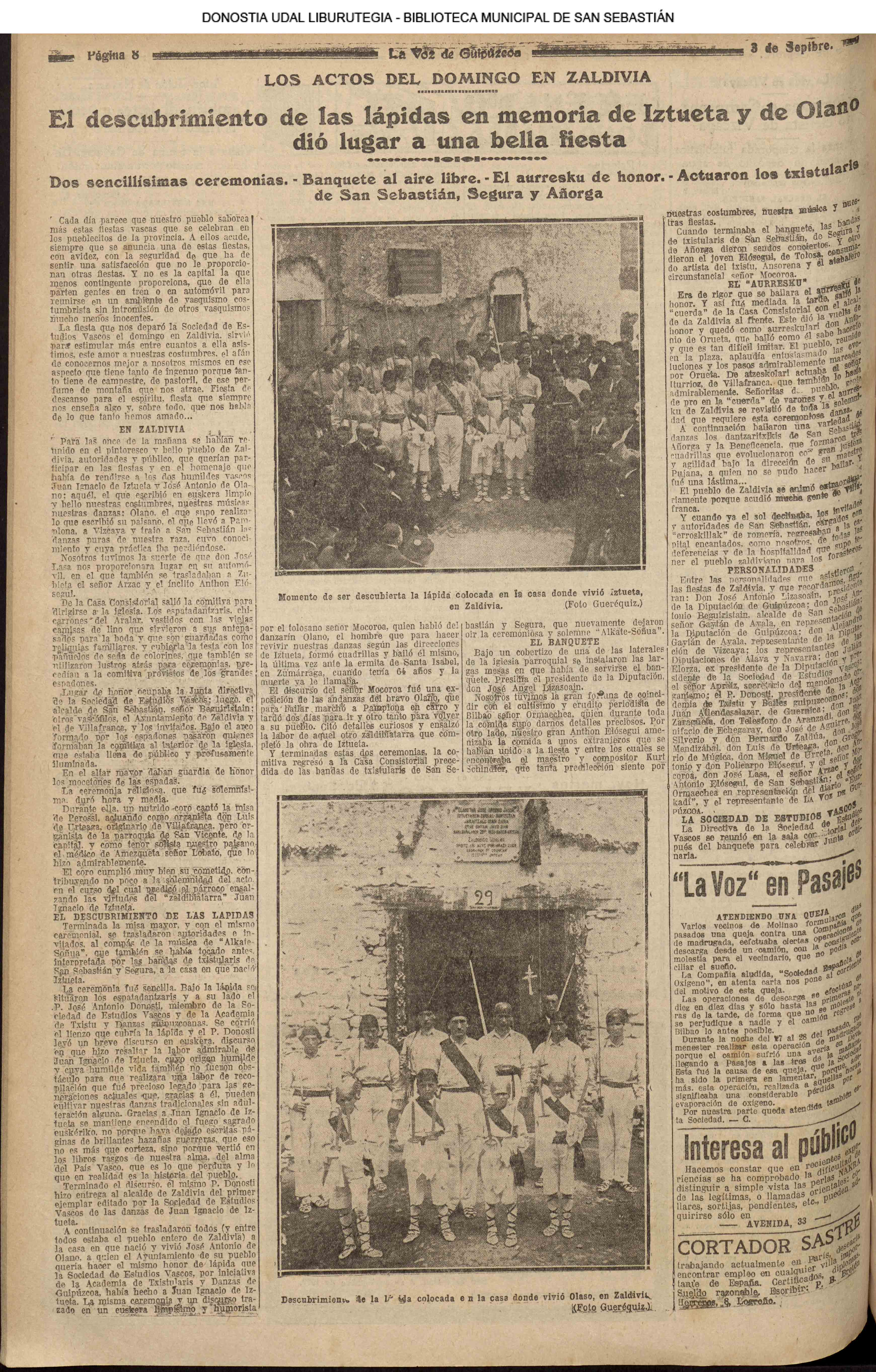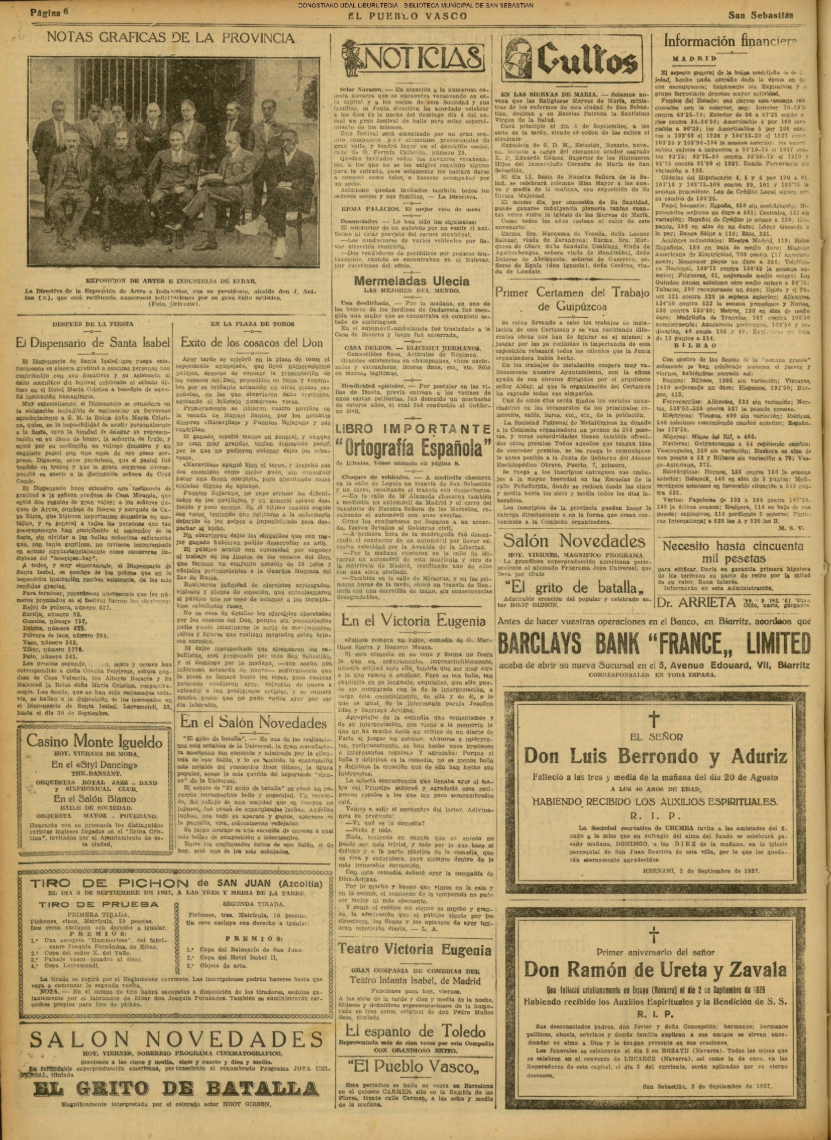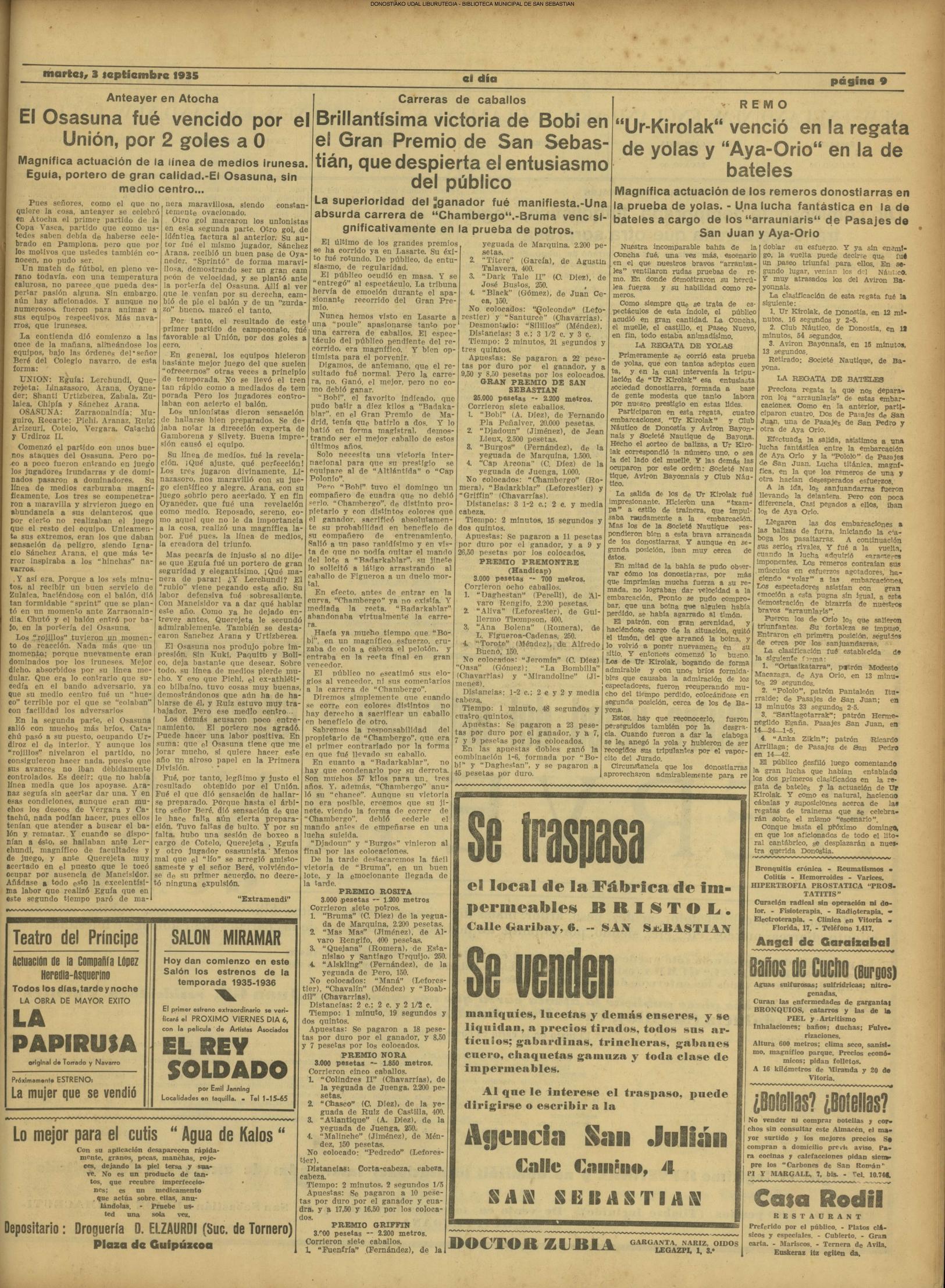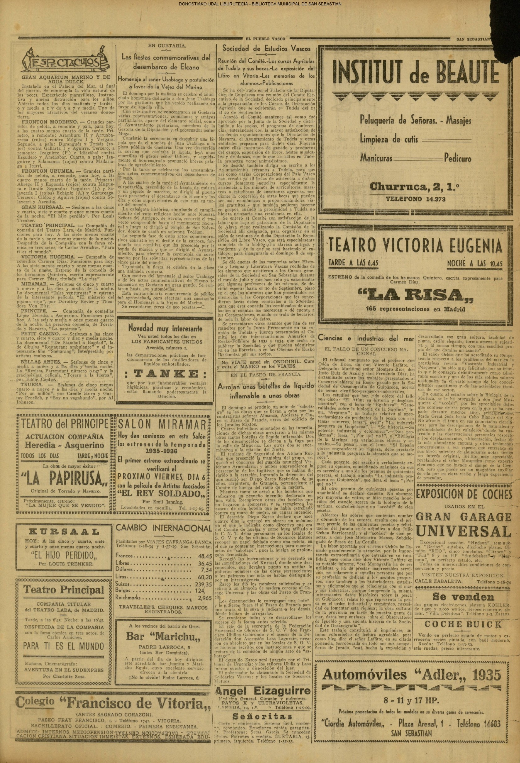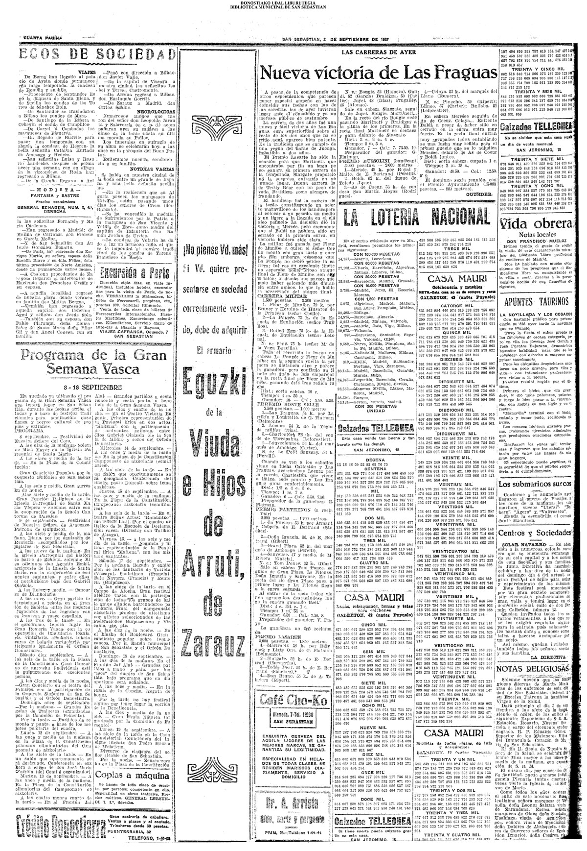 01 - septiembre![]() . | (1931) - LA VOZ DE GUIPUZCOA (CENTROS OFICIALES - Incautación de objetos de arte en una "villa" de San Sebastián.) (La voz de Guipuzcoa)(El Pueblo Vasco)(El Día)(La Constancia) ++++++++++++++++++++++++++++++++++++++++++++++ # EN EL GRAN CASINO.- 36 danzantes comenzaron la prueba para batir el record mundial de baile de resistencia (La Voz de Guipuzcoa)(El Pueblo Vasco)(El Día)(La Constancia) # TAURINAS - BECERRADA (La Voz de Guipuzcoa)(El Pueblo Vasco)(El Día)(La Constancia) ++++++++++++++++++++++++++++++++++++++++++++++ (1933) - (La voz de Guipuzcoa)(El Pueblo Vasco)(El Día)(La Constancia) ++++++++++++++++++++++++++++++++++++++++++++++ (1934) - LA VOZ DE GUIPUZCOA (CENTROS OFICIALES - En el casco viejo donostiarra se formó una manifestación contra el imperialismo y la guerra, y fue disuelta sin incidentes) # LOS AYUNTAMIENTOS VASCOS Y EL ESTADO.- Llegaron a San Sebastián los diputados catalanes que vienen con el propósito de asistir a la Asamblea convocada por la Comisión intermunicipal # PINTORES VASCOS .- Se inaugura en el CAT la exposición de cuadros de Flores Kaperotxipi y de Apellaniz # EL TEMPORAL.- Los veraneantes conocieron la furia del viento que viene del mar y que todo lo destruye ++++++++++++++++++++++++++++++++++++++++++++++ # UN PUEBLO AGRADECIDO .- Guetaria, el pueblo costeño, rindió un sencillo y emocionante HOMENAJE a don Juan Usabiaga y Lasquibar, cuyo nombre ha dado a su Plaza principal # TAURINAS .CORRIDA EXTRAORDINARIA (La voz de Guipuzcoa)(El Pueblo Vasco)(El Día)(La Constancia) # REGATAS EN LA BAHIA.- Ur-kirola en yolas y la tripulación de Aia-Orio en bateles fueron los gandores de las regatas del domingo # NATACIÓN - TRAVESÍA DEL URUMEA.- El francés Pouech, del Biarritz Olimpique, ganó brillantemente la travesia del Urumea, organizada por el Fortuna # CARRERAS DE CABALLOS- HIPÓDROMO DE LASARTE # FESTEJOS DEL 31 DE AGOSTO (La voz de Guipuzcoa)(El Pueblo Vasco)(El Día)(La Constancia) |