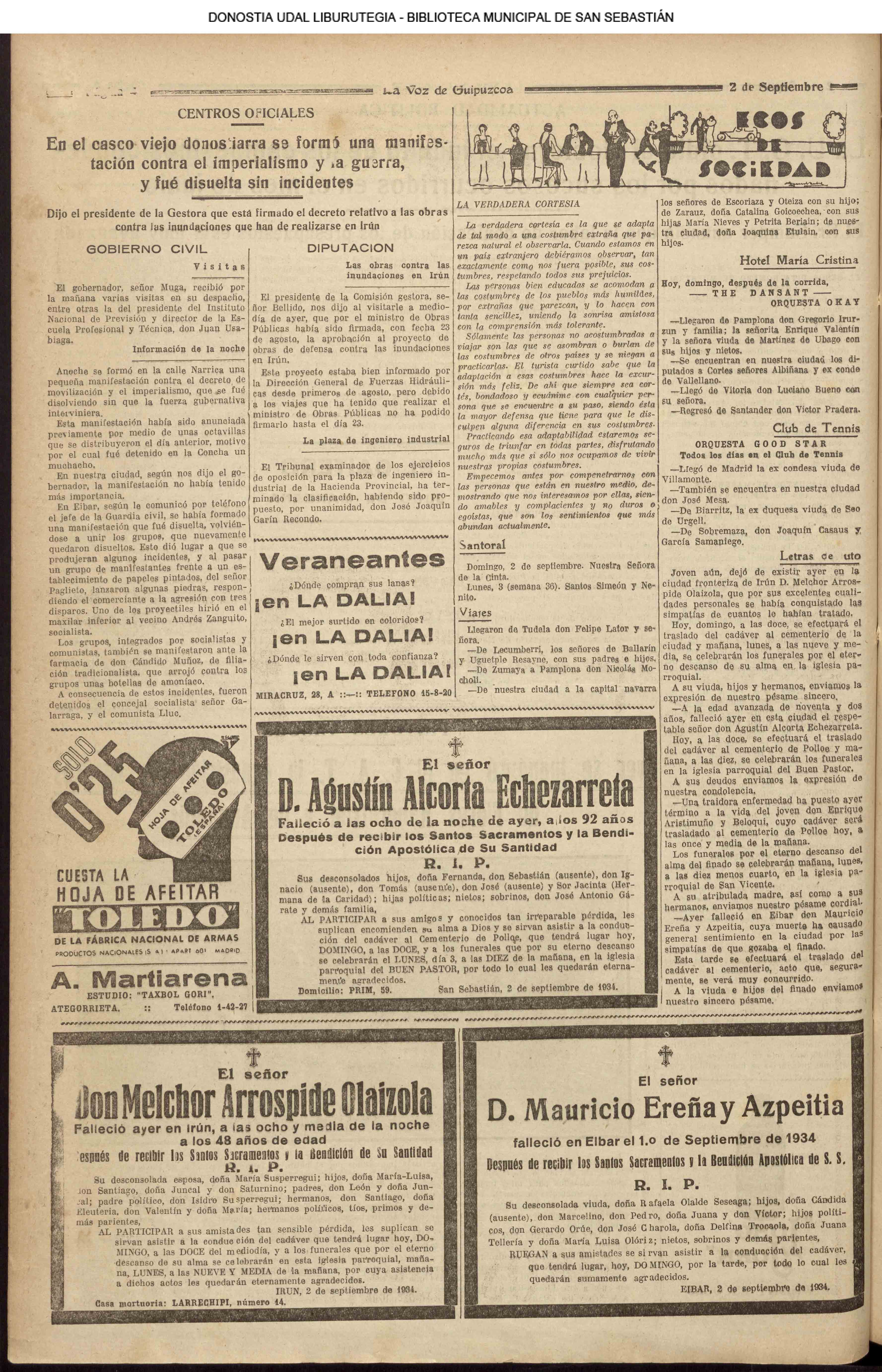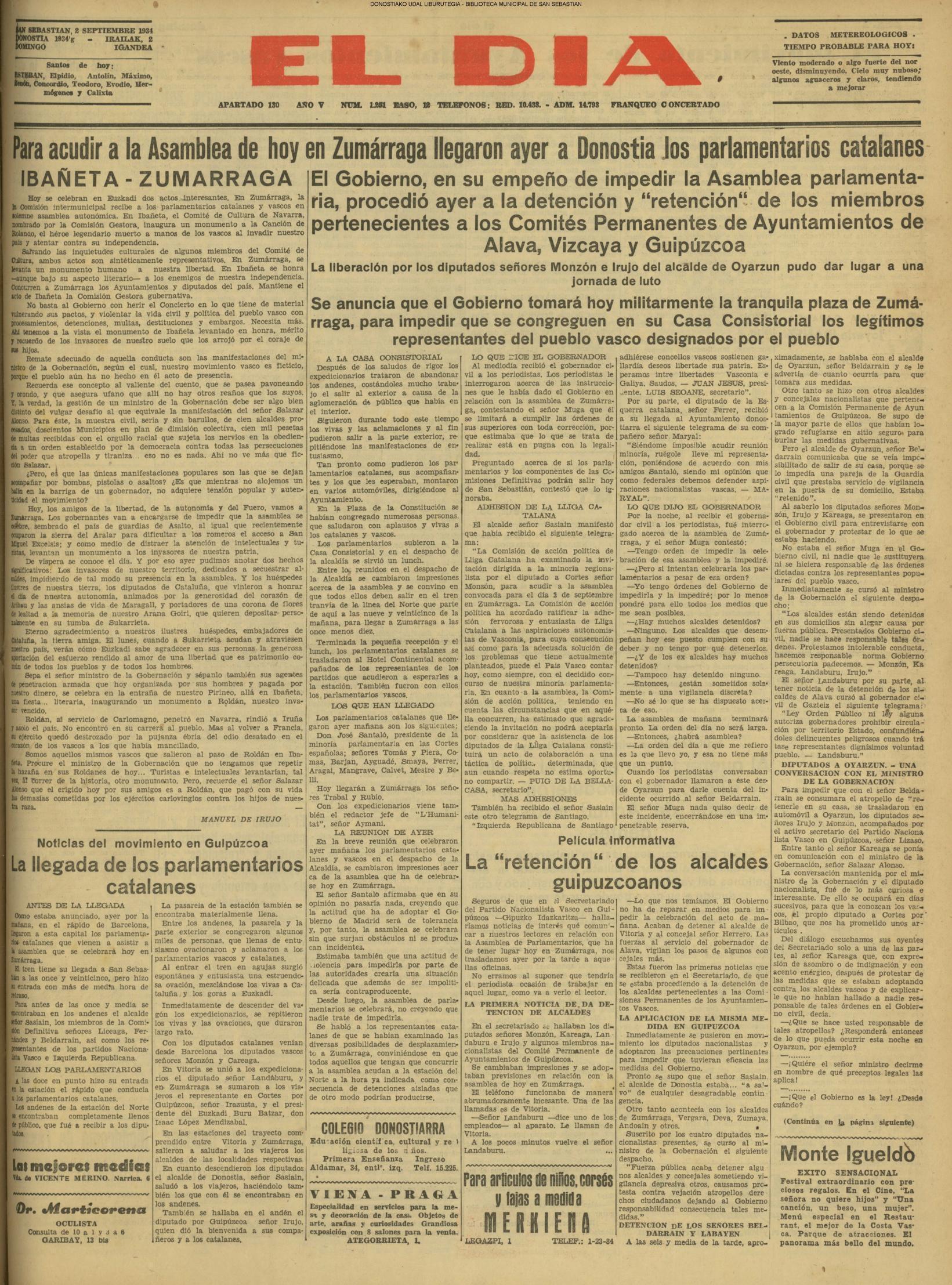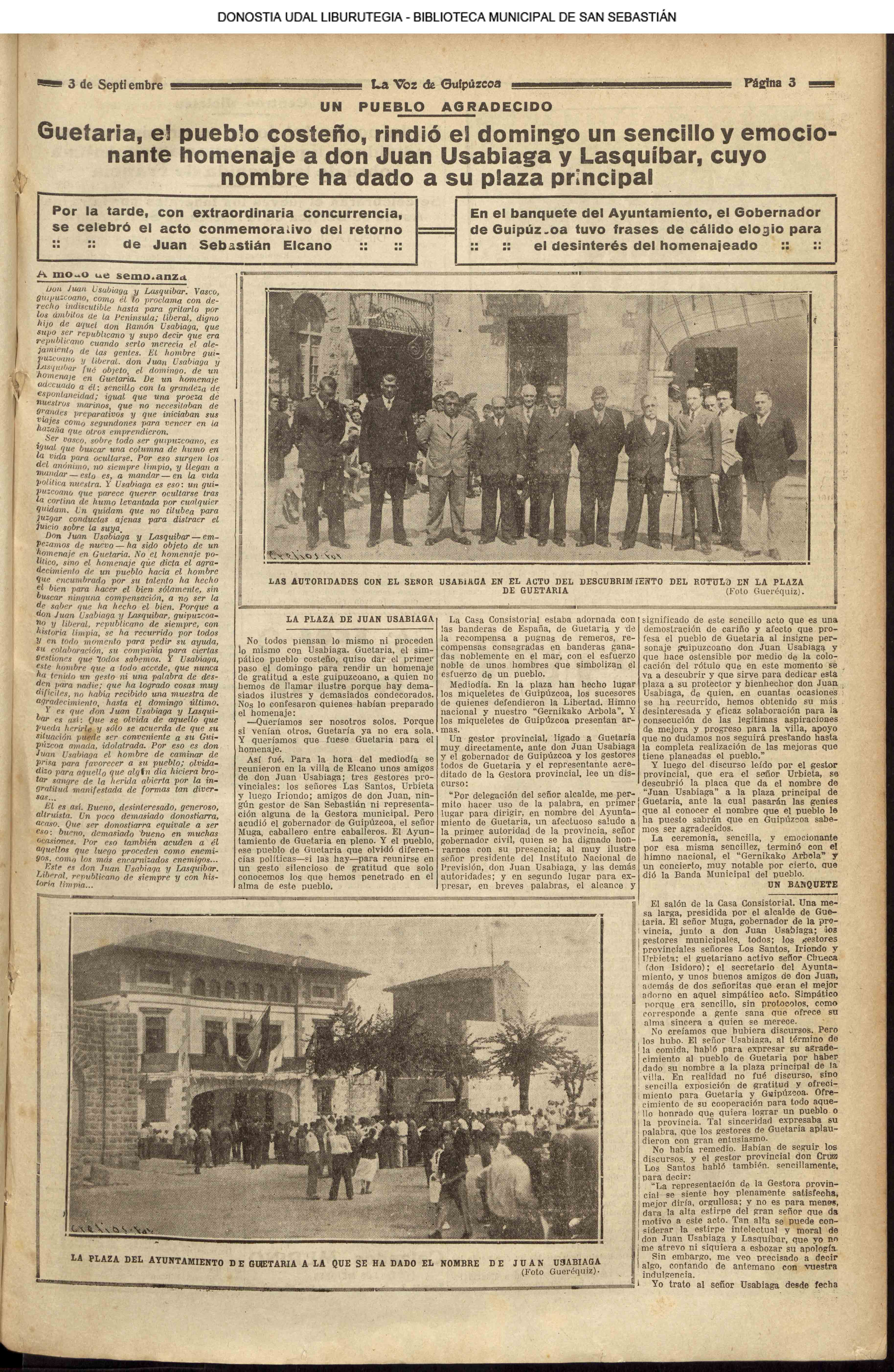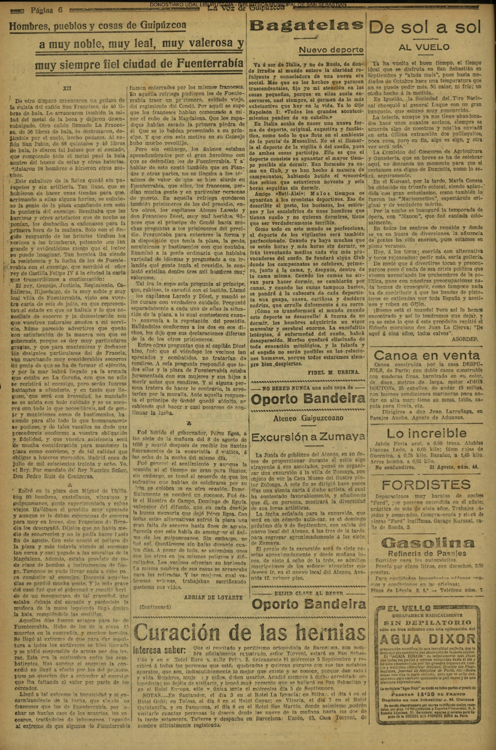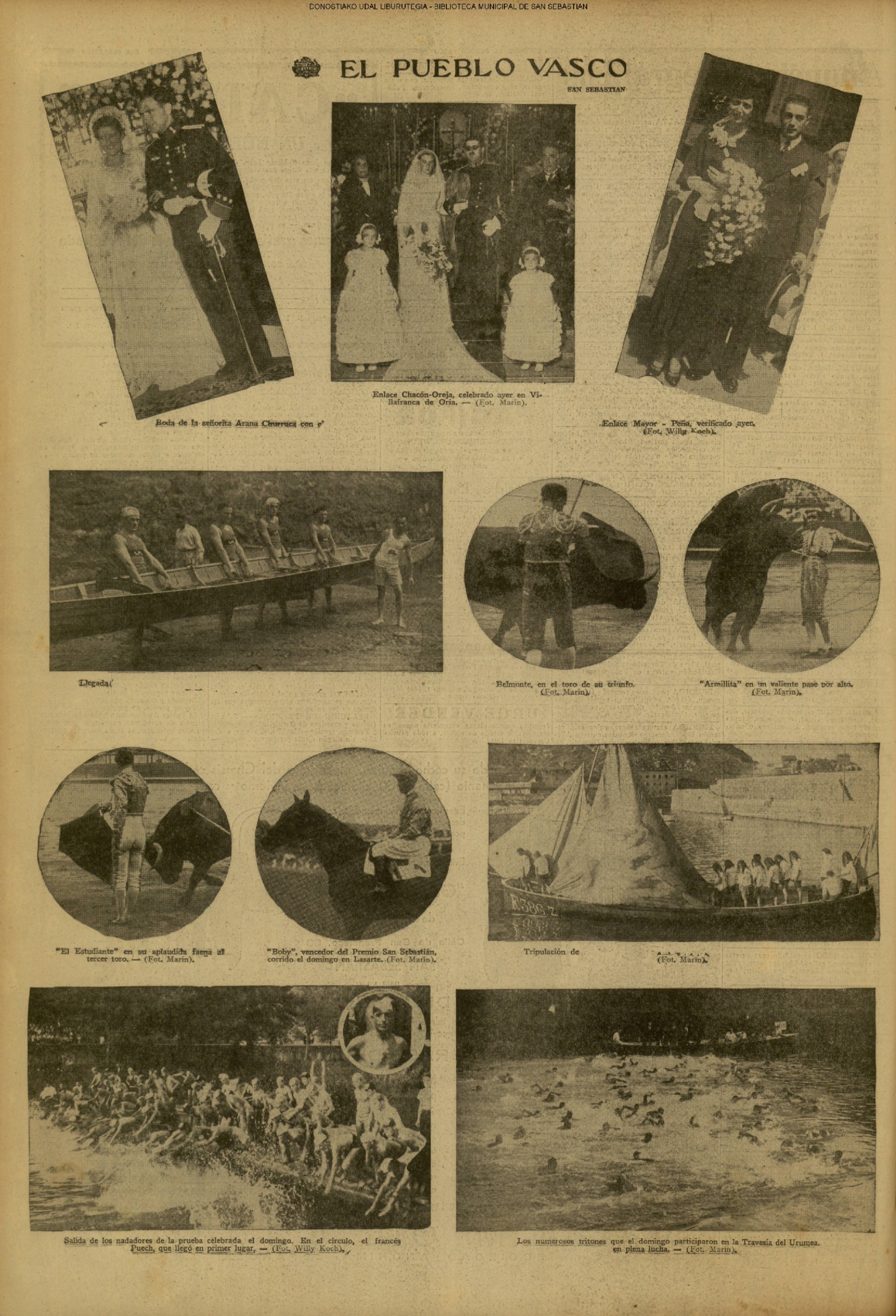 01 - septiembre![]() . | (1931) - LA VOZ DE GUIPUZCOA (CENTROS OFICIALES - Incautación de objetos de arte en una "villa" de San Sebastián.) (La voz de Guipuzcoa)(El Pueblo Vasco)(El Día)(La Constancia) ++++++++++++++++++++++++++++++++++++++++++++++ # EN EL GRAN CASINO.- 36 danzantes comenzaron la prueba para batir el record mundial de baile de resistencia (La Voz de Guipuzcoa)(El Pueblo Vasco)(El Día)(La Constancia) # TAURINAS - BECERRADA (La Voz de Guipuzcoa)(El Pueblo Vasco)(El Día)(La Constancia) ++++++++++++++++++++++++++++++++++++++++++++++ (1933) - (La voz de Guipuzcoa)(El Pueblo Vasco)(El Día)(La Constancia) ++++++++++++++++++++++++++++++++++++++++++++++ (1934) - LA VOZ DE GUIPUZCOA (CENTROS OFICIALES - En el casco viejo donostiarra se formó una manifestación contra el imperialismo y la guerra, y fue disuelta sin incidentes) # LOS AYUNTAMIENTOS VASCOS Y EL ESTADO.- Llegaron a San Sebastián los diputados catalanes que vienen con el propósito de asistir a la Asamblea convocada por la Comisión intermunicipal # PINTORES VASCOS .- Se inaugura en el CAT la exposición de cuadros de Flores Kaperotxipi y de Apellaniz # EL TEMPORAL.- Los veraneantes conocieron la furia del viento que viene del mar y que todo lo destruye ++++++++++++++++++++++++++++++++++++++++++++++ # UN PUEBLO AGRADECIDO .- Guetaria, el pueblo costeño, rindió un sencillo y emocionante HOMENAJE a don Juan Usabiaga y Lasquibar, cuyo nombre ha dado a su Plaza principal # TAURINAS .CORRIDA EXTRAORDINARIA (La voz de Guipuzcoa)(El Pueblo Vasco)(El Día)(La Constancia) # REGATAS EN LA BAHIA.- Ur-kirola en yolas y la tripulación de Aia-Orio en bateles fueron los gandores de las regatas del domingo # NATACIÓN - TRAVESÍA DEL URUMEA.- El francés Pouech, del Biarritz Olimpique, ganó brillantemente la travesia del Urumea, organizada por el Fortuna # CARRERAS DE CABALLOS- HIPÓDROMO DE LASARTE # FESTEJOS DEL 31 DE AGOSTO (La voz de Guipuzcoa)(El Pueblo Vasco)(El Día)(La Constancia) |