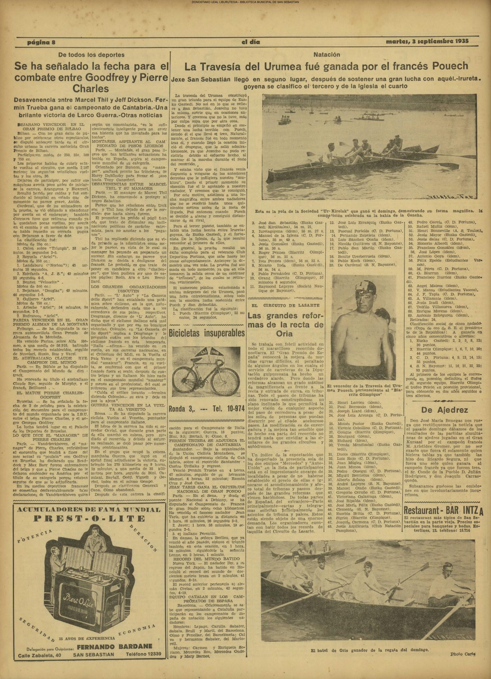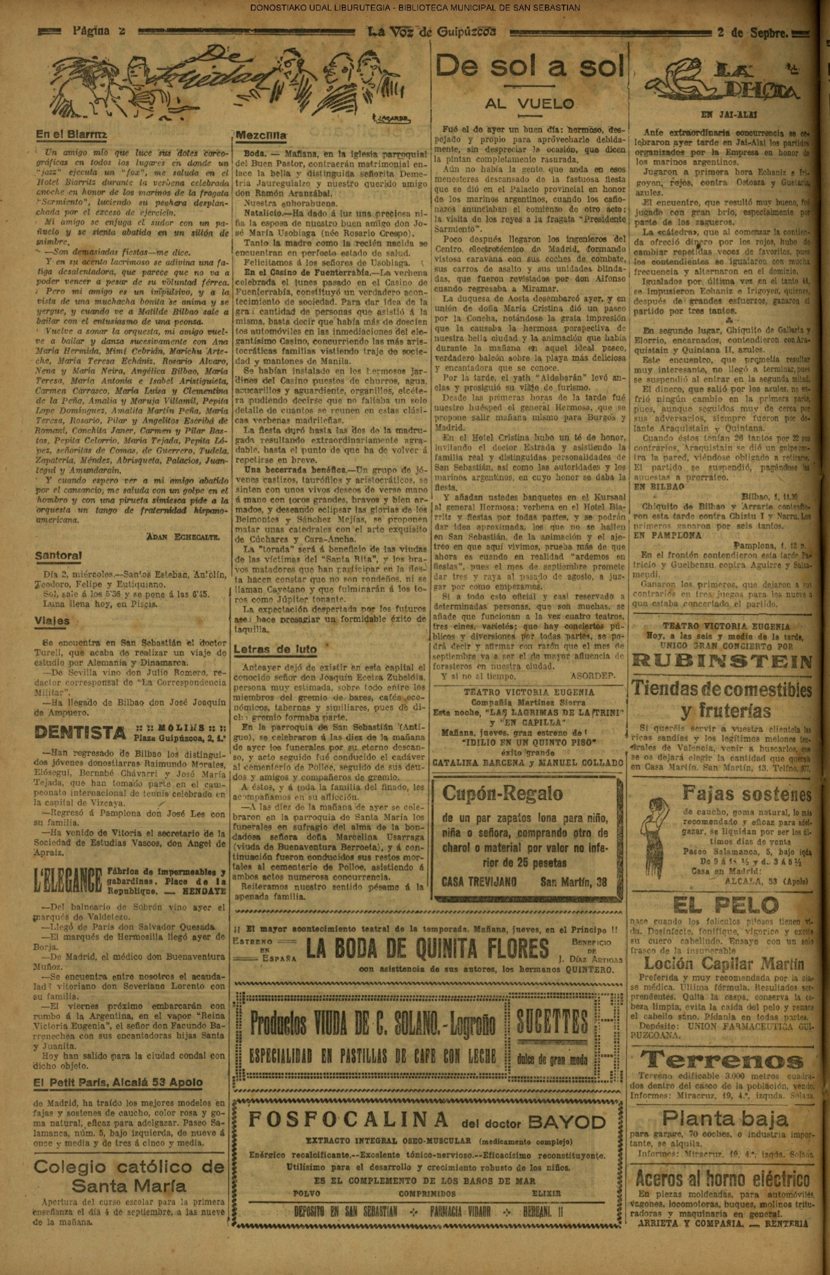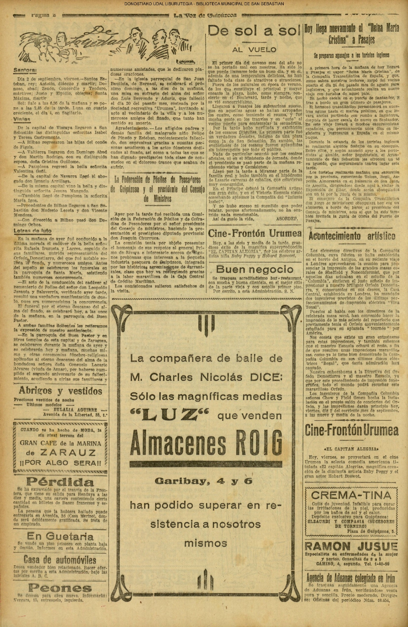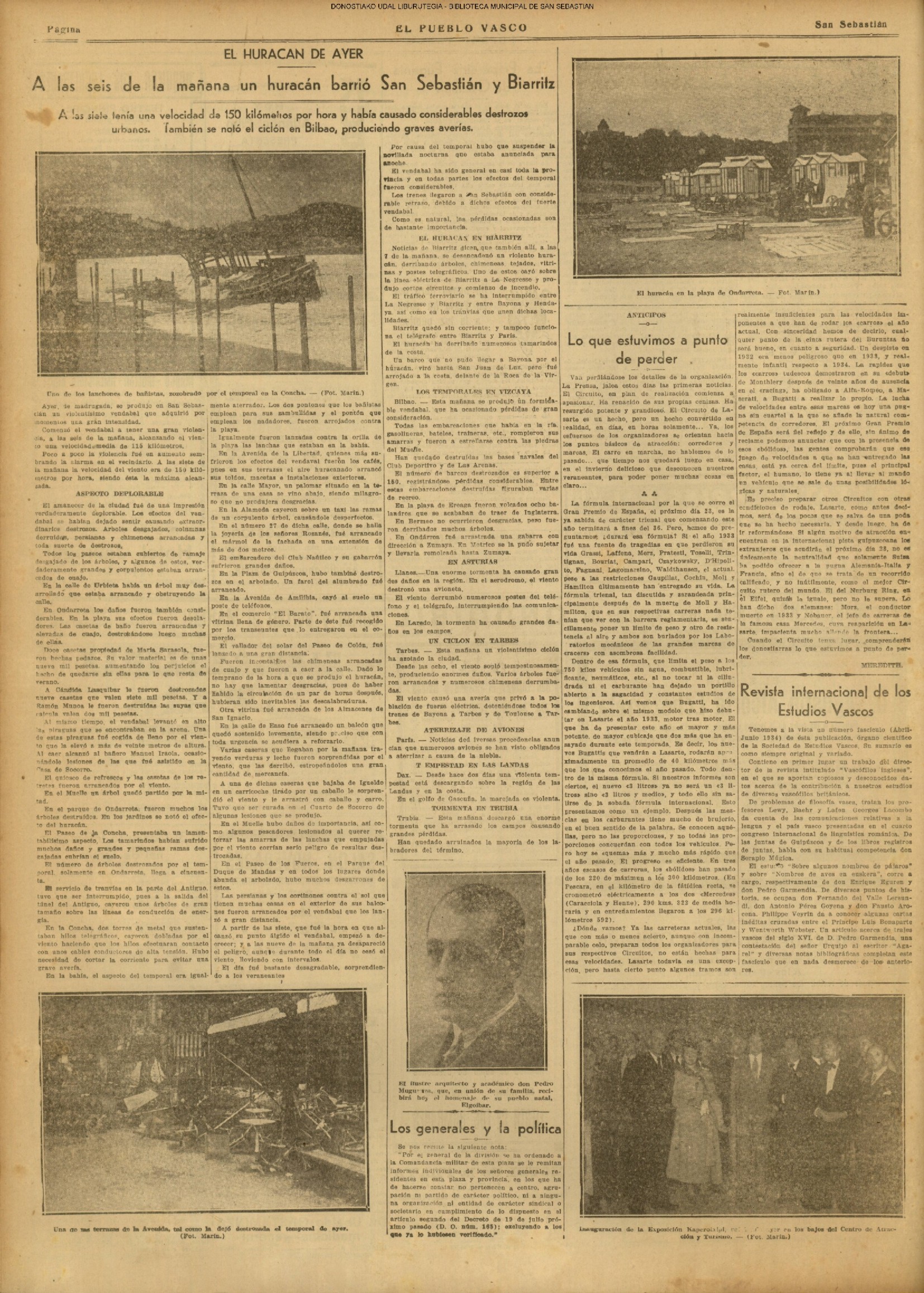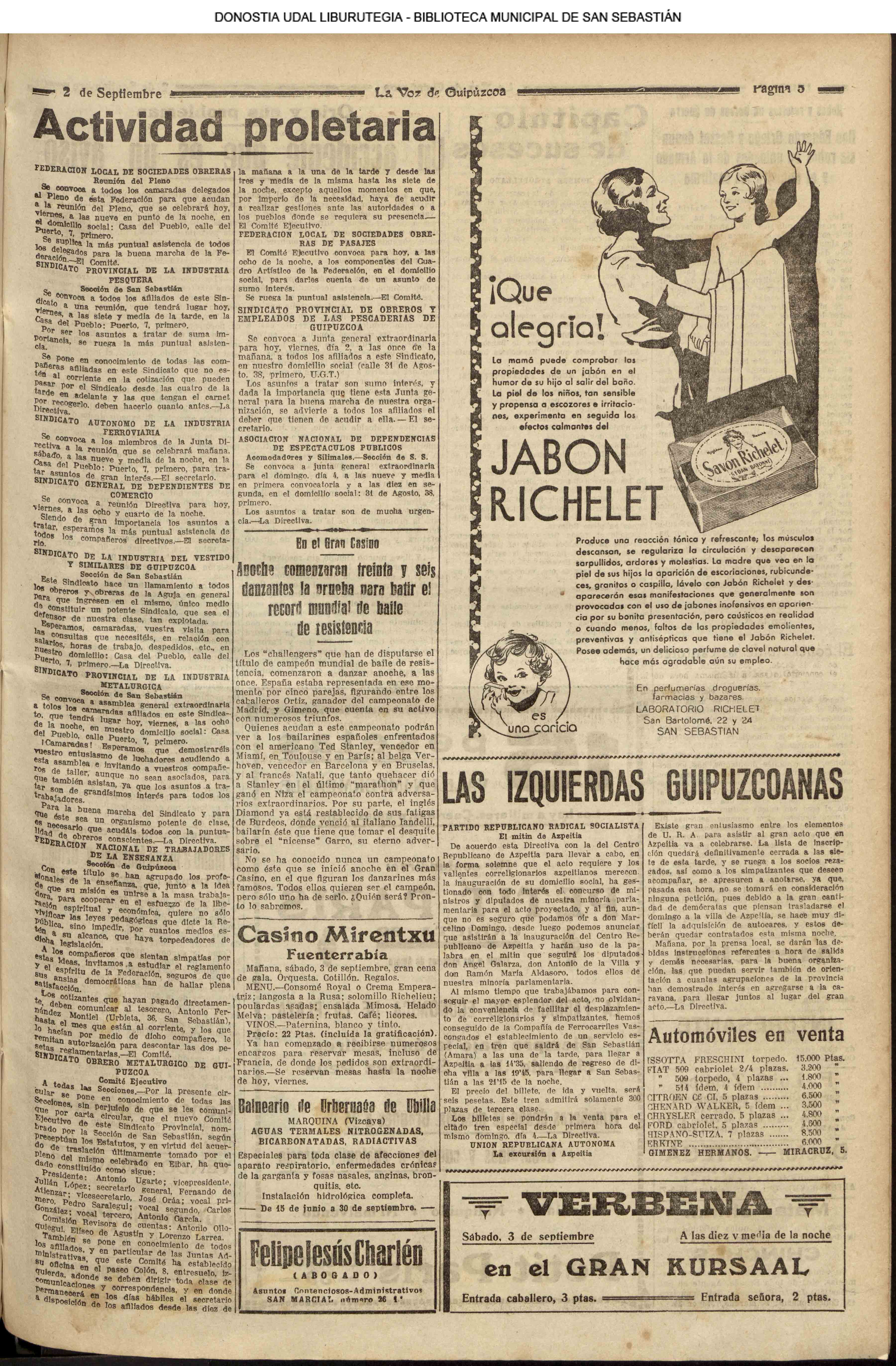 01 - septiembre![]() . | (1931) - LA VOZ DE GUIPUZCOA (CENTROS OFICIALES - Incautación de objetos de arte en una "villa" de San Sebastián.) (La voz de Guipuzcoa)(El Pueblo Vasco)(El Día)(La Constancia) ++++++++++++++++++++++++++++++++++++++++++++++ # EN EL GRAN CASINO.- 36 danzantes comenzaron la prueba para batir el record mundial de baile de resistencia (La Voz de Guipuzcoa)(El Pueblo Vasco)(El Día)(La Constancia) # TAURINAS - BECERRADA (La Voz de Guipuzcoa)(El Pueblo Vasco)(El Día)(La Constancia) ++++++++++++++++++++++++++++++++++++++++++++++ (1933) - (La voz de Guipuzcoa)(El Pueblo Vasco)(El Día)(La Constancia) ++++++++++++++++++++++++++++++++++++++++++++++ (1934) - LA VOZ DE GUIPUZCOA (CENTROS OFICIALES - En el casco viejo donostiarra se formó una manifestación contra el imperialismo y la guerra, y fue disuelta sin incidentes) # LOS AYUNTAMIENTOS VASCOS Y EL ESTADO.- Llegaron a San Sebastián los diputados catalanes que vienen con el propósito de asistir a la Asamblea convocada por la Comisión intermunicipal # PINTORES VASCOS .- Se inaugura en el CAT la exposición de cuadros de Flores Kaperotxipi y de Apellaniz # EL TEMPORAL.- Los veraneantes conocieron la furia del viento que viene del mar y que todo lo destruye ++++++++++++++++++++++++++++++++++++++++++++++ # UN PUEBLO AGRADECIDO .- Guetaria, el pueblo costeño, rindió un sencillo y emocionante HOMENAJE a don Juan Usabiaga y Lasquibar, cuyo nombre ha dado a su Plaza principal # TAURINAS .CORRIDA EXTRAORDINARIA (La voz de Guipuzcoa)(El Pueblo Vasco)(El Día)(La Constancia) # REGATAS EN LA BAHIA.- Ur-kirola en yolas y la tripulación de Aia-Orio en bateles fueron los gandores de las regatas del domingo # NATACIÓN - TRAVESÍA DEL URUMEA.- El francés Pouech, del Biarritz Olimpique, ganó brillantemente la travesia del Urumea, organizada por el Fortuna # CARRERAS DE CABALLOS- HIPÓDROMO DE LASARTE # FESTEJOS DEL 31 DE AGOSTO (La voz de Guipuzcoa)(El Pueblo Vasco)(El Día)(La Constancia) |