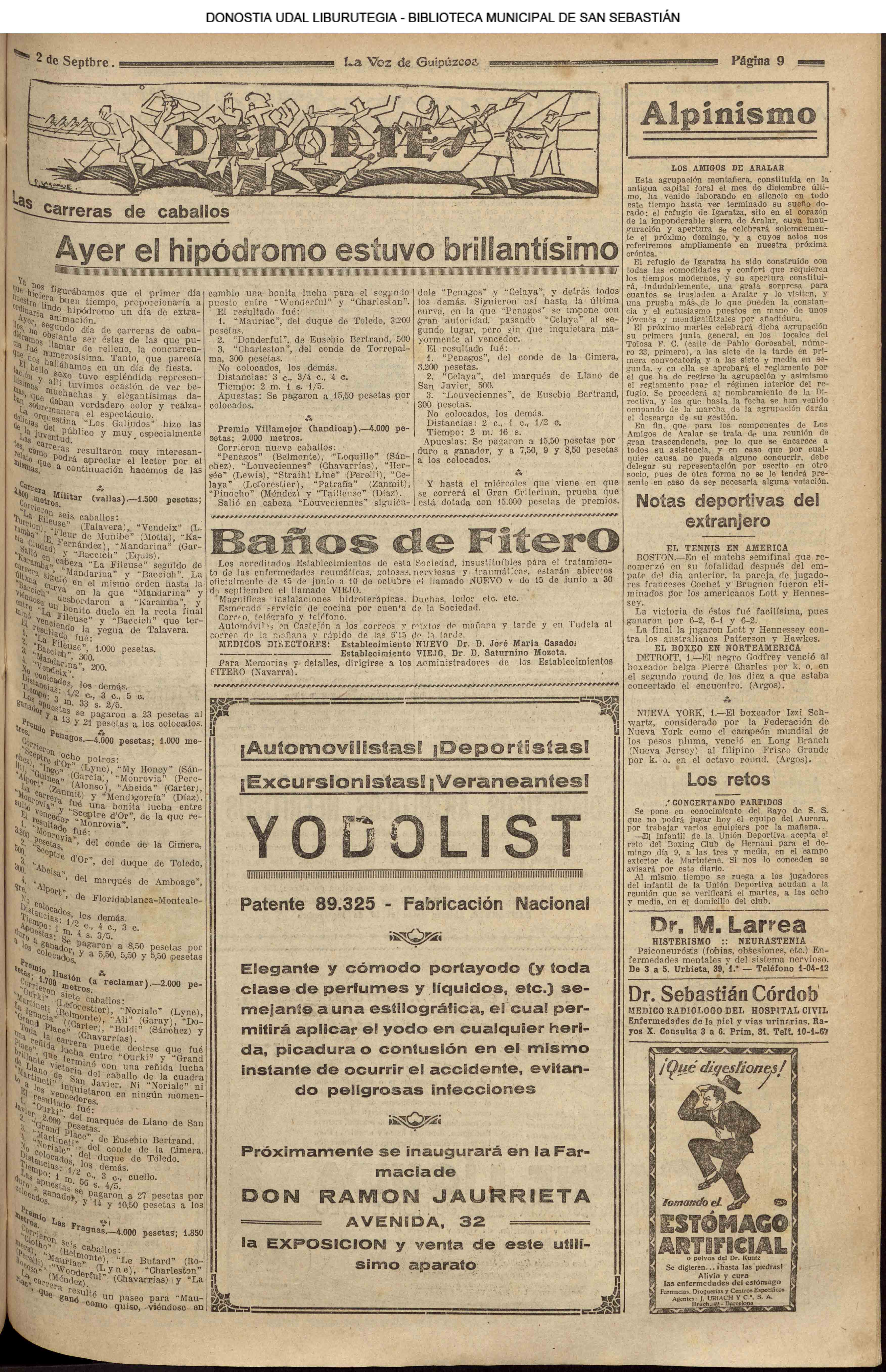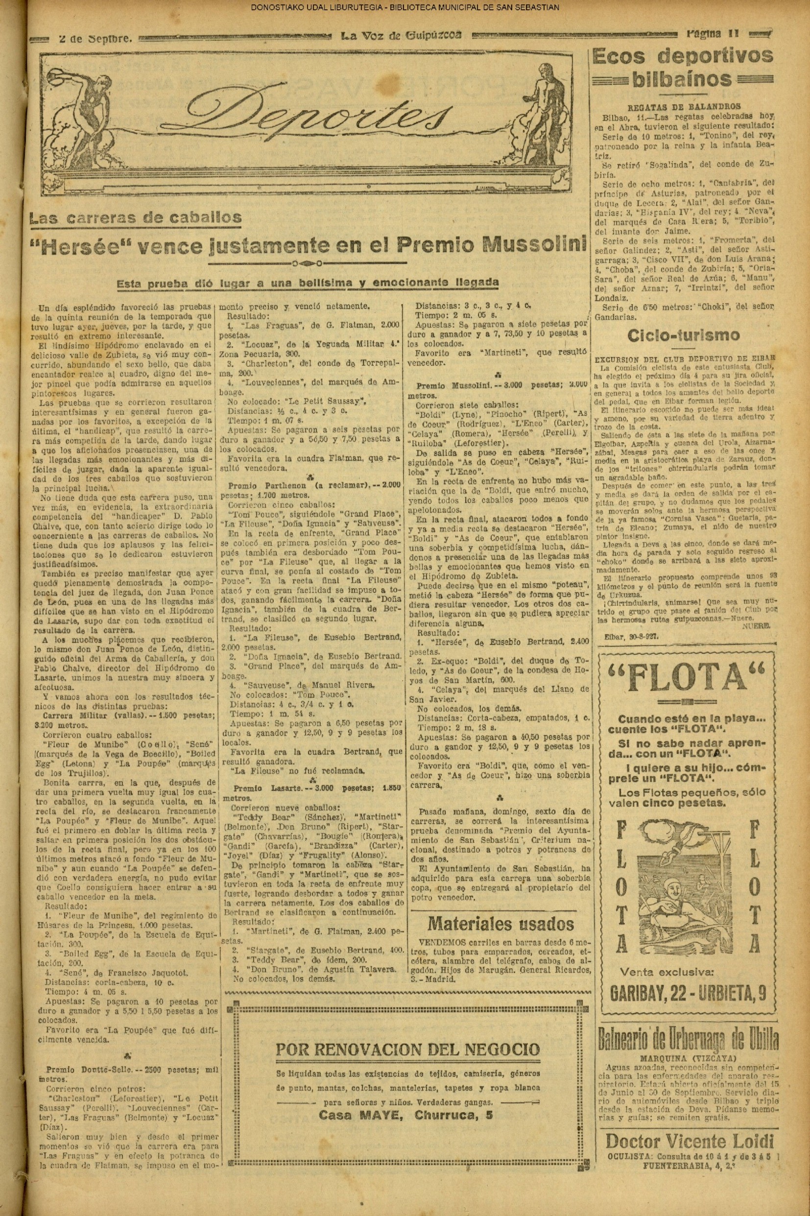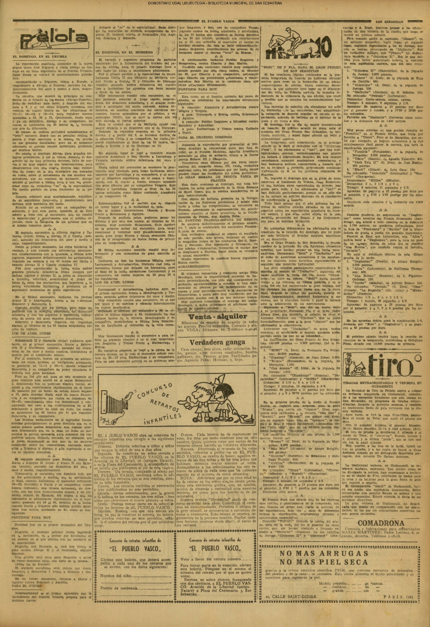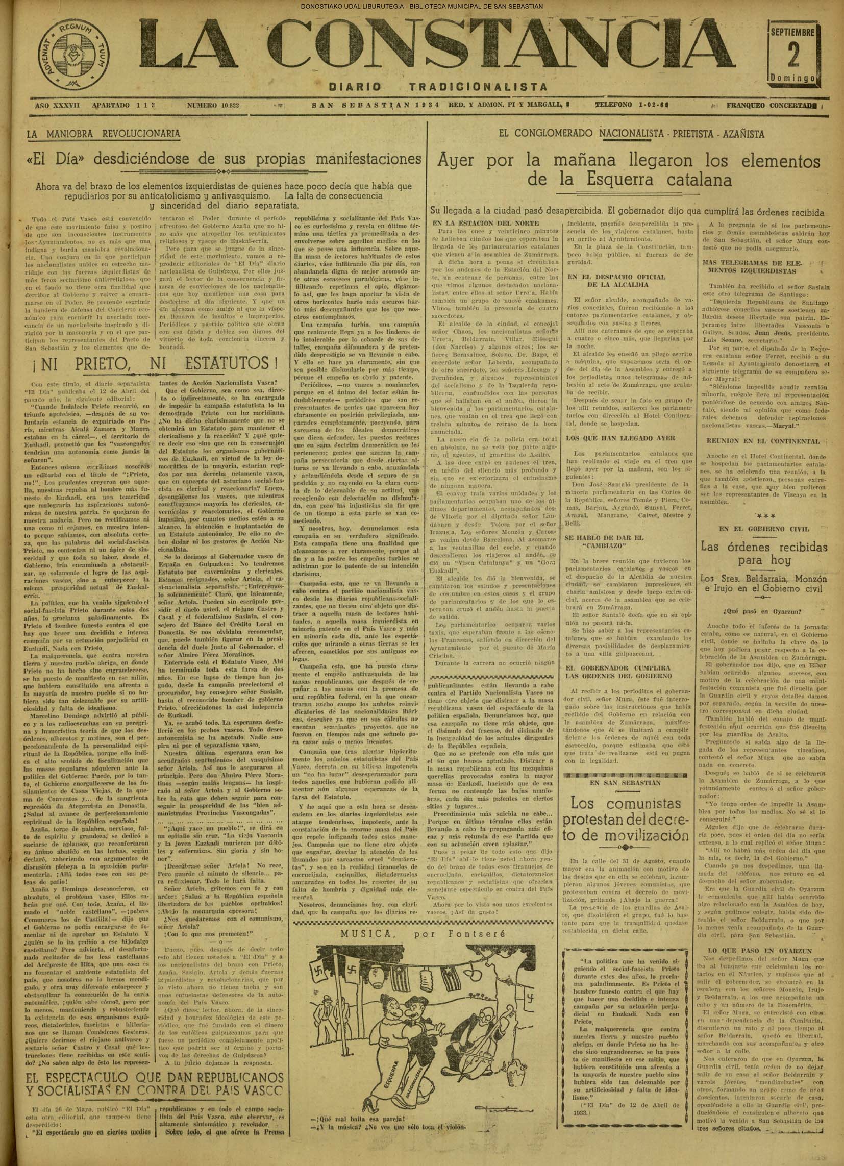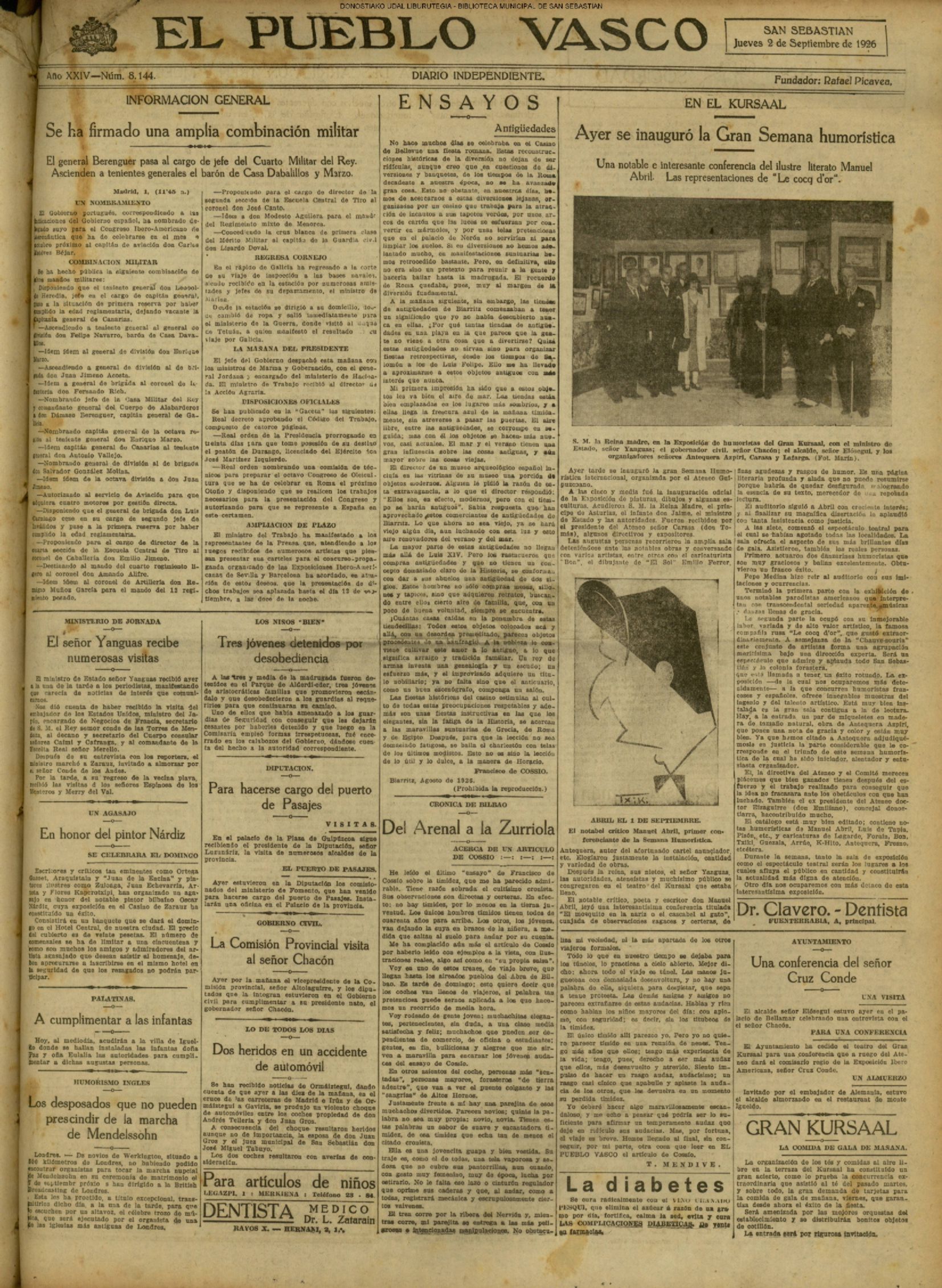 01 - septiembre![]() . | (1931) - LA VOZ DE GUIPUZCOA (CENTROS OFICIALES - Incautación de objetos de arte en una "villa" de San Sebastián.) (La voz de Guipuzcoa)(El Pueblo Vasco)(El Día)(La Constancia) ++++++++++++++++++++++++++++++++++++++++++++++ # EN EL GRAN CASINO.- 36 danzantes comenzaron la prueba para batir el record mundial de baile de resistencia (La Voz de Guipuzcoa)(El Pueblo Vasco)(El Día)(La Constancia) # TAURINAS - BECERRADA (La Voz de Guipuzcoa)(El Pueblo Vasco)(El Día)(La Constancia) ++++++++++++++++++++++++++++++++++++++++++++++ (1933) - (La voz de Guipuzcoa)(El Pueblo Vasco)(El Día)(La Constancia) ++++++++++++++++++++++++++++++++++++++++++++++ (1934) - LA VOZ DE GUIPUZCOA (CENTROS OFICIALES - En el casco viejo donostiarra se formó una manifestación contra el imperialismo y la guerra, y fue disuelta sin incidentes) # LOS AYUNTAMIENTOS VASCOS Y EL ESTADO.- Llegaron a San Sebastián los diputados catalanes que vienen con el propósito de asistir a la Asamblea convocada por la Comisión intermunicipal # PINTORES VASCOS .- Se inaugura en el CAT la exposición de cuadros de Flores Kaperotxipi y de Apellaniz # EL TEMPORAL.- Los veraneantes conocieron la furia del viento que viene del mar y que todo lo destruye ++++++++++++++++++++++++++++++++++++++++++++++ # UN PUEBLO AGRADECIDO .- Guetaria, el pueblo costeño, rindió un sencillo y emocionante HOMENAJE a don Juan Usabiaga y Lasquibar, cuyo nombre ha dado a su Plaza principal # TAURINAS .CORRIDA EXTRAORDINARIA (La voz de Guipuzcoa)(El Pueblo Vasco)(El Día)(La Constancia) # REGATAS EN LA BAHIA.- Ur-kirola en yolas y la tripulación de Aia-Orio en bateles fueron los gandores de las regatas del domingo # NATACIÓN - TRAVESÍA DEL URUMEA.- El francés Pouech, del Biarritz Olimpique, ganó brillantemente la travesia del Urumea, organizada por el Fortuna # CARRERAS DE CABALLOS- HIPÓDROMO DE LASARTE # FESTEJOS DEL 31 DE AGOSTO (La voz de Guipuzcoa)(El Pueblo Vasco)(El Día)(La Constancia) |