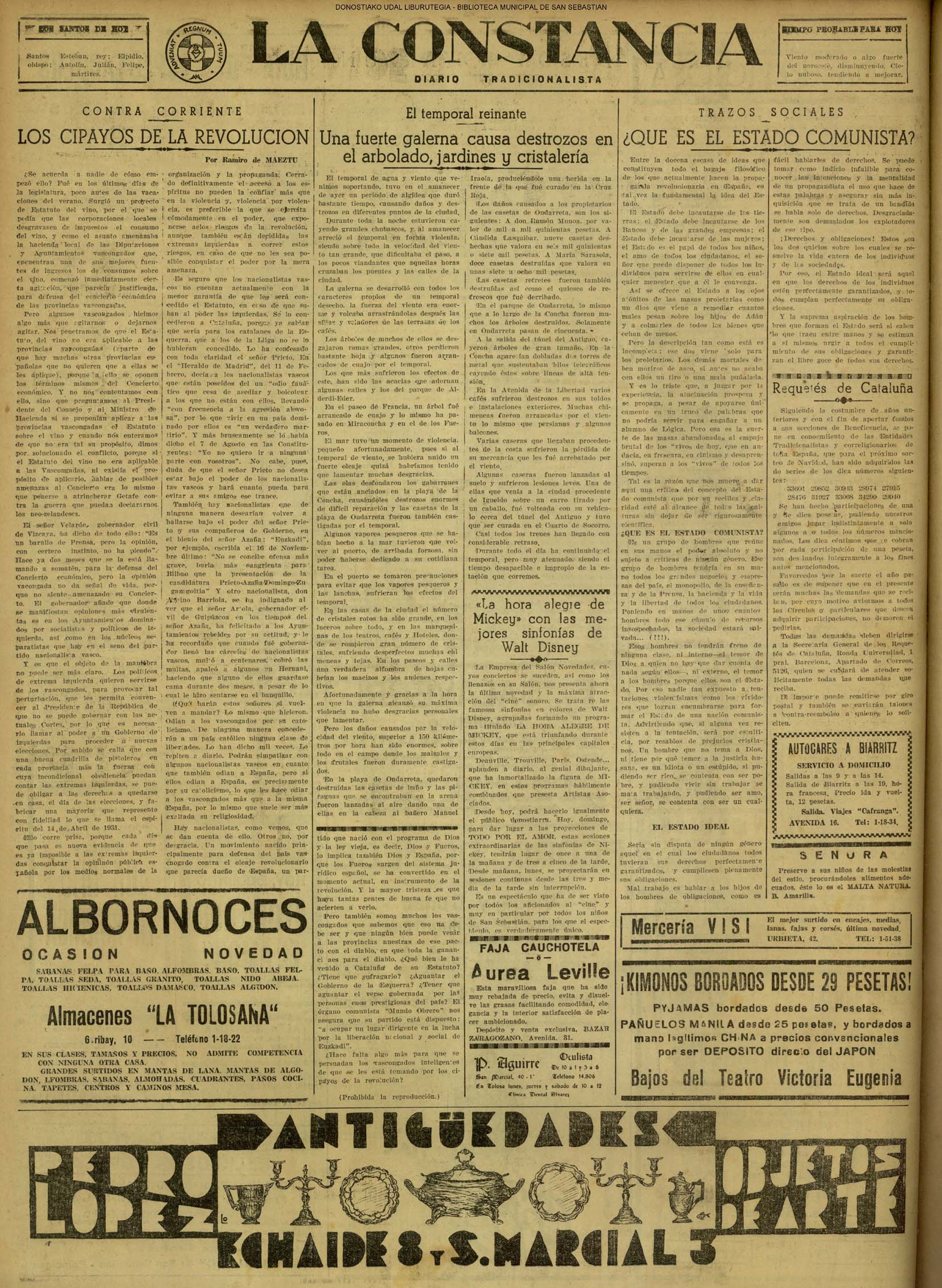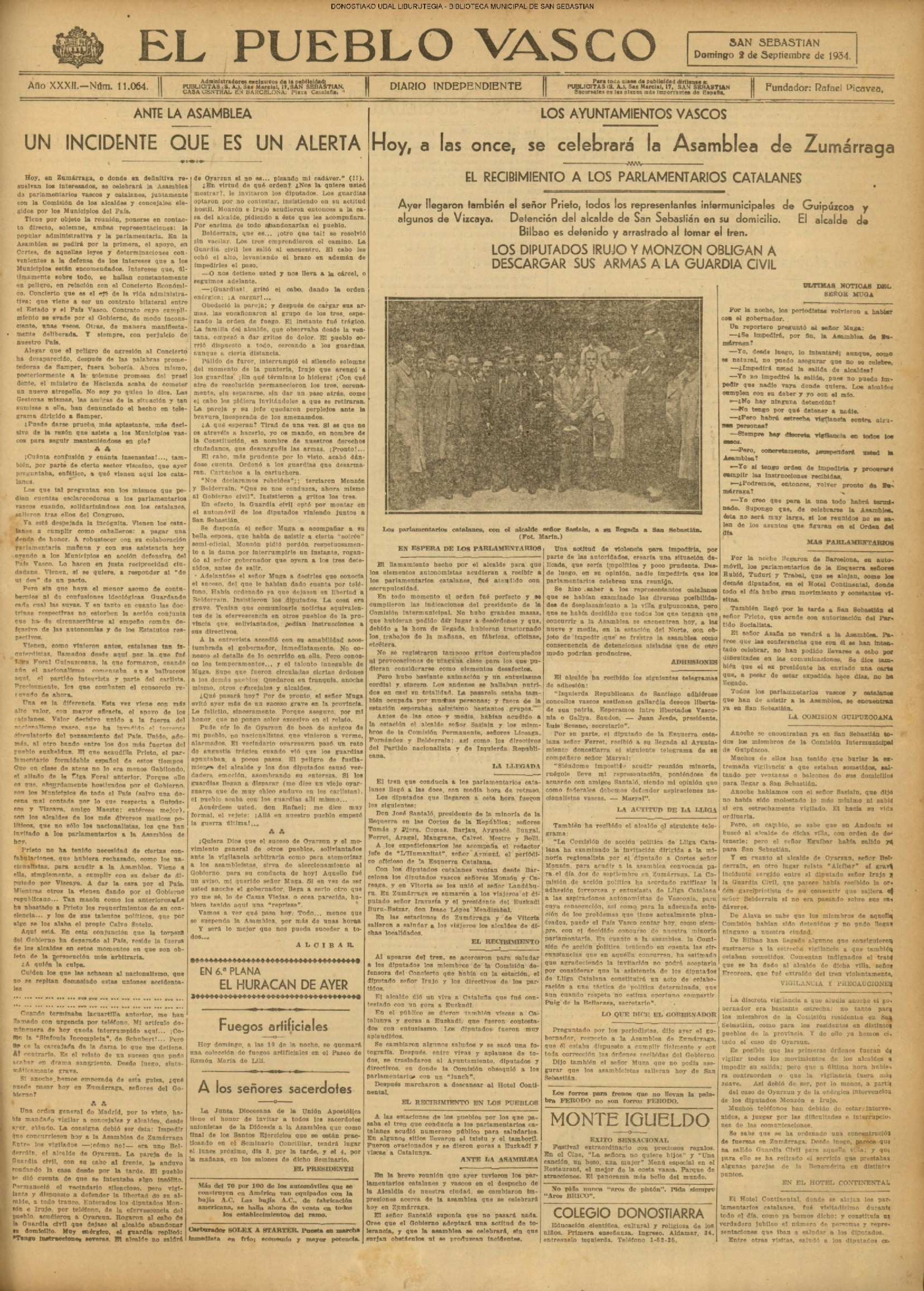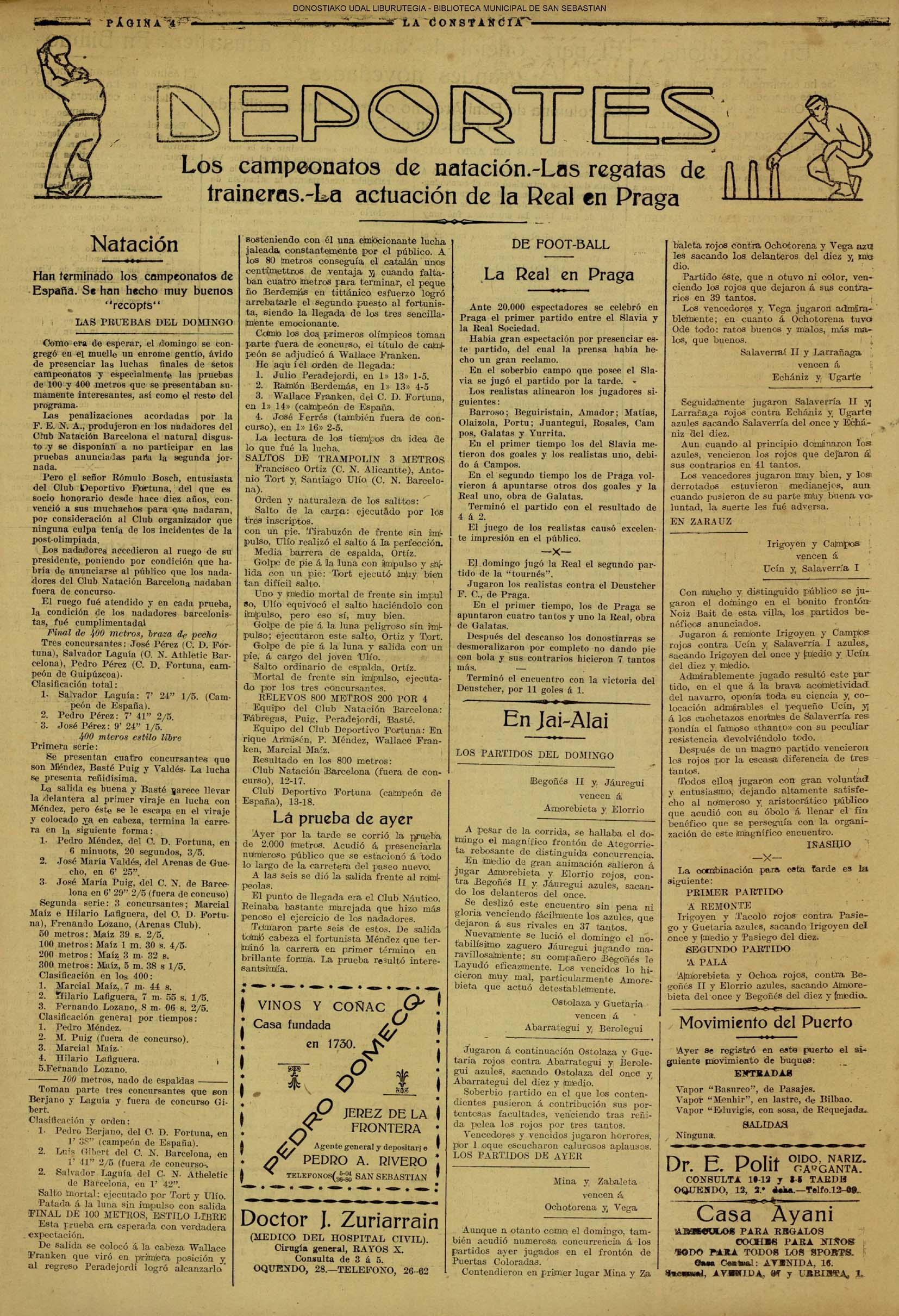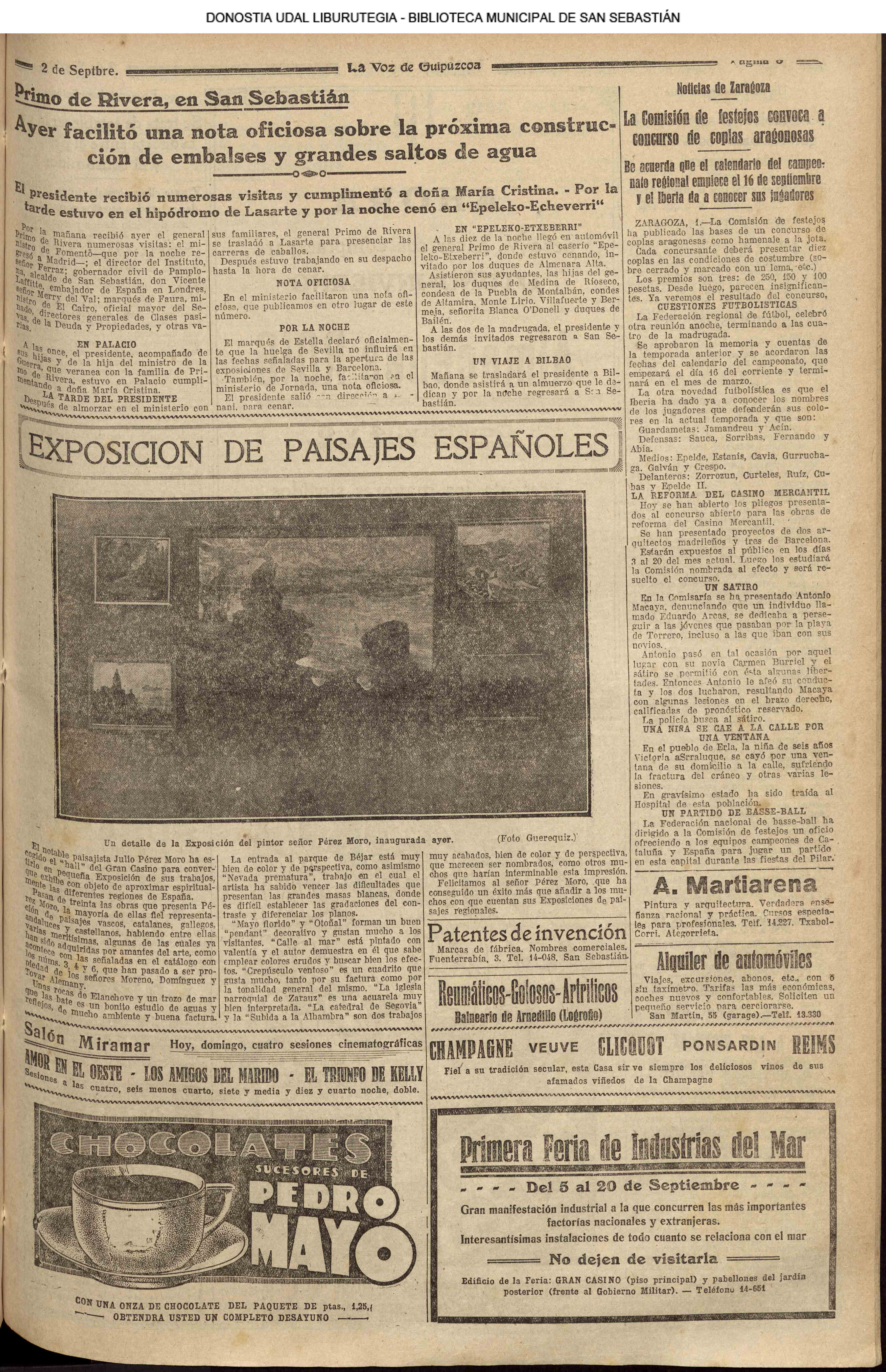 01 - septiembre![]() . | (1931) - LA VOZ DE GUIPUZCOA (CENTROS OFICIALES - Incautación de objetos de arte en una "villa" de San Sebastián.) (La voz de Guipuzcoa)(El Pueblo Vasco)(El Día)(La Constancia) ++++++++++++++++++++++++++++++++++++++++++++++ # EN EL GRAN CASINO.- 36 danzantes comenzaron la prueba para batir el record mundial de baile de resistencia (La Voz de Guipuzcoa)(El Pueblo Vasco)(El Día)(La Constancia) # TAURINAS - BECERRADA (La Voz de Guipuzcoa)(El Pueblo Vasco)(El Día)(La Constancia) ++++++++++++++++++++++++++++++++++++++++++++++ (1933) - (La voz de Guipuzcoa)(El Pueblo Vasco)(El Día)(La Constancia) ++++++++++++++++++++++++++++++++++++++++++++++ (1934) - LA VOZ DE GUIPUZCOA (CENTROS OFICIALES - En el casco viejo donostiarra se formó una manifestación contra el imperialismo y la guerra, y fue disuelta sin incidentes) # LOS AYUNTAMIENTOS VASCOS Y EL ESTADO.- Llegaron a San Sebastián los diputados catalanes que vienen con el propósito de asistir a la Asamblea convocada por la Comisión intermunicipal # PINTORES VASCOS .- Se inaugura en el CAT la exposición de cuadros de Flores Kaperotxipi y de Apellaniz # EL TEMPORAL.- Los veraneantes conocieron la furia del viento que viene del mar y que todo lo destruye ++++++++++++++++++++++++++++++++++++++++++++++ # UN PUEBLO AGRADECIDO .- Guetaria, el pueblo costeño, rindió un sencillo y emocionante HOMENAJE a don Juan Usabiaga y Lasquibar, cuyo nombre ha dado a su Plaza principal # TAURINAS .CORRIDA EXTRAORDINARIA (La voz de Guipuzcoa)(El Pueblo Vasco)(El Día)(La Constancia) # REGATAS EN LA BAHIA.- Ur-kirola en yolas y la tripulación de Aia-Orio en bateles fueron los gandores de las regatas del domingo # NATACIÓN - TRAVESÍA DEL URUMEA.- El francés Pouech, del Biarritz Olimpique, ganó brillantemente la travesia del Urumea, organizada por el Fortuna # CARRERAS DE CABALLOS- HIPÓDROMO DE LASARTE # FESTEJOS DEL 31 DE AGOSTO (La voz de Guipuzcoa)(El Pueblo Vasco)(El Día)(La Constancia) |