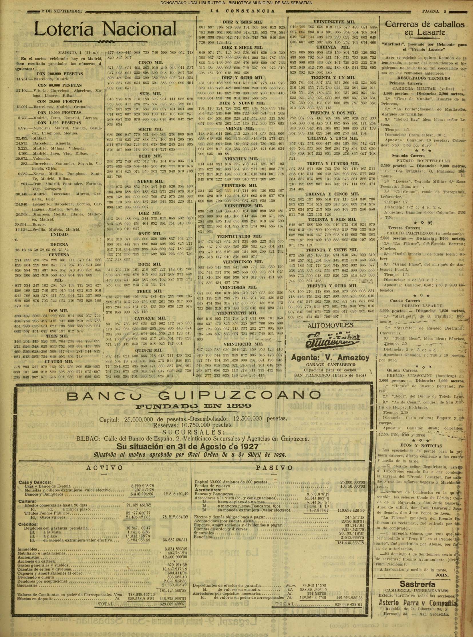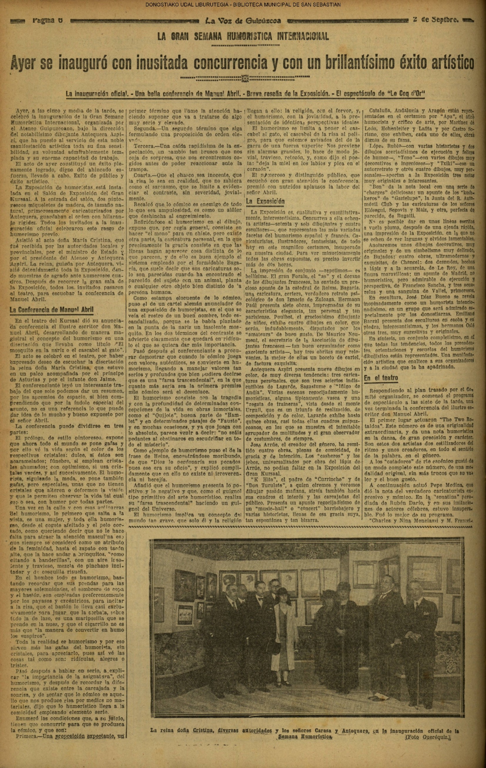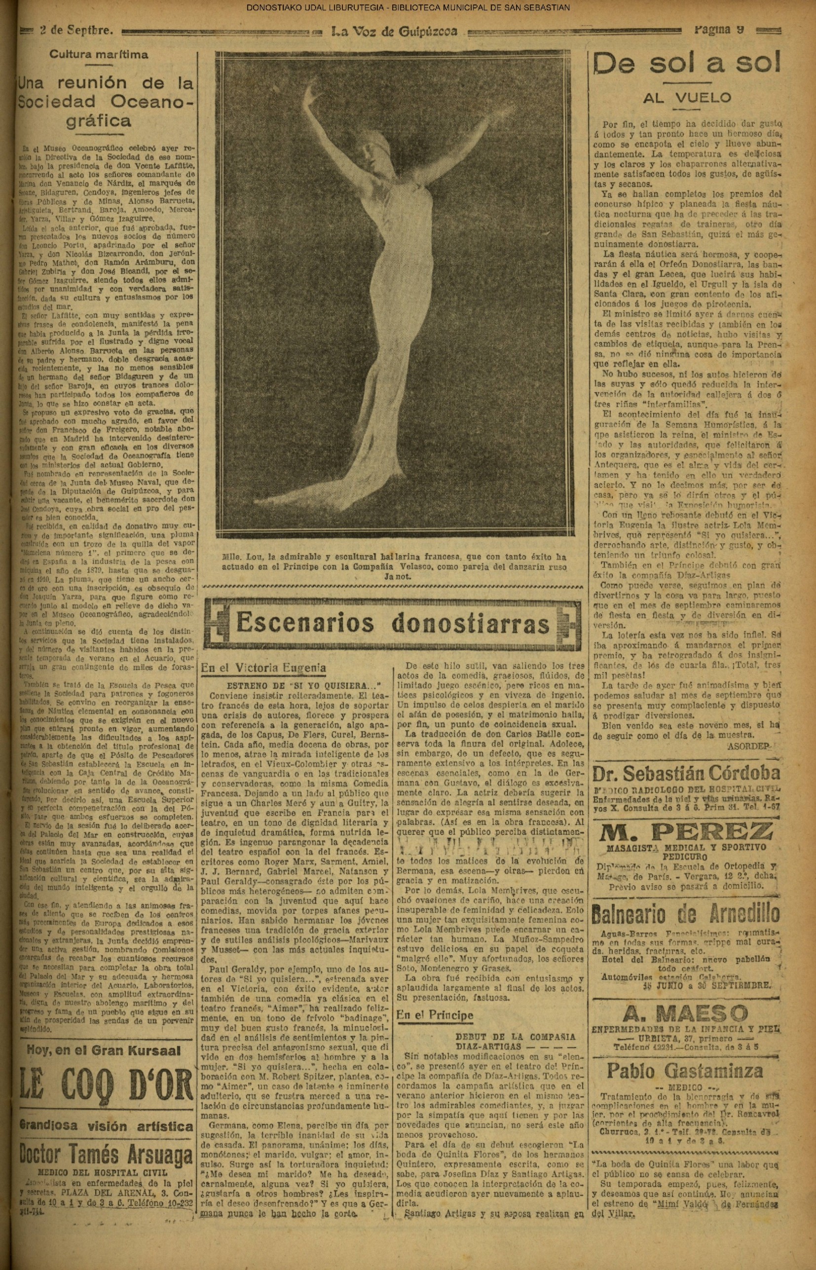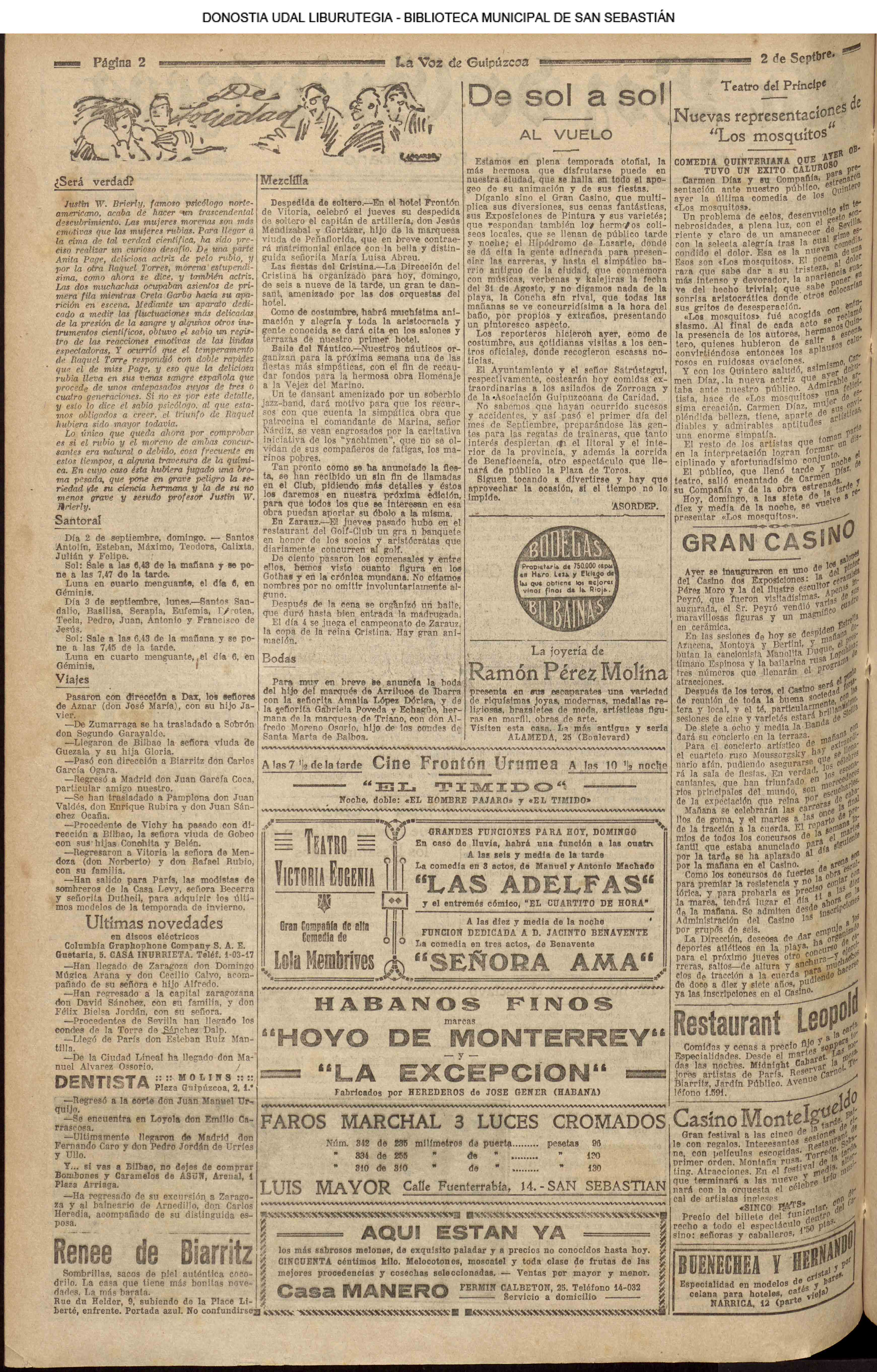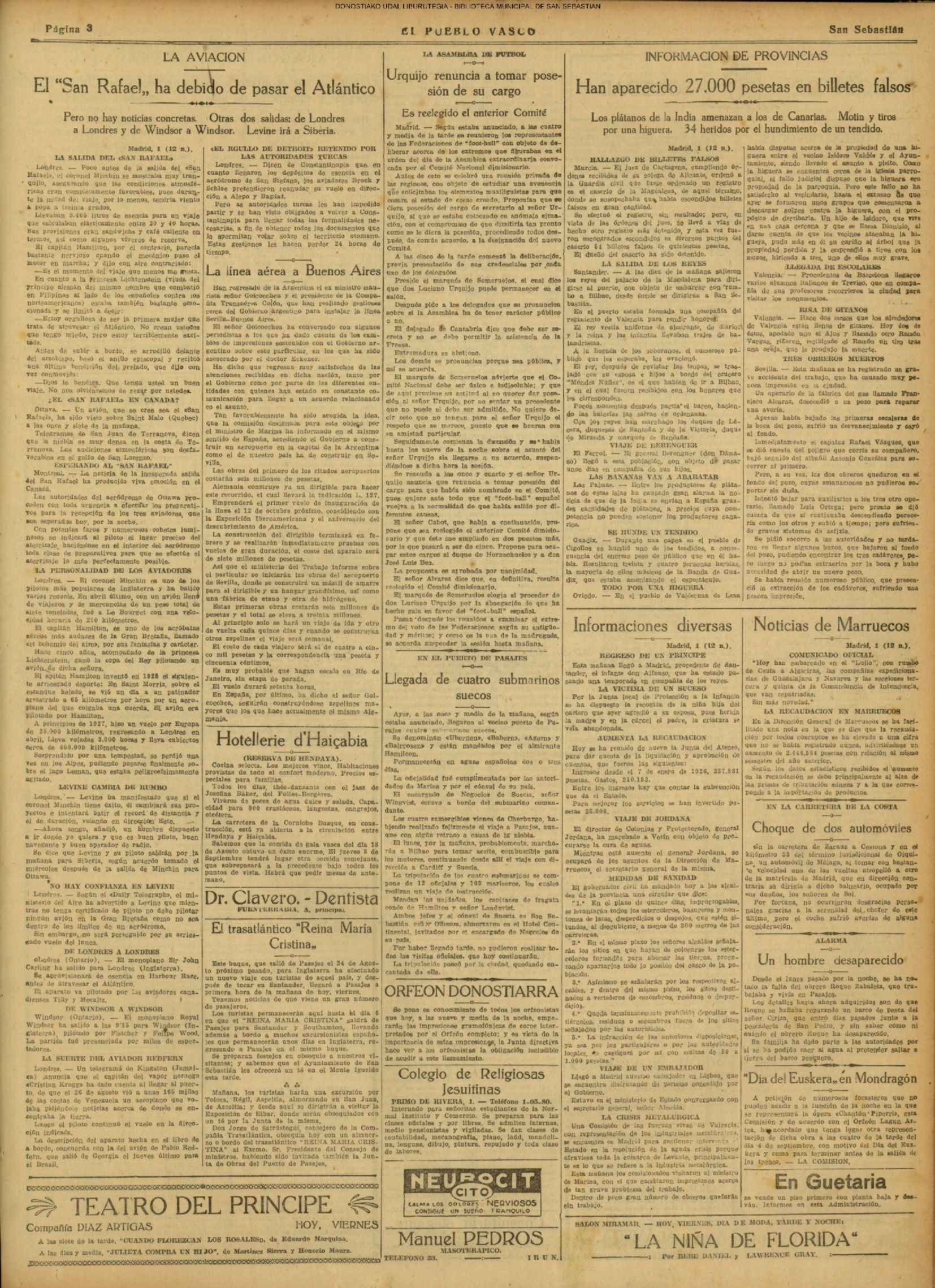 01 - septiembre![]() . | (1931) - LA VOZ DE GUIPUZCOA (CENTROS OFICIALES - Incautación de objetos de arte en una "villa" de San Sebastián.) (La voz de Guipuzcoa)(El Pueblo Vasco)(El Día)(La Constancia) ++++++++++++++++++++++++++++++++++++++++++++++ # EN EL GRAN CASINO.- 36 danzantes comenzaron la prueba para batir el record mundial de baile de resistencia (La Voz de Guipuzcoa)(El Pueblo Vasco)(El Día)(La Constancia) # TAURINAS - BECERRADA (La Voz de Guipuzcoa)(El Pueblo Vasco)(El Día)(La Constancia) ++++++++++++++++++++++++++++++++++++++++++++++ (1933) - (La voz de Guipuzcoa)(El Pueblo Vasco)(El Día)(La Constancia) ++++++++++++++++++++++++++++++++++++++++++++++ (1934) - LA VOZ DE GUIPUZCOA (CENTROS OFICIALES - En el casco viejo donostiarra se formó una manifestación contra el imperialismo y la guerra, y fue disuelta sin incidentes) # LOS AYUNTAMIENTOS VASCOS Y EL ESTADO.- Llegaron a San Sebastián los diputados catalanes que vienen con el propósito de asistir a la Asamblea convocada por la Comisión intermunicipal # PINTORES VASCOS .- Se inaugura en el CAT la exposición de cuadros de Flores Kaperotxipi y de Apellaniz # EL TEMPORAL.- Los veraneantes conocieron la furia del viento que viene del mar y que todo lo destruye ++++++++++++++++++++++++++++++++++++++++++++++ # UN PUEBLO AGRADECIDO .- Guetaria, el pueblo costeño, rindió un sencillo y emocionante HOMENAJE a don Juan Usabiaga y Lasquibar, cuyo nombre ha dado a su Plaza principal # TAURINAS .CORRIDA EXTRAORDINARIA (La voz de Guipuzcoa)(El Pueblo Vasco)(El Día)(La Constancia) # REGATAS EN LA BAHIA.- Ur-kirola en yolas y la tripulación de Aia-Orio en bateles fueron los gandores de las regatas del domingo # NATACIÓN - TRAVESÍA DEL URUMEA.- El francés Pouech, del Biarritz Olimpique, ganó brillantemente la travesia del Urumea, organizada por el Fortuna # CARRERAS DE CABALLOS- HIPÓDROMO DE LASARTE # FESTEJOS DEL 31 DE AGOSTO (La voz de Guipuzcoa)(El Pueblo Vasco)(El Día)(La Constancia) |