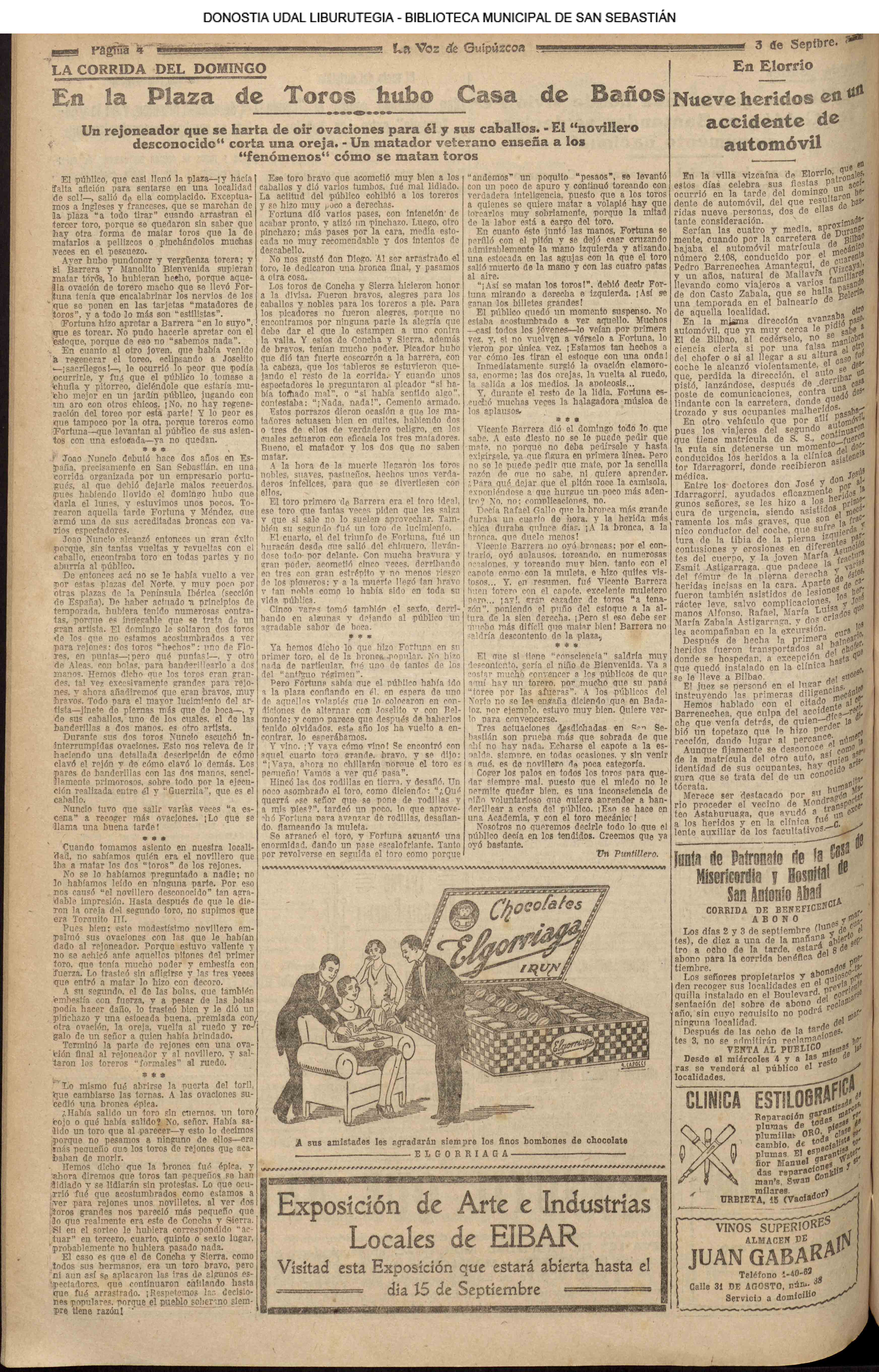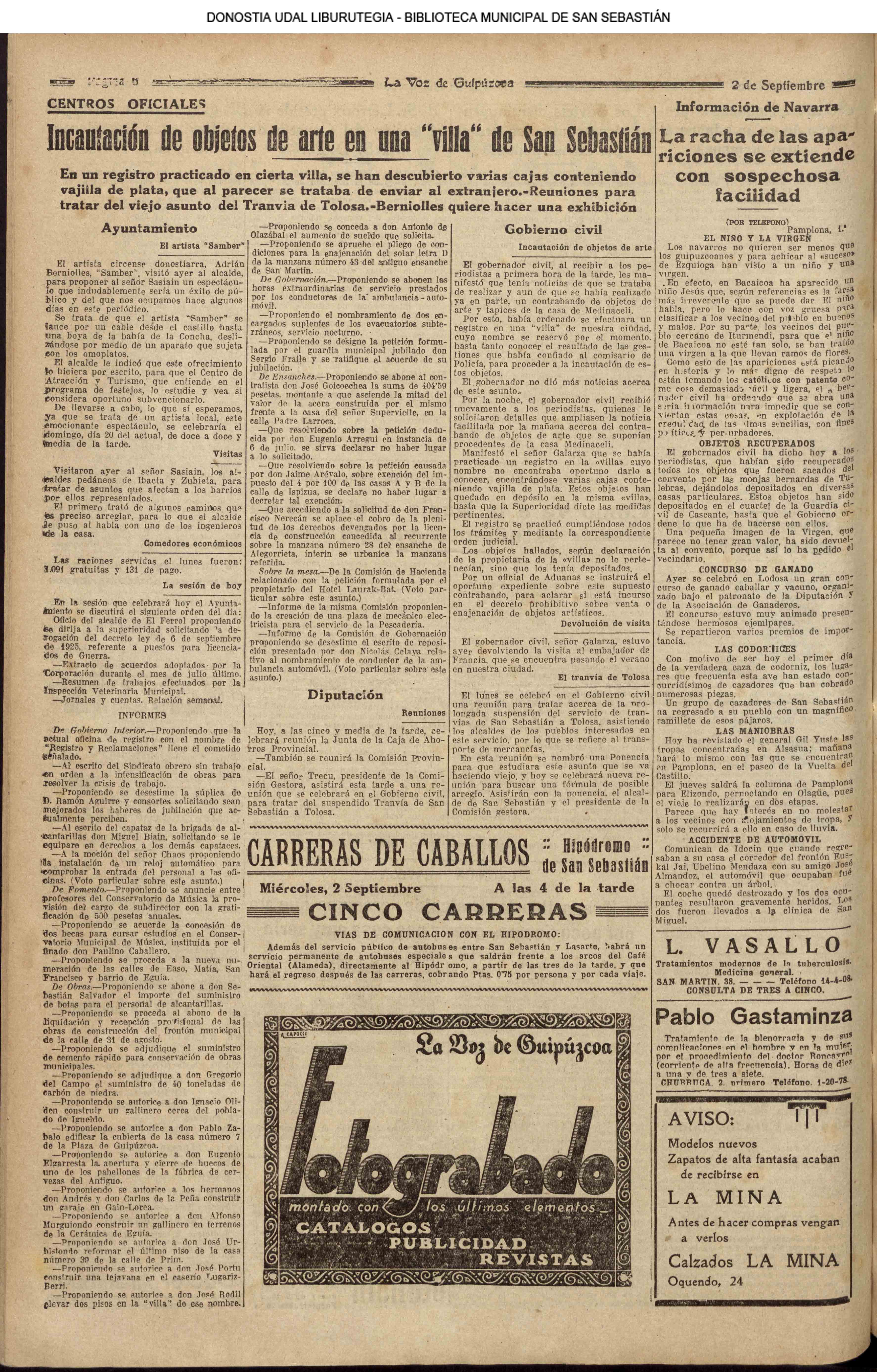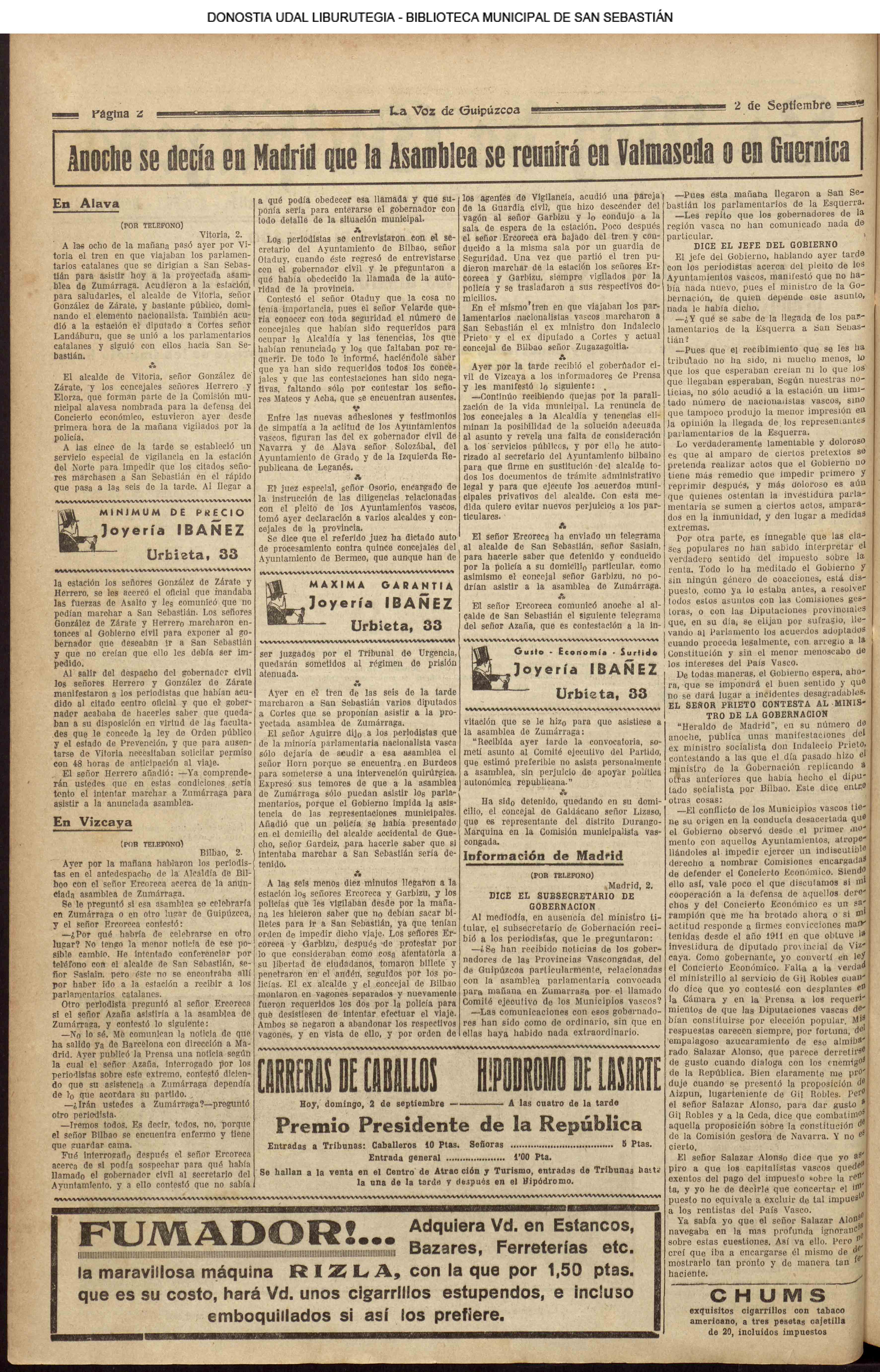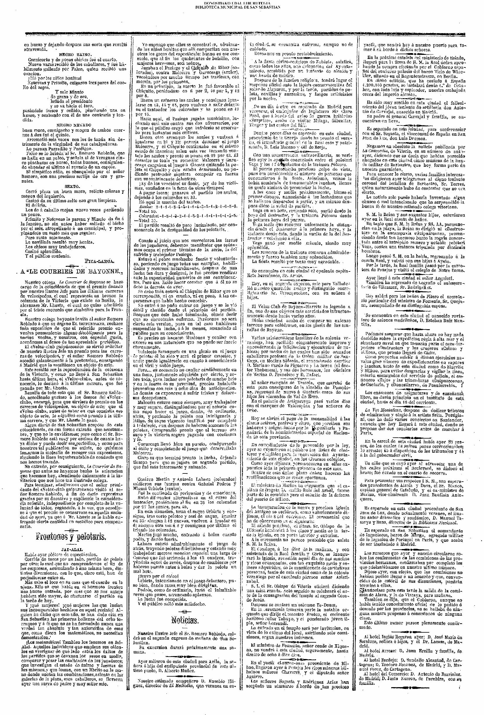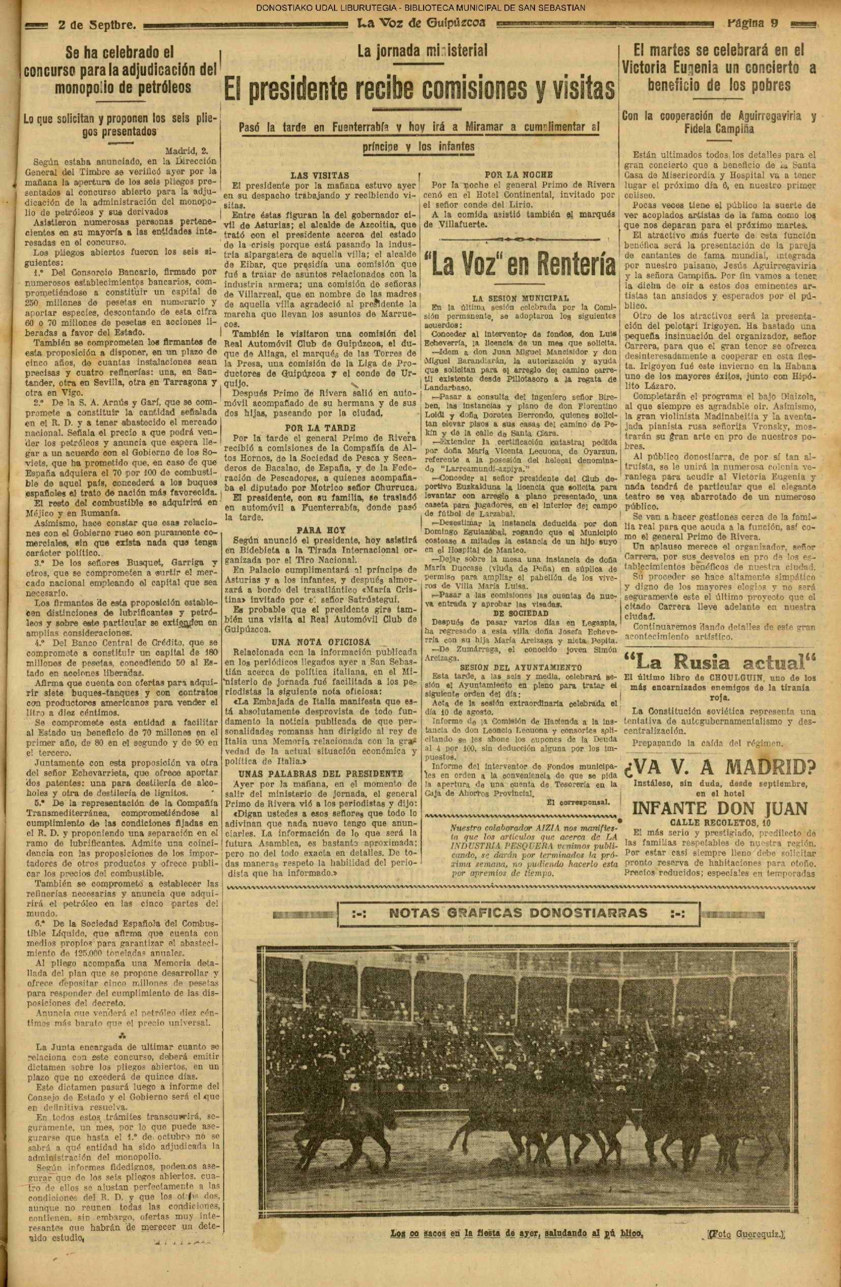 01 - septiembre![]() . | (1931) - LA VOZ DE GUIPUZCOA (CENTROS OFICIALES - Incautación de objetos de arte en una "villa" de San Sebastián.) (La voz de Guipuzcoa)(El Pueblo Vasco)(El Día)(La Constancia) ++++++++++++++++++++++++++++++++++++++++++++++ # EN EL GRAN CASINO.- 36 danzantes comenzaron la prueba para batir el record mundial de baile de resistencia (La Voz de Guipuzcoa)(El Pueblo Vasco)(El Día)(La Constancia) # TAURINAS - BECERRADA (La Voz de Guipuzcoa)(El Pueblo Vasco)(El Día)(La Constancia) ++++++++++++++++++++++++++++++++++++++++++++++ (1933) - (La voz de Guipuzcoa)(El Pueblo Vasco)(El Día)(La Constancia) ++++++++++++++++++++++++++++++++++++++++++++++ (1934) - LA VOZ DE GUIPUZCOA (CENTROS OFICIALES - En el casco viejo donostiarra se formó una manifestación contra el imperialismo y la guerra, y fue disuelta sin incidentes) # LOS AYUNTAMIENTOS VASCOS Y EL ESTADO.- Llegaron a San Sebastián los diputados catalanes que vienen con el propósito de asistir a la Asamblea convocada por la Comisión intermunicipal # PINTORES VASCOS .- Se inaugura en el CAT la exposición de cuadros de Flores Kaperotxipi y de Apellaniz # EL TEMPORAL.- Los veraneantes conocieron la furia del viento que viene del mar y que todo lo destruye ++++++++++++++++++++++++++++++++++++++++++++++ # UN PUEBLO AGRADECIDO .- Guetaria, el pueblo costeño, rindió un sencillo y emocionante HOMENAJE a don Juan Usabiaga y Lasquibar, cuyo nombre ha dado a su Plaza principal # TAURINAS .CORRIDA EXTRAORDINARIA (La voz de Guipuzcoa)(El Pueblo Vasco)(El Día)(La Constancia) # REGATAS EN LA BAHIA.- Ur-kirola en yolas y la tripulación de Aia-Orio en bateles fueron los gandores de las regatas del domingo # NATACIÓN - TRAVESÍA DEL URUMEA.- El francés Pouech, del Biarritz Olimpique, ganó brillantemente la travesia del Urumea, organizada por el Fortuna # CARRERAS DE CABALLOS- HIPÓDROMO DE LASARTE # FESTEJOS DEL 31 DE AGOSTO (La voz de Guipuzcoa)(El Pueblo Vasco)(El Día)(La Constancia) |