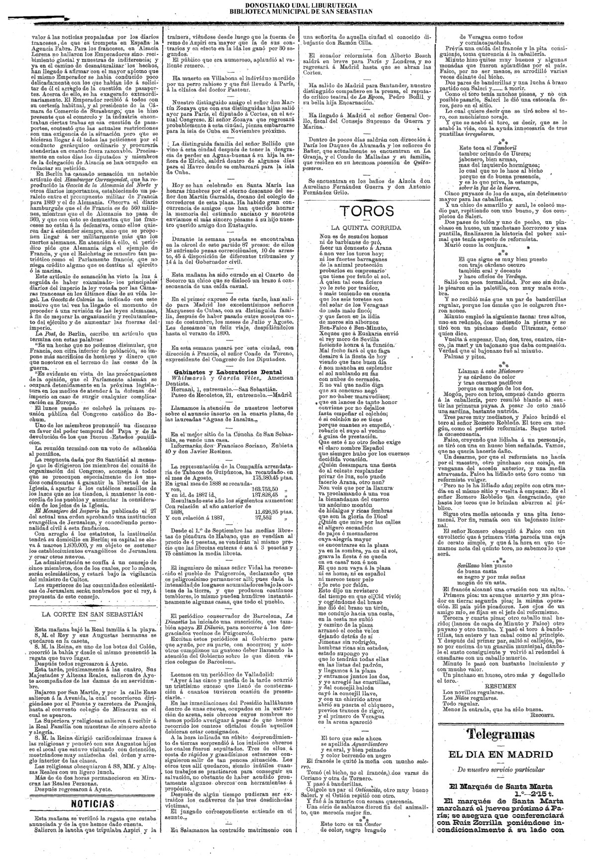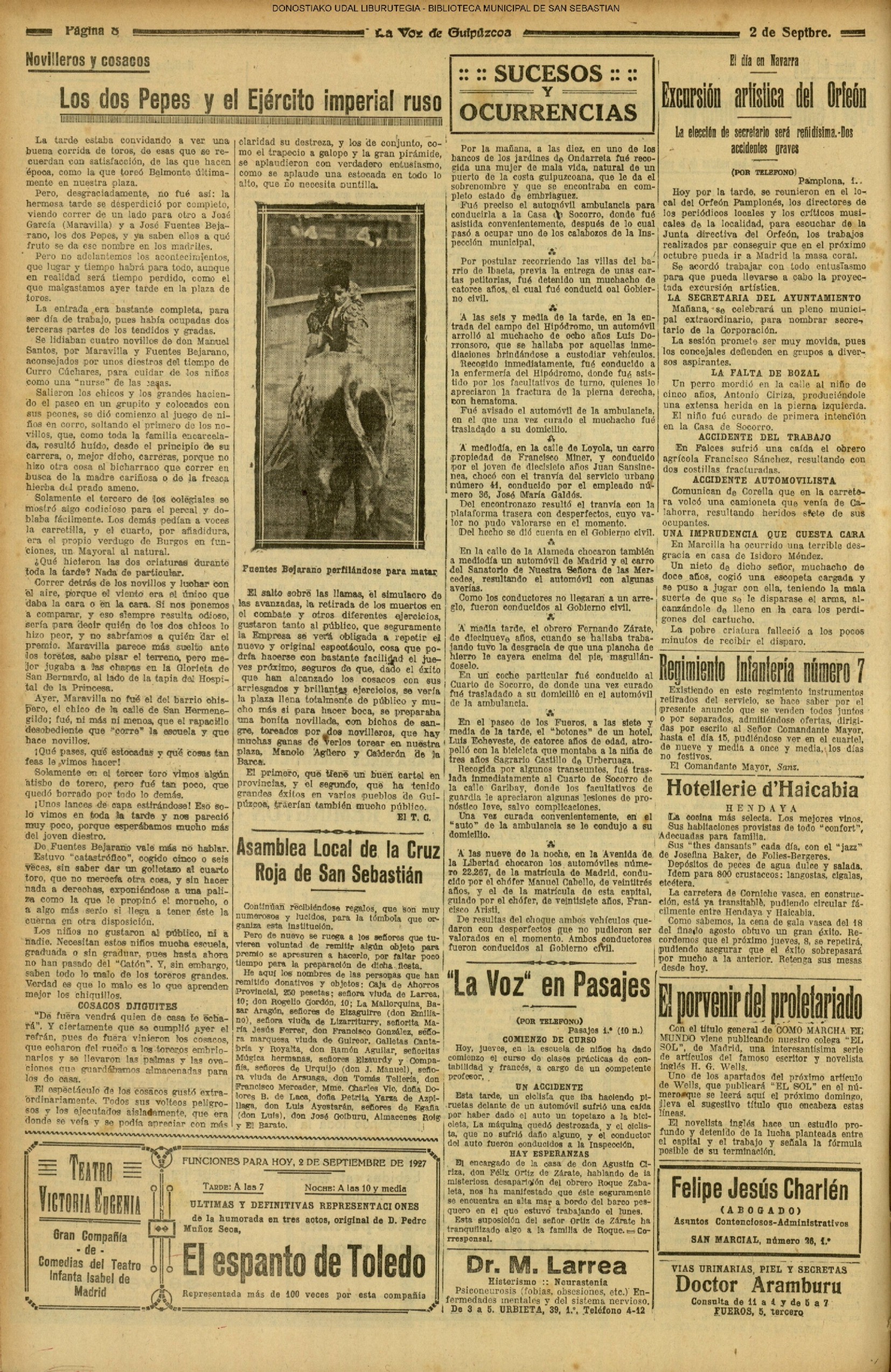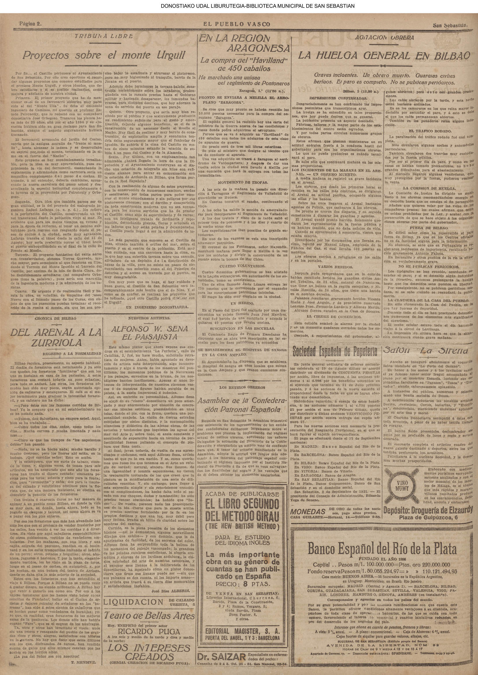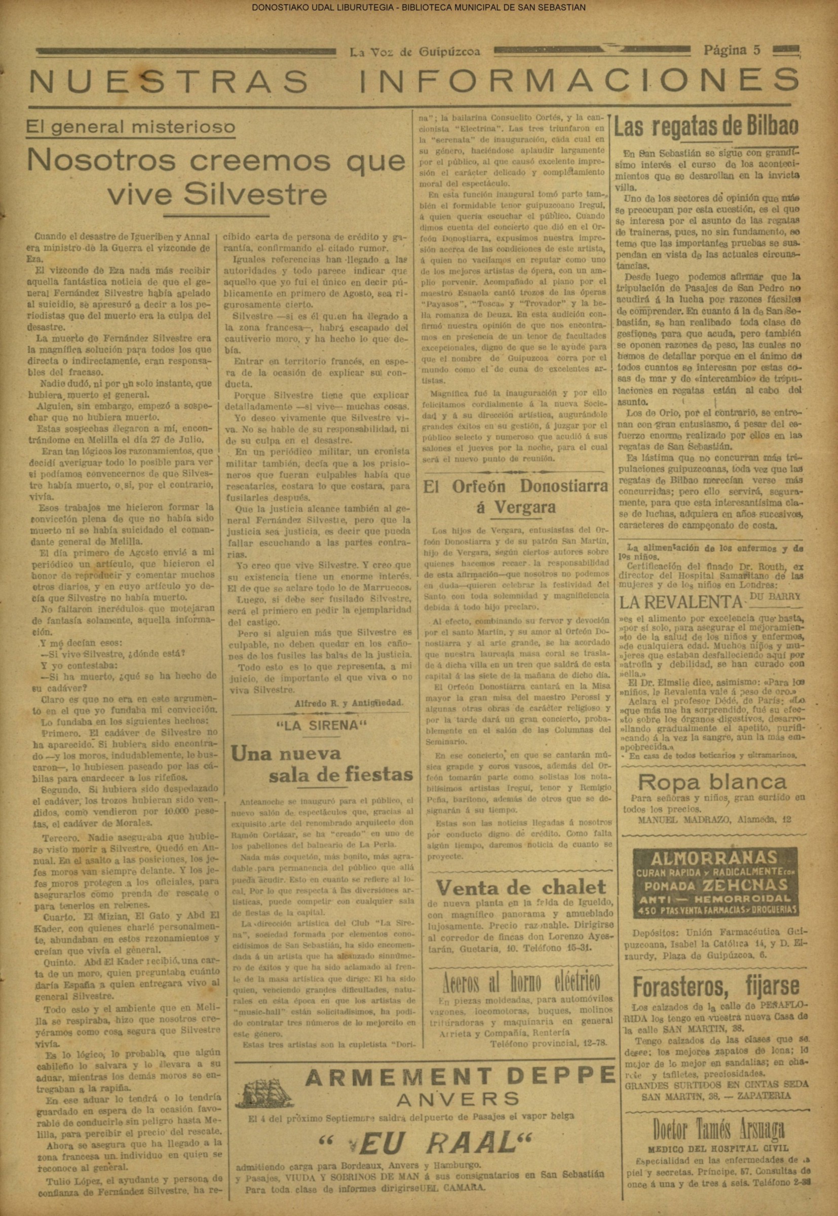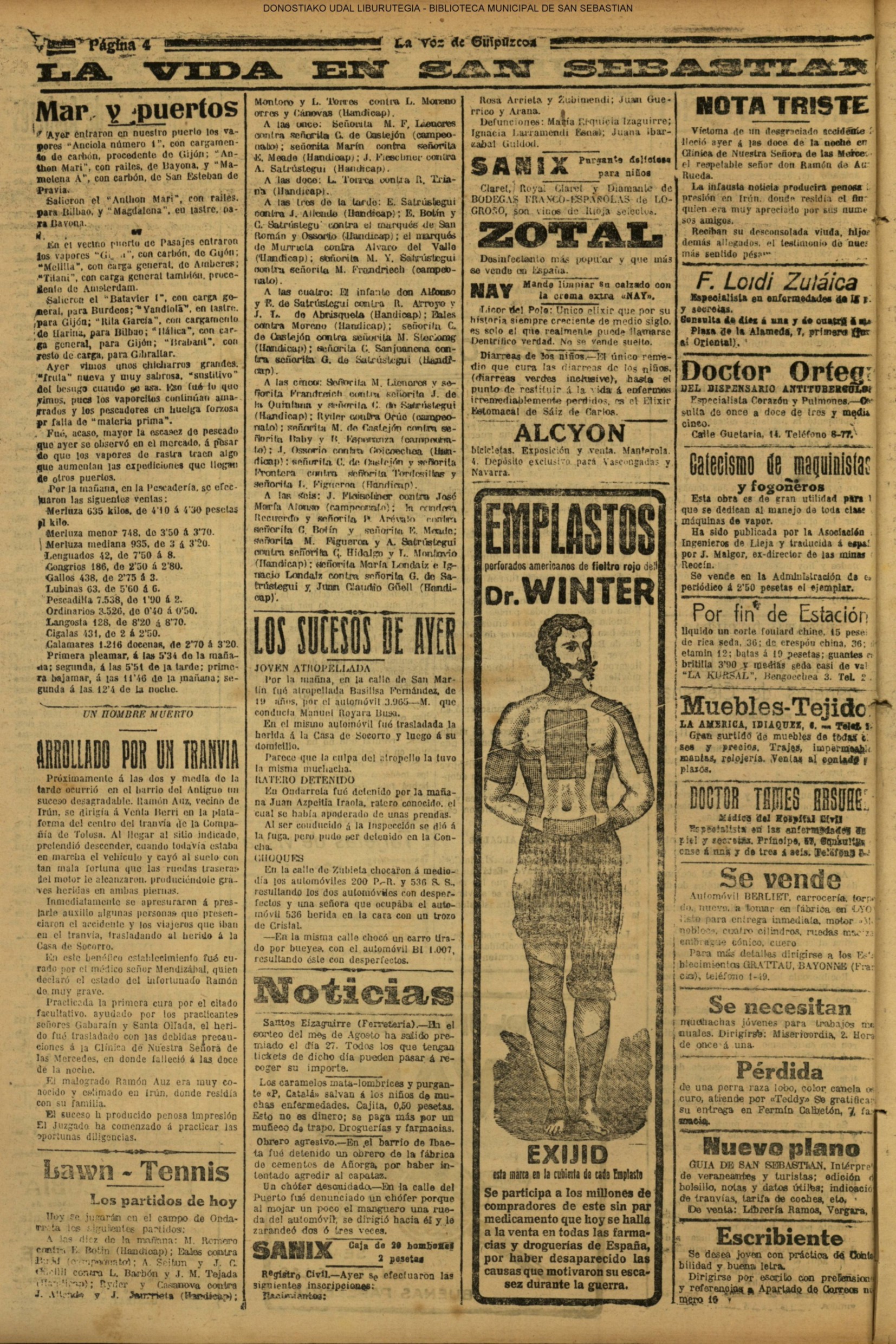 01 - septiembre![]() . | (1931) - LA VOZ DE GUIPUZCOA (CENTROS OFICIALES - Incautación de objetos de arte en una "villa" de San Sebastián.) (La voz de Guipuzcoa)(El Pueblo Vasco)(El Día)(La Constancia) ++++++++++++++++++++++++++++++++++++++++++++++ # EN EL GRAN CASINO.- 36 danzantes comenzaron la prueba para batir el record mundial de baile de resistencia (La Voz de Guipuzcoa)(El Pueblo Vasco)(El Día)(La Constancia) # TAURINAS - BECERRADA (La Voz de Guipuzcoa)(El Pueblo Vasco)(El Día)(La Constancia) ++++++++++++++++++++++++++++++++++++++++++++++ (1933) - (La voz de Guipuzcoa)(El Pueblo Vasco)(El Día)(La Constancia) ++++++++++++++++++++++++++++++++++++++++++++++ (1934) - LA VOZ DE GUIPUZCOA (CENTROS OFICIALES - En el casco viejo donostiarra se formó una manifestación contra el imperialismo y la guerra, y fue disuelta sin incidentes) # LOS AYUNTAMIENTOS VASCOS Y EL ESTADO.- Llegaron a San Sebastián los diputados catalanes que vienen con el propósito de asistir a la Asamblea convocada por la Comisión intermunicipal # PINTORES VASCOS .- Se inaugura en el CAT la exposición de cuadros de Flores Kaperotxipi y de Apellaniz # EL TEMPORAL.- Los veraneantes conocieron la furia del viento que viene del mar y que todo lo destruye ++++++++++++++++++++++++++++++++++++++++++++++ # UN PUEBLO AGRADECIDO .- Guetaria, el pueblo costeño, rindió un sencillo y emocionante HOMENAJE a don Juan Usabiaga y Lasquibar, cuyo nombre ha dado a su Plaza principal # TAURINAS .CORRIDA EXTRAORDINARIA (La voz de Guipuzcoa)(El Pueblo Vasco)(El Día)(La Constancia) # REGATAS EN LA BAHIA.- Ur-kirola en yolas y la tripulación de Aia-Orio en bateles fueron los gandores de las regatas del domingo # NATACIÓN - TRAVESÍA DEL URUMEA.- El francés Pouech, del Biarritz Olimpique, ganó brillantemente la travesia del Urumea, organizada por el Fortuna # CARRERAS DE CABALLOS- HIPÓDROMO DE LASARTE # FESTEJOS DEL 31 DE AGOSTO (La voz de Guipuzcoa)(El Pueblo Vasco)(El Día)(La Constancia) |