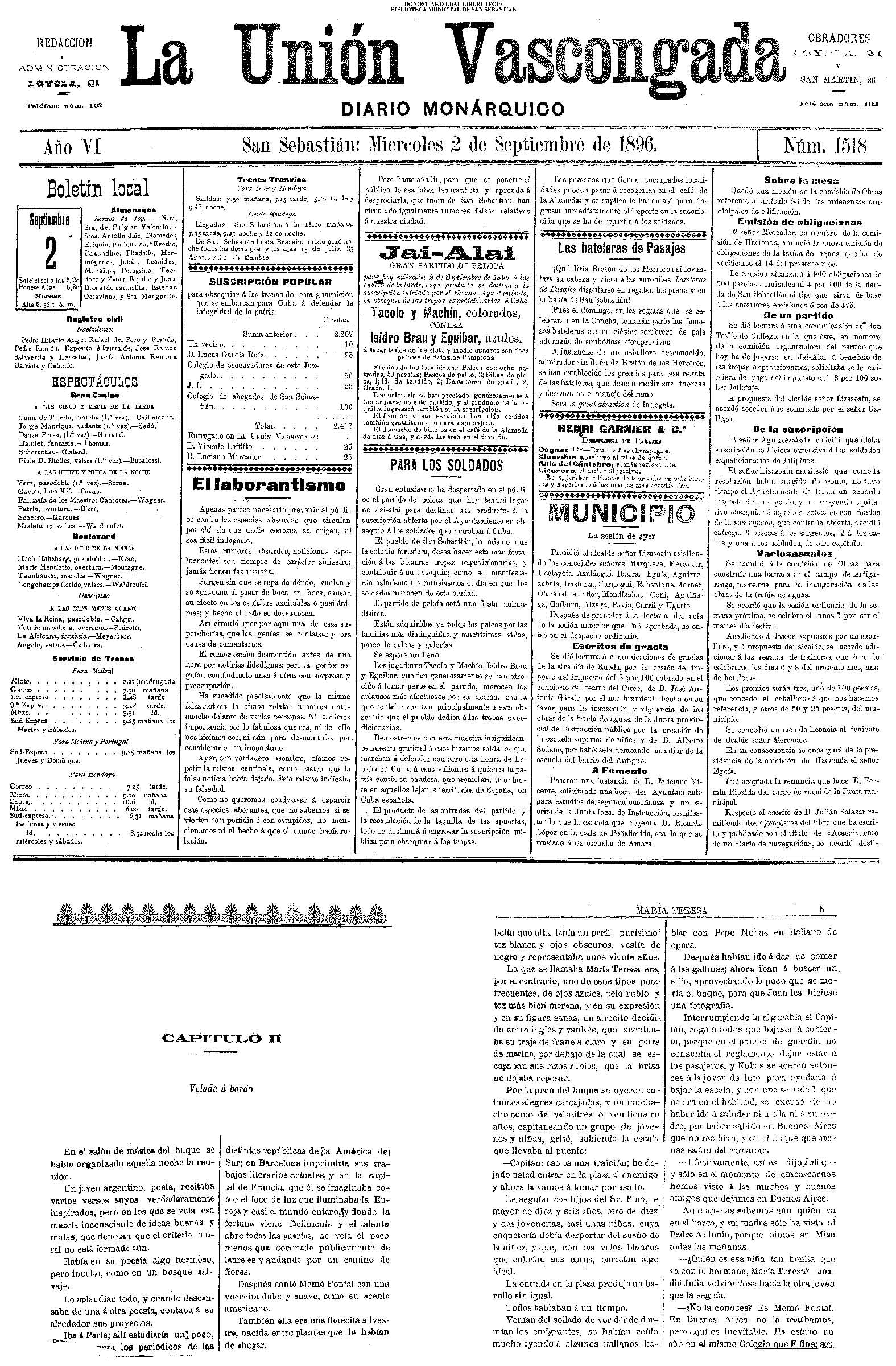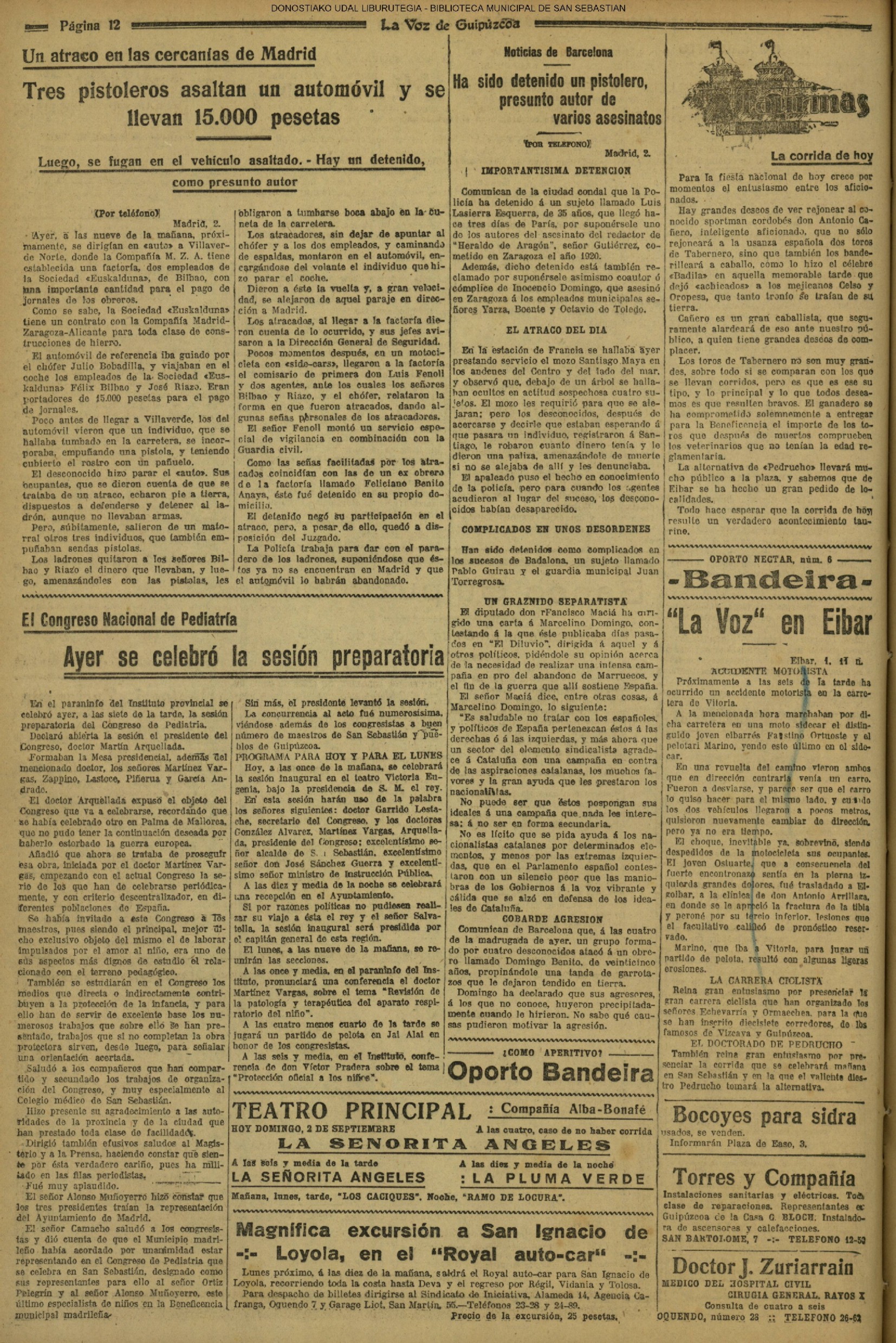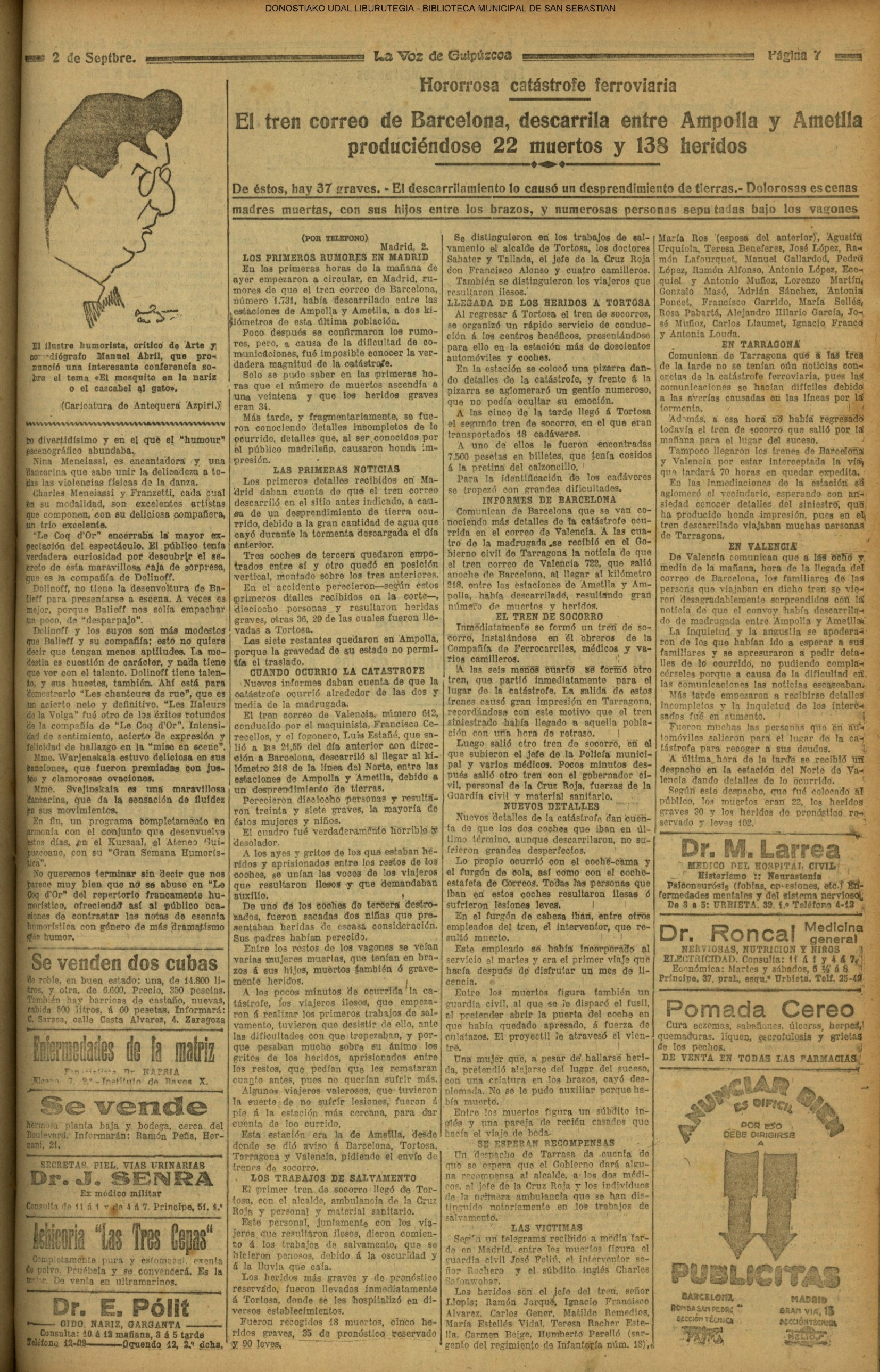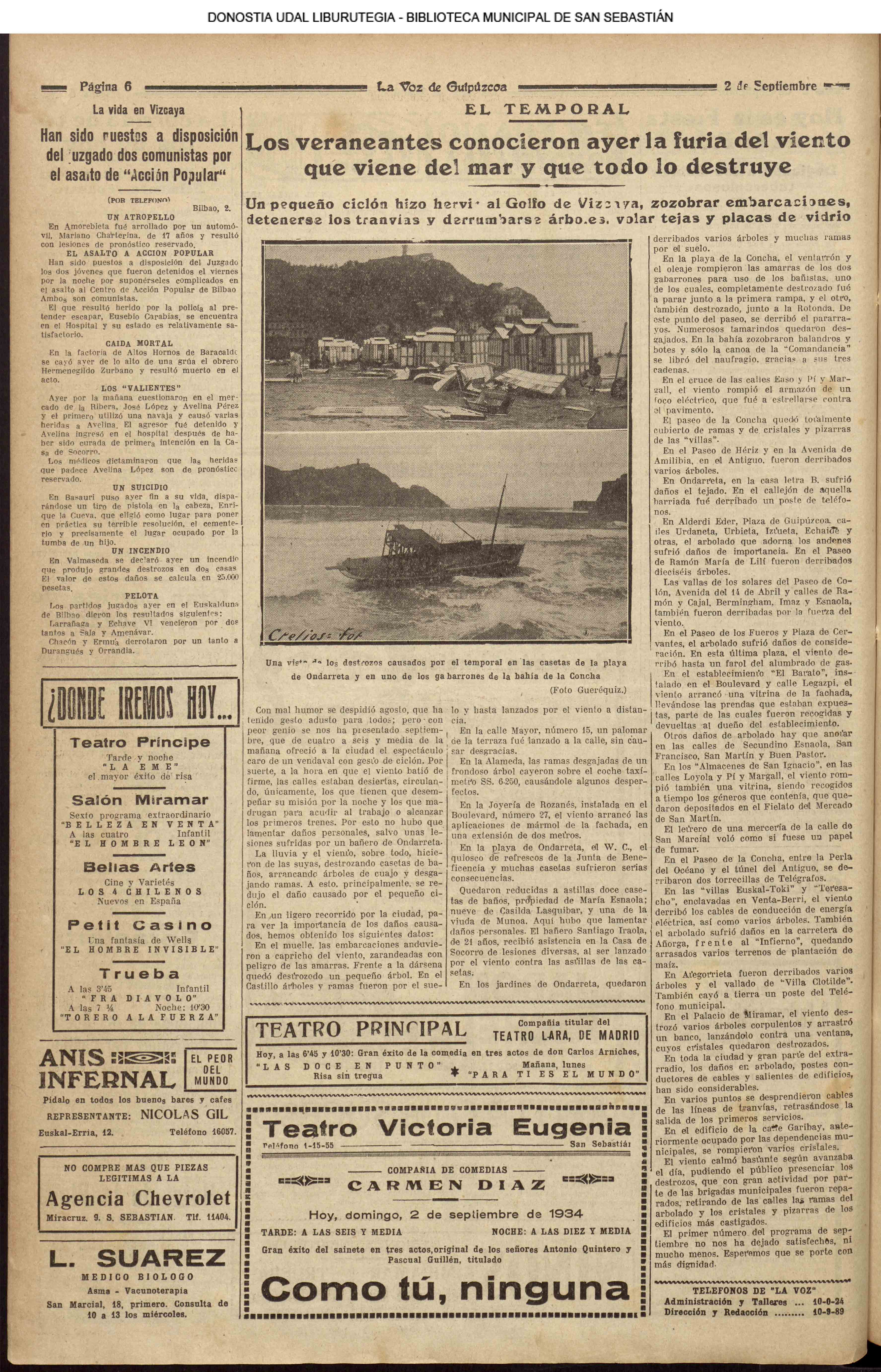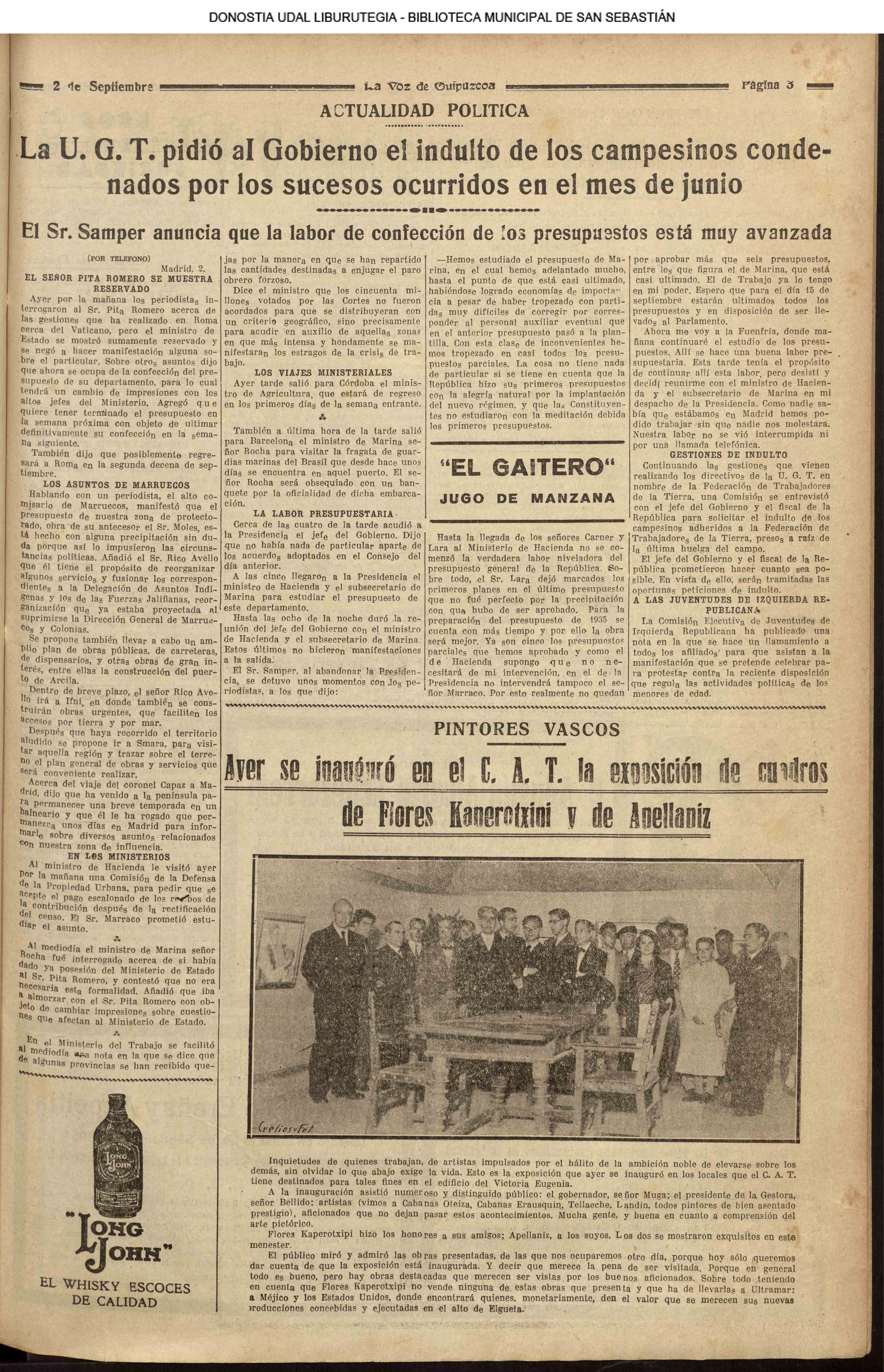 01 - septiembre![]() . | (1931) - LA VOZ DE GUIPUZCOA (CENTROS OFICIALES - Incautación de objetos de arte en una "villa" de San Sebastián.) (La voz de Guipuzcoa)(El Pueblo Vasco)(El Día)(La Constancia) ++++++++++++++++++++++++++++++++++++++++++++++ # EN EL GRAN CASINO.- 36 danzantes comenzaron la prueba para batir el record mundial de baile de resistencia (La Voz de Guipuzcoa)(El Pueblo Vasco)(El Día)(La Constancia) # TAURINAS - BECERRADA (La Voz de Guipuzcoa)(El Pueblo Vasco)(El Día)(La Constancia) ++++++++++++++++++++++++++++++++++++++++++++++ (1933) - (La voz de Guipuzcoa)(El Pueblo Vasco)(El Día)(La Constancia) ++++++++++++++++++++++++++++++++++++++++++++++ (1934) - LA VOZ DE GUIPUZCOA (CENTROS OFICIALES - En el casco viejo donostiarra se formó una manifestación contra el imperialismo y la guerra, y fue disuelta sin incidentes) # LOS AYUNTAMIENTOS VASCOS Y EL ESTADO.- Llegaron a San Sebastián los diputados catalanes que vienen con el propósito de asistir a la Asamblea convocada por la Comisión intermunicipal # PINTORES VASCOS .- Se inaugura en el CAT la exposición de cuadros de Flores Kaperotxipi y de Apellaniz # EL TEMPORAL.- Los veraneantes conocieron la furia del viento que viene del mar y que todo lo destruye ++++++++++++++++++++++++++++++++++++++++++++++ # UN PUEBLO AGRADECIDO .- Guetaria, el pueblo costeño, rindió un sencillo y emocionante HOMENAJE a don Juan Usabiaga y Lasquibar, cuyo nombre ha dado a su Plaza principal # TAURINAS .CORRIDA EXTRAORDINARIA (La voz de Guipuzcoa)(El Pueblo Vasco)(El Día)(La Constancia) # REGATAS EN LA BAHIA.- Ur-kirola en yolas y la tripulación de Aia-Orio en bateles fueron los gandores de las regatas del domingo # NATACIÓN - TRAVESÍA DEL URUMEA.- El francés Pouech, del Biarritz Olimpique, ganó brillantemente la travesia del Urumea, organizada por el Fortuna # CARRERAS DE CABALLOS- HIPÓDROMO DE LASARTE # FESTEJOS DEL 31 DE AGOSTO (La voz de Guipuzcoa)(El Pueblo Vasco)(El Día)(La Constancia) |