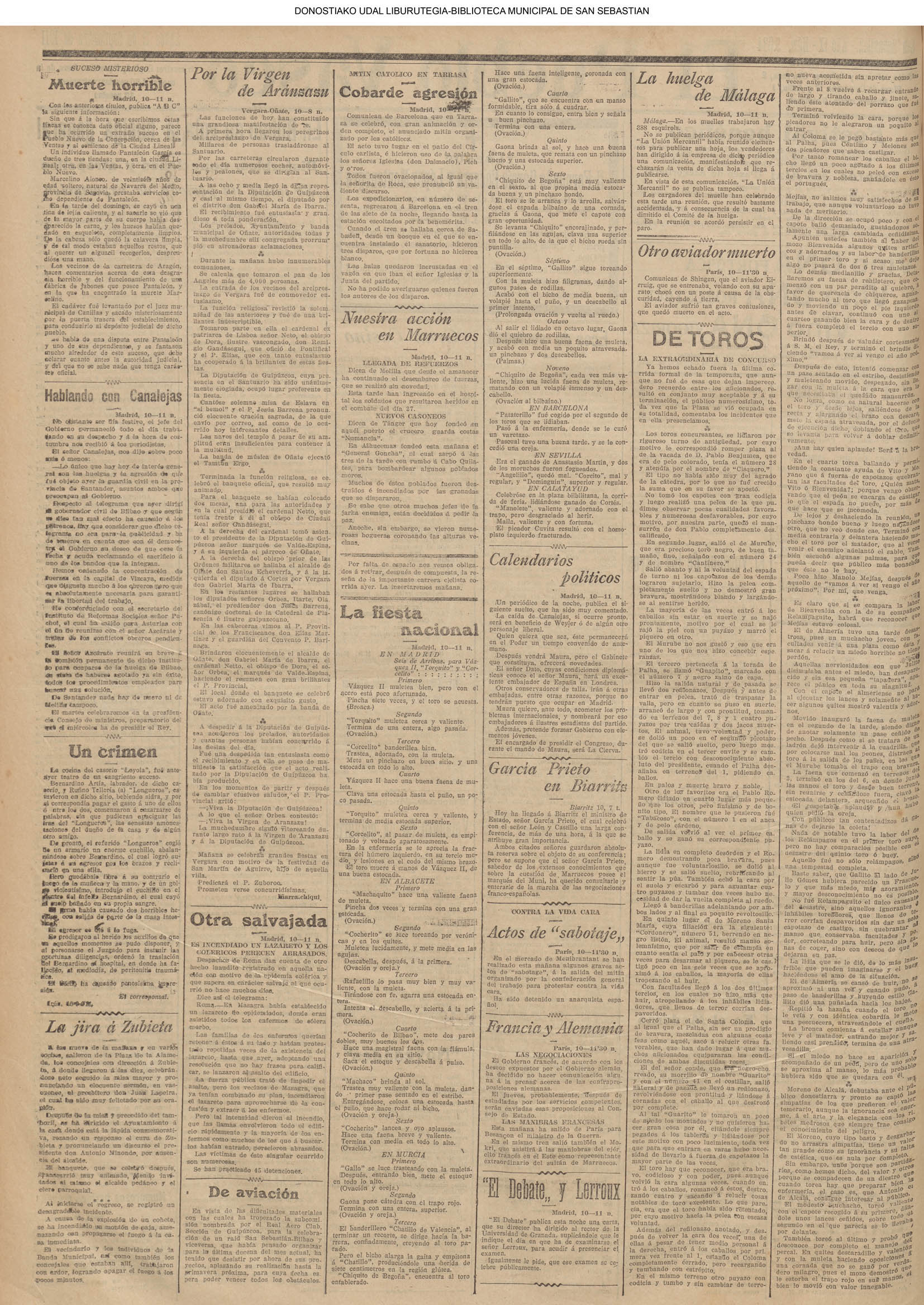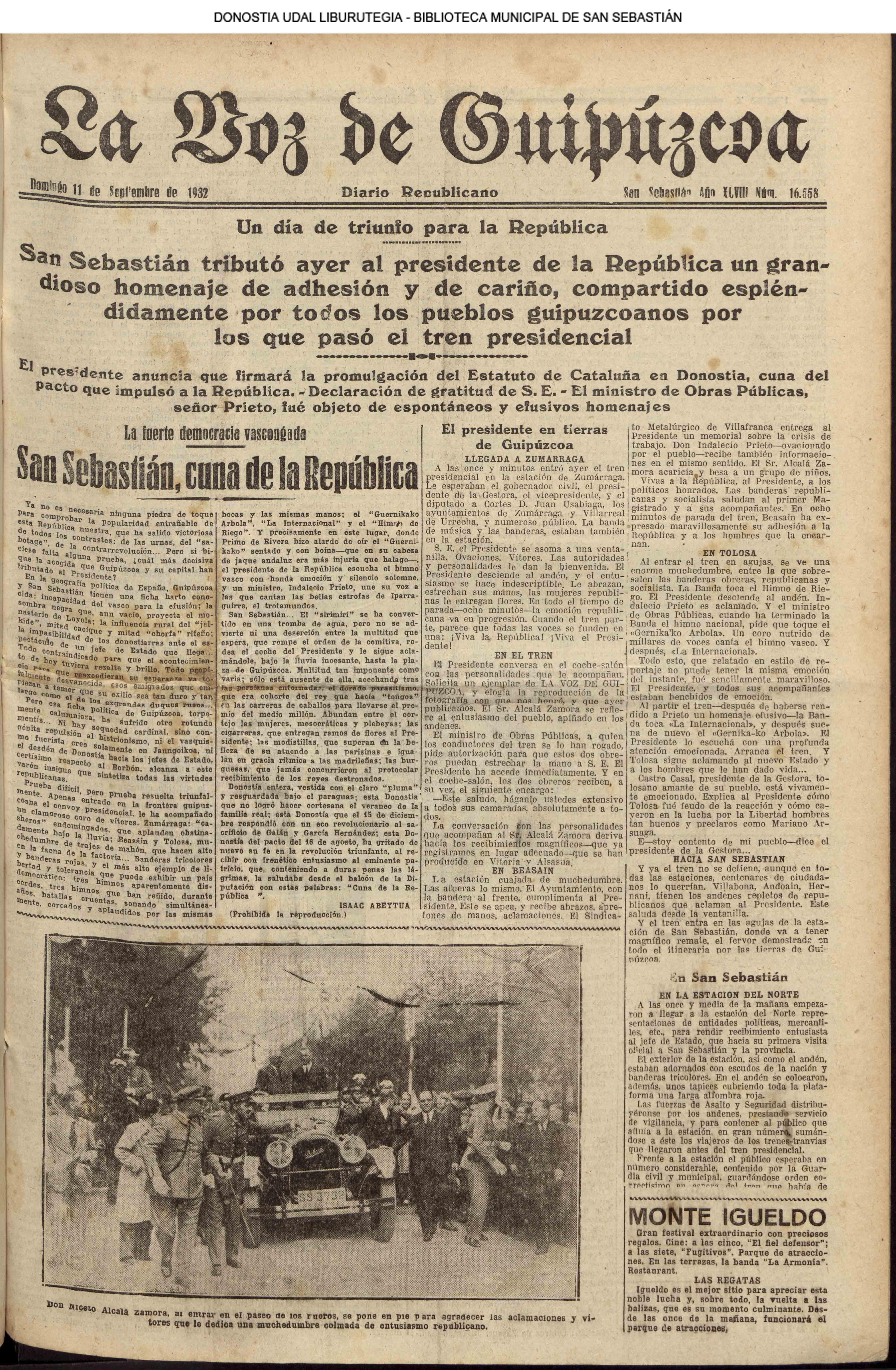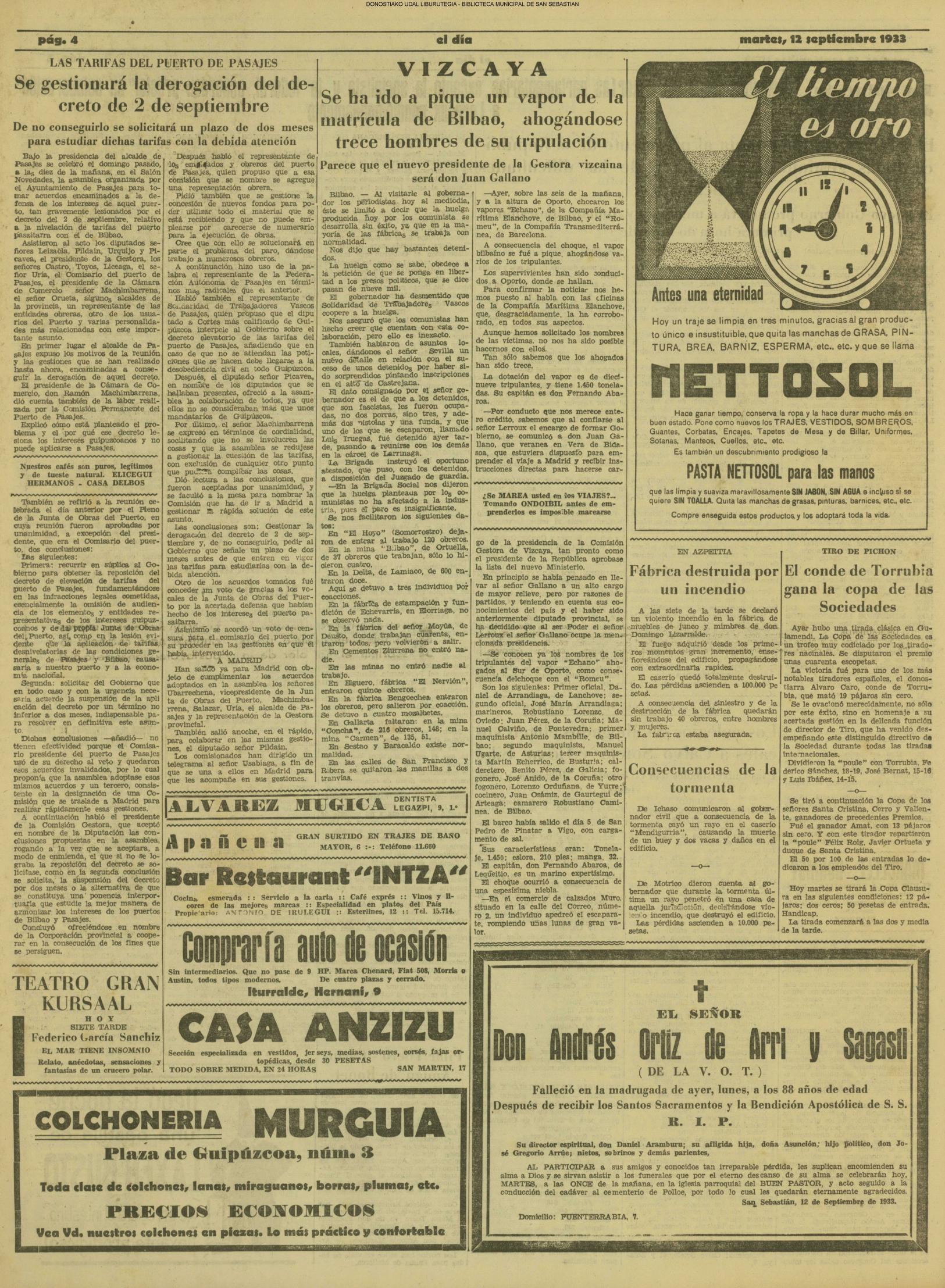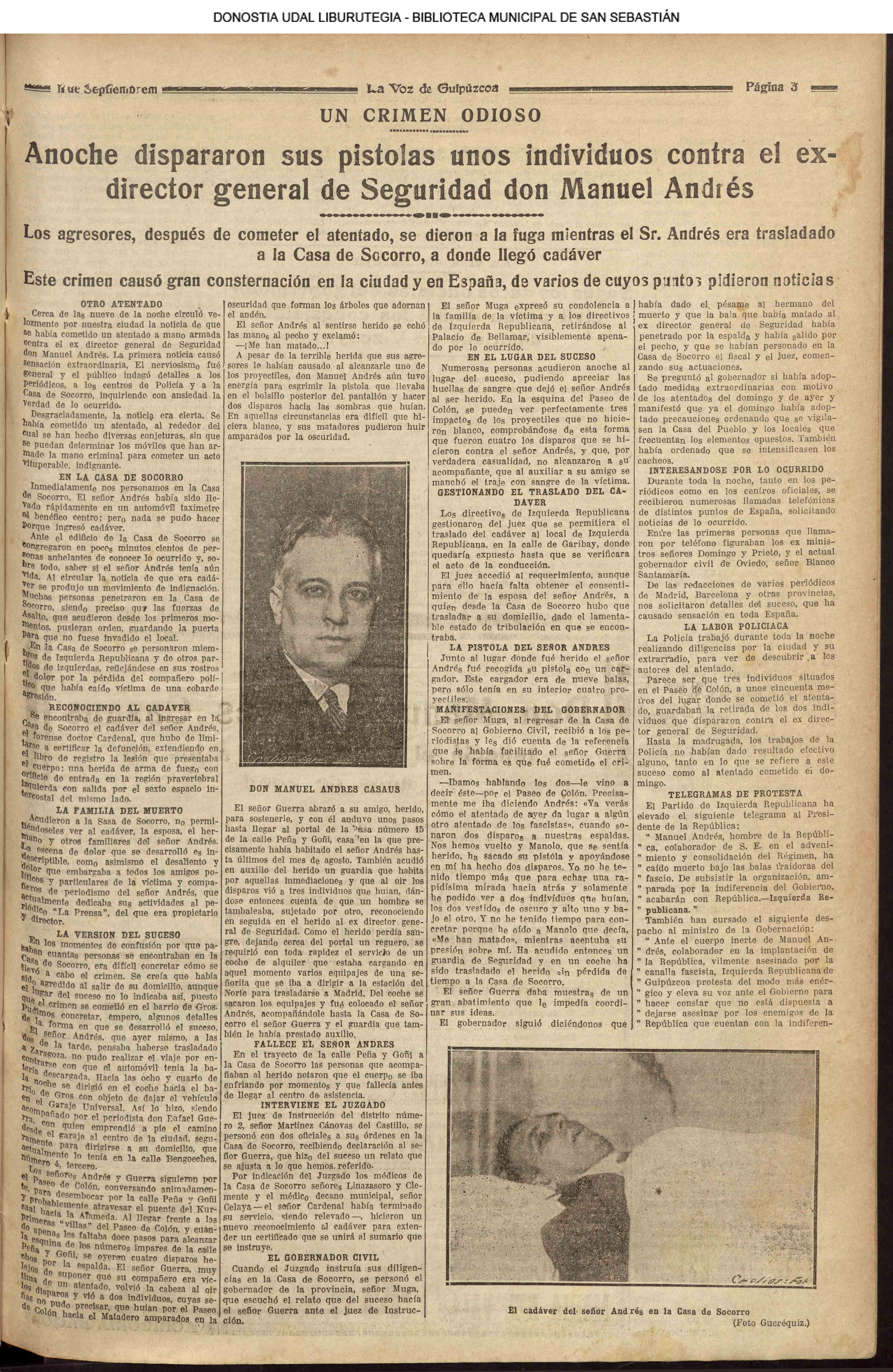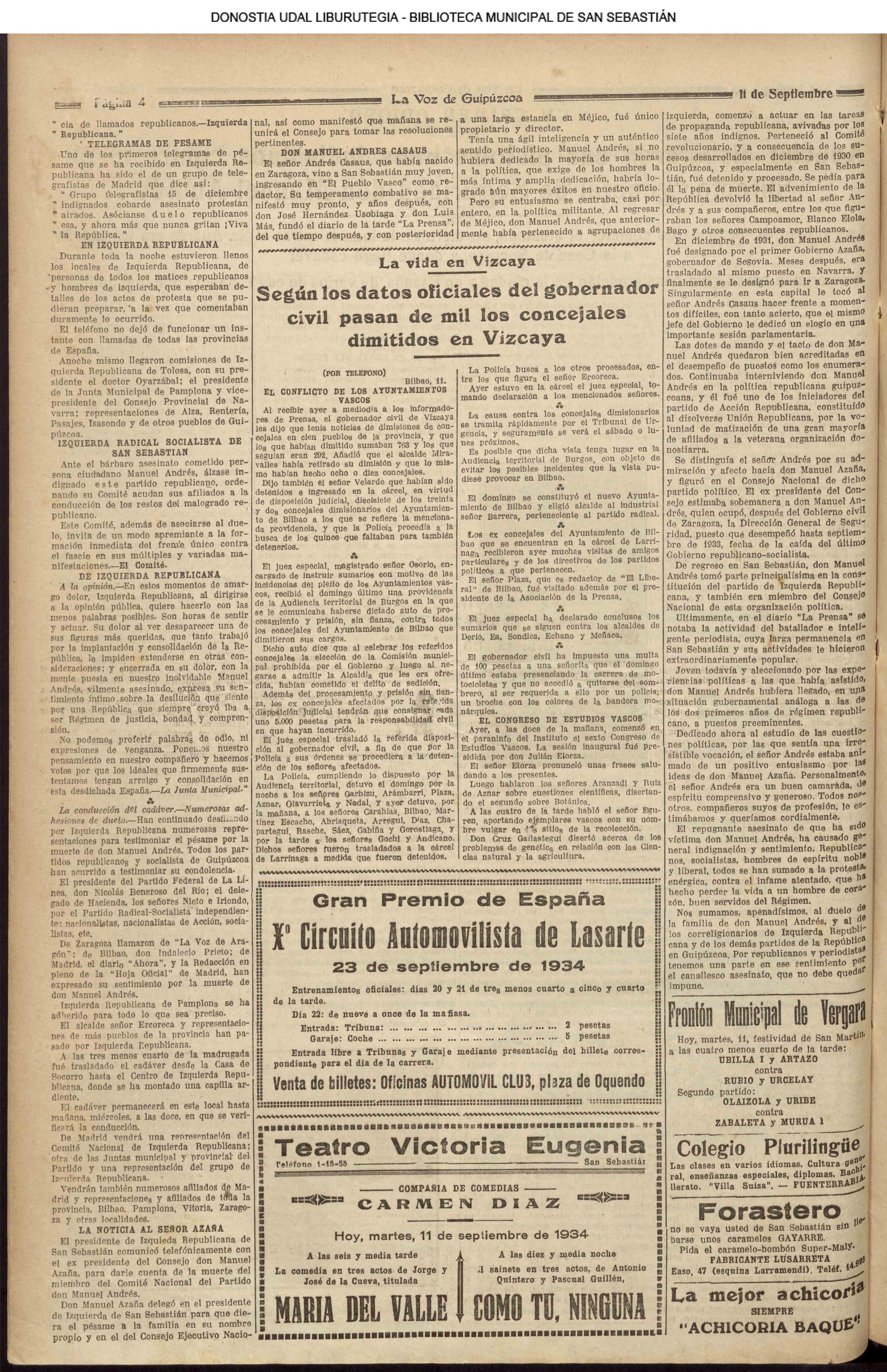 10 - septiembre![]() . | (1931) - LA VOZ DE GUIPUZCOA (CENTROS OFICIALES) (La voz de Guipuzcoa)(El Pueblo Vasco)(El Día)(La Constancia) ++++++++++++++++++++++++++++++++++++++++++++++ (1932) - LA VOZ DE GUIPUZCOA (CENTROS OFICIALES) # UN DÍA DE TRIUNFO PARA LA REPÚBLICA- El Presidente de la República, Sr. Alcalá Zamora llega a San Sebastián (La voz de Guipuzcoa/cont/cont/cont)(El Pueblo Vasco)(El Día)(La Constancia) ++++++++++++++++++++++++++++++++++++++++++++++ # EN EL PUERTO DE PASAJES, se celebró una importante asamblea para pedir la reposición o suspensión del decreto que eleva las tarifas. (La voz de Guipuzcoa)(El Pueblo Vasco)(El Día)(La Constancia) # REGATAS EN LA CONCHA # TAURINAS. CORRIDA DE LA BENEFICENCIA (La voz de Guipuzcoa)(El Pueblo Vasco)(El Día)(La Constancia) ++++++++++++++++++++++++++++++++++++++++++++++ # ATENTADO- UN CRIMEN ODIOSO.- A la noche dispararon sus pistolas unos individuos contra el ex director general de Seguridad don Manuel Andrés (La voz de Guipuzcoa/cont)(El Pueblo Vasco)(El Día)(La Constancia) ++++++++++++++++++++++++++++++++++++++++++++++ (1935) - LA VOZ DE GUIPUZCOA (CENTROS OFICIALES : La Comisión Gestora municipal, por medio de un representante, expresó su pésame a don Pío Baroja, por el fallecimiento de su madre) # ANIVERSARIO DE LA MUERTE DE MANUEL ANDRÉS - Fue conmemorado el aniversario del acontecimiento luctuoso con un solemne silencio de recuerdo y de homenaje republicano (La voz de Guipuzcoa)(El Pueblo Vasco)(El Día)(La Constancia) # EN LA CASA CONSISTORIAL . .- A cuenta de las obras de desmonte y relleno en Amara entablose nuevo debate en la reunión que celebró la Gestora, acordándose que el informe quede para más amplio estudio. (La voz de Guipuzcoa)(El Pueblo Vasco)(El Día)(La Constancia) |