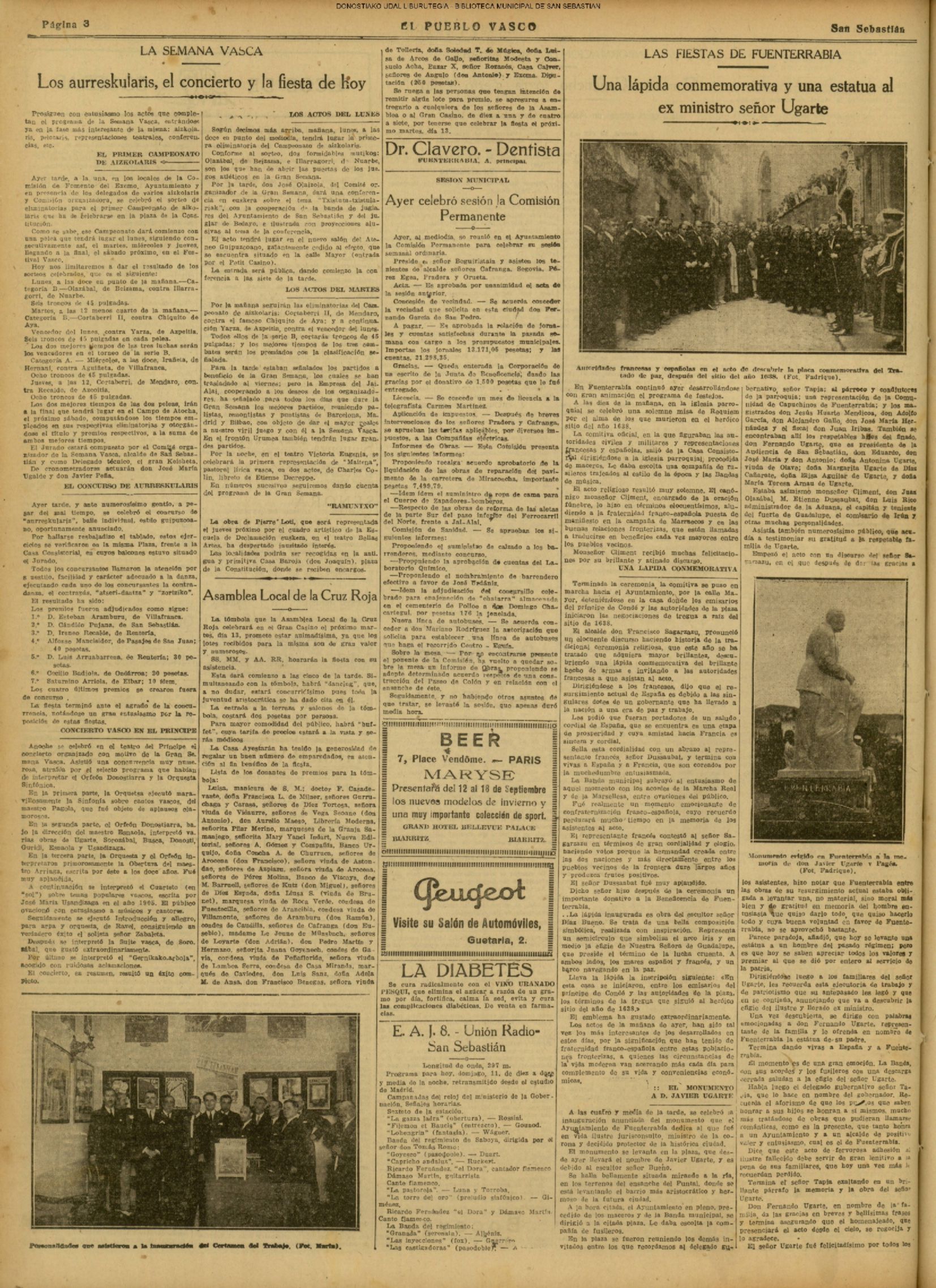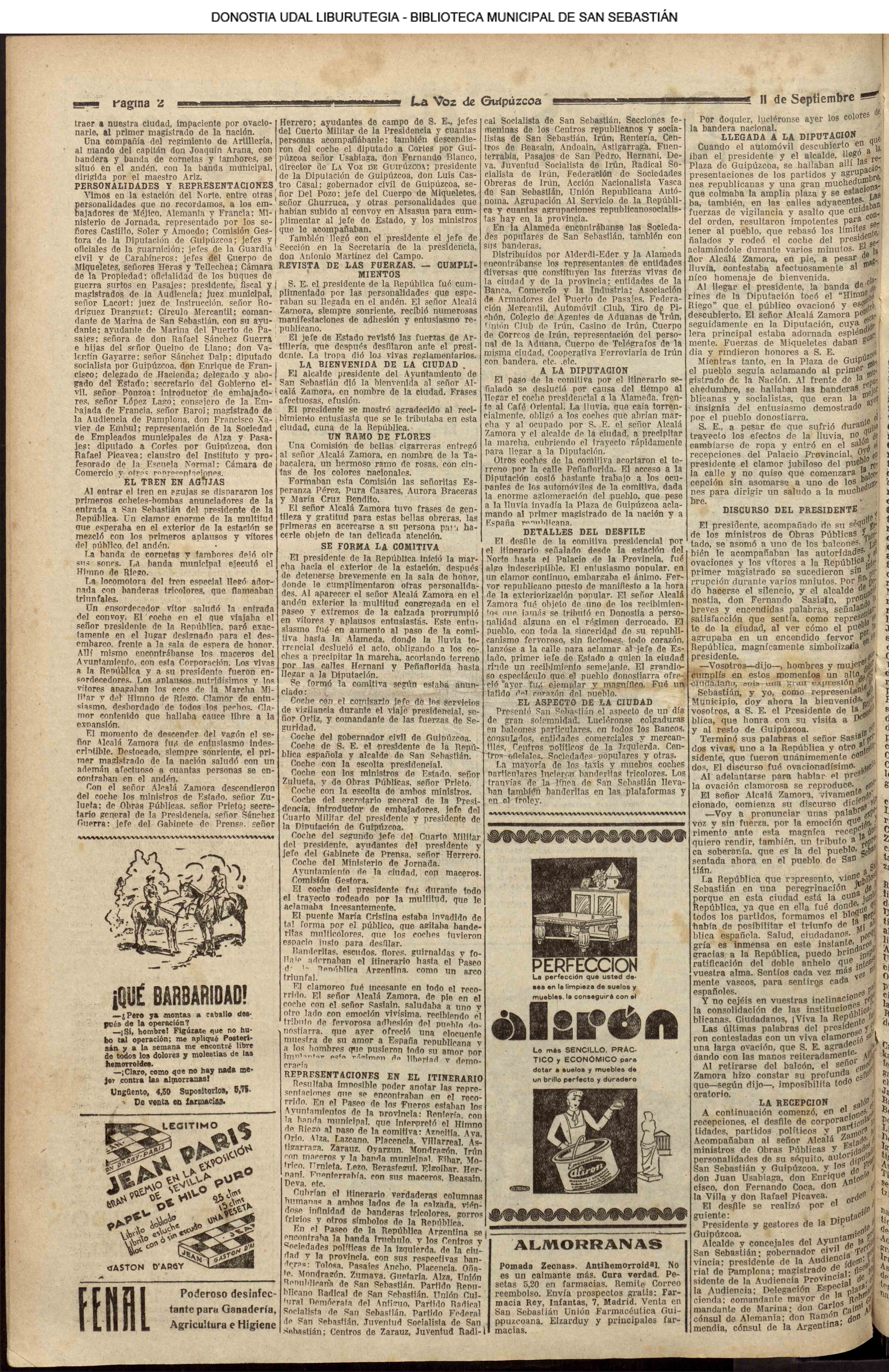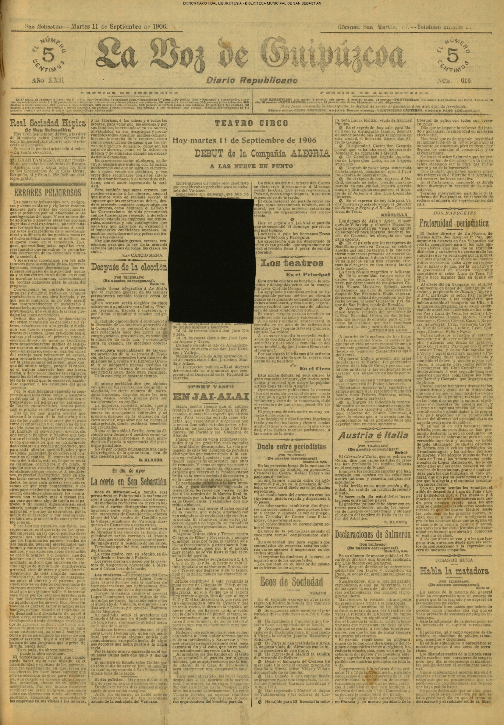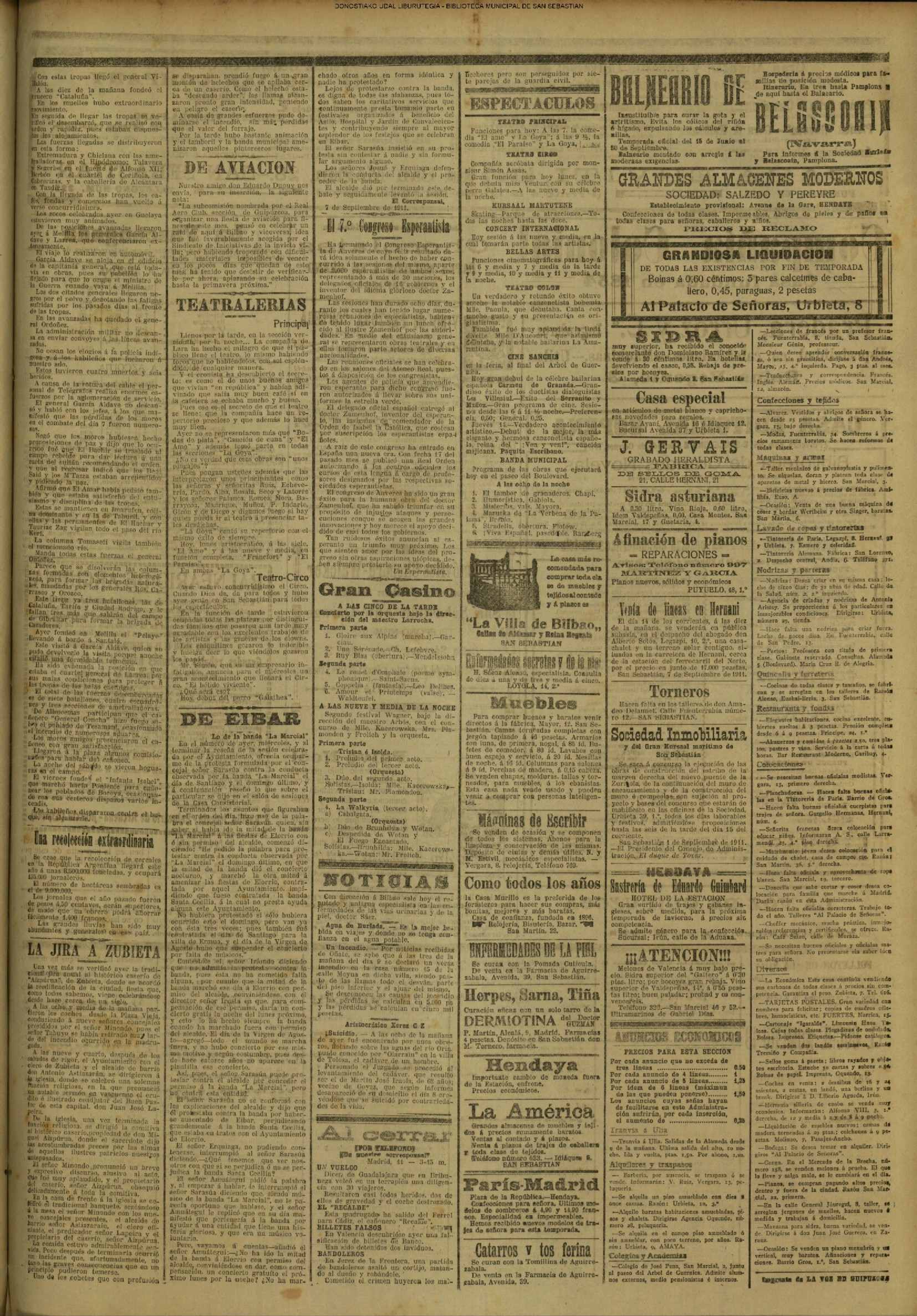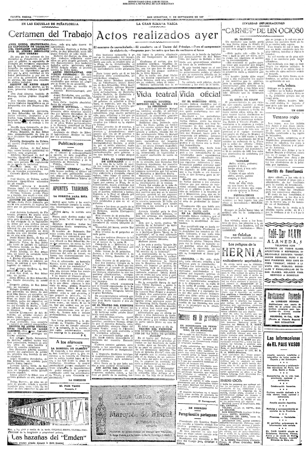 10 - septiembre![]() . | (1931) - LA VOZ DE GUIPUZCOA (CENTROS OFICIALES) (La voz de Guipuzcoa)(El Pueblo Vasco)(El Día)(La Constancia) ++++++++++++++++++++++++++++++++++++++++++++++ (1932) - LA VOZ DE GUIPUZCOA (CENTROS OFICIALES) # UN DÍA DE TRIUNFO PARA LA REPÚBLICA- El Presidente de la República, Sr. Alcalá Zamora llega a San Sebastián (La voz de Guipuzcoa/cont/cont/cont)(El Pueblo Vasco)(El Día)(La Constancia) ++++++++++++++++++++++++++++++++++++++++++++++ # EN EL PUERTO DE PASAJES, se celebró una importante asamblea para pedir la reposición o suspensión del decreto que eleva las tarifas. (La voz de Guipuzcoa)(El Pueblo Vasco)(El Día)(La Constancia) # REGATAS EN LA CONCHA # TAURINAS. CORRIDA DE LA BENEFICENCIA (La voz de Guipuzcoa)(El Pueblo Vasco)(El Día)(La Constancia) ++++++++++++++++++++++++++++++++++++++++++++++ # ATENTADO- UN CRIMEN ODIOSO.- A la noche dispararon sus pistolas unos individuos contra el ex director general de Seguridad don Manuel Andrés (La voz de Guipuzcoa/cont)(El Pueblo Vasco)(El Día)(La Constancia) ++++++++++++++++++++++++++++++++++++++++++++++ (1935) - LA VOZ DE GUIPUZCOA (CENTROS OFICIALES : La Comisión Gestora municipal, por medio de un representante, expresó su pésame a don Pío Baroja, por el fallecimiento de su madre) # ANIVERSARIO DE LA MUERTE DE MANUEL ANDRÉS - Fue conmemorado el aniversario del acontecimiento luctuoso con un solemne silencio de recuerdo y de homenaje republicano (La voz de Guipuzcoa)(El Pueblo Vasco)(El Día)(La Constancia) # EN LA CASA CONSISTORIAL . .- A cuenta de las obras de desmonte y relleno en Amara entablose nuevo debate en la reunión que celebró la Gestora, acordándose que el informe quede para más amplio estudio. (La voz de Guipuzcoa)(El Pueblo Vasco)(El Día)(La Constancia) |