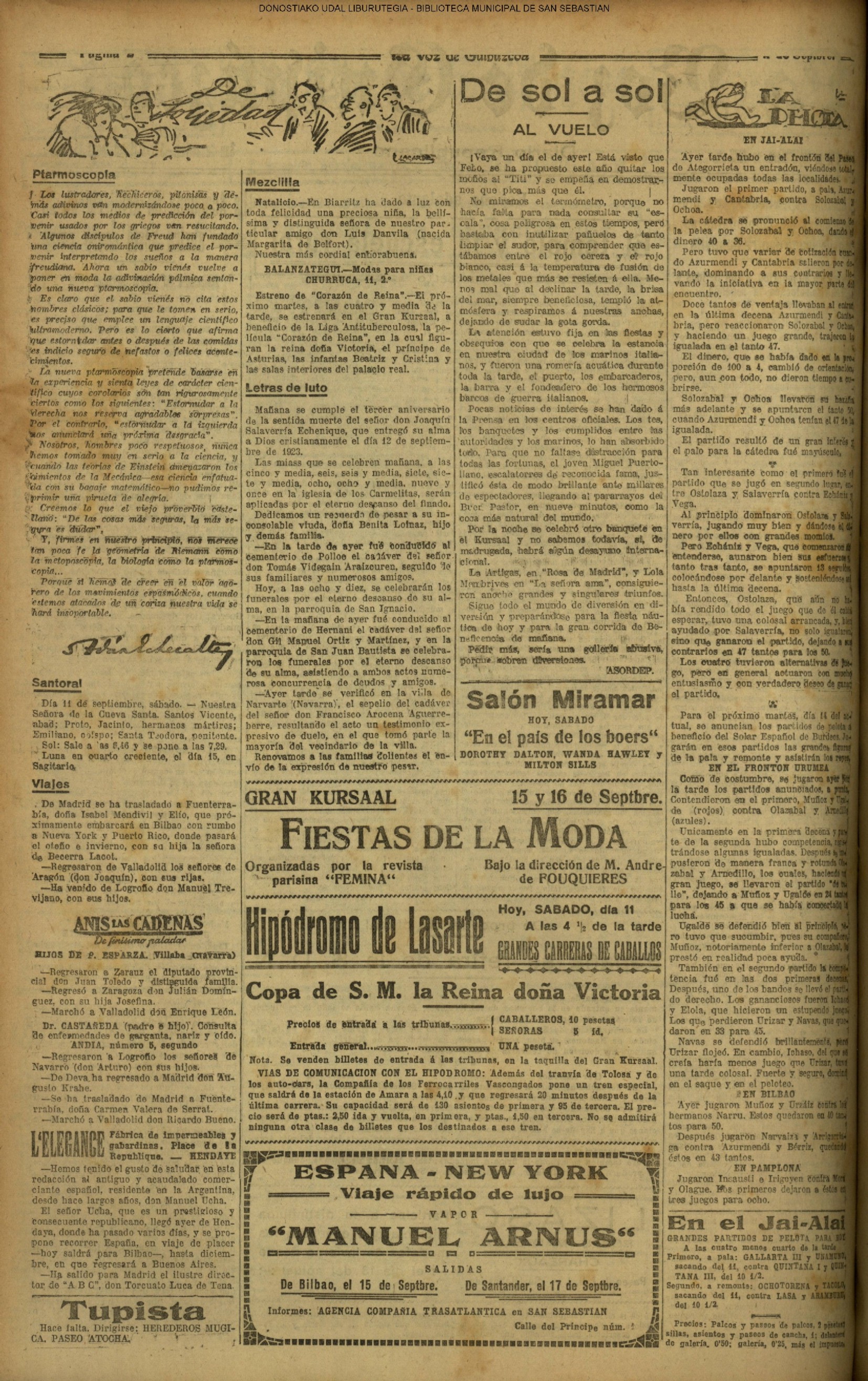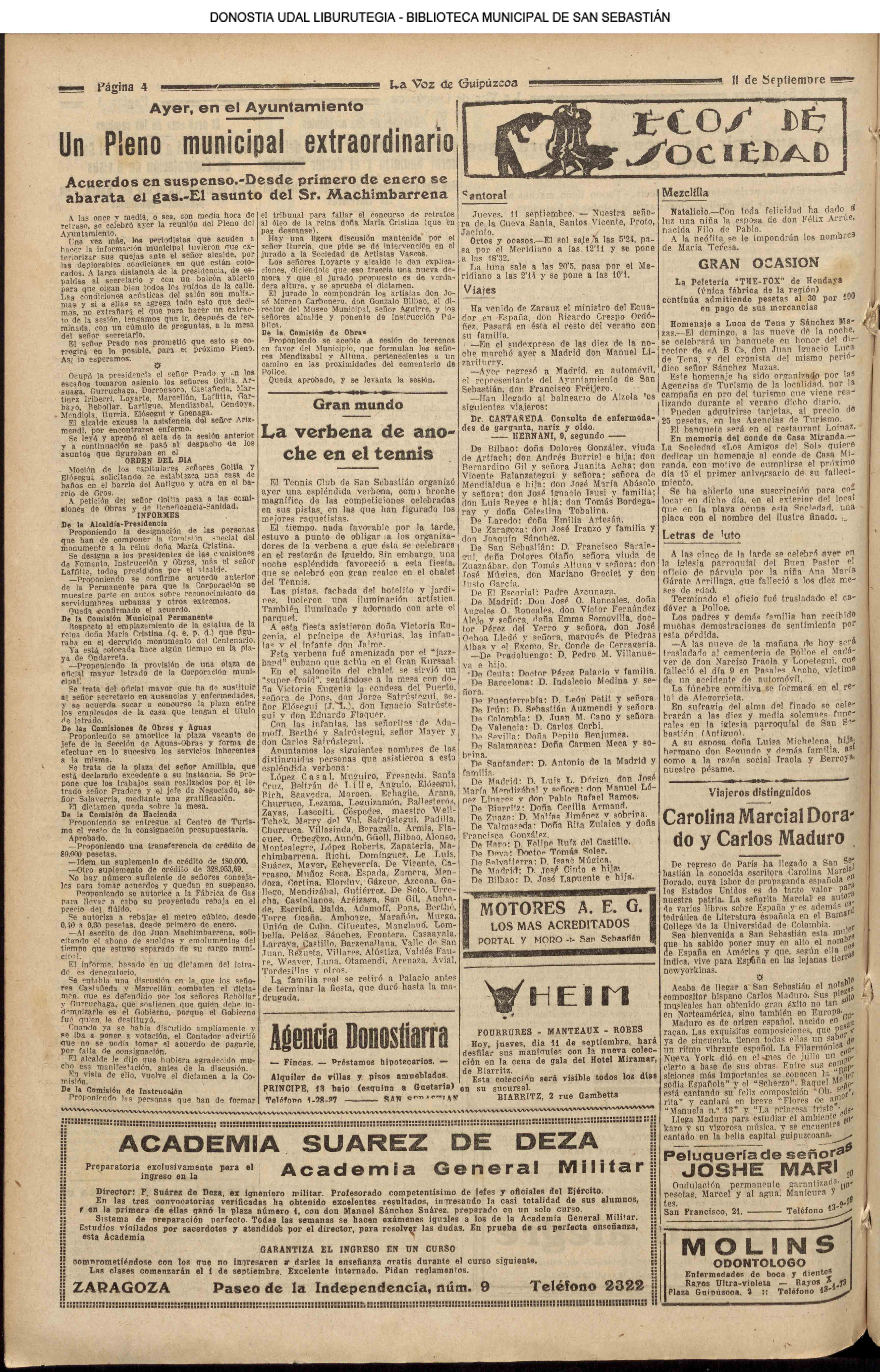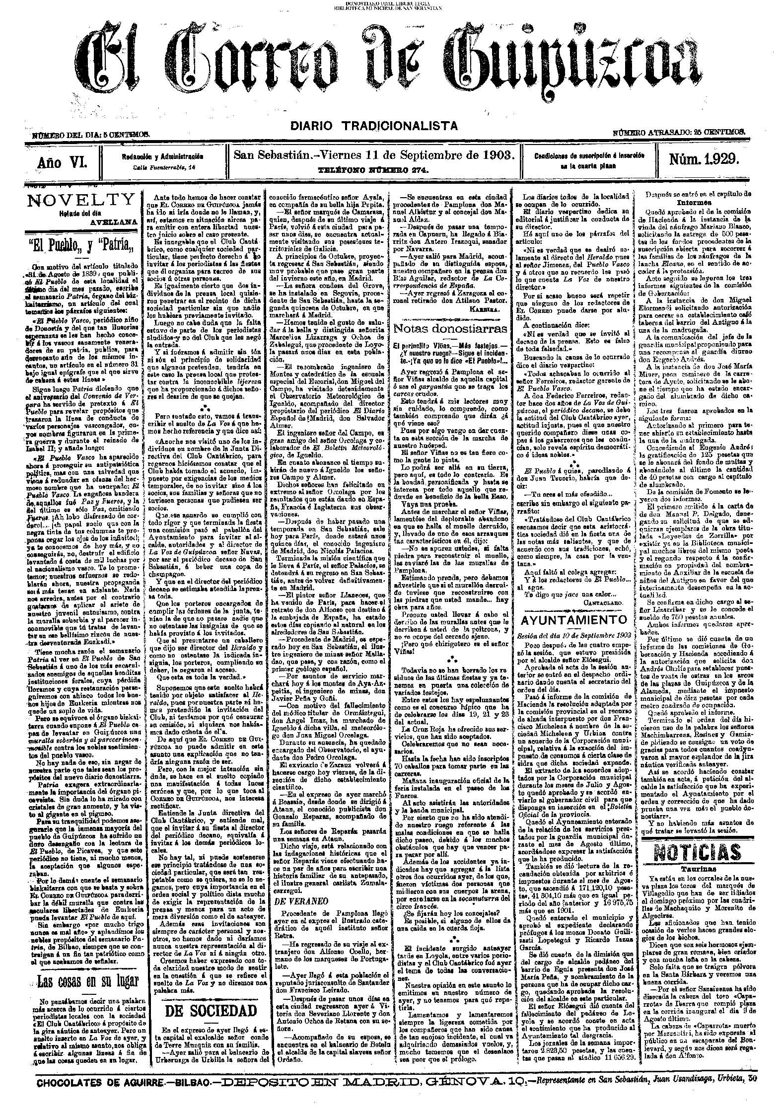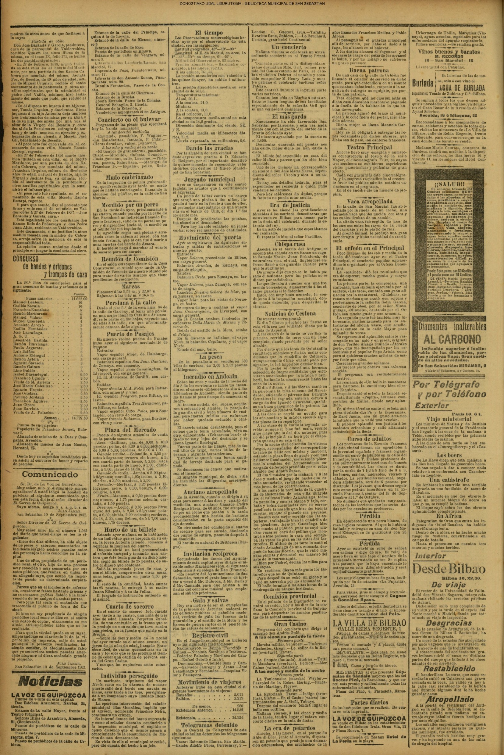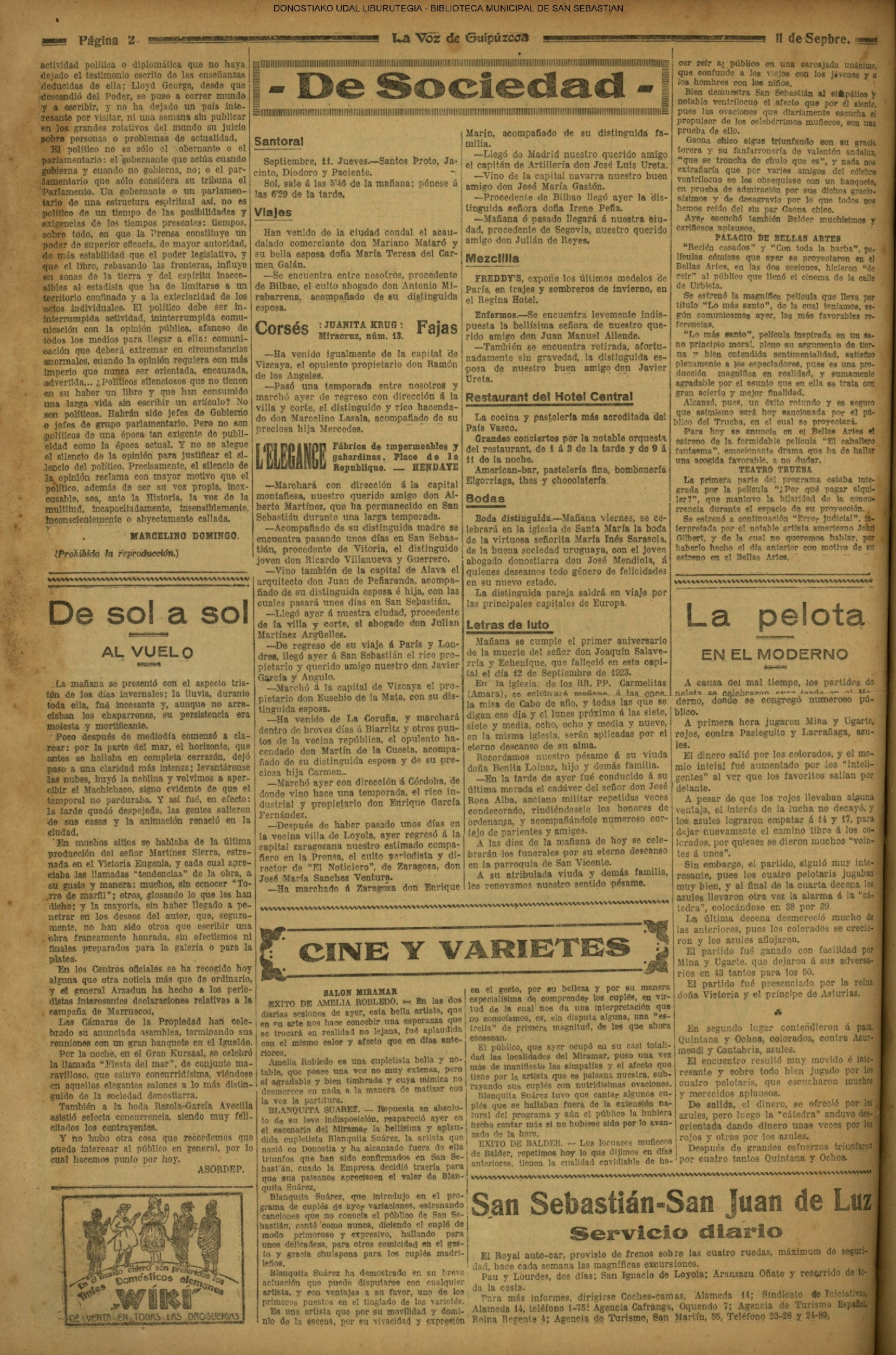10 - septiembre![]() . | (1931) - LA VOZ DE GUIPUZCOA (CENTROS OFICIALES) (La voz de Guipuzcoa)(El Pueblo Vasco)(El Día)(La Constancia) ++++++++++++++++++++++++++++++++++++++++++++++ (1932) - LA VOZ DE GUIPUZCOA (CENTROS OFICIALES) # UN DÍA DE TRIUNFO PARA LA REPÚBLICA- El Presidente de la República, Sr. Alcalá Zamora llega a San Sebastián (La voz de Guipuzcoa/cont/cont/cont)(El Pueblo Vasco)(El Día)(La Constancia) ++++++++++++++++++++++++++++++++++++++++++++++ # EN EL PUERTO DE PASAJES, se celebró una importante asamblea para pedir la reposición o suspensión del decreto que eleva las tarifas. (La voz de Guipuzcoa)(El Pueblo Vasco)(El Día)(La Constancia) # REGATAS EN LA CONCHA # TAURINAS. CORRIDA DE LA BENEFICENCIA (La voz de Guipuzcoa)(El Pueblo Vasco)(El Día)(La Constancia) ++++++++++++++++++++++++++++++++++++++++++++++ # ATENTADO- UN CRIMEN ODIOSO.- A la noche dispararon sus pistolas unos individuos contra el ex director general de Seguridad don Manuel Andrés (La voz de Guipuzcoa/cont)(El Pueblo Vasco)(El Día)(La Constancia) ++++++++++++++++++++++++++++++++++++++++++++++ (1935) - LA VOZ DE GUIPUZCOA (CENTROS OFICIALES : La Comisión Gestora municipal, por medio de un representante, expresó su pésame a don Pío Baroja, por el fallecimiento de su madre) # ANIVERSARIO DE LA MUERTE DE MANUEL ANDRÉS - Fue conmemorado el aniversario del acontecimiento luctuoso con un solemne silencio de recuerdo y de homenaje republicano (La voz de Guipuzcoa)(El Pueblo Vasco)(El Día)(La Constancia) # EN LA CASA CONSISTORIAL . .- A cuenta de las obras de desmonte y relleno en Amara entablose nuevo debate en la reunión que celebró la Gestora, acordándose que el informe quede para más amplio estudio. (La voz de Guipuzcoa)(El Pueblo Vasco)(El Día)(La Constancia) |