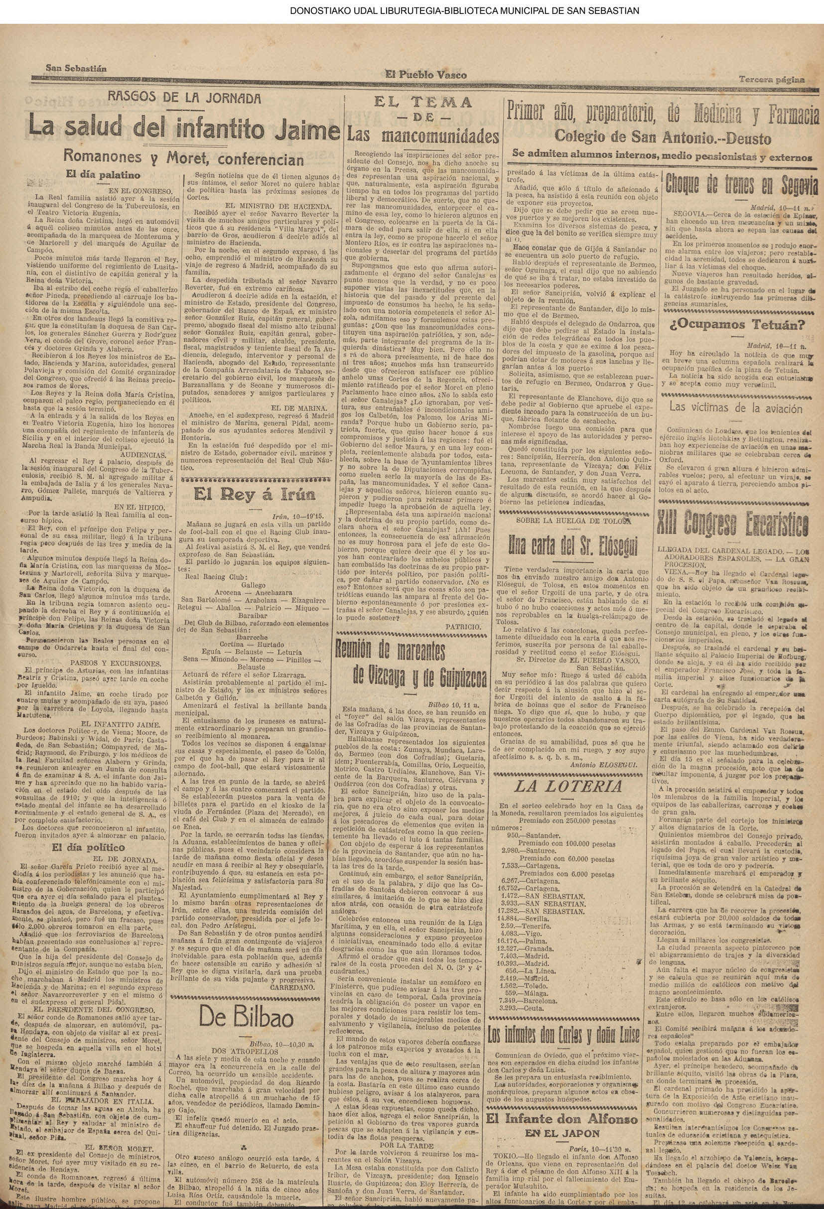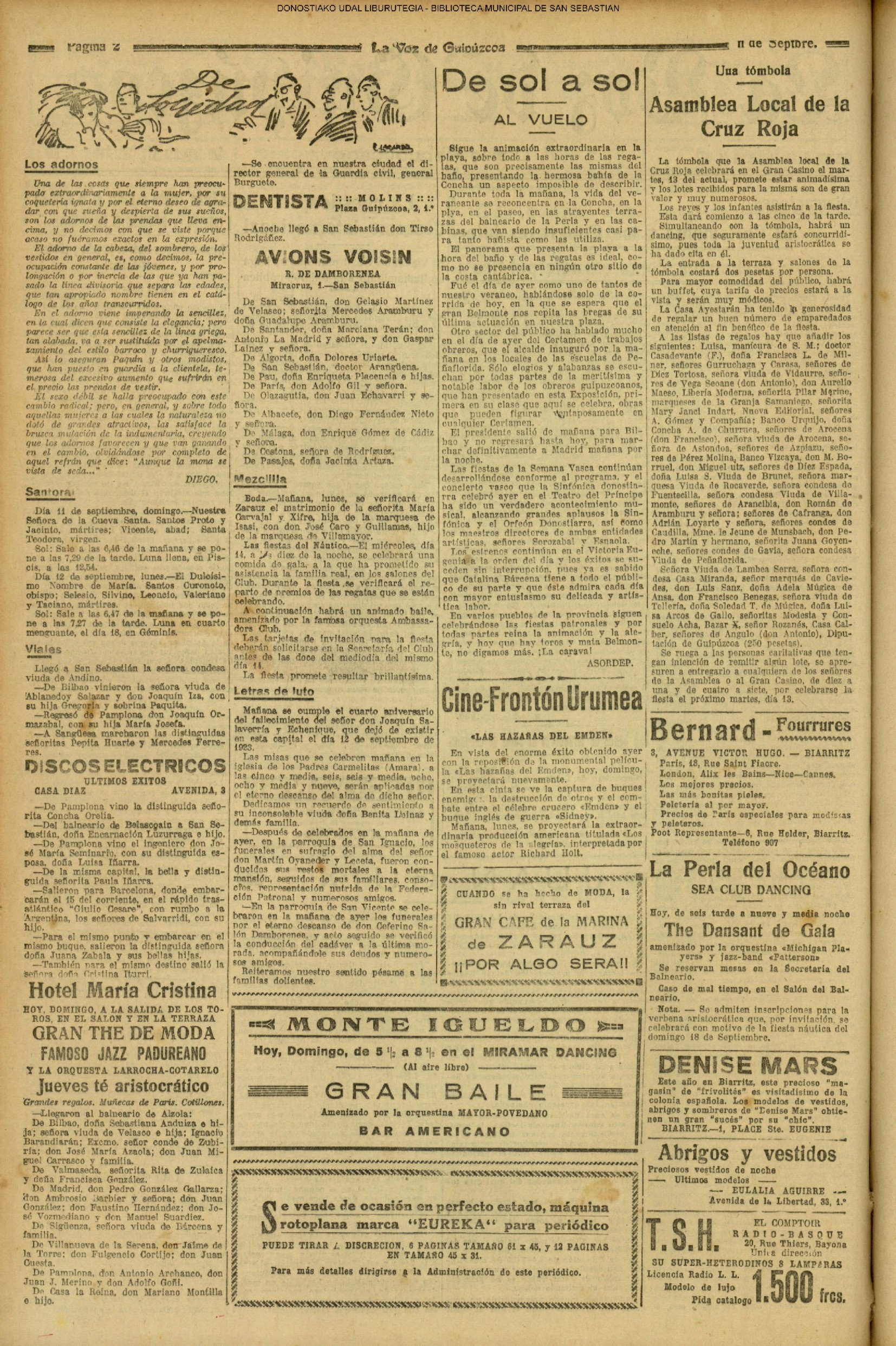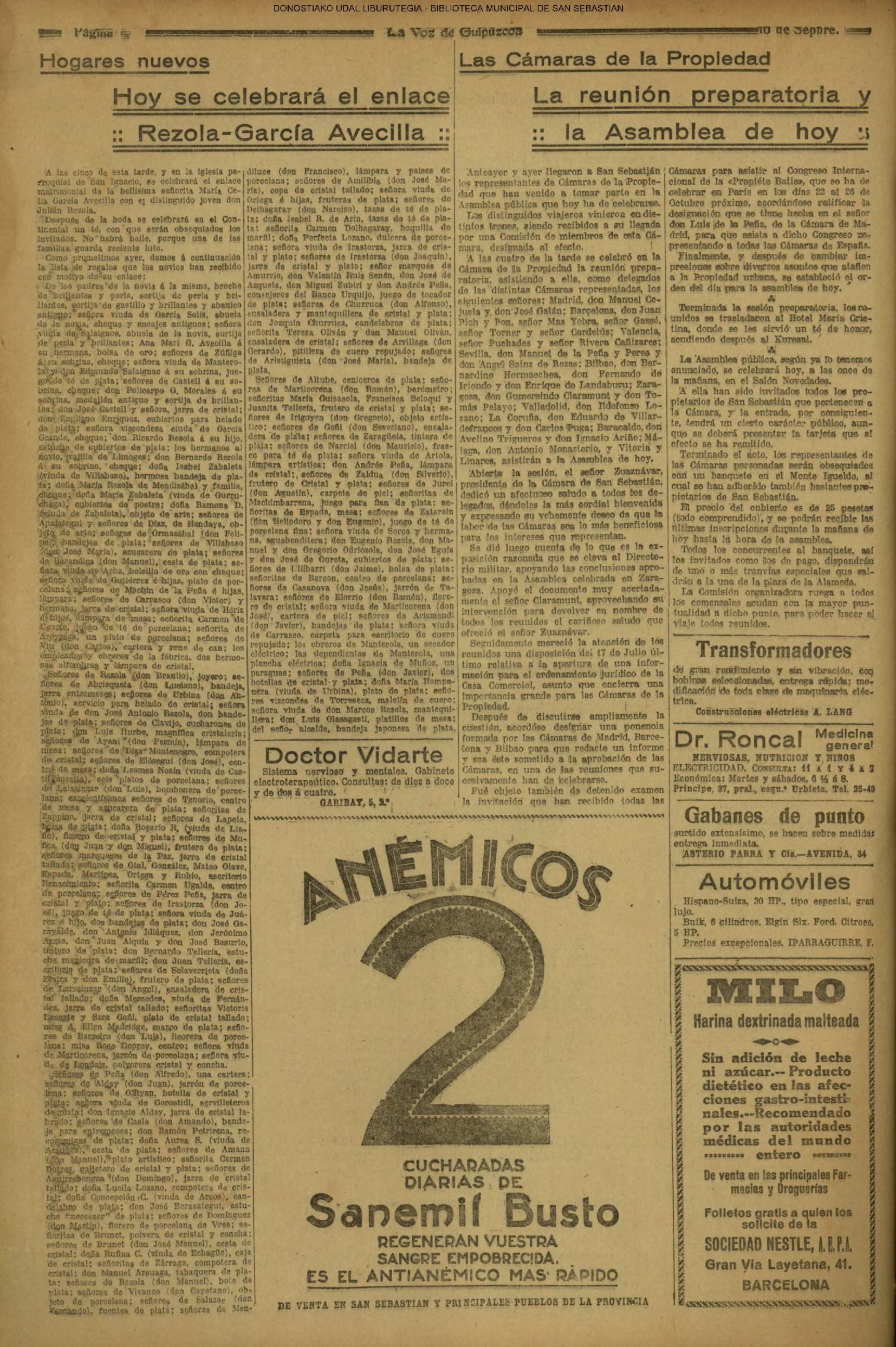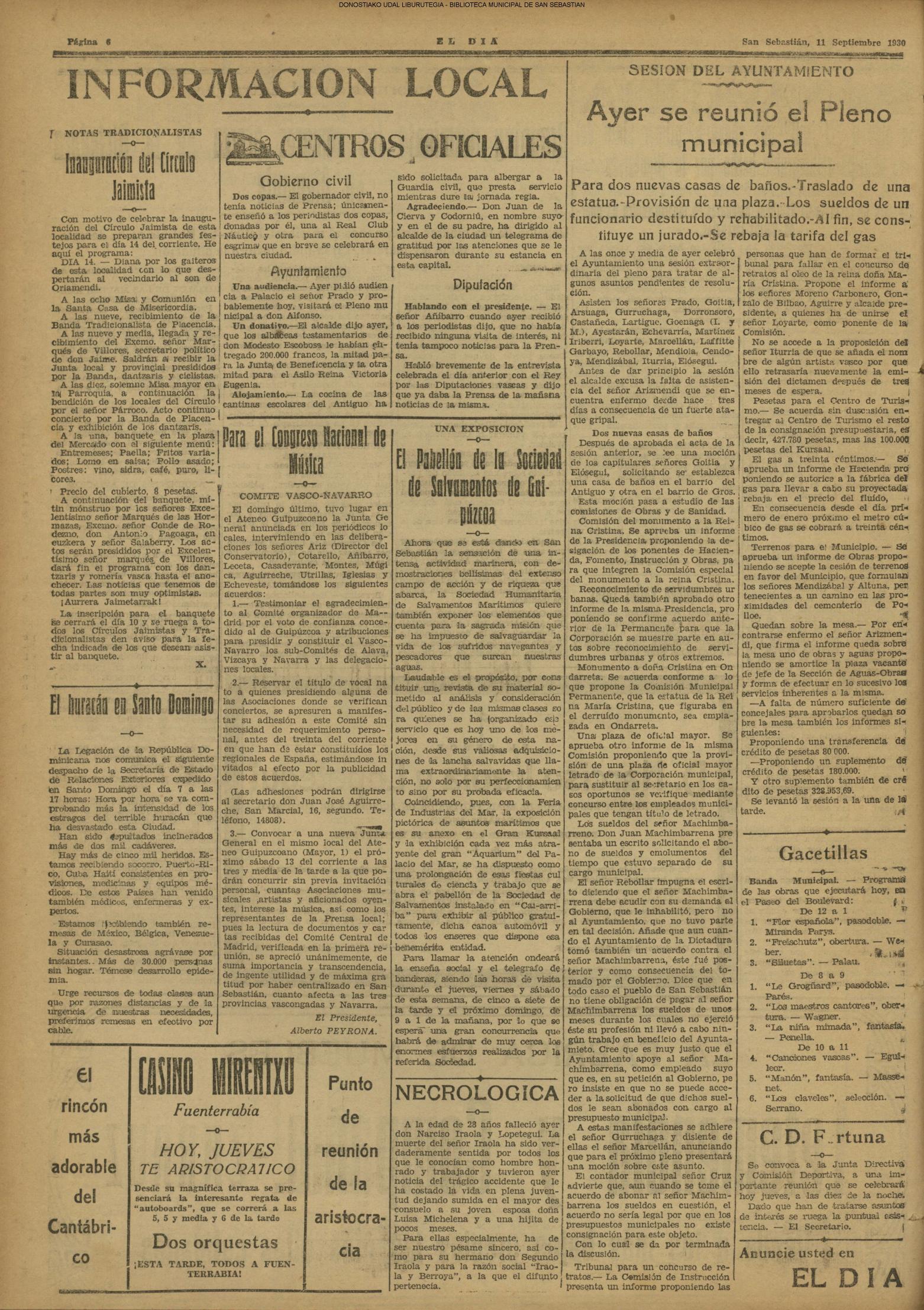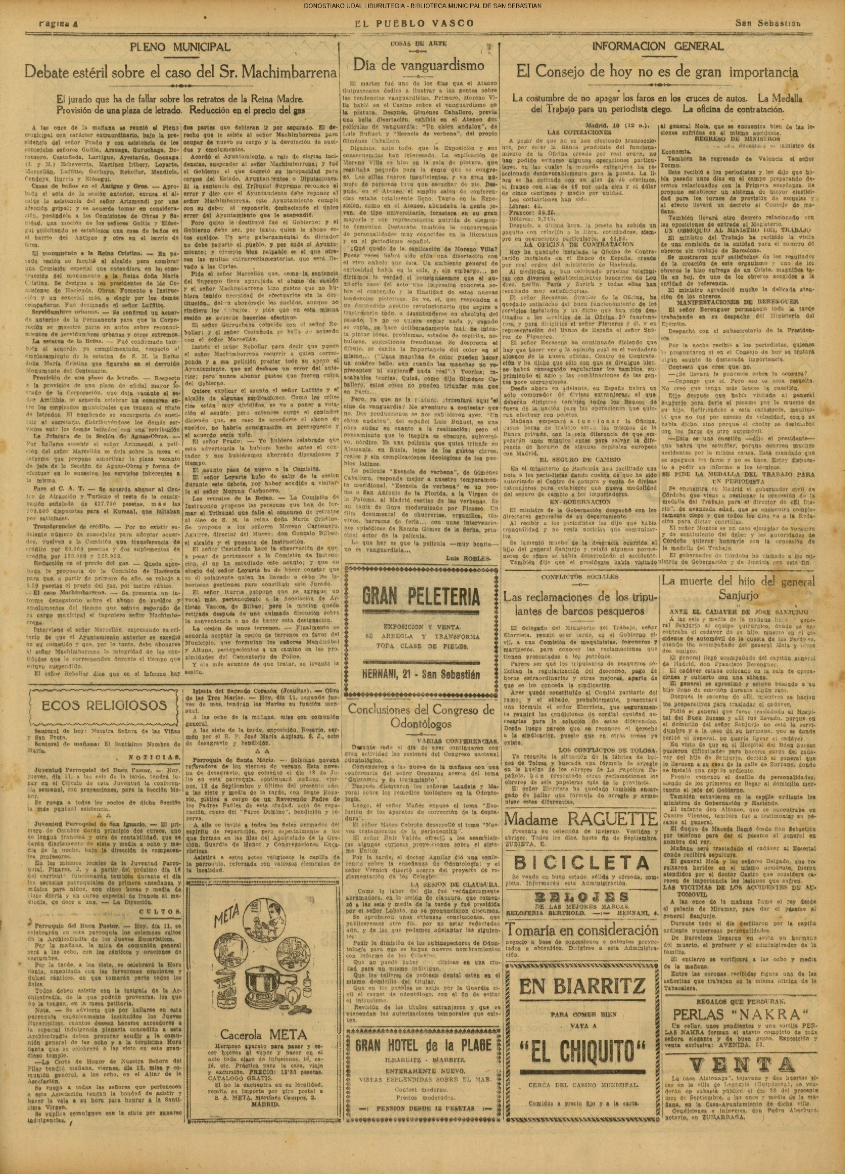 10 - septiembre![]() . | (1931) - LA VOZ DE GUIPUZCOA (CENTROS OFICIALES) (La voz de Guipuzcoa)(El Pueblo Vasco)(El Día)(La Constancia) ++++++++++++++++++++++++++++++++++++++++++++++ (1932) - LA VOZ DE GUIPUZCOA (CENTROS OFICIALES) # UN DÍA DE TRIUNFO PARA LA REPÚBLICA- El Presidente de la República, Sr. Alcalá Zamora llega a San Sebastián (La voz de Guipuzcoa/cont/cont/cont)(El Pueblo Vasco)(El Día)(La Constancia) ++++++++++++++++++++++++++++++++++++++++++++++ # EN EL PUERTO DE PASAJES, se celebró una importante asamblea para pedir la reposición o suspensión del decreto que eleva las tarifas. (La voz de Guipuzcoa)(El Pueblo Vasco)(El Día)(La Constancia) # REGATAS EN LA CONCHA # TAURINAS. CORRIDA DE LA BENEFICENCIA (La voz de Guipuzcoa)(El Pueblo Vasco)(El Día)(La Constancia) ++++++++++++++++++++++++++++++++++++++++++++++ # ATENTADO- UN CRIMEN ODIOSO.- A la noche dispararon sus pistolas unos individuos contra el ex director general de Seguridad don Manuel Andrés (La voz de Guipuzcoa/cont)(El Pueblo Vasco)(El Día)(La Constancia) ++++++++++++++++++++++++++++++++++++++++++++++ (1935) - LA VOZ DE GUIPUZCOA (CENTROS OFICIALES : La Comisión Gestora municipal, por medio de un representante, expresó su pésame a don Pío Baroja, por el fallecimiento de su madre) # ANIVERSARIO DE LA MUERTE DE MANUEL ANDRÉS - Fue conmemorado el aniversario del acontecimiento luctuoso con un solemne silencio de recuerdo y de homenaje republicano (La voz de Guipuzcoa)(El Pueblo Vasco)(El Día)(La Constancia) # EN LA CASA CONSISTORIAL . .- A cuenta de las obras de desmonte y relleno en Amara entablose nuevo debate en la reunión que celebró la Gestora, acordándose que el informe quede para más amplio estudio. (La voz de Guipuzcoa)(El Pueblo Vasco)(El Día)(La Constancia) |