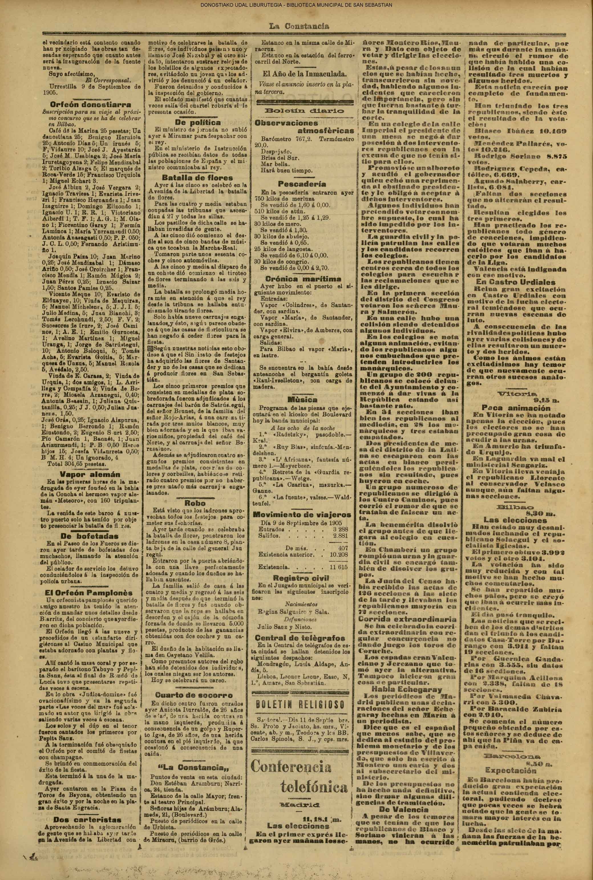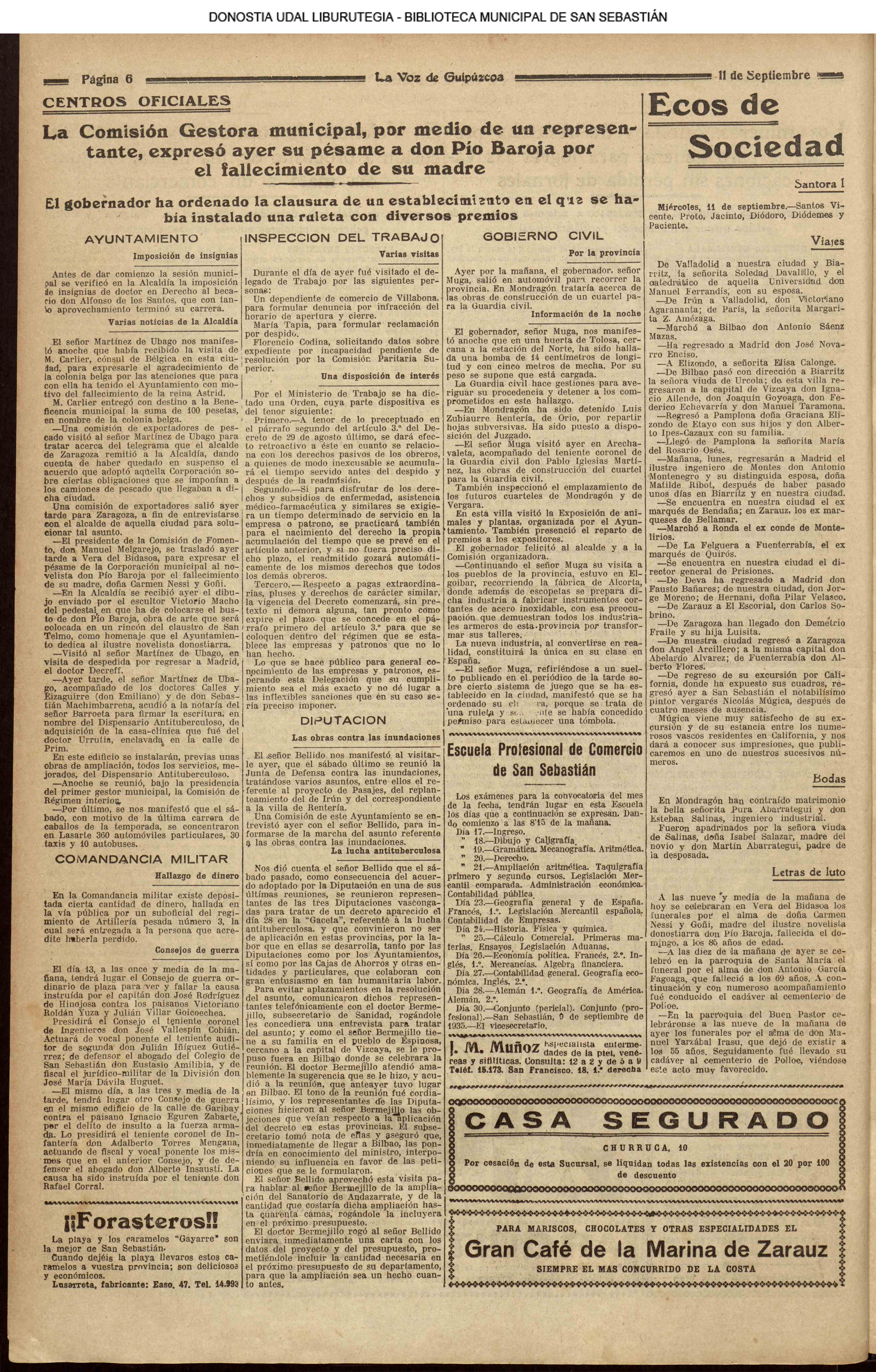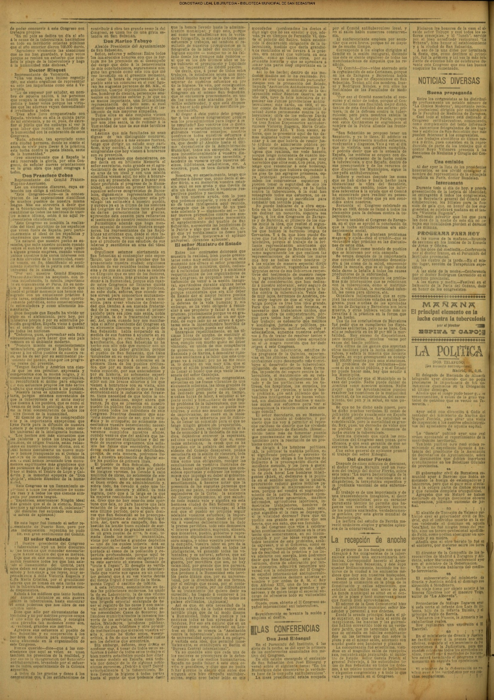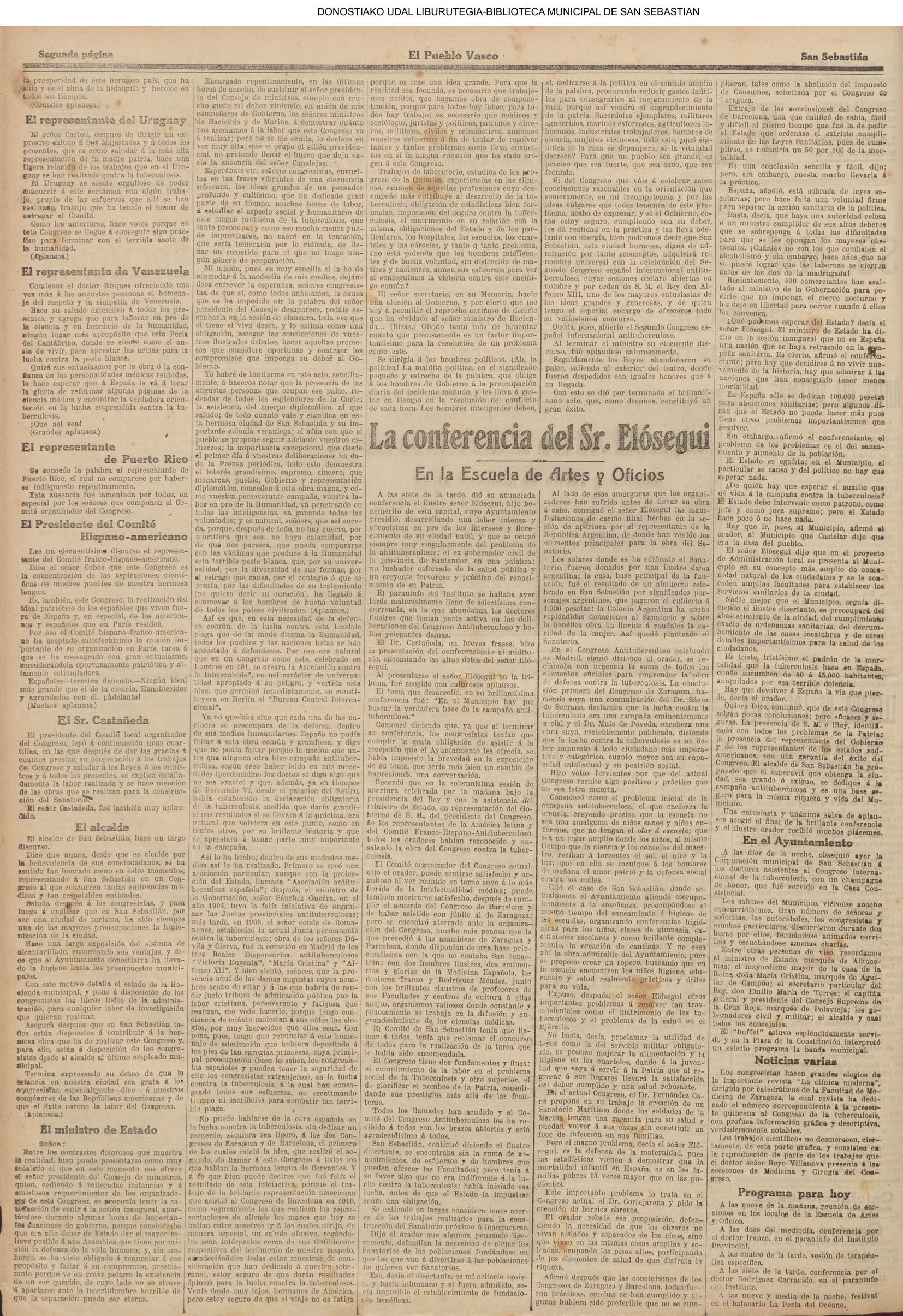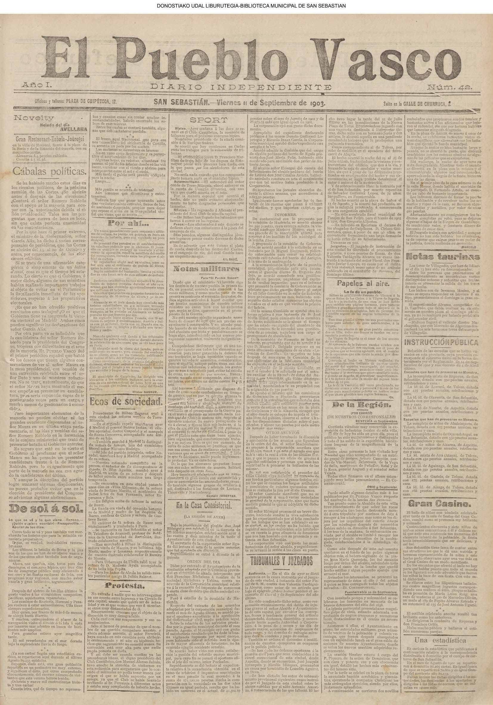 10 - septiembre![]() . | (1931) - LA VOZ DE GUIPUZCOA (CENTROS OFICIALES) (La voz de Guipuzcoa)(El Pueblo Vasco)(El Día)(La Constancia) ++++++++++++++++++++++++++++++++++++++++++++++ (1932) - LA VOZ DE GUIPUZCOA (CENTROS OFICIALES) # UN DÍA DE TRIUNFO PARA LA REPÚBLICA- El Presidente de la República, Sr. Alcalá Zamora llega a San Sebastián (La voz de Guipuzcoa/cont/cont/cont)(El Pueblo Vasco)(El Día)(La Constancia) ++++++++++++++++++++++++++++++++++++++++++++++ # EN EL PUERTO DE PASAJES, se celebró una importante asamblea para pedir la reposición o suspensión del decreto que eleva las tarifas. (La voz de Guipuzcoa)(El Pueblo Vasco)(El Día)(La Constancia) # REGATAS EN LA CONCHA # TAURINAS. CORRIDA DE LA BENEFICENCIA (La voz de Guipuzcoa)(El Pueblo Vasco)(El Día)(La Constancia) ++++++++++++++++++++++++++++++++++++++++++++++ # ATENTADO- UN CRIMEN ODIOSO.- A la noche dispararon sus pistolas unos individuos contra el ex director general de Seguridad don Manuel Andrés (La voz de Guipuzcoa/cont)(El Pueblo Vasco)(El Día)(La Constancia) ++++++++++++++++++++++++++++++++++++++++++++++ (1935) - LA VOZ DE GUIPUZCOA (CENTROS OFICIALES : La Comisión Gestora municipal, por medio de un representante, expresó su pésame a don Pío Baroja, por el fallecimiento de su madre) # ANIVERSARIO DE LA MUERTE DE MANUEL ANDRÉS - Fue conmemorado el aniversario del acontecimiento luctuoso con un solemne silencio de recuerdo y de homenaje republicano (La voz de Guipuzcoa)(El Pueblo Vasco)(El Día)(La Constancia) # EN LA CASA CONSISTORIAL . .- A cuenta de las obras de desmonte y relleno en Amara entablose nuevo debate en la reunión que celebró la Gestora, acordándose que el informe quede para más amplio estudio. (La voz de Guipuzcoa)(El Pueblo Vasco)(El Día)(La Constancia) |