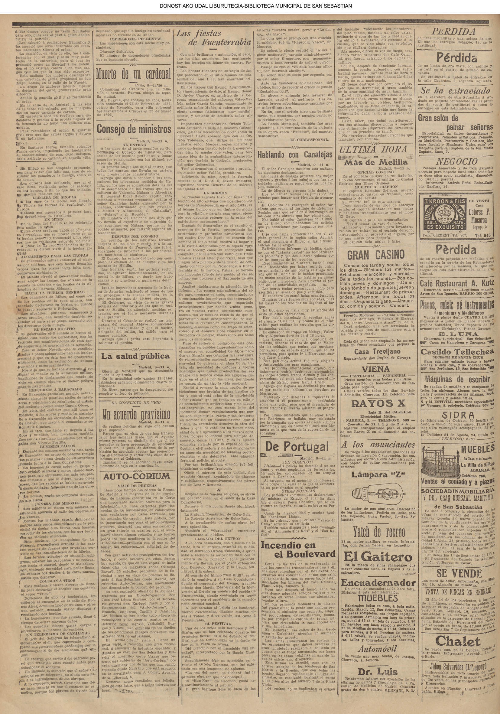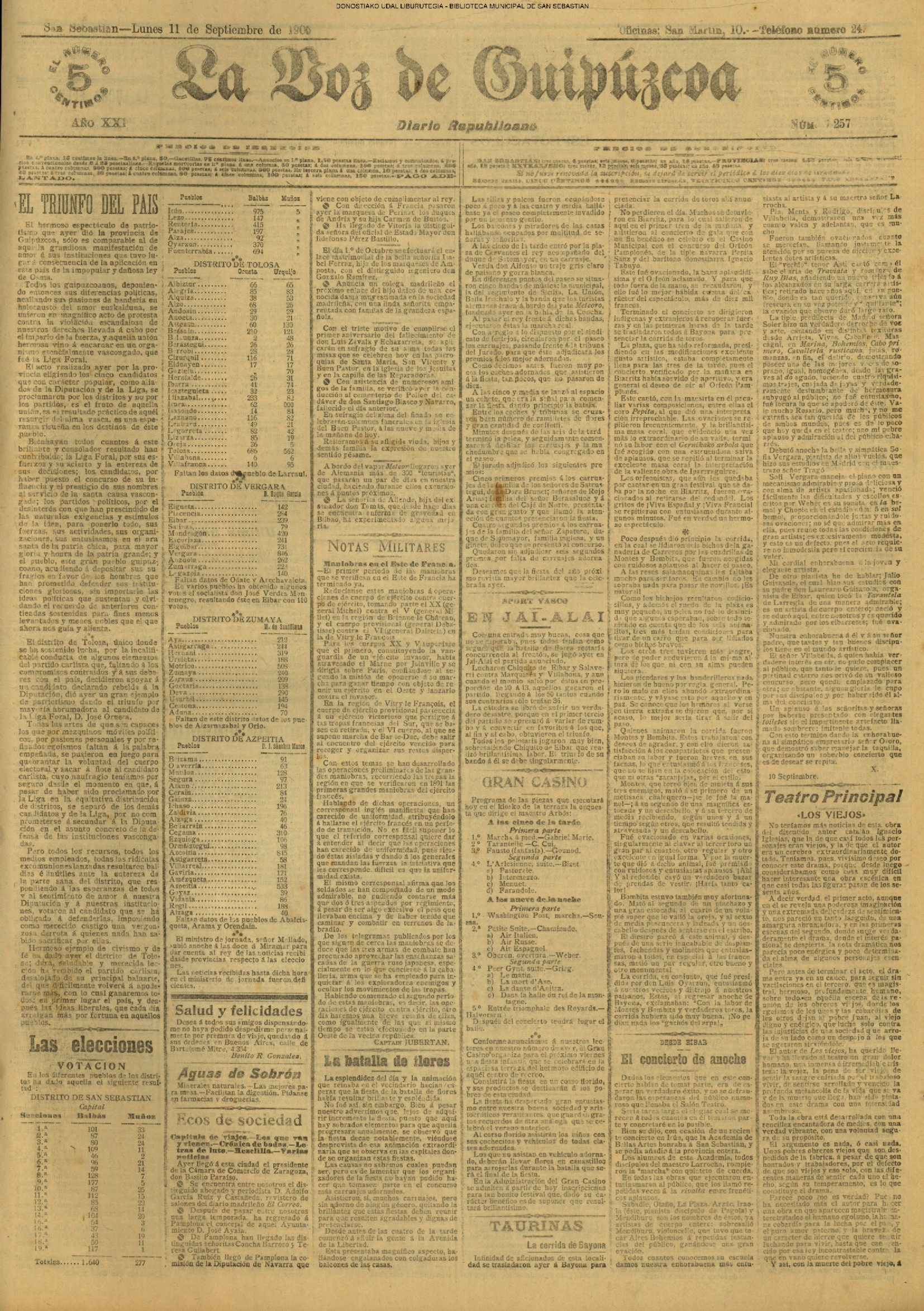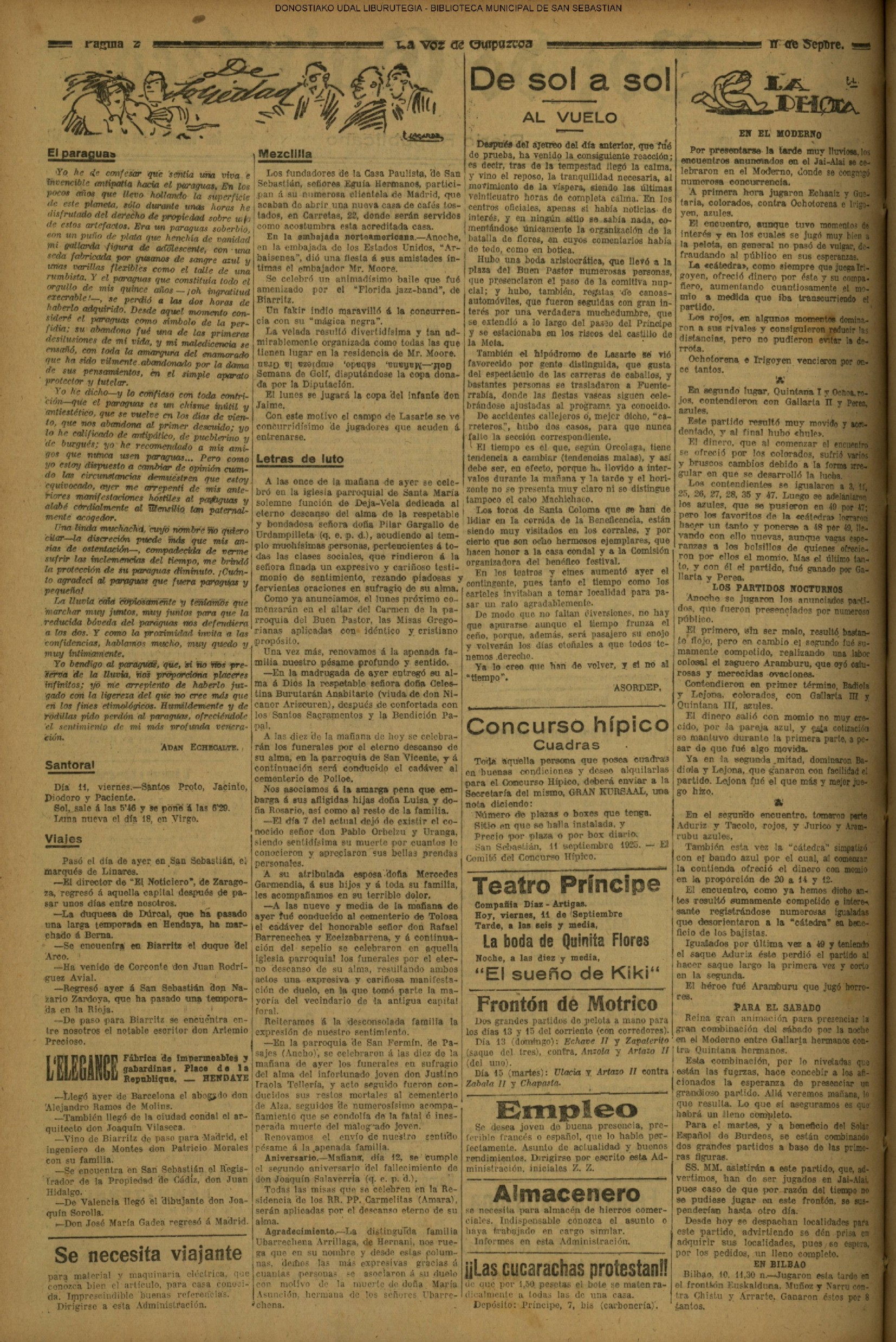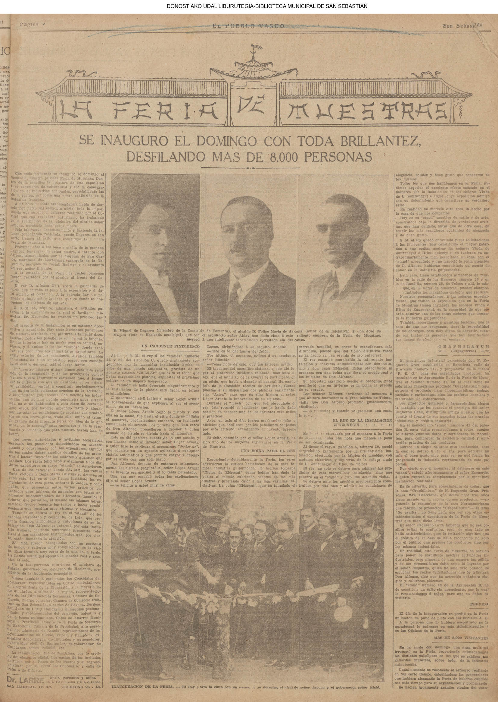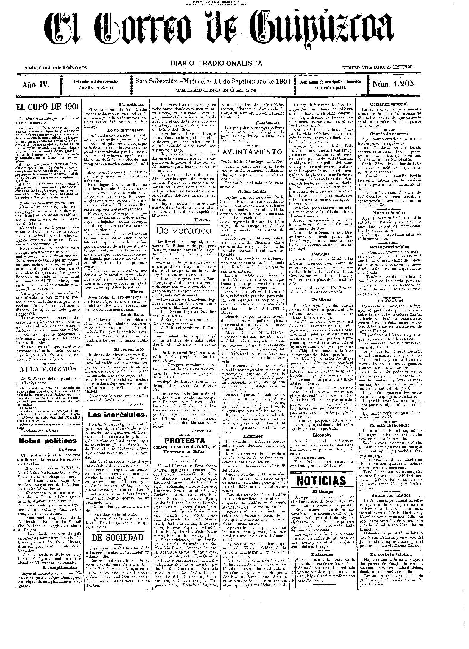 10 - septiembre![]() . | (1931) - LA VOZ DE GUIPUZCOA (CENTROS OFICIALES) (La voz de Guipuzcoa)(El Pueblo Vasco)(El Día)(La Constancia) ++++++++++++++++++++++++++++++++++++++++++++++ (1932) - LA VOZ DE GUIPUZCOA (CENTROS OFICIALES) # UN DÍA DE TRIUNFO PARA LA REPÚBLICA- El Presidente de la República, Sr. Alcalá Zamora llega a San Sebastián (La voz de Guipuzcoa/cont/cont/cont)(El Pueblo Vasco)(El Día)(La Constancia) ++++++++++++++++++++++++++++++++++++++++++++++ # EN EL PUERTO DE PASAJES, se celebró una importante asamblea para pedir la reposición o suspensión del decreto que eleva las tarifas. (La voz de Guipuzcoa)(El Pueblo Vasco)(El Día)(La Constancia) # REGATAS EN LA CONCHA # TAURINAS. CORRIDA DE LA BENEFICENCIA (La voz de Guipuzcoa)(El Pueblo Vasco)(El Día)(La Constancia) ++++++++++++++++++++++++++++++++++++++++++++++ # ATENTADO- UN CRIMEN ODIOSO.- A la noche dispararon sus pistolas unos individuos contra el ex director general de Seguridad don Manuel Andrés (La voz de Guipuzcoa/cont)(El Pueblo Vasco)(El Día)(La Constancia) ++++++++++++++++++++++++++++++++++++++++++++++ (1935) - LA VOZ DE GUIPUZCOA (CENTROS OFICIALES : La Comisión Gestora municipal, por medio de un representante, expresó su pésame a don Pío Baroja, por el fallecimiento de su madre) # ANIVERSARIO DE LA MUERTE DE MANUEL ANDRÉS - Fue conmemorado el aniversario del acontecimiento luctuoso con un solemne silencio de recuerdo y de homenaje republicano (La voz de Guipuzcoa)(El Pueblo Vasco)(El Día)(La Constancia) # EN LA CASA CONSISTORIAL . .- A cuenta de las obras de desmonte y relleno en Amara entablose nuevo debate en la reunión que celebró la Gestora, acordándose que el informe quede para más amplio estudio. (La voz de Guipuzcoa)(El Pueblo Vasco)(El Día)(La Constancia) |