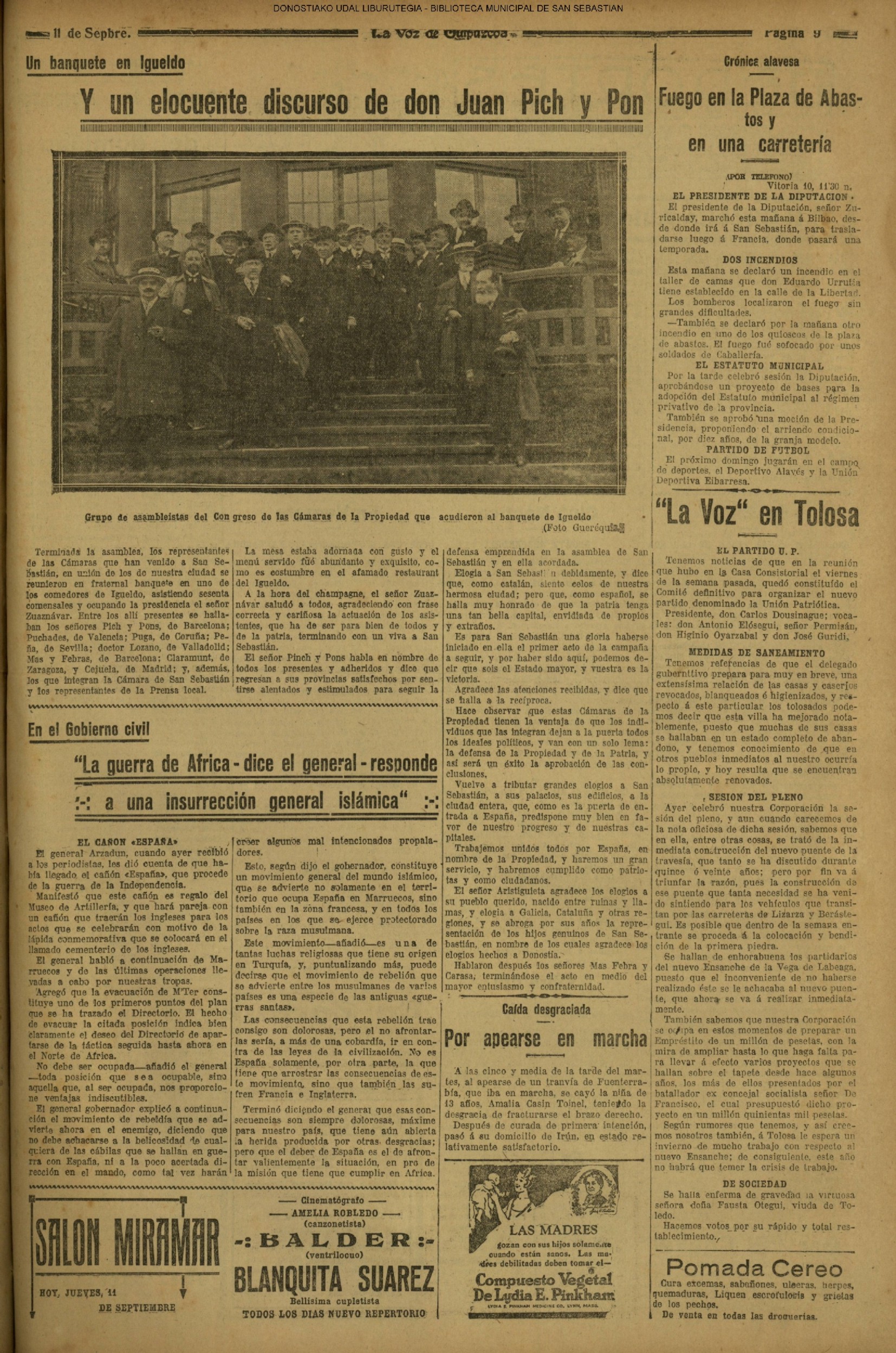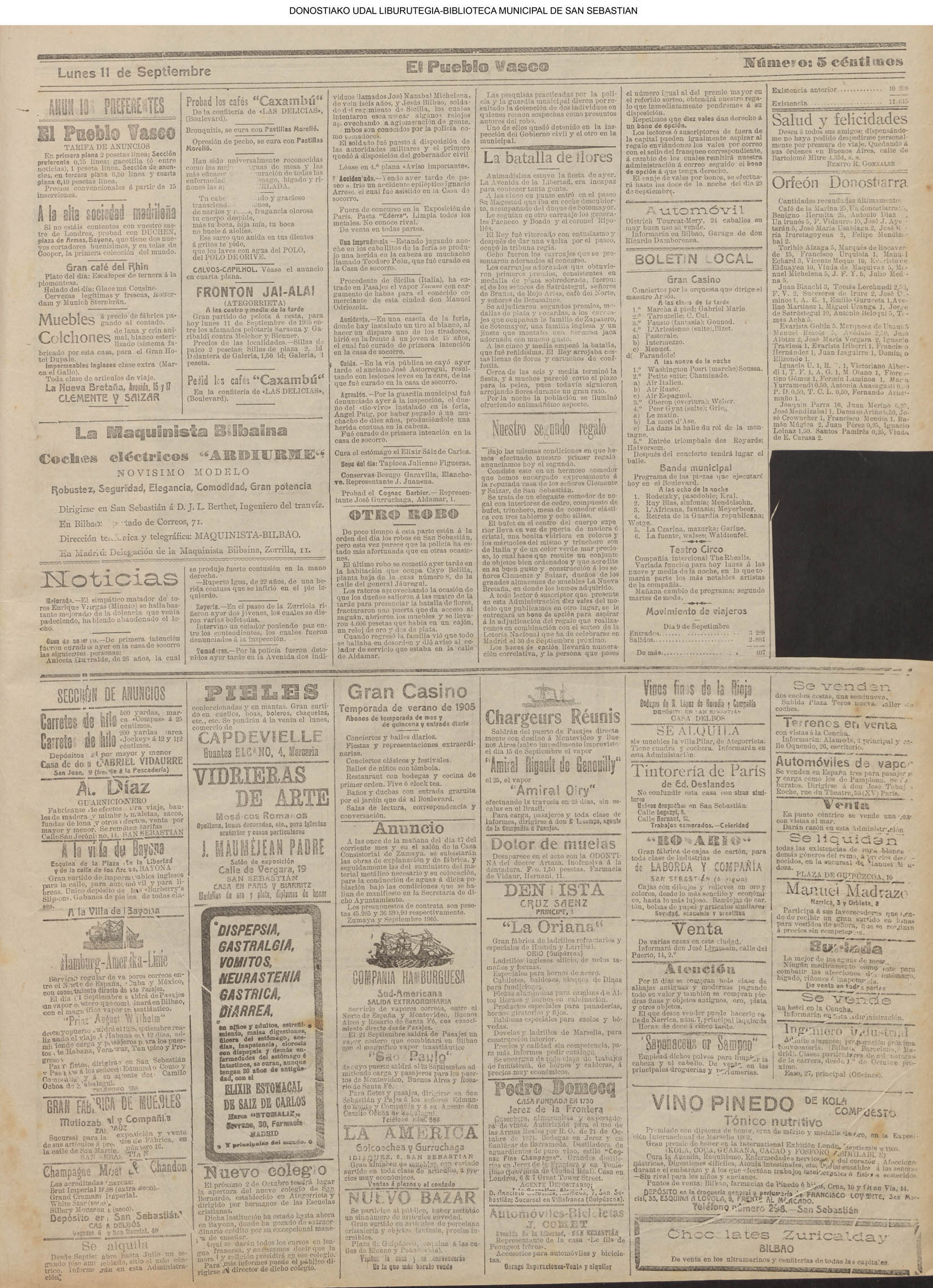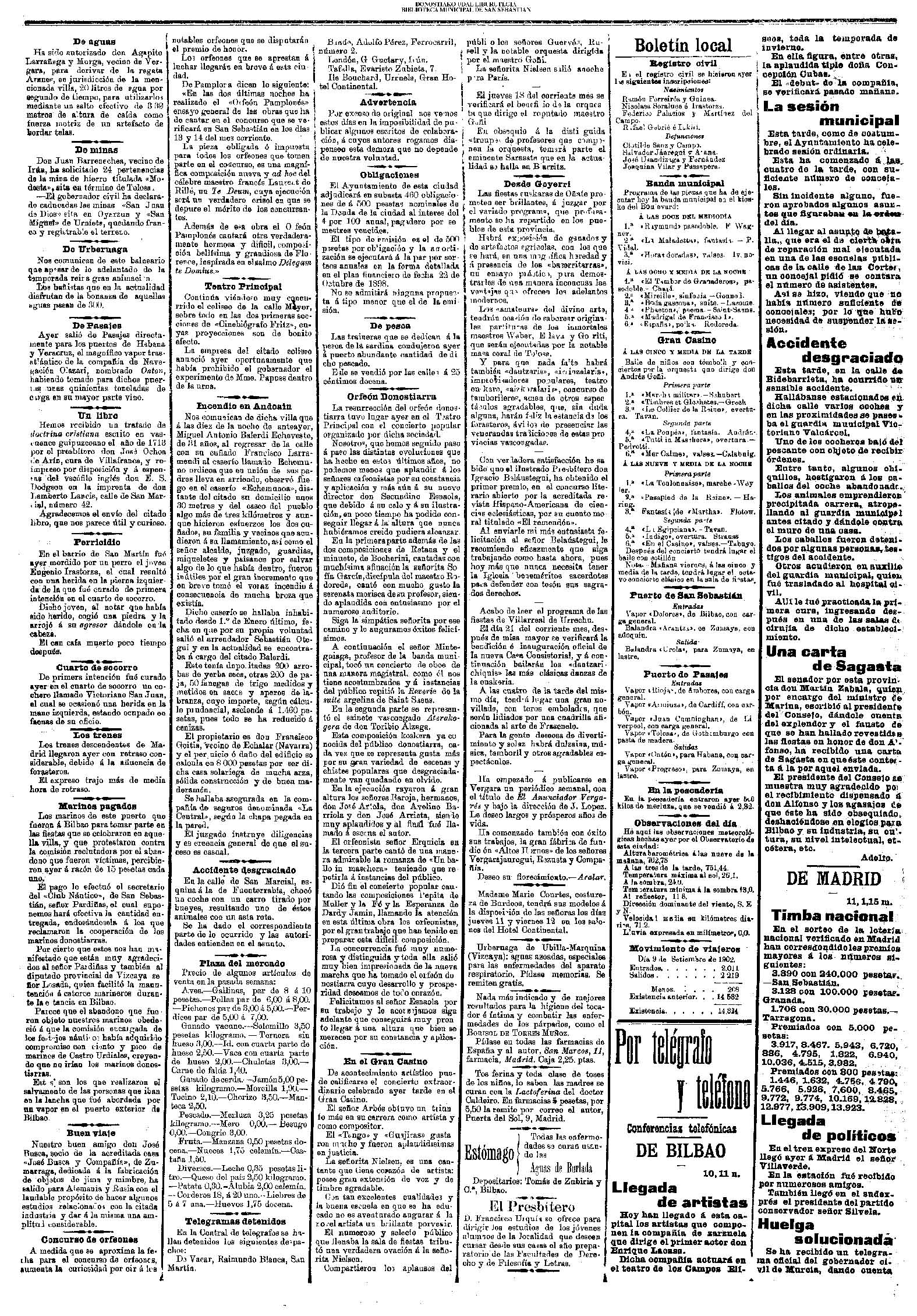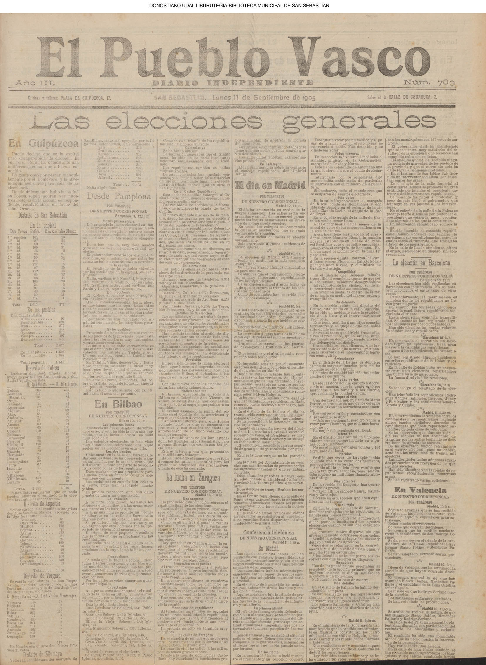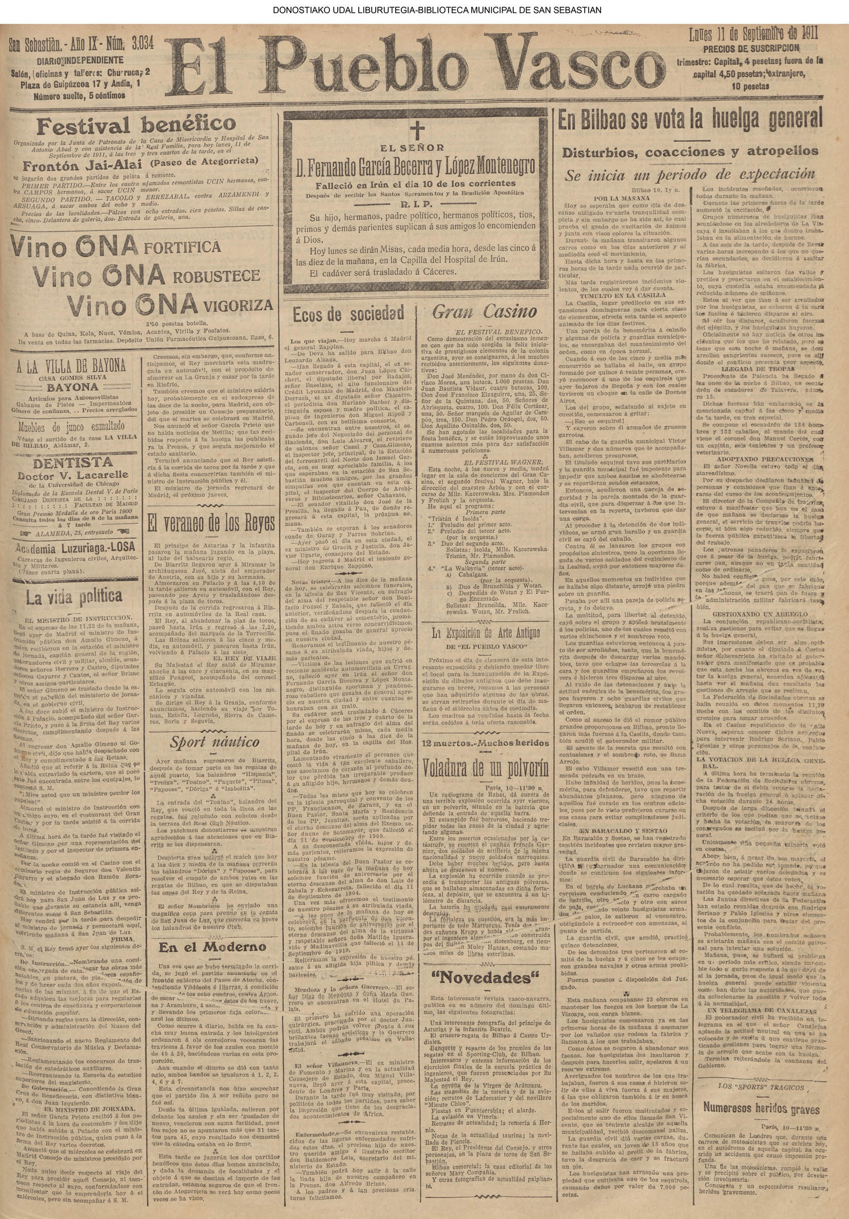 10 - septiembre![]() . | (1931) - LA VOZ DE GUIPUZCOA (CENTROS OFICIALES) (La voz de Guipuzcoa)(El Pueblo Vasco)(El Día)(La Constancia) ++++++++++++++++++++++++++++++++++++++++++++++ (1932) - LA VOZ DE GUIPUZCOA (CENTROS OFICIALES) # UN DÍA DE TRIUNFO PARA LA REPÚBLICA- El Presidente de la República, Sr. Alcalá Zamora llega a San Sebastián (La voz de Guipuzcoa/cont/cont/cont)(El Pueblo Vasco)(El Día)(La Constancia) ++++++++++++++++++++++++++++++++++++++++++++++ # EN EL PUERTO DE PASAJES, se celebró una importante asamblea para pedir la reposición o suspensión del decreto que eleva las tarifas. (La voz de Guipuzcoa)(El Pueblo Vasco)(El Día)(La Constancia) # REGATAS EN LA CONCHA # TAURINAS. CORRIDA DE LA BENEFICENCIA (La voz de Guipuzcoa)(El Pueblo Vasco)(El Día)(La Constancia) ++++++++++++++++++++++++++++++++++++++++++++++ # ATENTADO- UN CRIMEN ODIOSO.- A la noche dispararon sus pistolas unos individuos contra el ex director general de Seguridad don Manuel Andrés (La voz de Guipuzcoa/cont)(El Pueblo Vasco)(El Día)(La Constancia) ++++++++++++++++++++++++++++++++++++++++++++++ (1935) - LA VOZ DE GUIPUZCOA (CENTROS OFICIALES : La Comisión Gestora municipal, por medio de un representante, expresó su pésame a don Pío Baroja, por el fallecimiento de su madre) # ANIVERSARIO DE LA MUERTE DE MANUEL ANDRÉS - Fue conmemorado el aniversario del acontecimiento luctuoso con un solemne silencio de recuerdo y de homenaje republicano (La voz de Guipuzcoa)(El Pueblo Vasco)(El Día)(La Constancia) # EN LA CASA CONSISTORIAL . .- A cuenta de las obras de desmonte y relleno en Amara entablose nuevo debate en la reunión que celebró la Gestora, acordándose que el informe quede para más amplio estudio. (La voz de Guipuzcoa)(El Pueblo Vasco)(El Día)(La Constancia) |