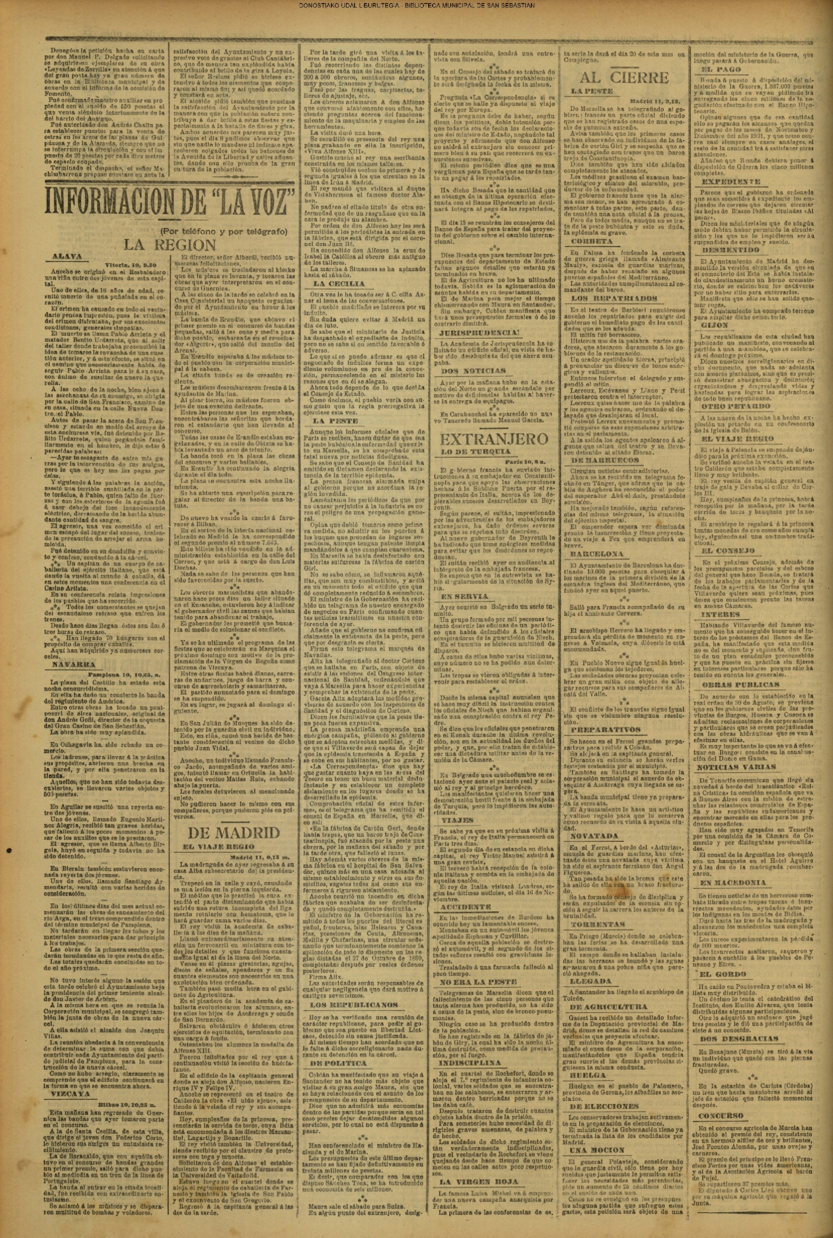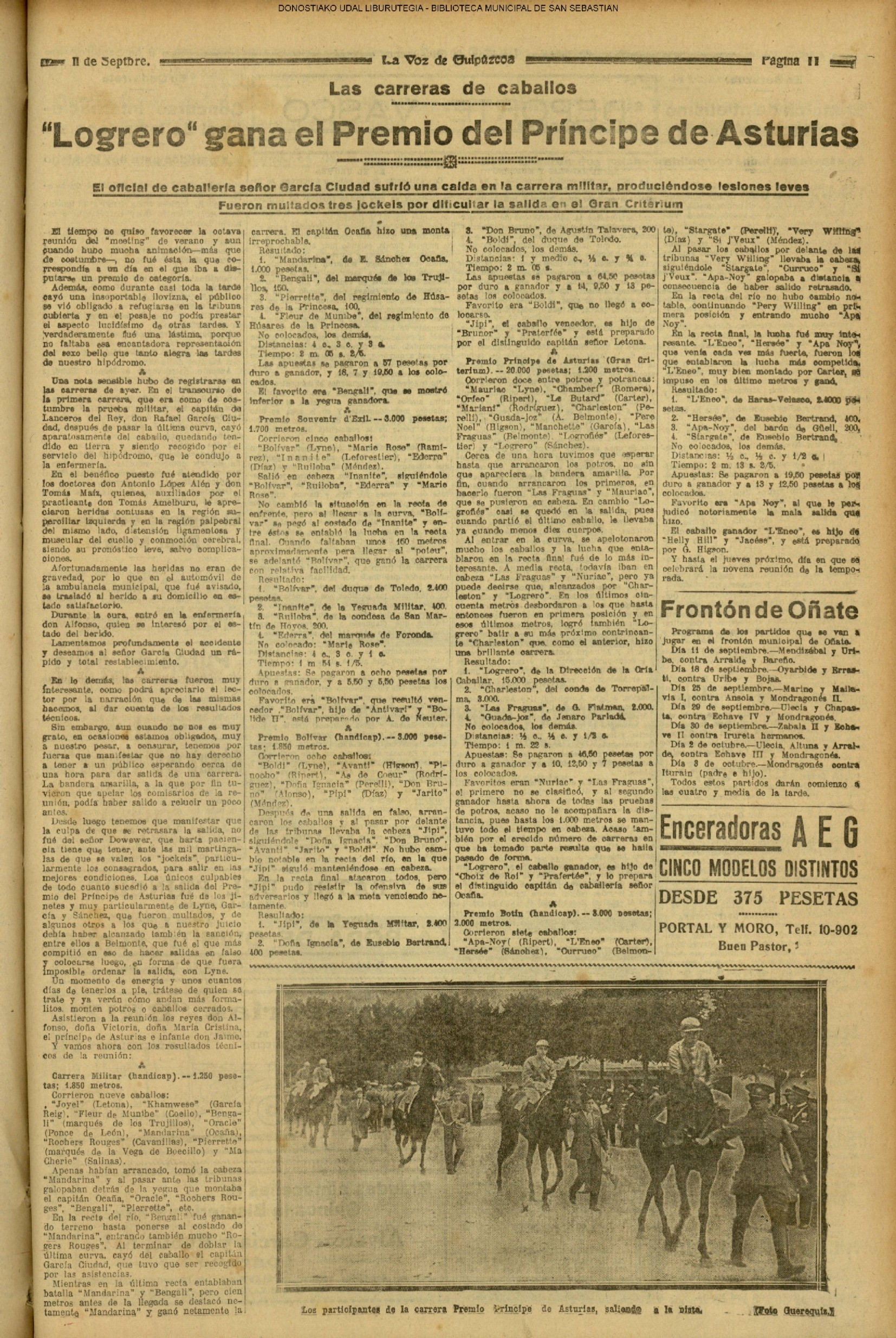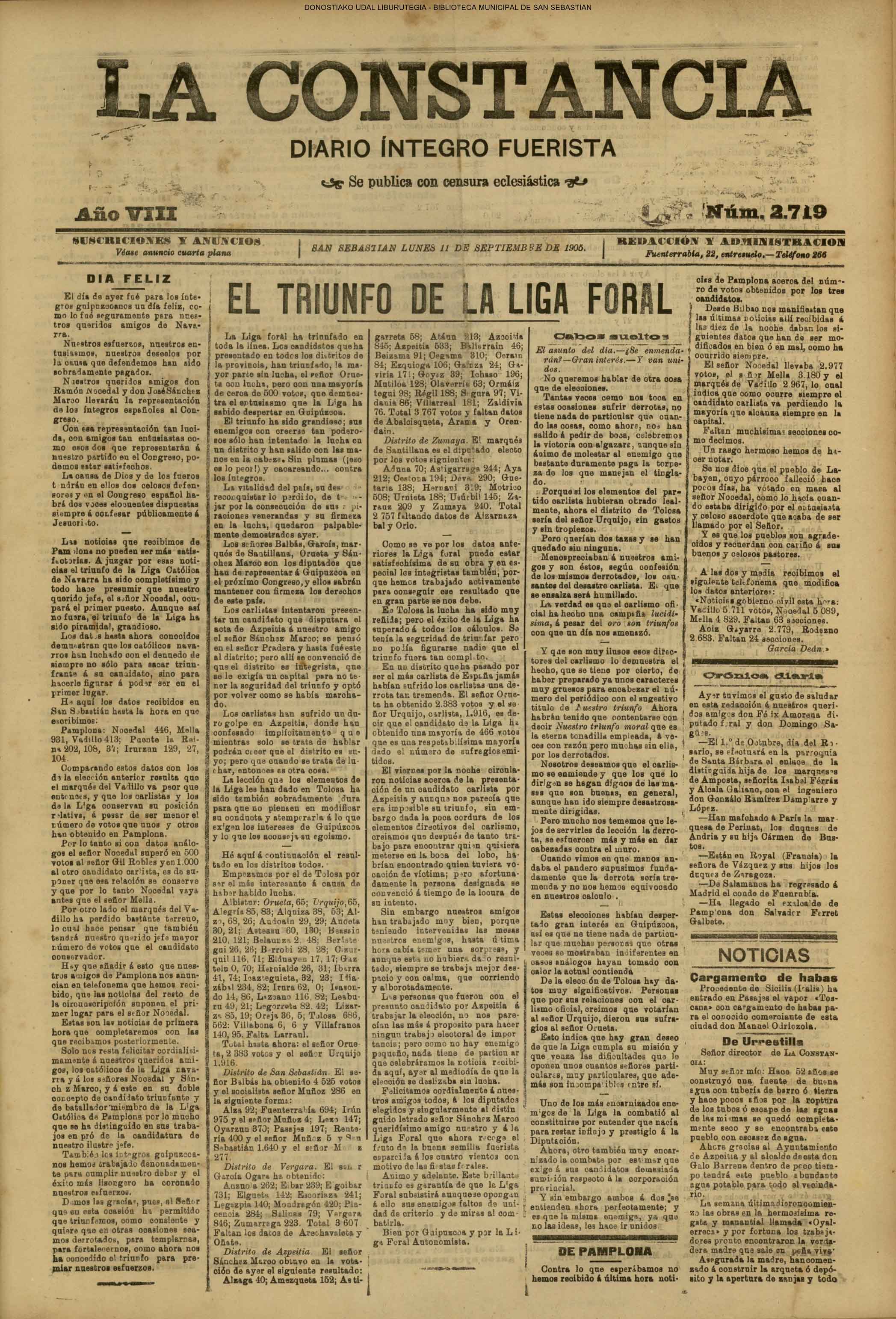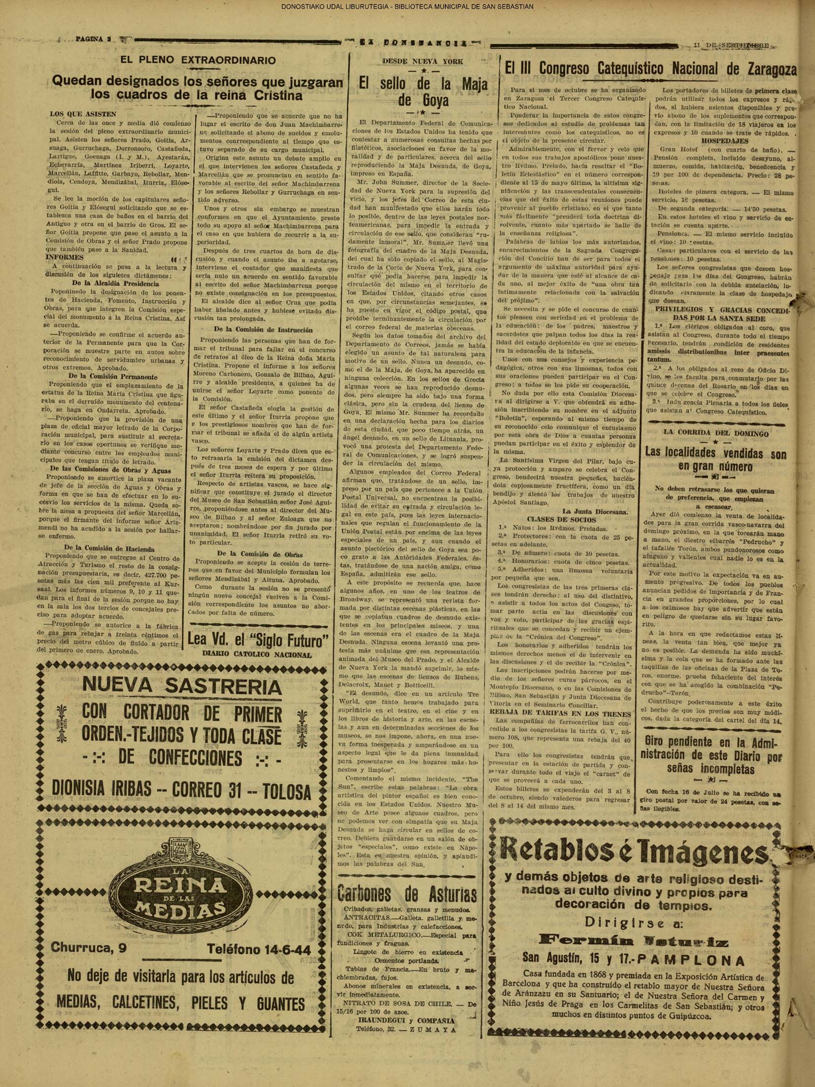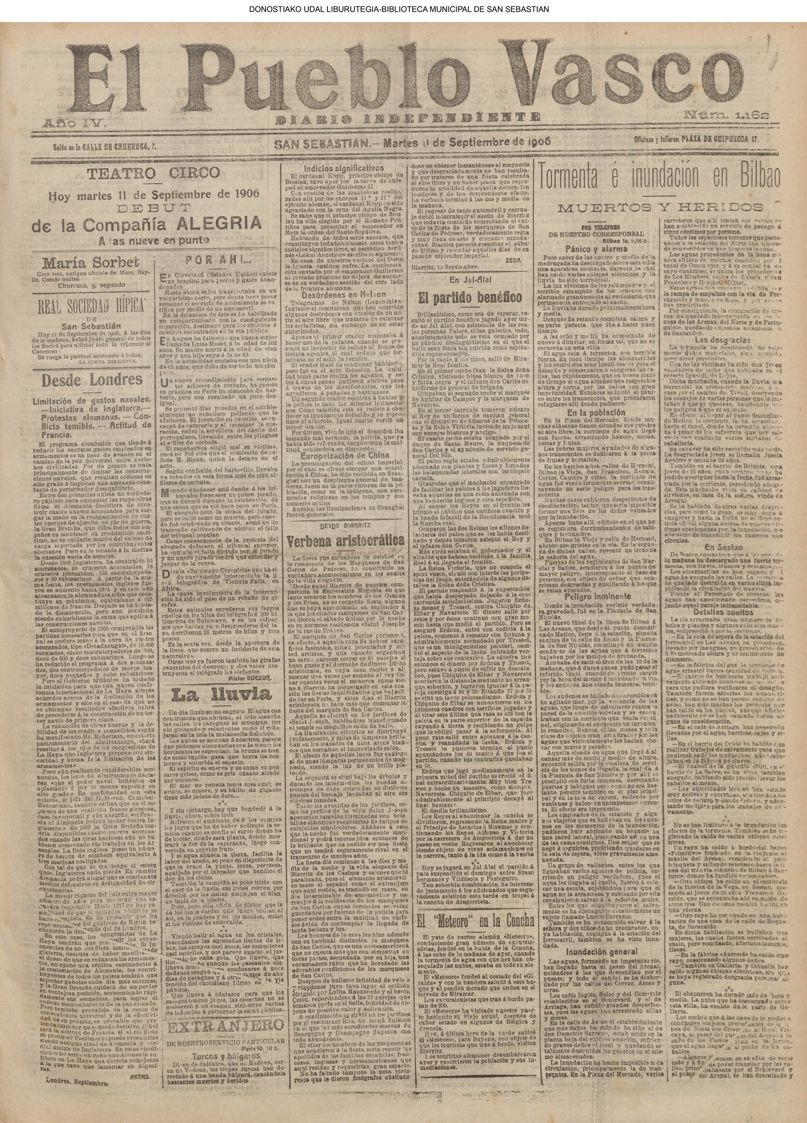 10 - septiembre![]() . | (1931) - LA VOZ DE GUIPUZCOA (CENTROS OFICIALES) (La voz de Guipuzcoa)(El Pueblo Vasco)(El Día)(La Constancia) ++++++++++++++++++++++++++++++++++++++++++++++ (1932) - LA VOZ DE GUIPUZCOA (CENTROS OFICIALES) # UN DÍA DE TRIUNFO PARA LA REPÚBLICA- El Presidente de la República, Sr. Alcalá Zamora llega a San Sebastián (La voz de Guipuzcoa/cont/cont/cont)(El Pueblo Vasco)(El Día)(La Constancia) ++++++++++++++++++++++++++++++++++++++++++++++ # EN EL PUERTO DE PASAJES, se celebró una importante asamblea para pedir la reposición o suspensión del decreto que eleva las tarifas. (La voz de Guipuzcoa)(El Pueblo Vasco)(El Día)(La Constancia) # REGATAS EN LA CONCHA # TAURINAS. CORRIDA DE LA BENEFICENCIA (La voz de Guipuzcoa)(El Pueblo Vasco)(El Día)(La Constancia) ++++++++++++++++++++++++++++++++++++++++++++++ # ATENTADO- UN CRIMEN ODIOSO.- A la noche dispararon sus pistolas unos individuos contra el ex director general de Seguridad don Manuel Andrés (La voz de Guipuzcoa/cont)(El Pueblo Vasco)(El Día)(La Constancia) ++++++++++++++++++++++++++++++++++++++++++++++ (1935) - LA VOZ DE GUIPUZCOA (CENTROS OFICIALES : La Comisión Gestora municipal, por medio de un representante, expresó su pésame a don Pío Baroja, por el fallecimiento de su madre) # ANIVERSARIO DE LA MUERTE DE MANUEL ANDRÉS - Fue conmemorado el aniversario del acontecimiento luctuoso con un solemne silencio de recuerdo y de homenaje republicano (La voz de Guipuzcoa)(El Pueblo Vasco)(El Día)(La Constancia) # EN LA CASA CONSISTORIAL . .- A cuenta de las obras de desmonte y relleno en Amara entablose nuevo debate en la reunión que celebró la Gestora, acordándose que el informe quede para más amplio estudio. (La voz de Guipuzcoa)(El Pueblo Vasco)(El Día)(La Constancia) |