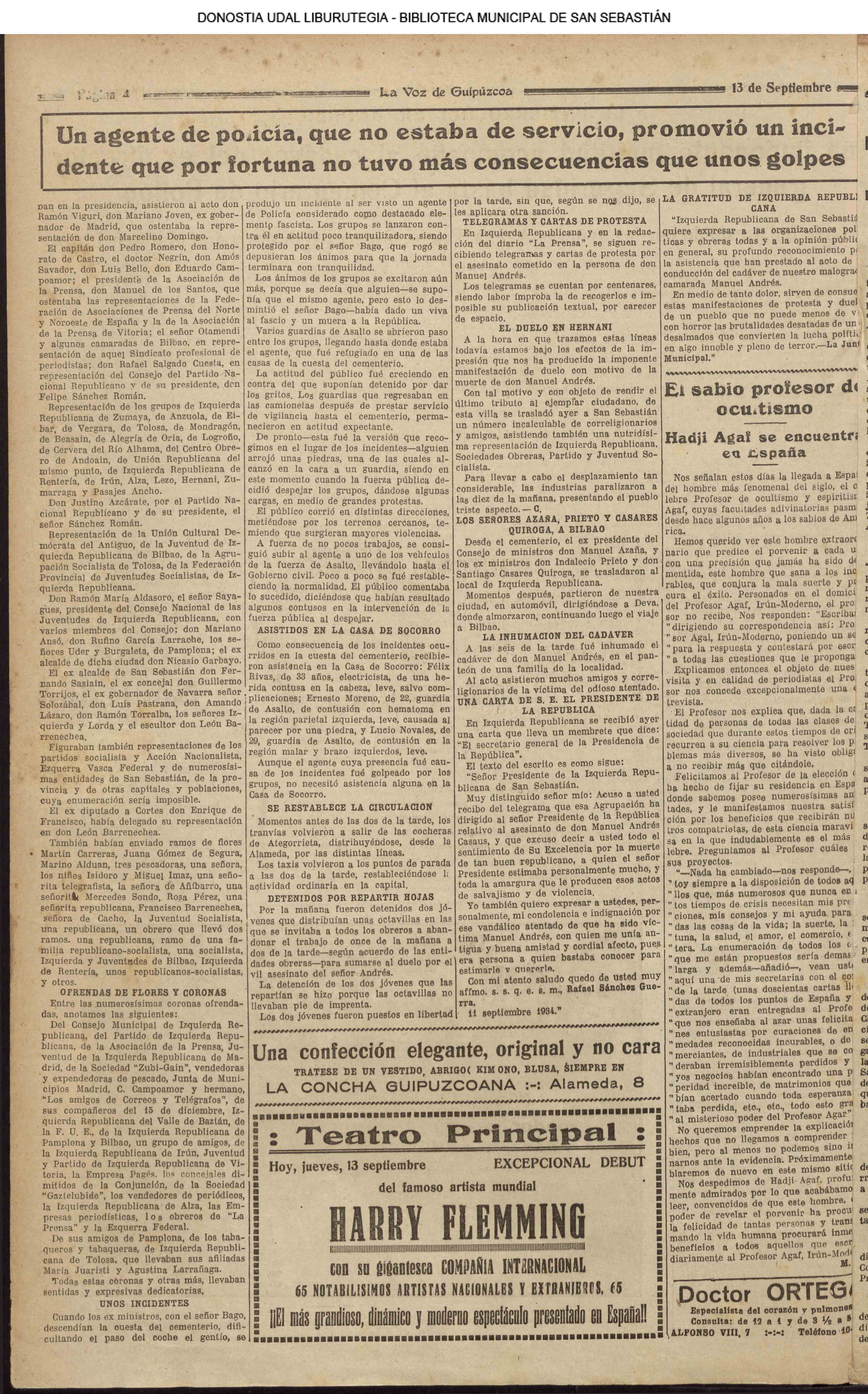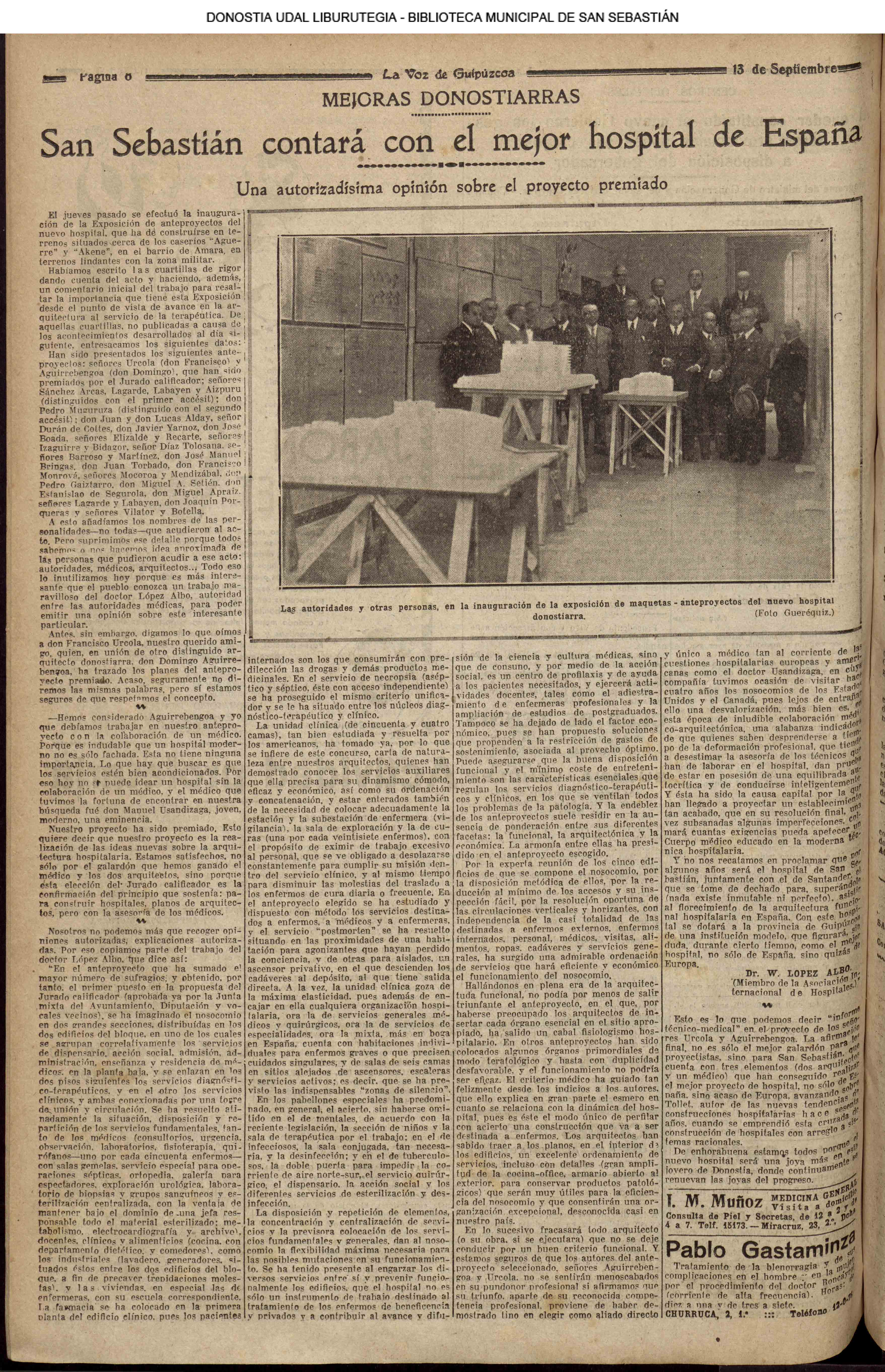 (La Voz de Guipúzcoa)(El Pueblo Vasco)(El Día)(La Constancia) # MEJORAS DONOSTIARRAS - San Sebastián contará con el mejor hospital de España. (La voz de Guipuzcoa)(El Pueblo Vasco)(El Día)(La Constancia) ++++++++++++++++++++++++++++++++++++++++++++++ # EL ENTIERRO DEL SEÑOR ANDRÉS .- Una imponente multitud acompañó al cadáver del ex director general de Seguridad hasta el Cementerio de Polloe.- El duelo fue presidido por los señores Azaña, Prieto, Casares Quiroga y don Mariano Joven.