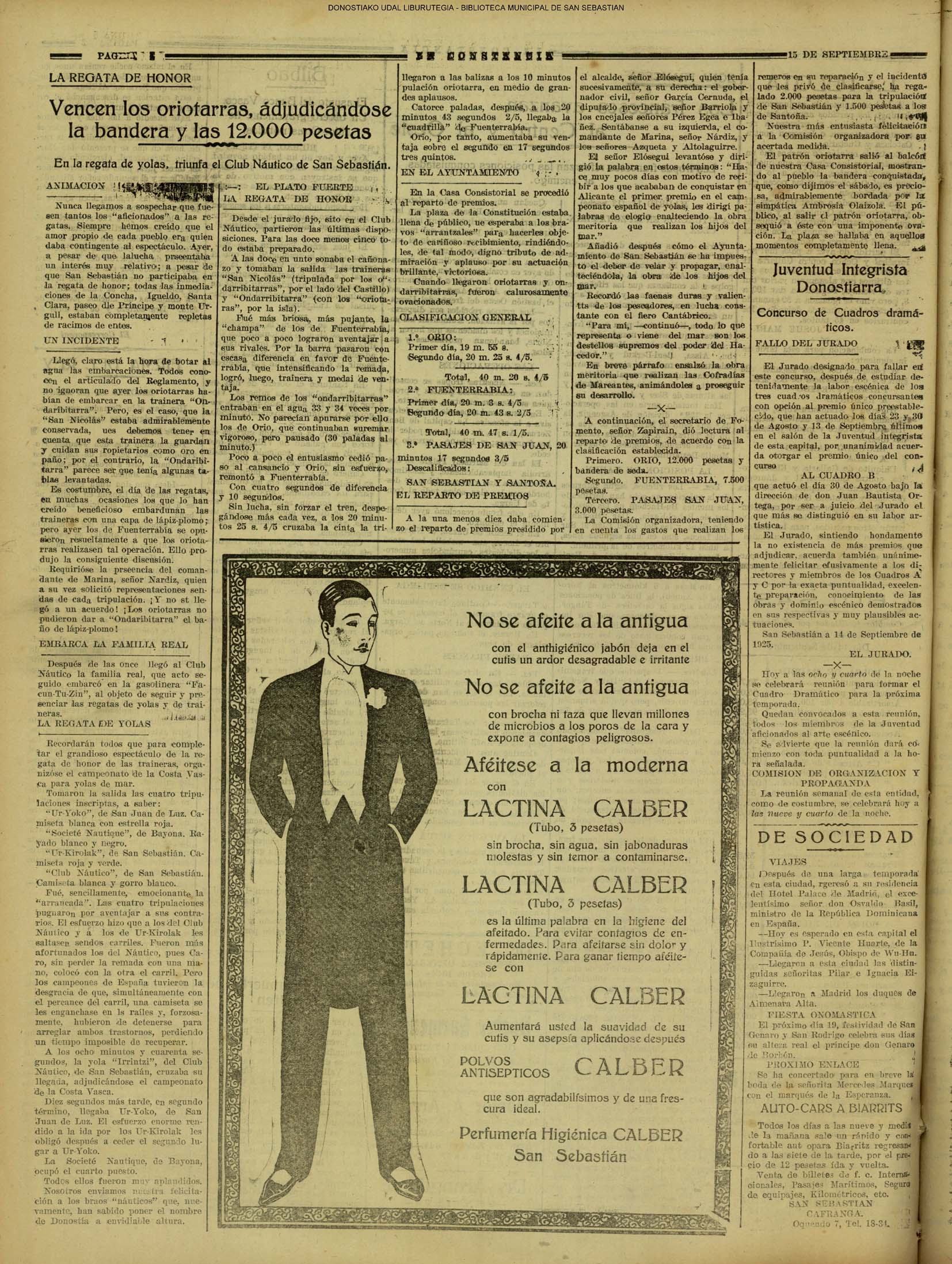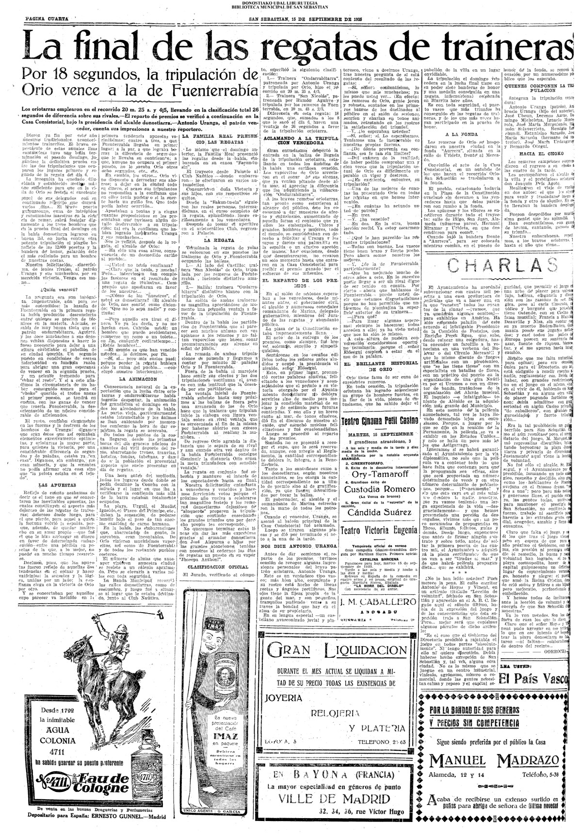 @ -Se celebra en aguas de la Concha la jornada final de las regatas de traineras. Vuelve a vencer, como el domingo anterior, Orio, que de este modo gana la Bandera de Honor, seguido de la tripulación de Fuenterrabía.