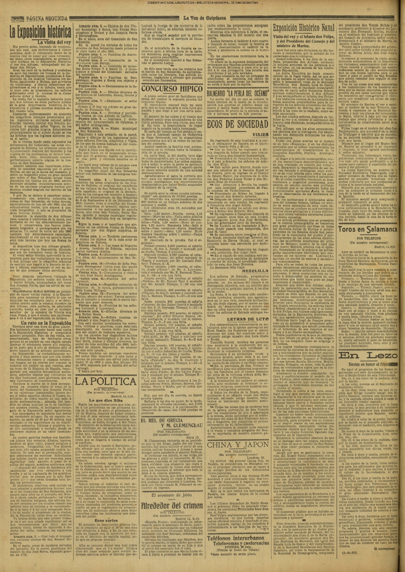 (1913) EXPOSICIÓN HISTÓRICO NAVAL - Visita del Rey y el Infante don Felipe, y del Presidente del Consejo y del Ministro de Marina (La Voz de Guipúzcoa)(El Pueblo Vasco)(El Correo del Norte)(La Constancia)