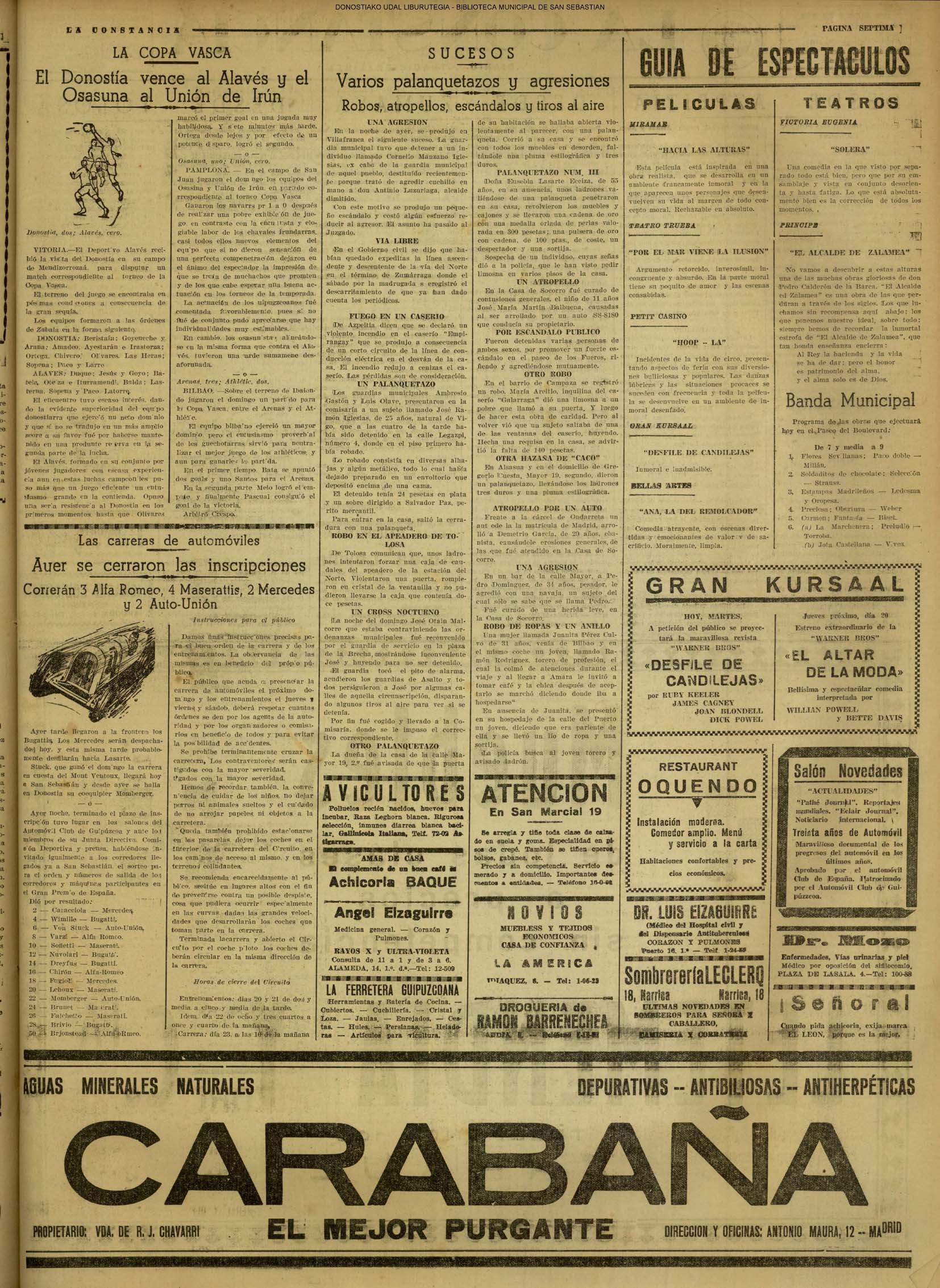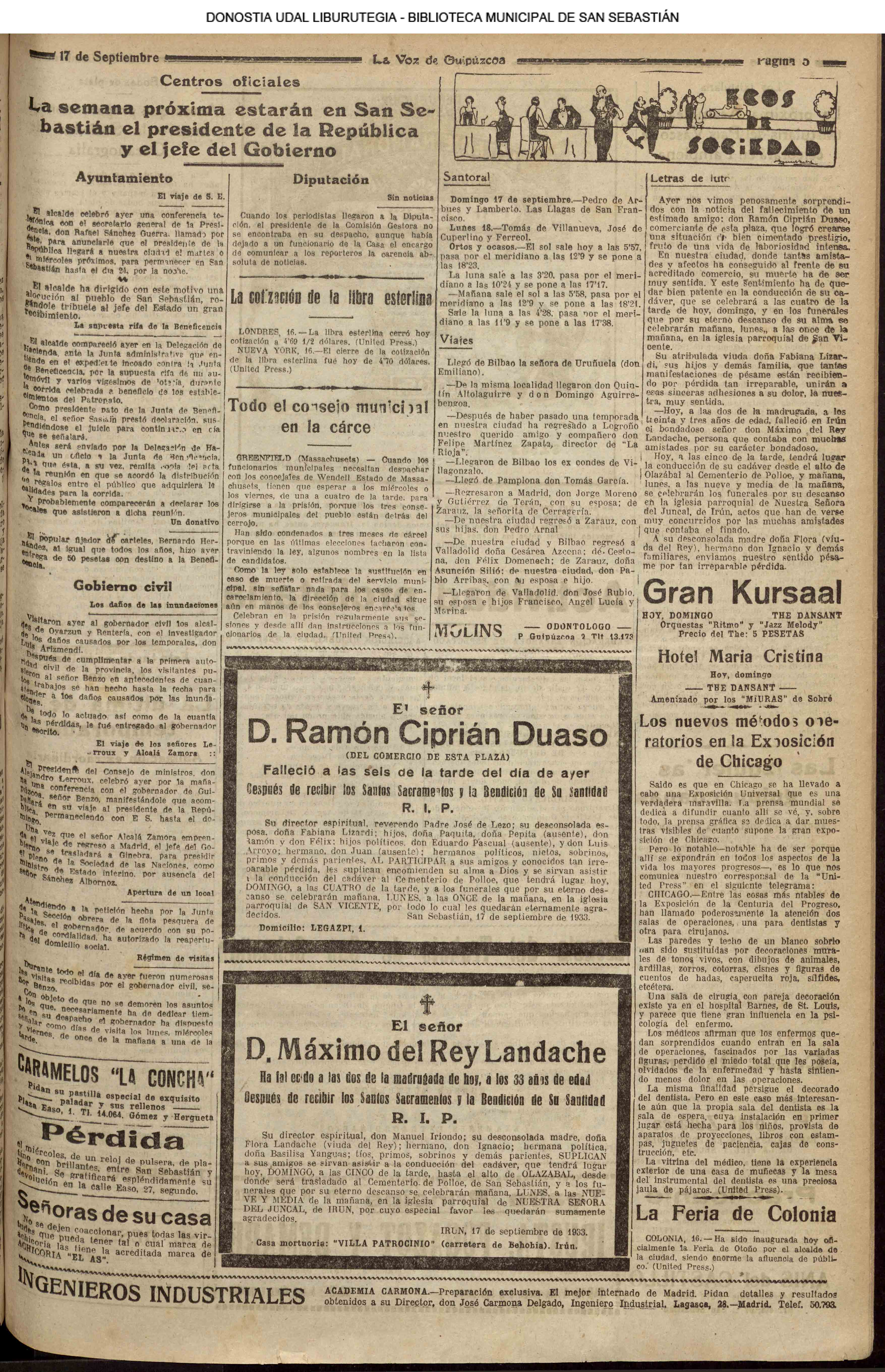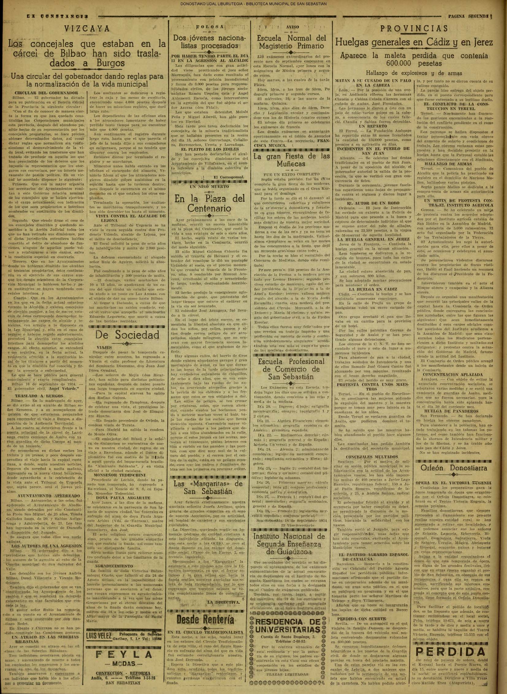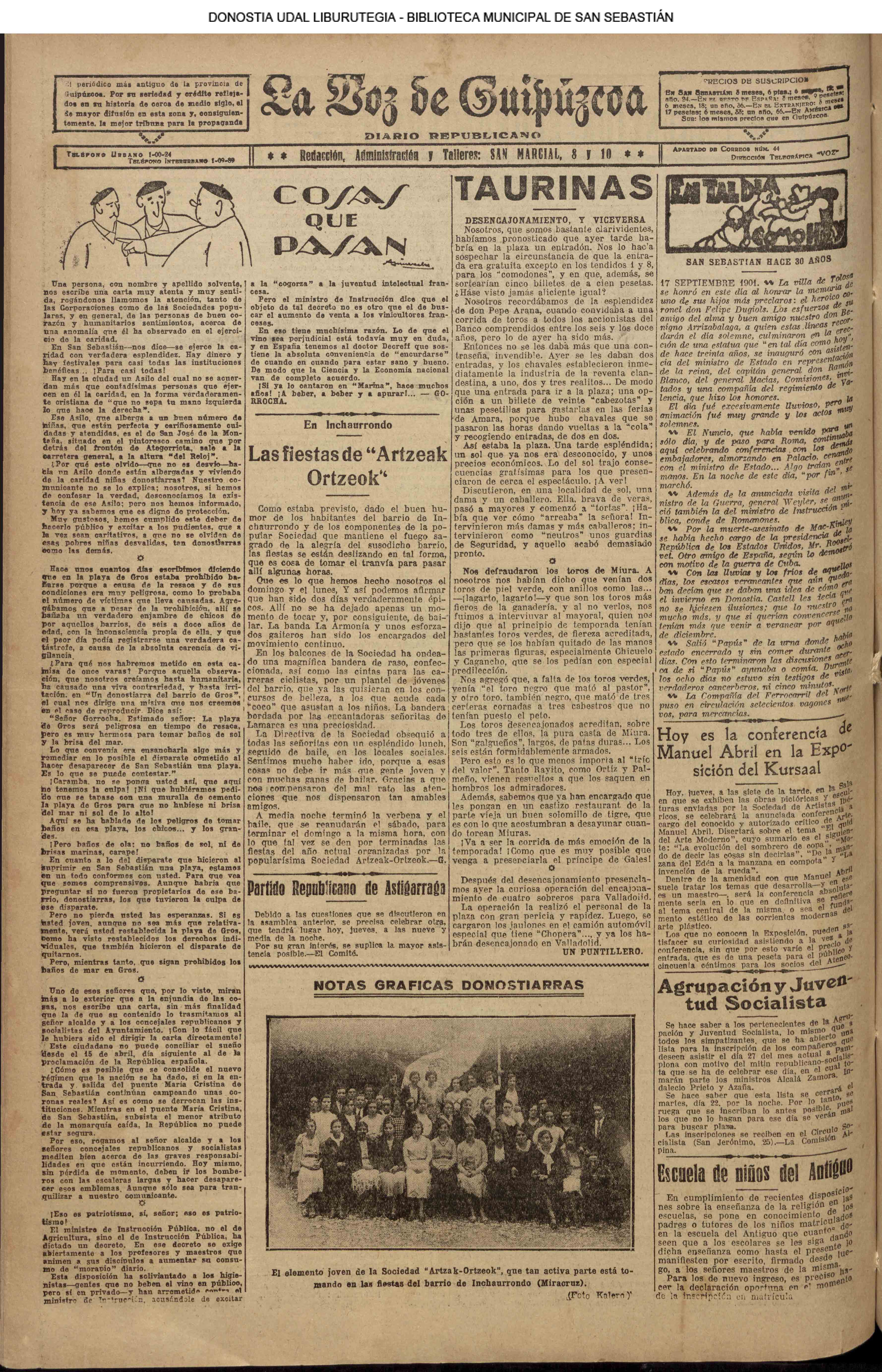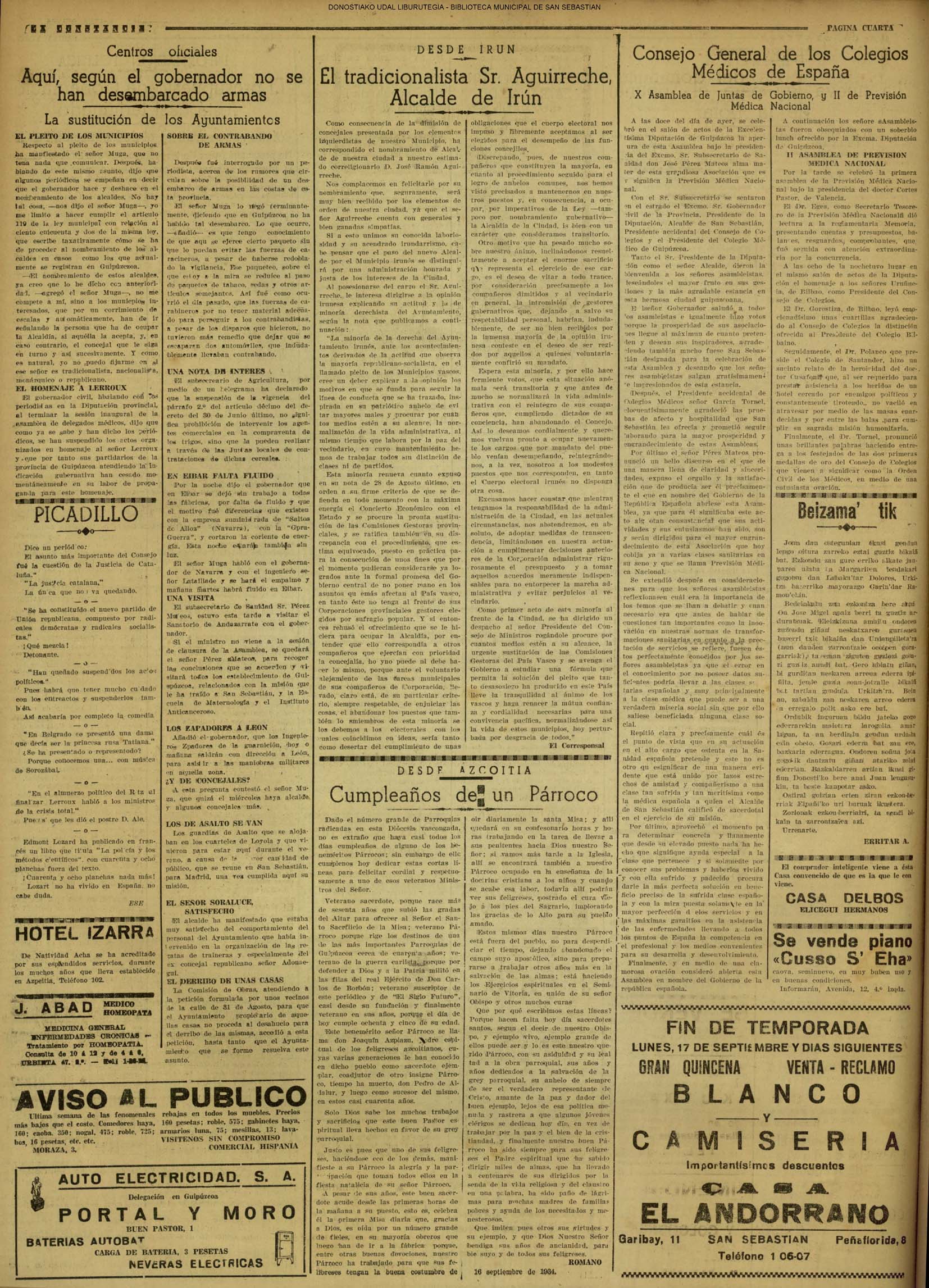 16 - septiembre![]() . | (1931) - LA VOZ DE GUIPUZCOA (CENTROS OFICIALES: Actuación gubernativa por los incidentes de la Plaza de la Constitución) # PLENO MUNICIPAL .- La represión a un guardia da lugar a un largo debate, en el que se adoptan medidas enérgicas (La voz de Guipuzcoa/cont)(El Pueblo Vasco/cont)( # V SEMANA VASCA .- La segunda eliminatoria de "aizkolaris" y la representación de la pastoral "Maitena" (La Voz de Guipúzcoa)(El Pueblo Vasco)( # FIESTAS EN INTXAURRONDO, organizadas por la Sociedad "Artzak Ortzeok" (La voz de Guipuzcoa)(El Pueblo Vasco)( ++++++++++++++++++++++++++++++++++++++++++++++ # VISITA A LOS CUARTELES DE LOYOLA DEL PRESIDENTE DE LA REPÚBLICA (La voz de Guipuzcoa)(El Pueblo Vasco)(El Día)(La Constancia) # El personal de la Fábrica de Tabacos entrega un presente al Jefe del Estado (La voz de Guipuzcoa)(El Pueblo Vasco)(El Día)(La Constancia) # La visita de S.E. el presidente de la República a la Fundación Ostolaza (Deva) (La voz de Guipuzcoa)(El Pueblo Vasco)(El Día)(La Constancia) ++++++++++++++++++++++++++++++++++++++++++++++ (La voz de Guipuzcoa)(El Pueblo Vasco)(El Día)(La Constancia) ++++++++++++++++++++++++++++++++++++++++++++++ # CONSEJO GENERAL DE COLEGIOS MÉDICOS DE ESPAÑA (La voz de Guipuzcoa)(El Pueblo Vasco)(El Día)(La Constancia) # ASAMBLEA DE MÉDICOS FERROVIARIOS (La voz de Guipuzcoa)(El Pueblo Vasco)(El Día)(La Constancia) # REGATAS DE TRAINERAS .- Orio repite su brillante triunfo y se adjudica el primer premio con la Bandera de Honor. (La voz de Guipuzcoa/cont)( (La voz de Guipuzcoa)( # FUTBOL - ALAVÉS (0-2) DONOSTIA @ (La voz de Guipuzcoa)# FIESTA DE LAS MUÑECAS, EN EL KURSAAL (La voz de Guipuzcoa) ++++++++++++++++++++++++++++++++++++++++++++++ (La voz de Guipuzcoa)(El Pueblo Vasco)(El Día)(La Constancia) |