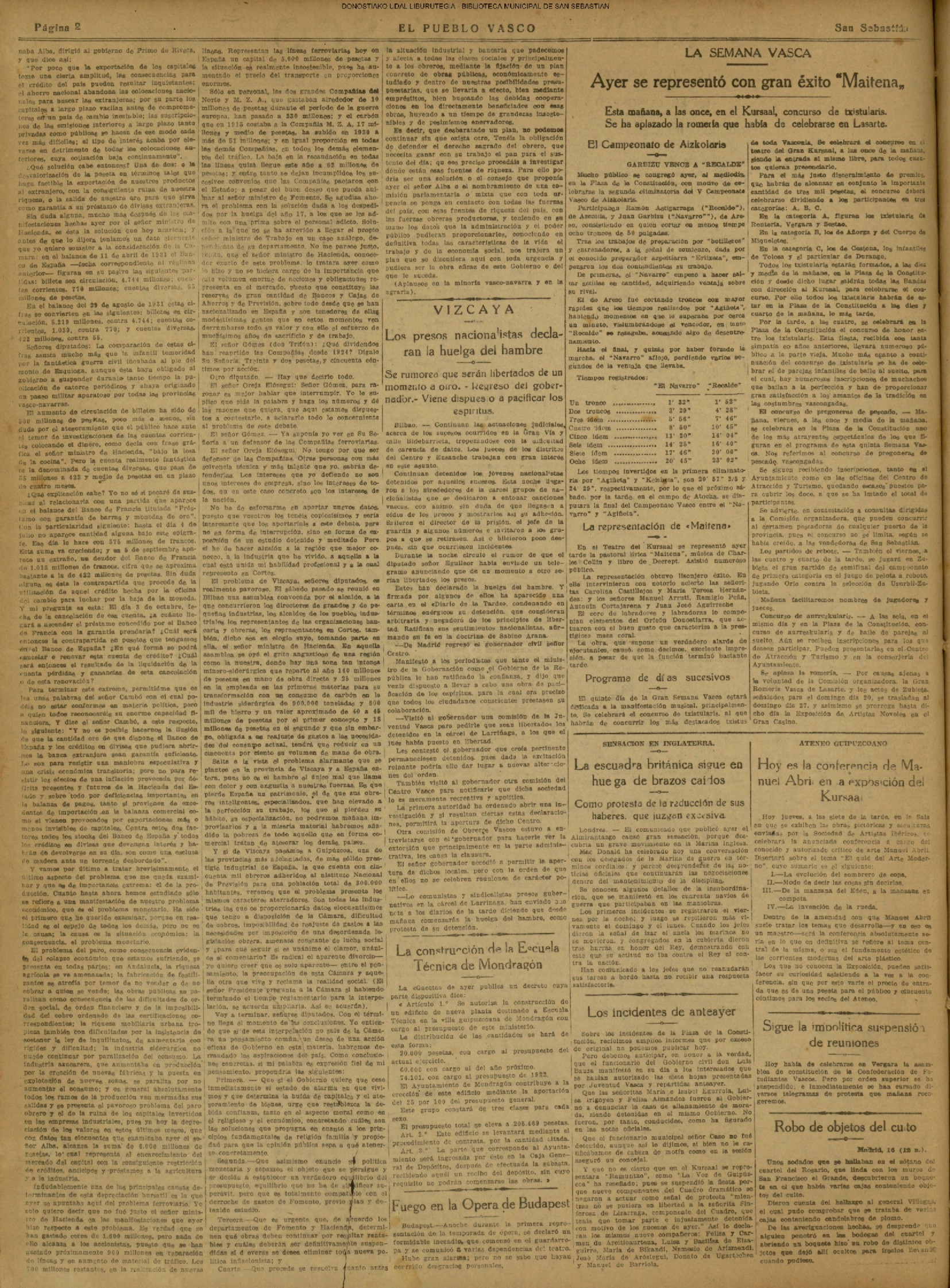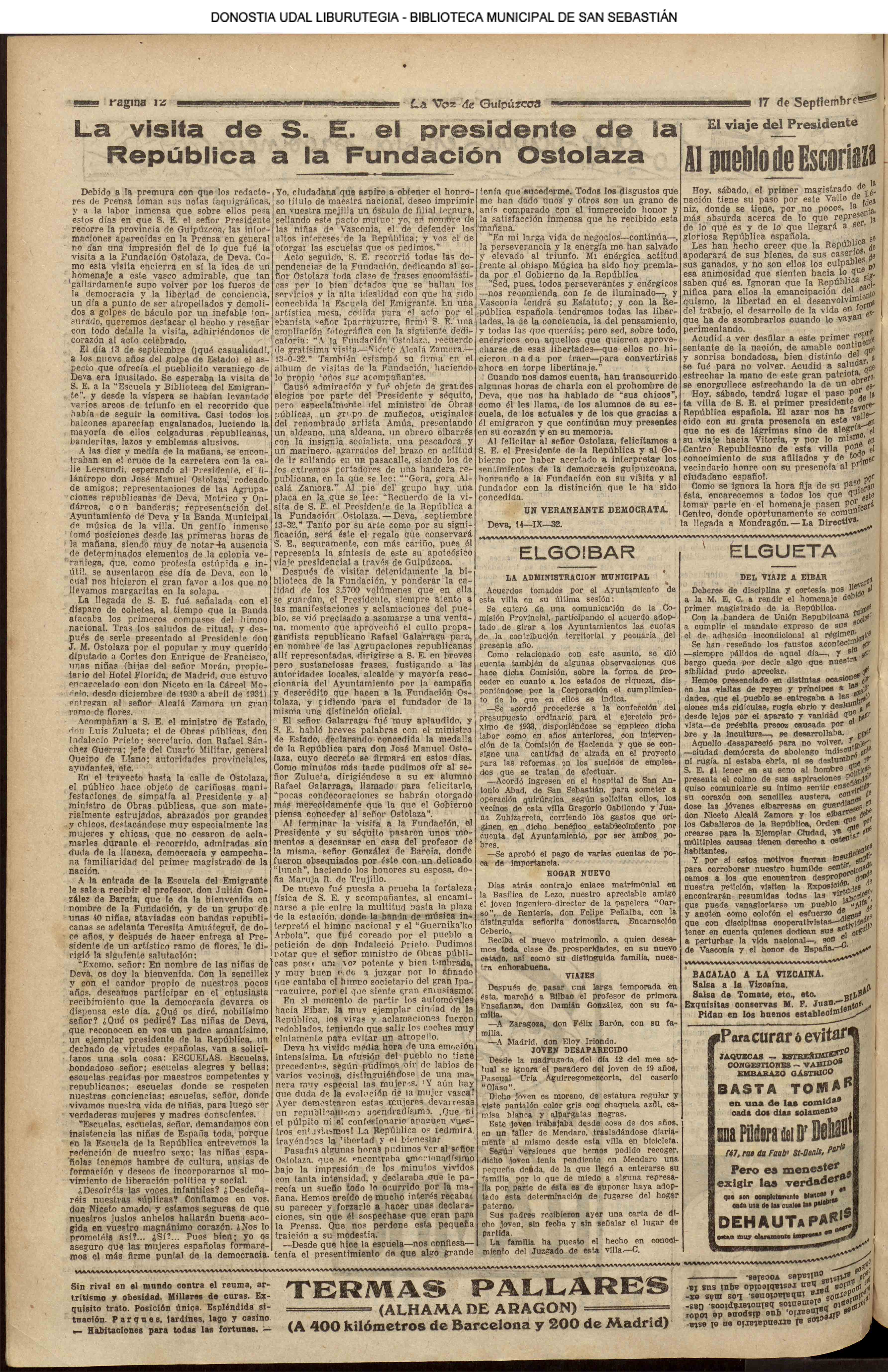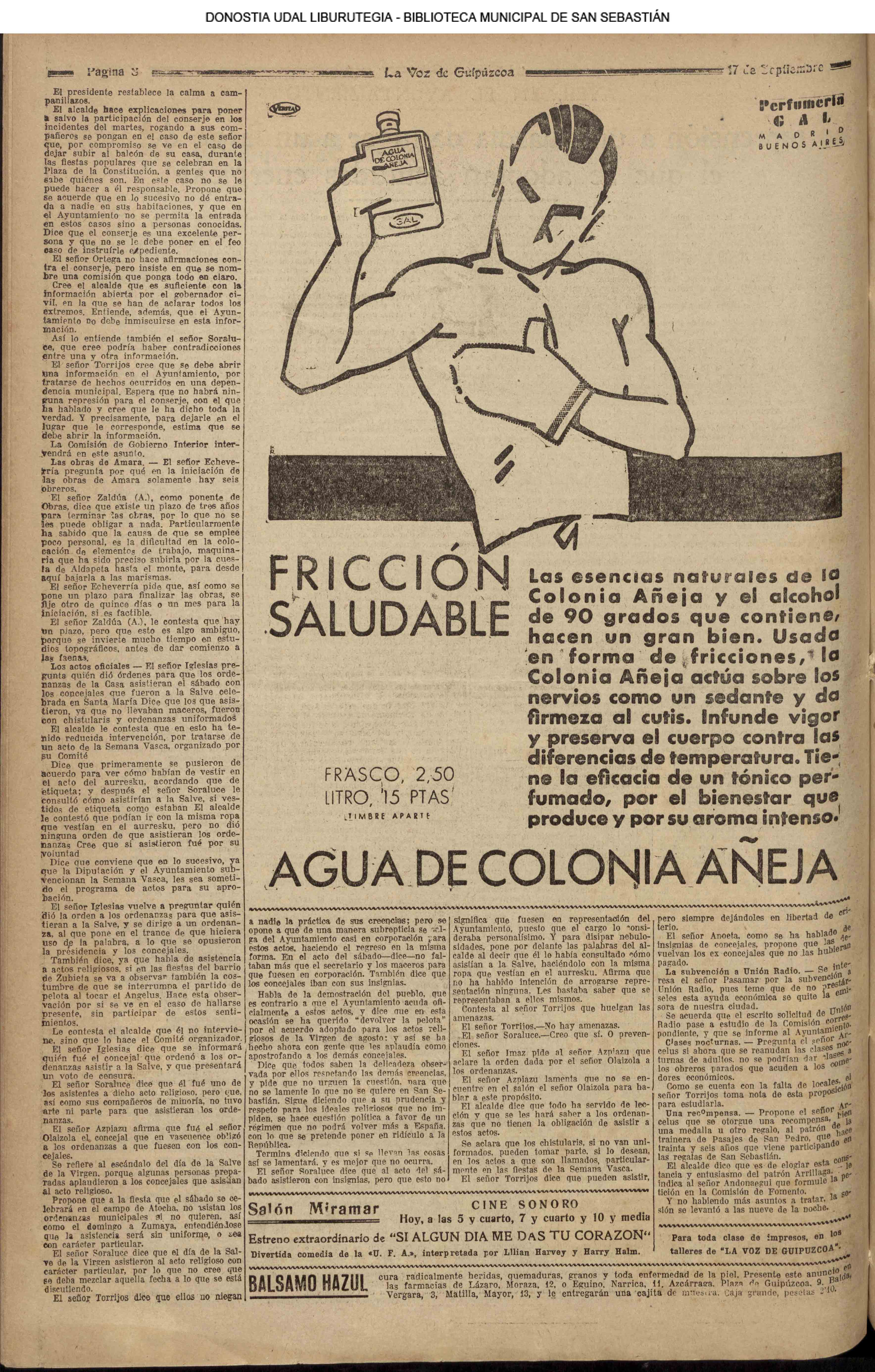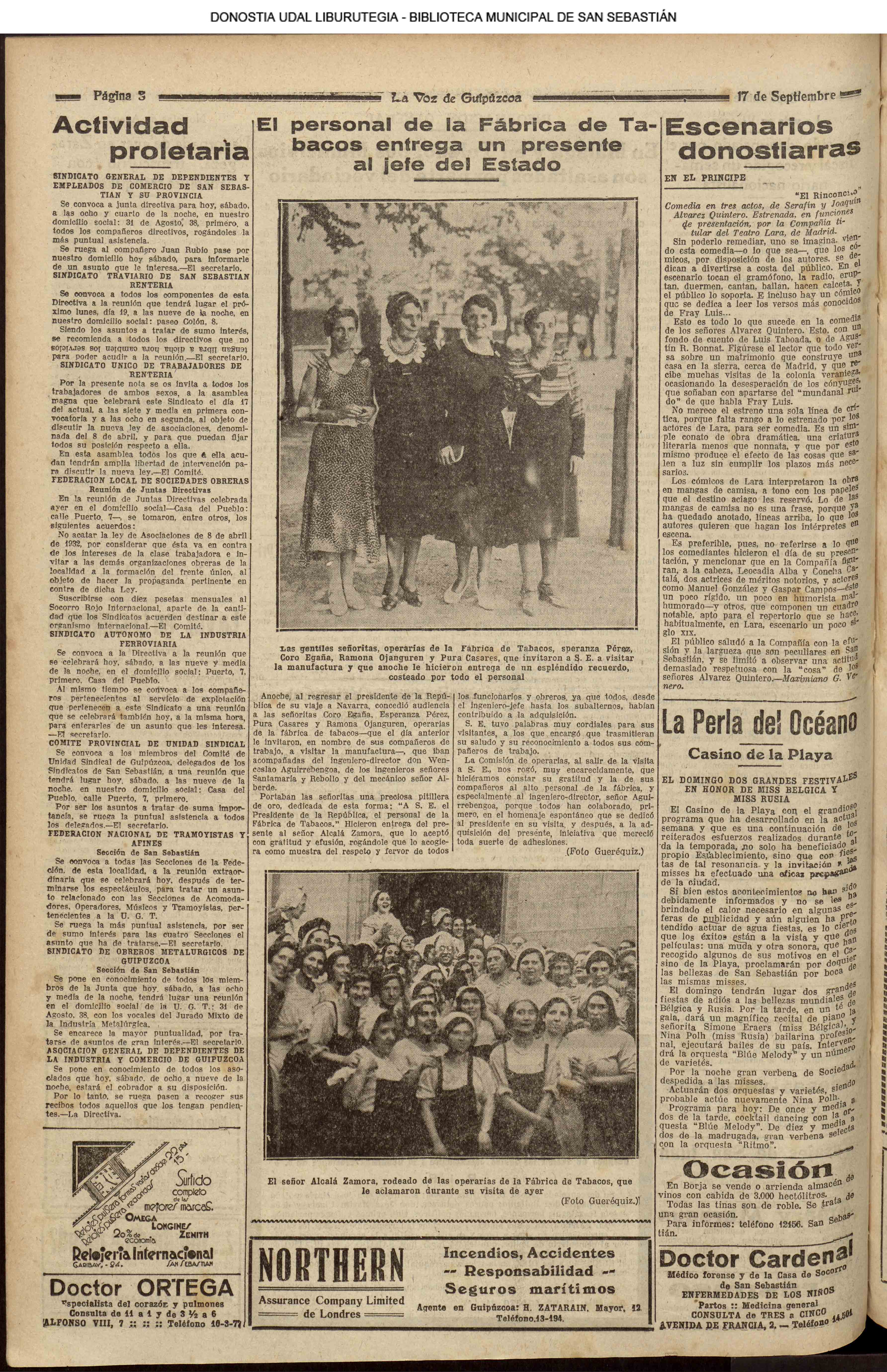 16 - septiembre![]() . | (1931) - LA VOZ DE GUIPUZCOA (CENTROS OFICIALES: Actuación gubernativa por los incidentes de la Plaza de la Constitución) # PLENO MUNICIPAL .- La represión a un guardia da lugar a un largo debate, en el que se adoptan medidas enérgicas (La voz de Guipuzcoa/cont)(El Pueblo Vasco/cont)( # V SEMANA VASCA .- La segunda eliminatoria de "aizkolaris" y la representación de la pastoral "Maitena" (La Voz de Guipúzcoa)(El Pueblo Vasco)( # FIESTAS EN INTXAURRONDO, organizadas por la Sociedad "Artzak Ortzeok" (La voz de Guipuzcoa)(El Pueblo Vasco)( ++++++++++++++++++++++++++++++++++++++++++++++ # VISITA A LOS CUARTELES DE LOYOLA DEL PRESIDENTE DE LA REPÚBLICA (La voz de Guipuzcoa)(El Pueblo Vasco)(El Día)(La Constancia) # El personal de la Fábrica de Tabacos entrega un presente al Jefe del Estado (La voz de Guipuzcoa)(El Pueblo Vasco)(El Día)(La Constancia) # La visita de S.E. el presidente de la República a la Fundación Ostolaza (Deva) (La voz de Guipuzcoa)(El Pueblo Vasco)(El Día)(La Constancia) ++++++++++++++++++++++++++++++++++++++++++++++ (La voz de Guipuzcoa)(El Pueblo Vasco)(El Día)(La Constancia) ++++++++++++++++++++++++++++++++++++++++++++++ # CONSEJO GENERAL DE COLEGIOS MÉDICOS DE ESPAÑA (La voz de Guipuzcoa)(El Pueblo Vasco)(El Día)(La Constancia) # ASAMBLEA DE MÉDICOS FERROVIARIOS (La voz de Guipuzcoa)(El Pueblo Vasco)(El Día)(La Constancia) # REGATAS DE TRAINERAS .- Orio repite su brillante triunfo y se adjudica el primer premio con la Bandera de Honor. (La voz de Guipuzcoa/cont)( (La voz de Guipuzcoa)( # FUTBOL - ALAVÉS (0-2) DONOSTIA @ (La voz de Guipuzcoa)# FIESTA DE LAS MUÑECAS, EN EL KURSAAL (La voz de Guipuzcoa) ++++++++++++++++++++++++++++++++++++++++++++++ (La voz de Guipuzcoa)(El Pueblo Vasco)(El Día)(La Constancia) |