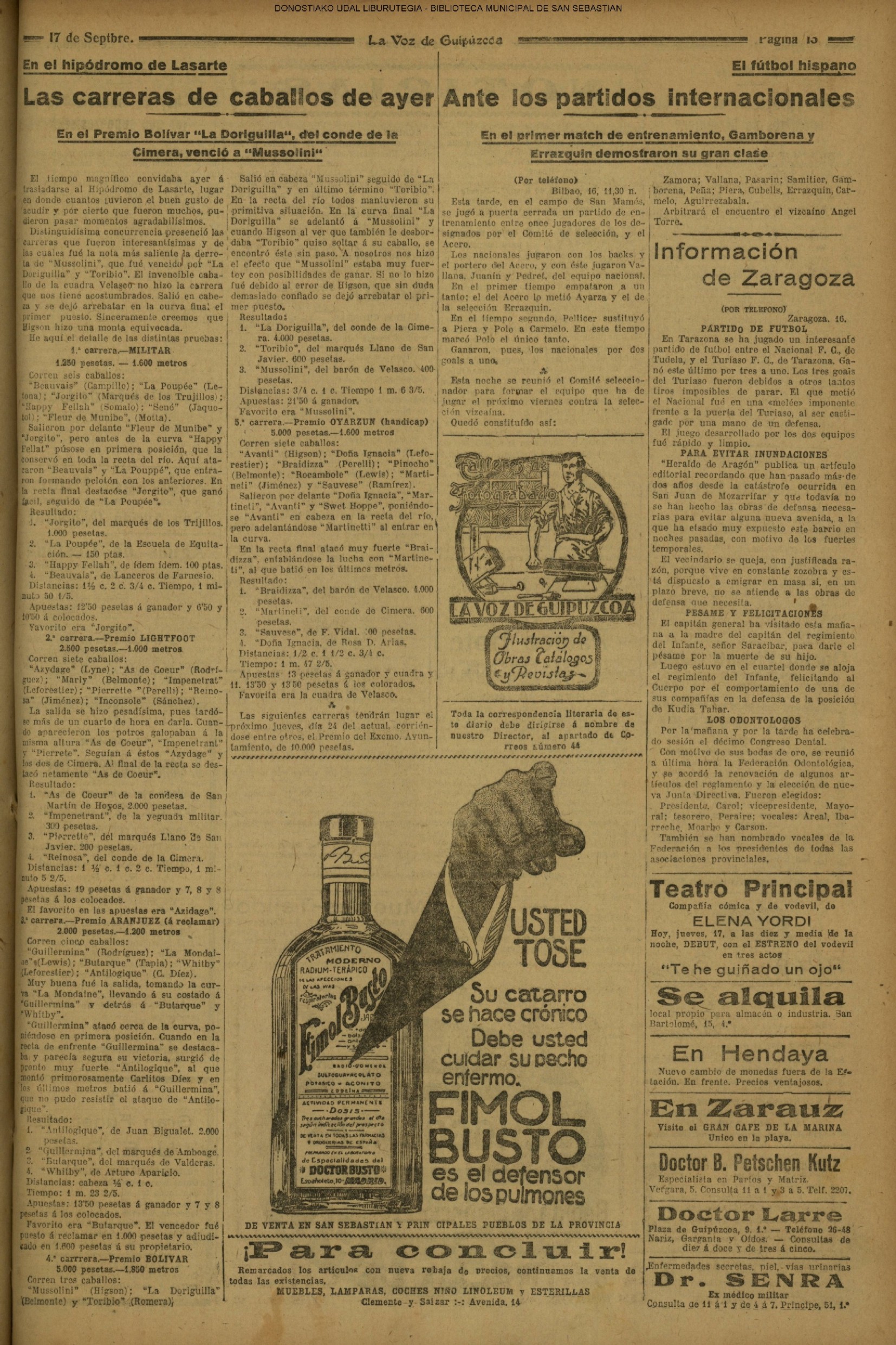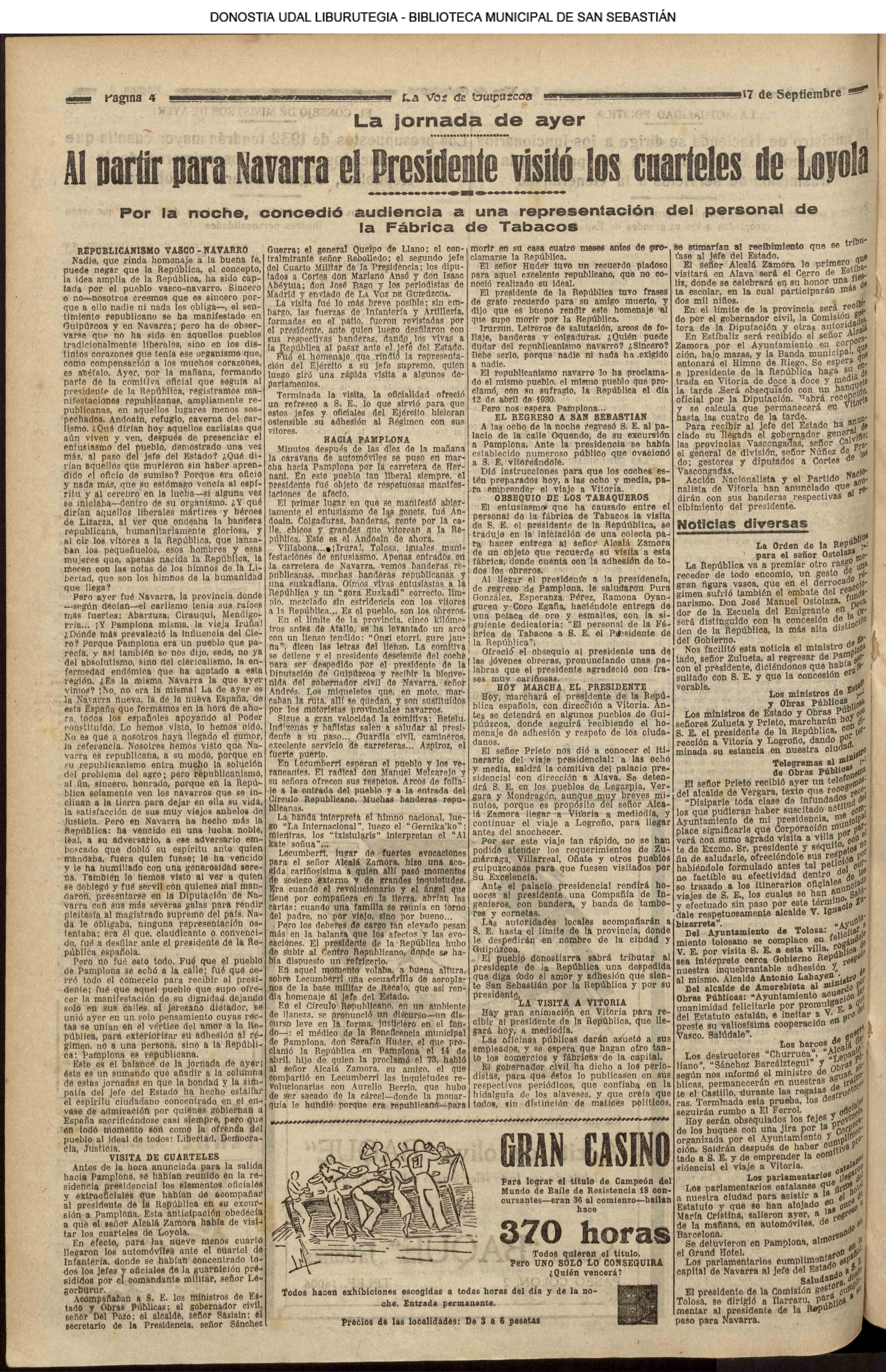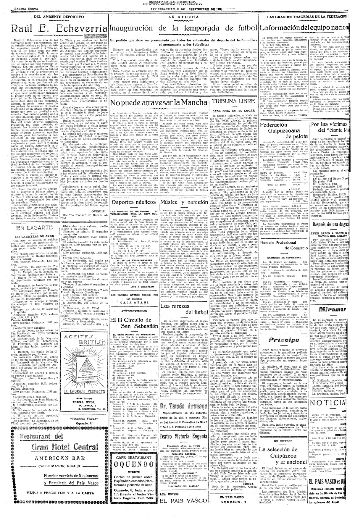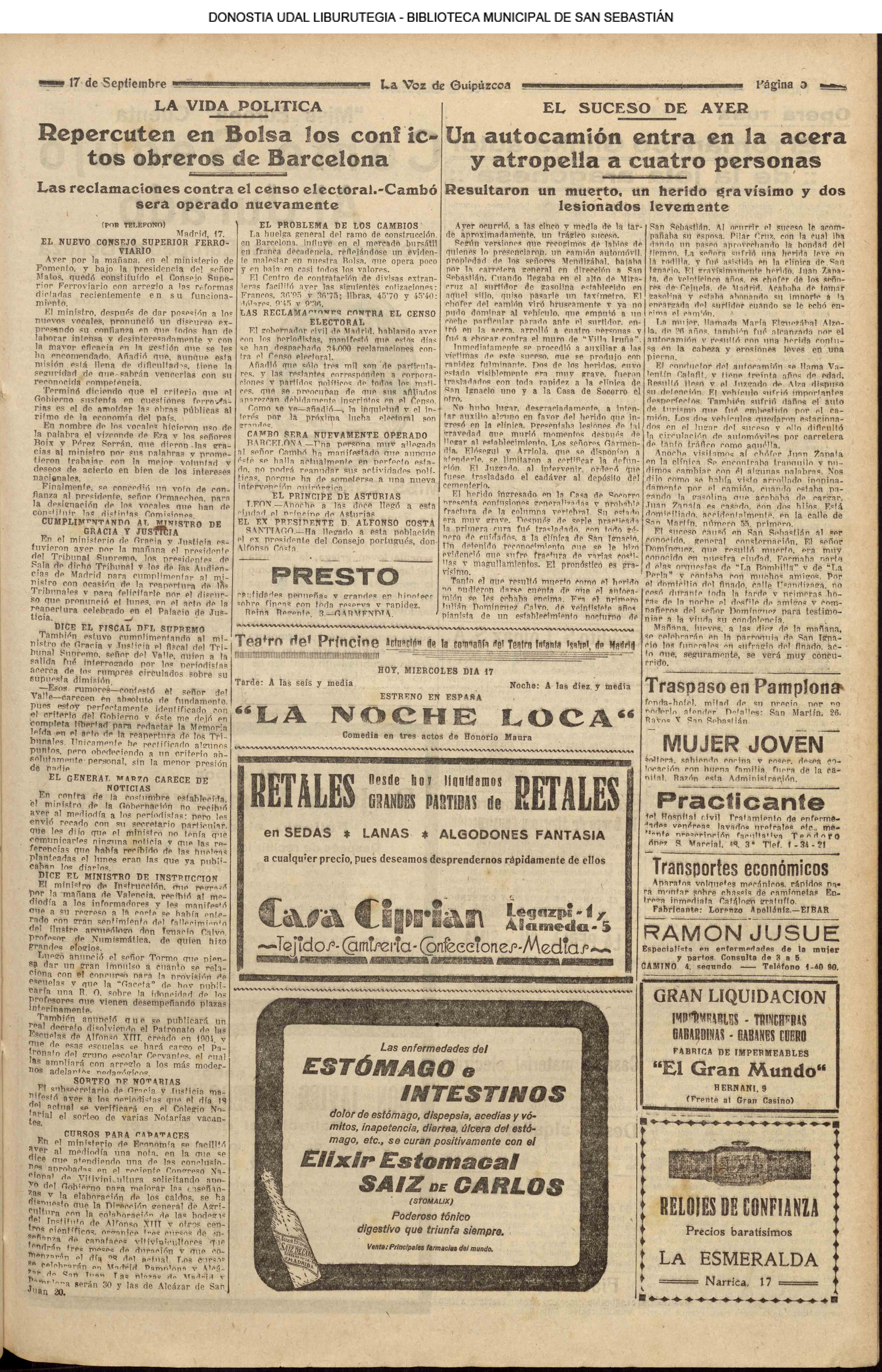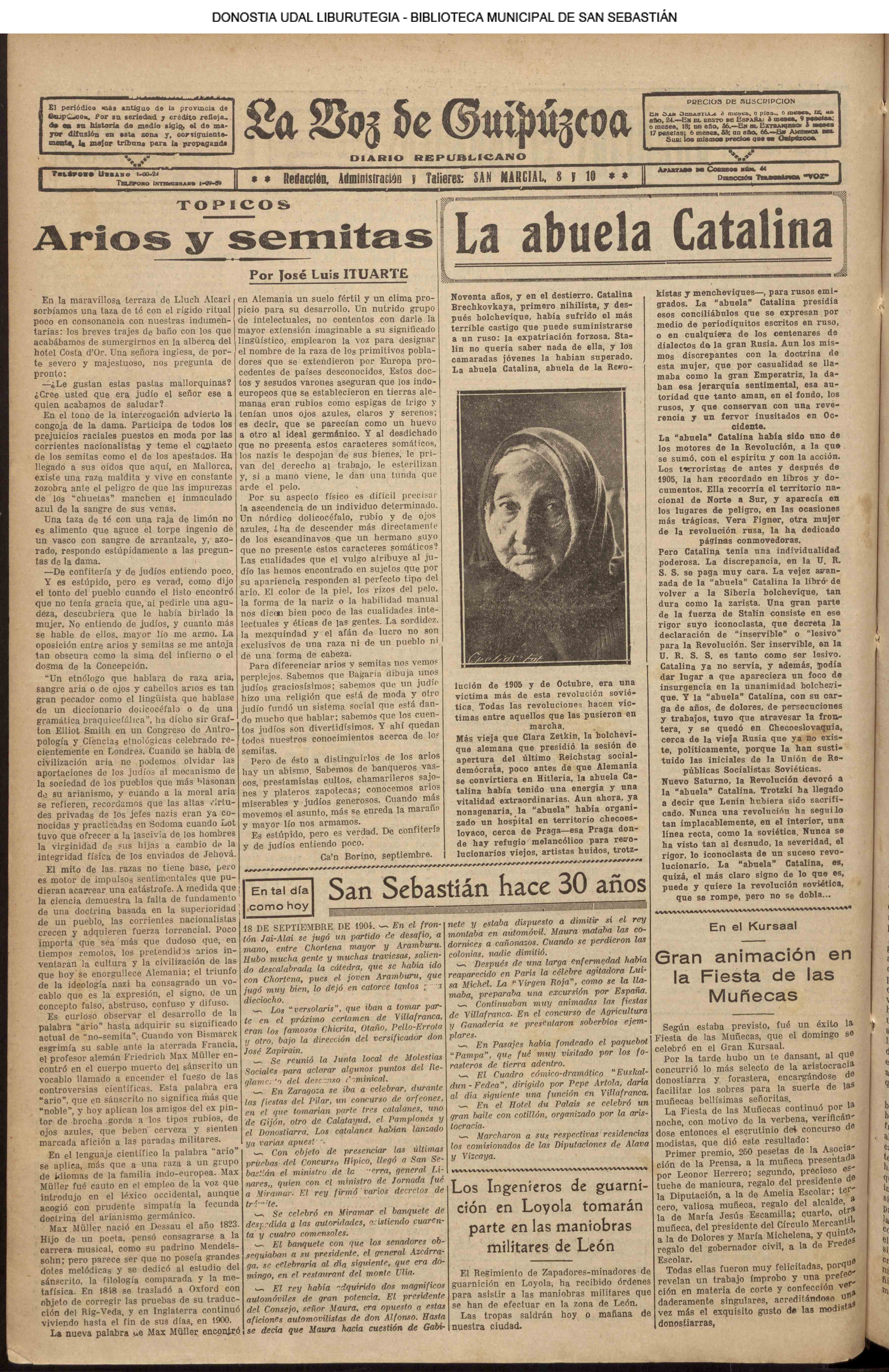 16 - septiembre![]() . | (1931) - LA VOZ DE GUIPUZCOA (CENTROS OFICIALES: Actuación gubernativa por los incidentes de la Plaza de la Constitución) # PLENO MUNICIPAL .- La represión a un guardia da lugar a un largo debate, en el que se adoptan medidas enérgicas (La voz de Guipuzcoa/cont)(El Pueblo Vasco/cont)( # V SEMANA VASCA .- La segunda eliminatoria de "aizkolaris" y la representación de la pastoral "Maitena" (La Voz de Guipúzcoa)(El Pueblo Vasco)( # FIESTAS EN INTXAURRONDO, organizadas por la Sociedad "Artzak Ortzeok" (La voz de Guipuzcoa)(El Pueblo Vasco)( ++++++++++++++++++++++++++++++++++++++++++++++ # VISITA A LOS CUARTELES DE LOYOLA DEL PRESIDENTE DE LA REPÚBLICA (La voz de Guipuzcoa)(El Pueblo Vasco)(El Día)(La Constancia) # El personal de la Fábrica de Tabacos entrega un presente al Jefe del Estado (La voz de Guipuzcoa)(El Pueblo Vasco)(El Día)(La Constancia) # La visita de S.E. el presidente de la República a la Fundación Ostolaza (Deva) (La voz de Guipuzcoa)(El Pueblo Vasco)(El Día)(La Constancia) ++++++++++++++++++++++++++++++++++++++++++++++ (La voz de Guipuzcoa)(El Pueblo Vasco)(El Día)(La Constancia) ++++++++++++++++++++++++++++++++++++++++++++++ # CONSEJO GENERAL DE COLEGIOS MÉDICOS DE ESPAÑA (La voz de Guipuzcoa)(El Pueblo Vasco)(El Día)(La Constancia) # ASAMBLEA DE MÉDICOS FERROVIARIOS (La voz de Guipuzcoa)(El Pueblo Vasco)(El Día)(La Constancia) # REGATAS DE TRAINERAS .- Orio repite su brillante triunfo y se adjudica el primer premio con la Bandera de Honor. (La voz de Guipuzcoa/cont)( (La voz de Guipuzcoa)( # FUTBOL - ALAVÉS (0-2) DONOSTIA @ (La voz de Guipuzcoa)# FIESTA DE LAS MUÑECAS, EN EL KURSAAL (La voz de Guipuzcoa) ++++++++++++++++++++++++++++++++++++++++++++++ (La voz de Guipuzcoa)(El Pueblo Vasco)(El Día)(La Constancia) |