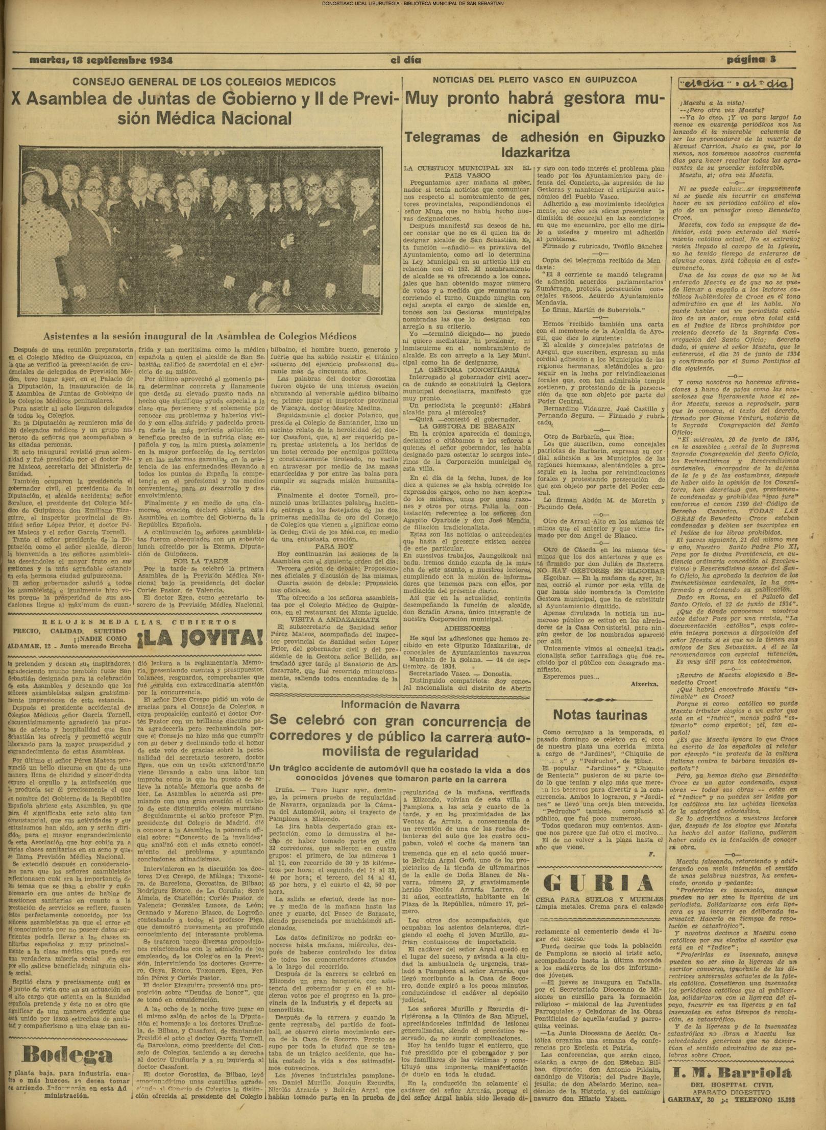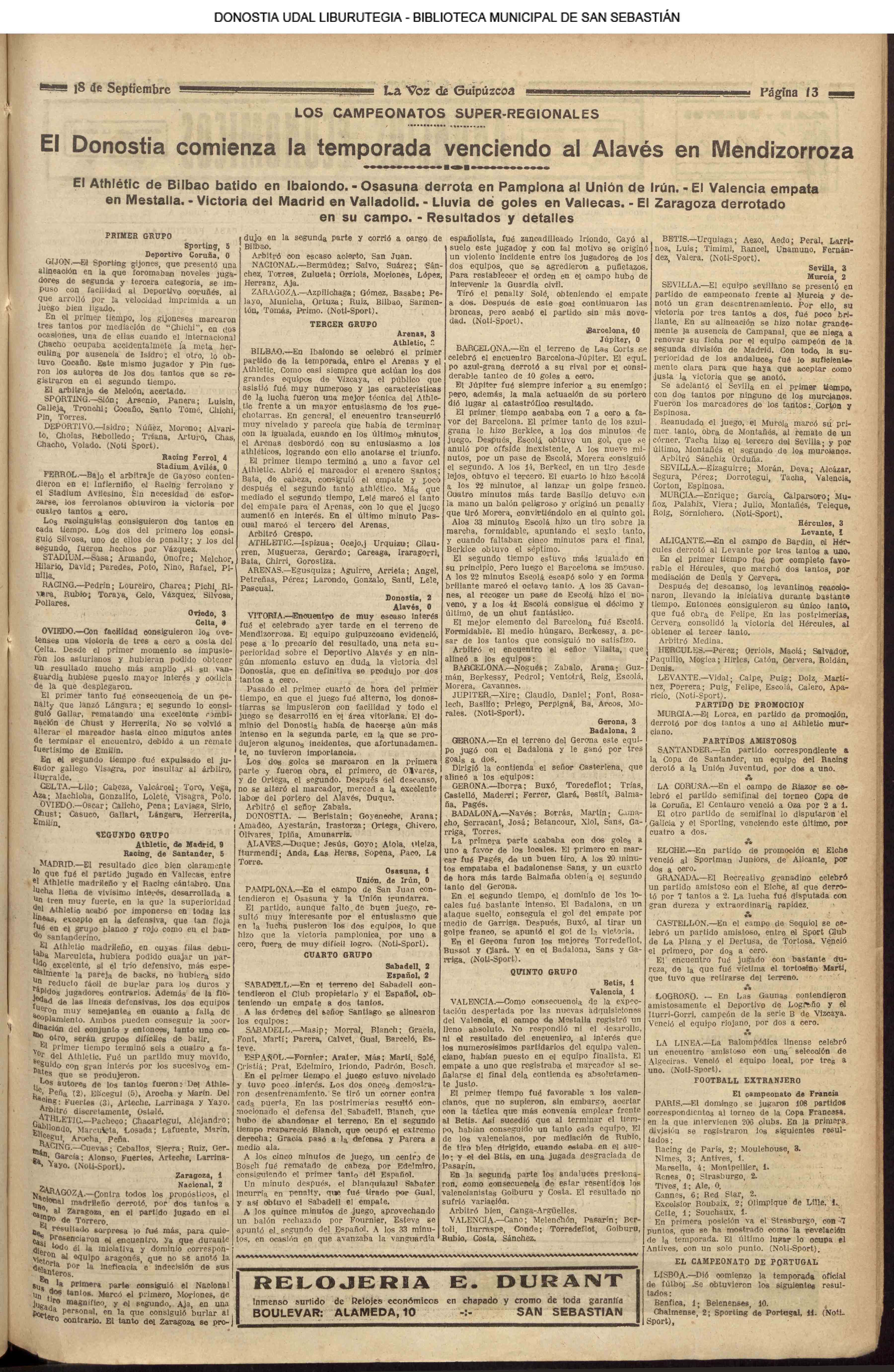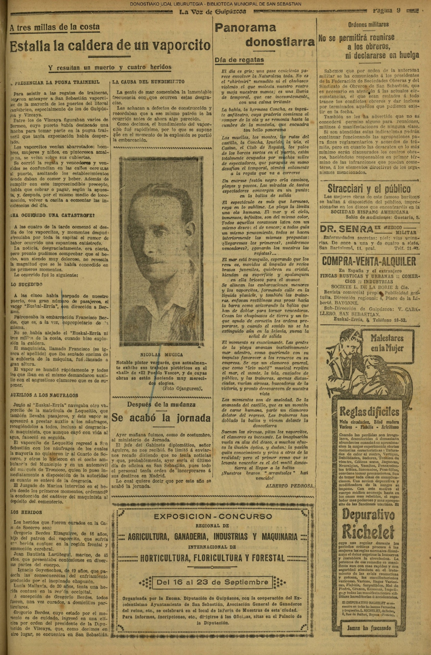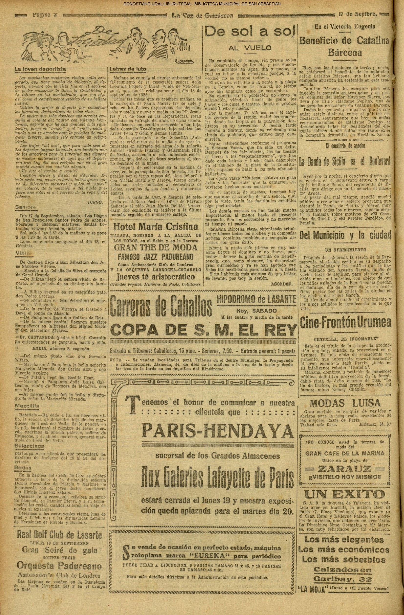 16 - septiembre![]() . | (1931) - LA VOZ DE GUIPUZCOA (CENTROS OFICIALES: Actuación gubernativa por los incidentes de la Plaza de la Constitución) # PLENO MUNICIPAL .- La represión a un guardia da lugar a un largo debate, en el que se adoptan medidas enérgicas (La voz de Guipuzcoa/cont)(El Pueblo Vasco/cont)( # V SEMANA VASCA .- La segunda eliminatoria de "aizkolaris" y la representación de la pastoral "Maitena" (La Voz de Guipúzcoa)(El Pueblo Vasco)( # FIESTAS EN INTXAURRONDO, organizadas por la Sociedad "Artzak Ortzeok" (La voz de Guipuzcoa)(El Pueblo Vasco)( ++++++++++++++++++++++++++++++++++++++++++++++ # VISITA A LOS CUARTELES DE LOYOLA DEL PRESIDENTE DE LA REPÚBLICA (La voz de Guipuzcoa)(El Pueblo Vasco)(El Día)(La Constancia) # El personal de la Fábrica de Tabacos entrega un presente al Jefe del Estado (La voz de Guipuzcoa)(El Pueblo Vasco)(El Día)(La Constancia) # La visita de S.E. el presidente de la República a la Fundación Ostolaza (Deva) (La voz de Guipuzcoa)(El Pueblo Vasco)(El Día)(La Constancia) ++++++++++++++++++++++++++++++++++++++++++++++ (La voz de Guipuzcoa)(El Pueblo Vasco)(El Día)(La Constancia) ++++++++++++++++++++++++++++++++++++++++++++++ # CONSEJO GENERAL DE COLEGIOS MÉDICOS DE ESPAÑA (La voz de Guipuzcoa)(El Pueblo Vasco)(El Día)(La Constancia) # ASAMBLEA DE MÉDICOS FERROVIARIOS (La voz de Guipuzcoa)(El Pueblo Vasco)(El Día)(La Constancia) # REGATAS DE TRAINERAS .- Orio repite su brillante triunfo y se adjudica el primer premio con la Bandera de Honor. (La voz de Guipuzcoa/cont)( (La voz de Guipuzcoa)( # FUTBOL - ALAVÉS (0-2) DONOSTIA @ (La voz de Guipuzcoa)# FIESTA DE LAS MUÑECAS, EN EL KURSAAL (La voz de Guipuzcoa) ++++++++++++++++++++++++++++++++++++++++++++++ (La voz de Guipuzcoa)(El Pueblo Vasco)(El Día)(La Constancia) |