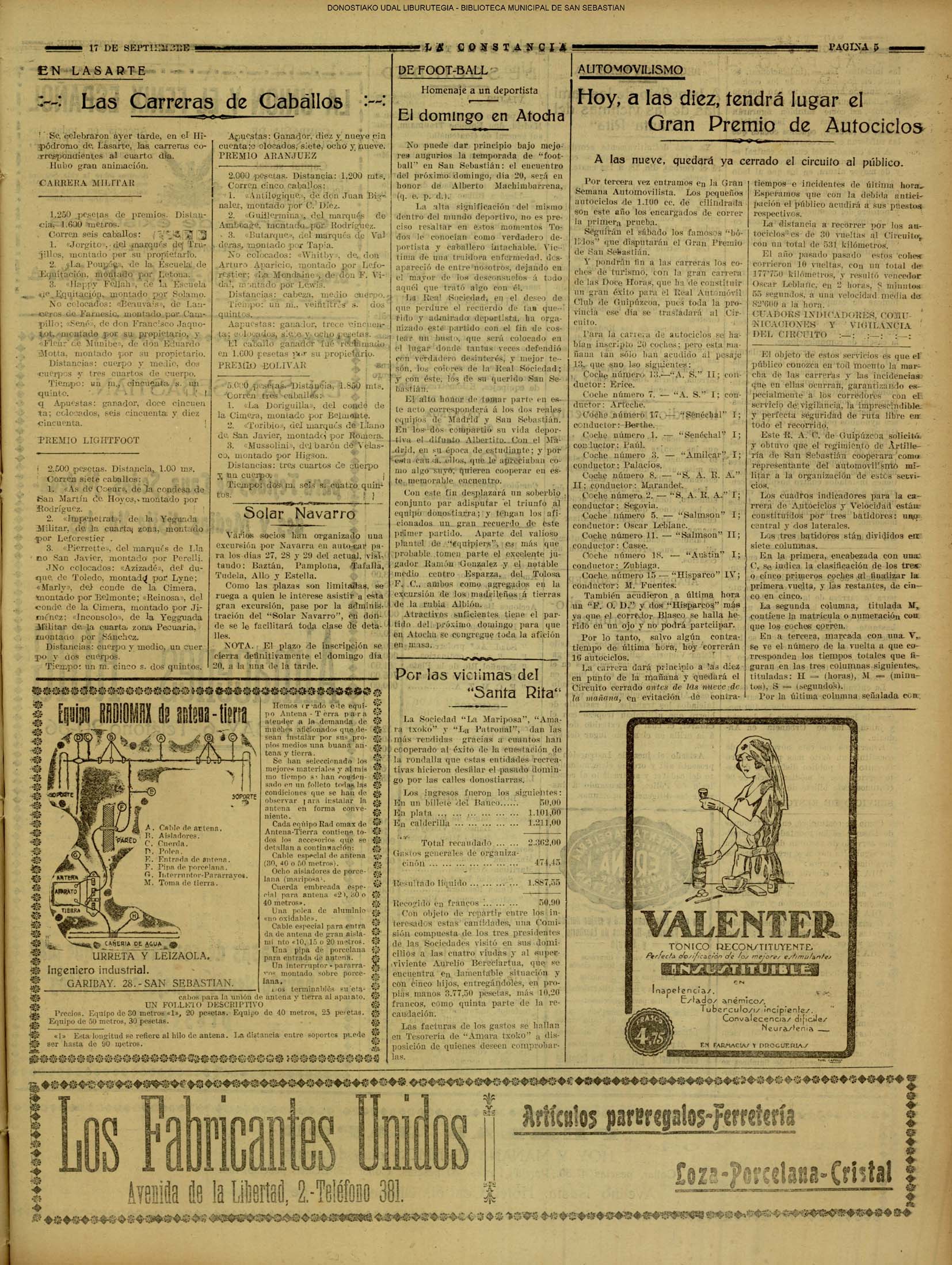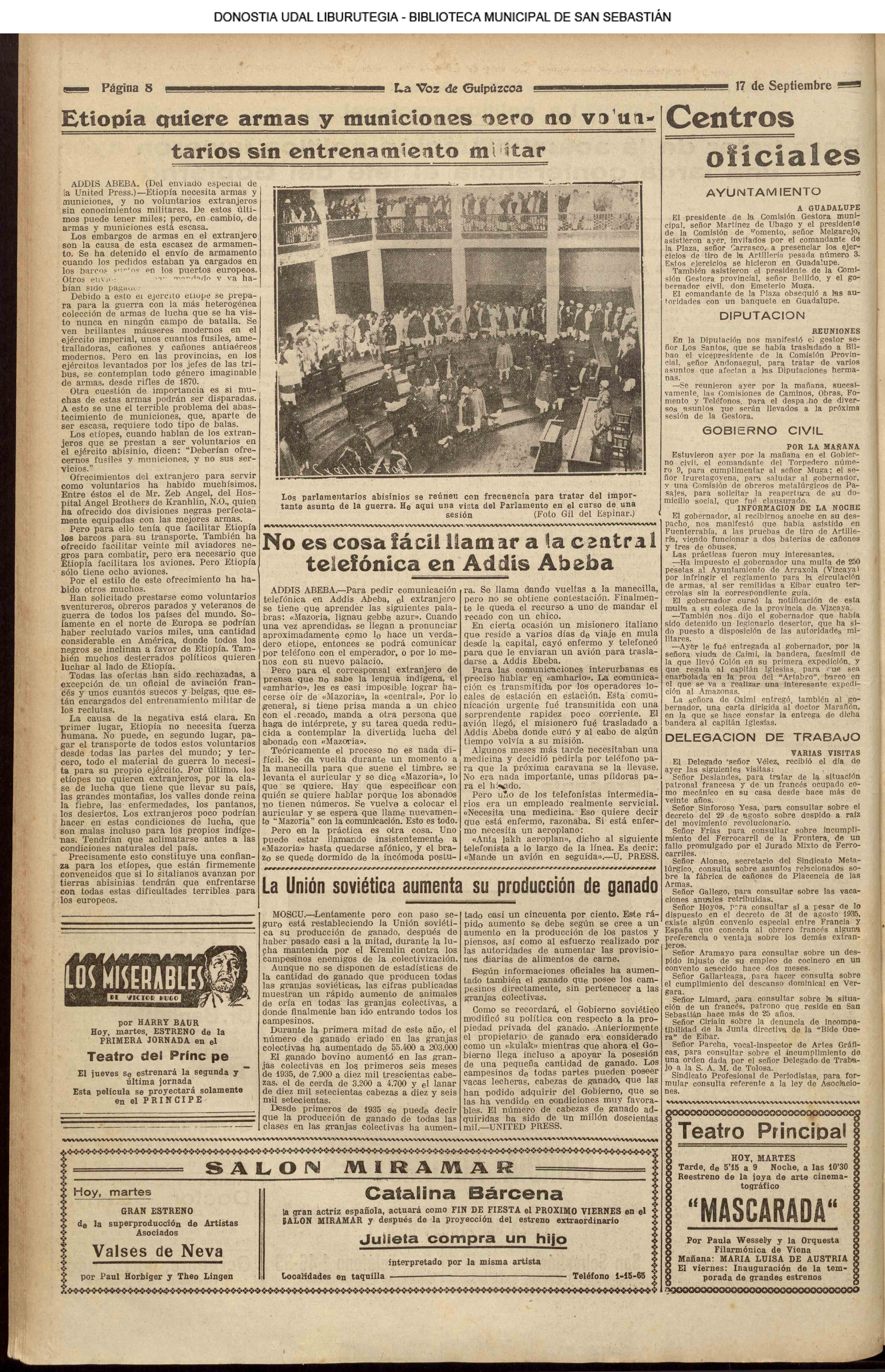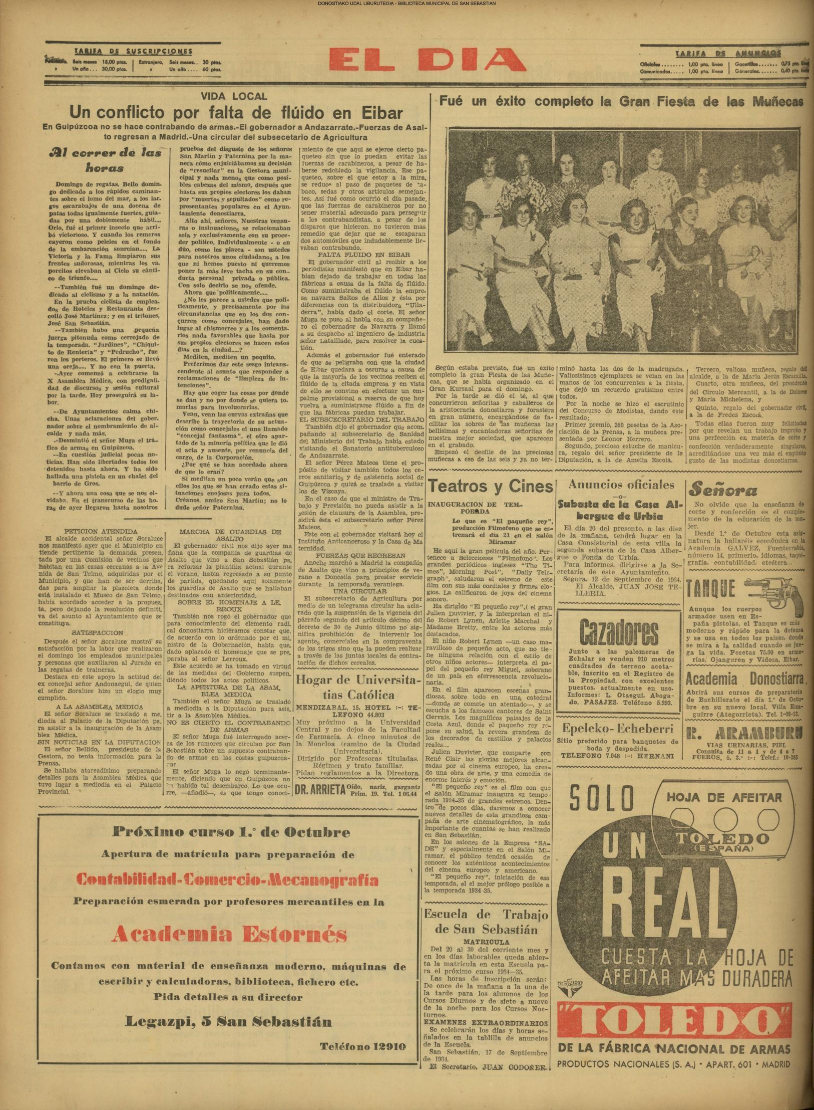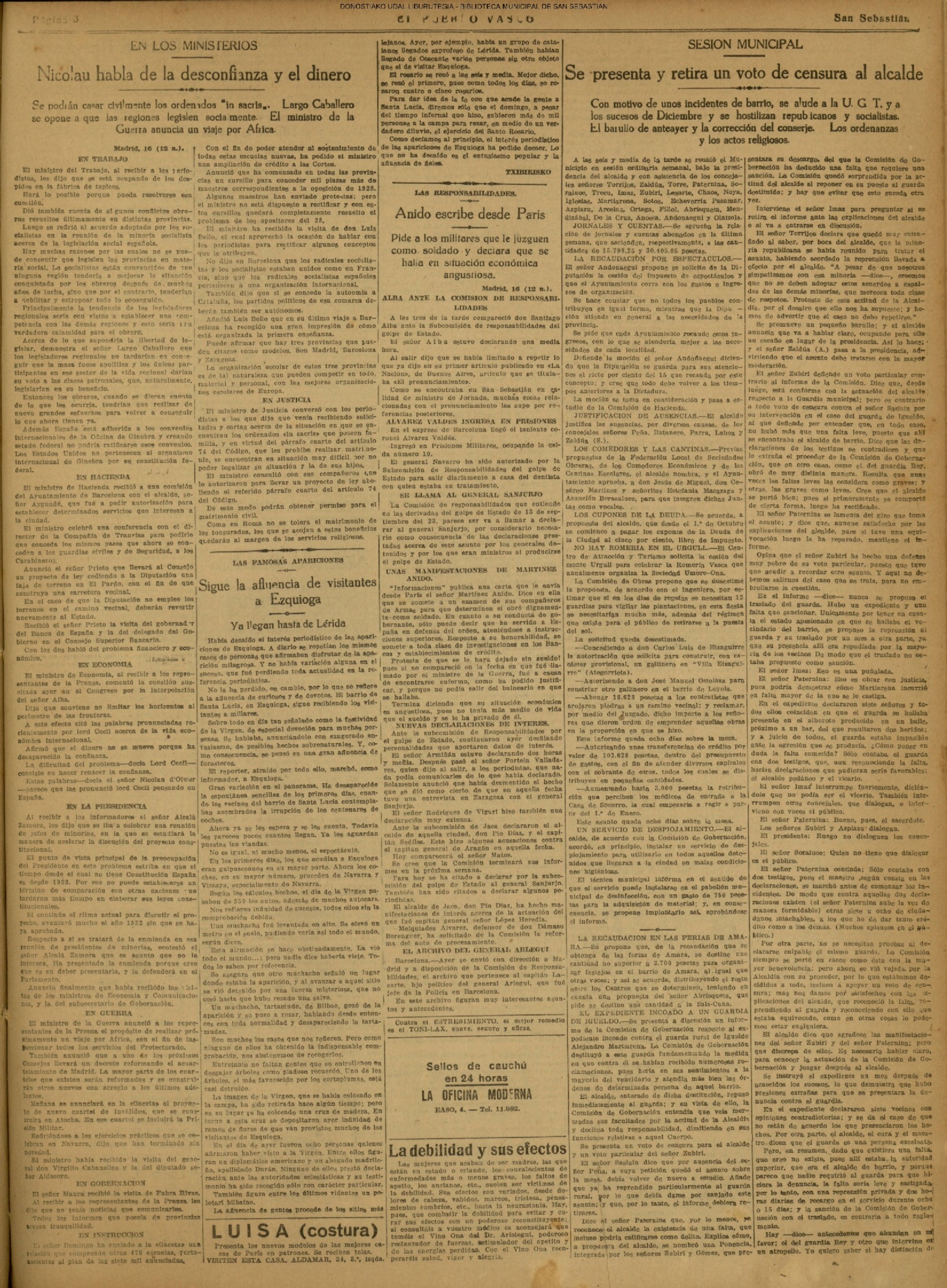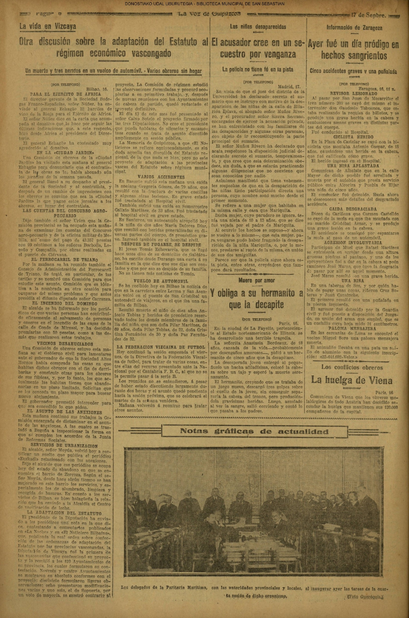 16 - septiembre![]() . | (1931) - LA VOZ DE GUIPUZCOA (CENTROS OFICIALES: Actuación gubernativa por los incidentes de la Plaza de la Constitución) # PLENO MUNICIPAL .- La represión a un guardia da lugar a un largo debate, en el que se adoptan medidas enérgicas (La voz de Guipuzcoa/cont)(El Pueblo Vasco/cont)( # V SEMANA VASCA .- La segunda eliminatoria de "aizkolaris" y la representación de la pastoral "Maitena" (La Voz de Guipúzcoa)(El Pueblo Vasco)( # FIESTAS EN INTXAURRONDO, organizadas por la Sociedad "Artzak Ortzeok" (La voz de Guipuzcoa)(El Pueblo Vasco)( ++++++++++++++++++++++++++++++++++++++++++++++ # VISITA A LOS CUARTELES DE LOYOLA DEL PRESIDENTE DE LA REPÚBLICA (La voz de Guipuzcoa)(El Pueblo Vasco)(El Día)(La Constancia) # El personal de la Fábrica de Tabacos entrega un presente al Jefe del Estado (La voz de Guipuzcoa)(El Pueblo Vasco)(El Día)(La Constancia) # La visita de S.E. el presidente de la República a la Fundación Ostolaza (Deva) (La voz de Guipuzcoa)(El Pueblo Vasco)(El Día)(La Constancia) ++++++++++++++++++++++++++++++++++++++++++++++ (La voz de Guipuzcoa)(El Pueblo Vasco)(El Día)(La Constancia) ++++++++++++++++++++++++++++++++++++++++++++++ # CONSEJO GENERAL DE COLEGIOS MÉDICOS DE ESPAÑA (La voz de Guipuzcoa)(El Pueblo Vasco)(El Día)(La Constancia) # ASAMBLEA DE MÉDICOS FERROVIARIOS (La voz de Guipuzcoa)(El Pueblo Vasco)(El Día)(La Constancia) # REGATAS DE TRAINERAS .- Orio repite su brillante triunfo y se adjudica el primer premio con la Bandera de Honor. (La voz de Guipuzcoa/cont)( (La voz de Guipuzcoa)( # FUTBOL - ALAVÉS (0-2) DONOSTIA @ (La voz de Guipuzcoa)# FIESTA DE LAS MUÑECAS, EN EL KURSAAL (La voz de Guipuzcoa) ++++++++++++++++++++++++++++++++++++++++++++++ (La voz de Guipuzcoa)(El Pueblo Vasco)(El Día)(La Constancia) |