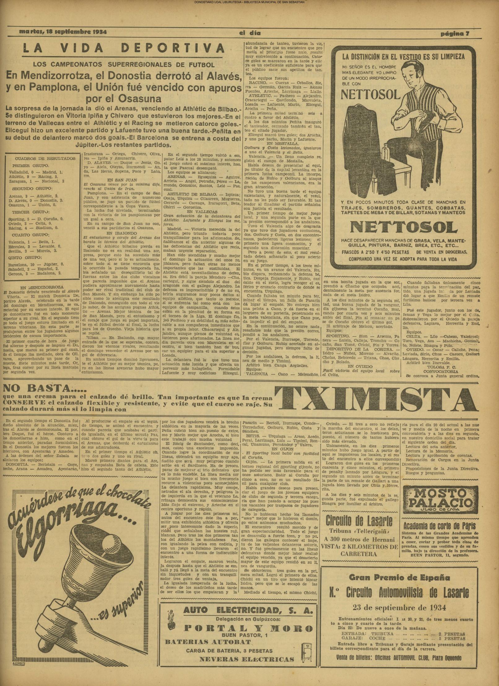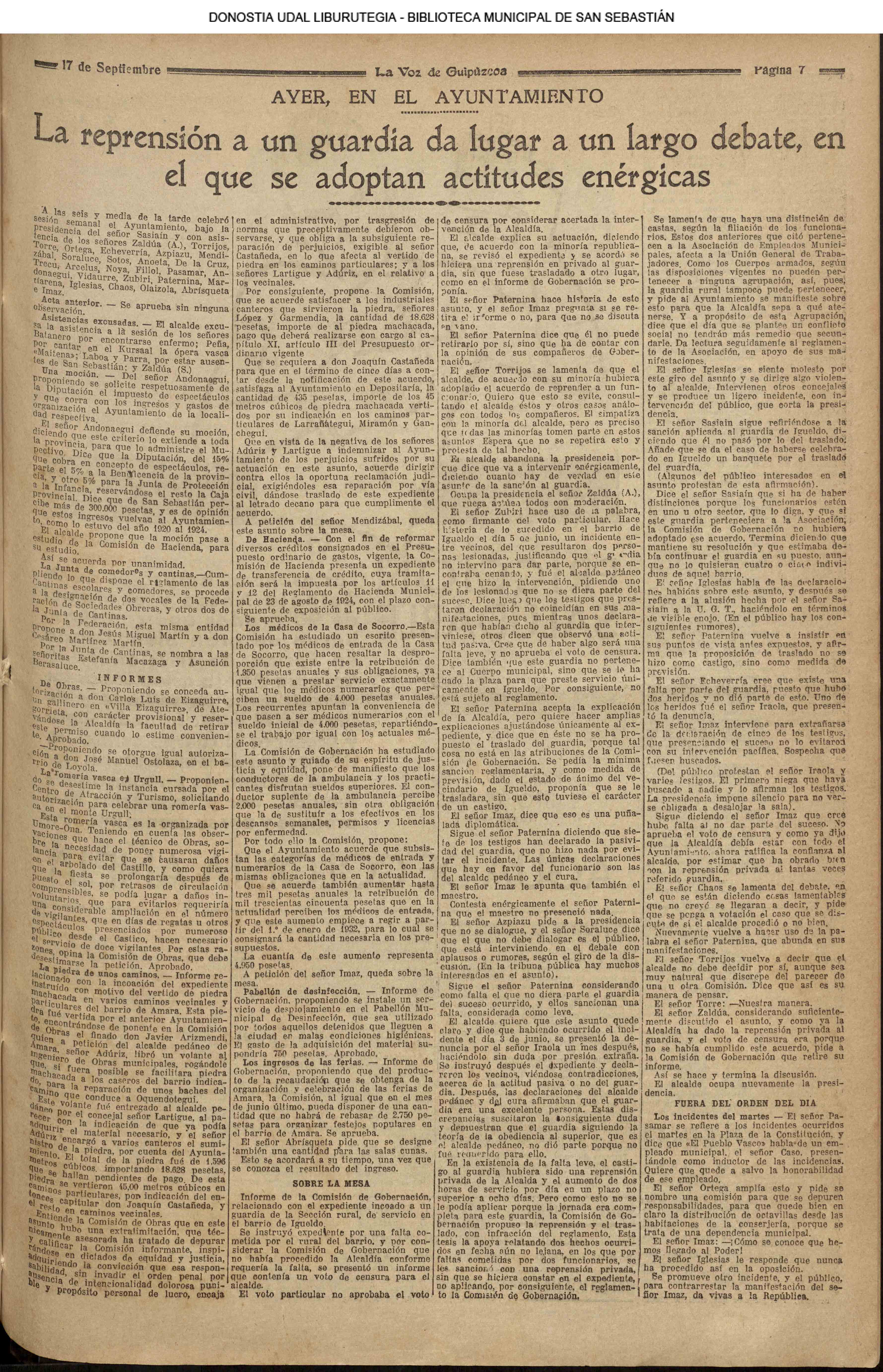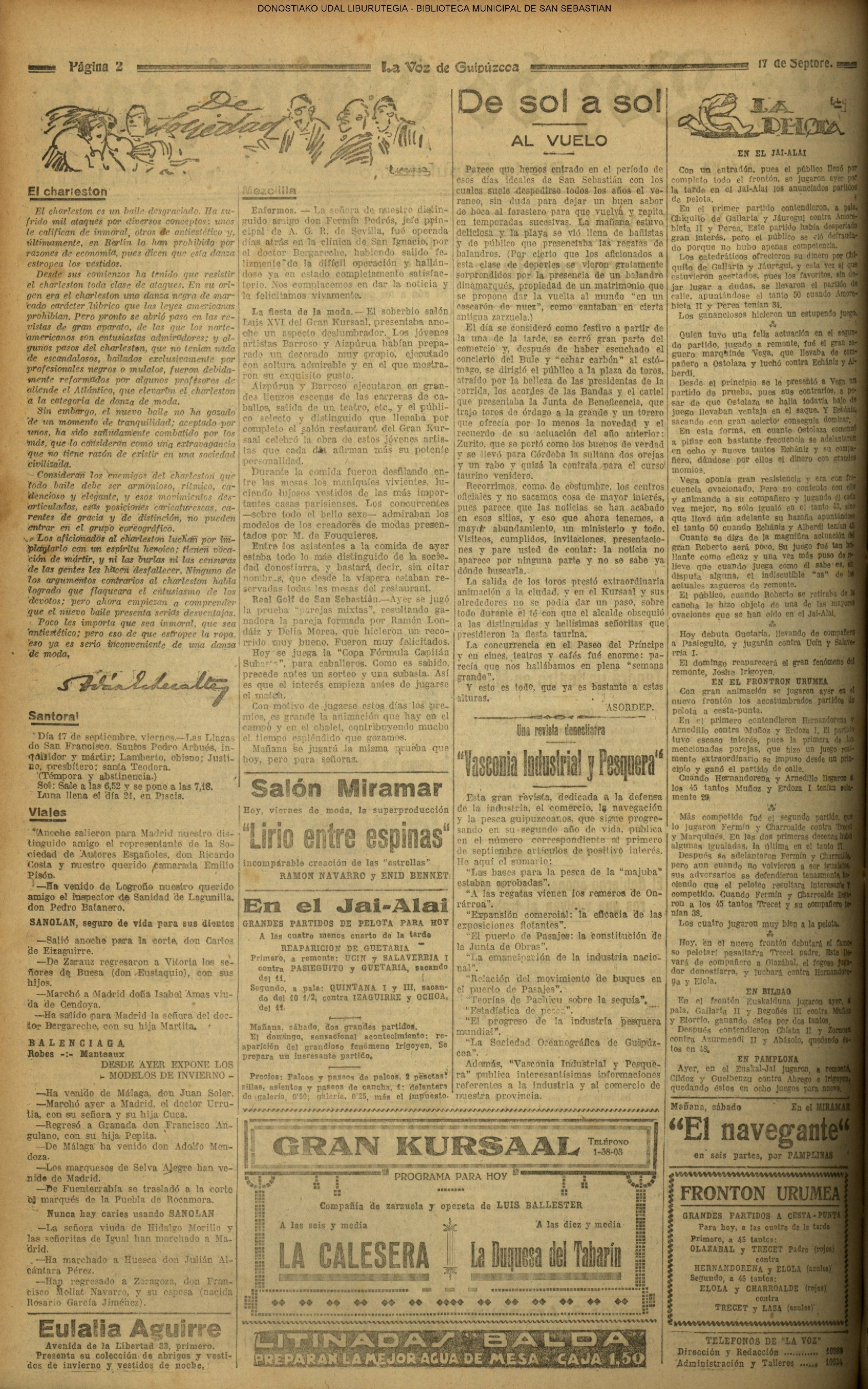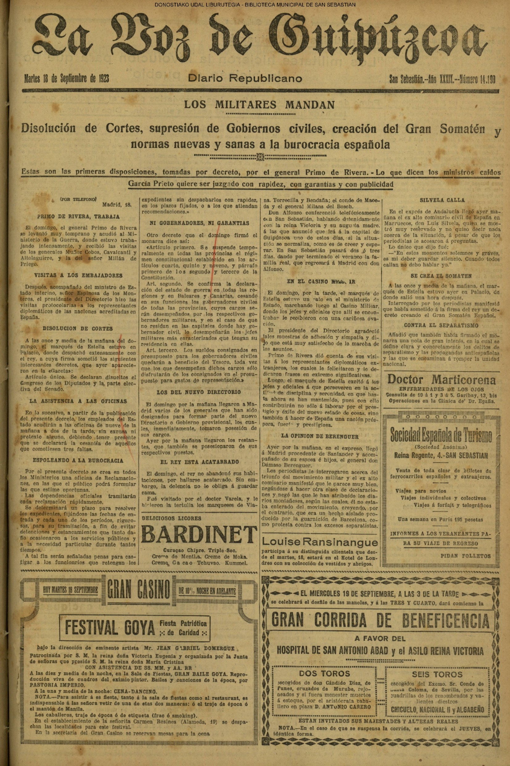 16 - septiembre![]() . | (1931) - LA VOZ DE GUIPUZCOA (CENTROS OFICIALES: Actuación gubernativa por los incidentes de la Plaza de la Constitución) # PLENO MUNICIPAL .- La represión a un guardia da lugar a un largo debate, en el que se adoptan medidas enérgicas (La voz de Guipuzcoa/cont)(El Pueblo Vasco/cont)( # V SEMANA VASCA .- La segunda eliminatoria de "aizkolaris" y la representación de la pastoral "Maitena" (La Voz de Guipúzcoa)(El Pueblo Vasco)( # FIESTAS EN INTXAURRONDO, organizadas por la Sociedad "Artzak Ortzeok" (La voz de Guipuzcoa)(El Pueblo Vasco)( ++++++++++++++++++++++++++++++++++++++++++++++ # VISITA A LOS CUARTELES DE LOYOLA DEL PRESIDENTE DE LA REPÚBLICA (La voz de Guipuzcoa)(El Pueblo Vasco)(El Día)(La Constancia) # El personal de la Fábrica de Tabacos entrega un presente al Jefe del Estado (La voz de Guipuzcoa)(El Pueblo Vasco)(El Día)(La Constancia) # La visita de S.E. el presidente de la República a la Fundación Ostolaza (Deva) (La voz de Guipuzcoa)(El Pueblo Vasco)(El Día)(La Constancia) ++++++++++++++++++++++++++++++++++++++++++++++ (La voz de Guipuzcoa)(El Pueblo Vasco)(El Día)(La Constancia) ++++++++++++++++++++++++++++++++++++++++++++++ # CONSEJO GENERAL DE COLEGIOS MÉDICOS DE ESPAÑA (La voz de Guipuzcoa)(El Pueblo Vasco)(El Día)(La Constancia) # ASAMBLEA DE MÉDICOS FERROVIARIOS (La voz de Guipuzcoa)(El Pueblo Vasco)(El Día)(La Constancia) # REGATAS DE TRAINERAS .- Orio repite su brillante triunfo y se adjudica el primer premio con la Bandera de Honor. (La voz de Guipuzcoa/cont)( (La voz de Guipuzcoa)( # FUTBOL - ALAVÉS (0-2) DONOSTIA @ (La voz de Guipuzcoa)# FIESTA DE LAS MUÑECAS, EN EL KURSAAL (La voz de Guipuzcoa) ++++++++++++++++++++++++++++++++++++++++++++++ (La voz de Guipuzcoa)(El Pueblo Vasco)(El Día)(La Constancia) |