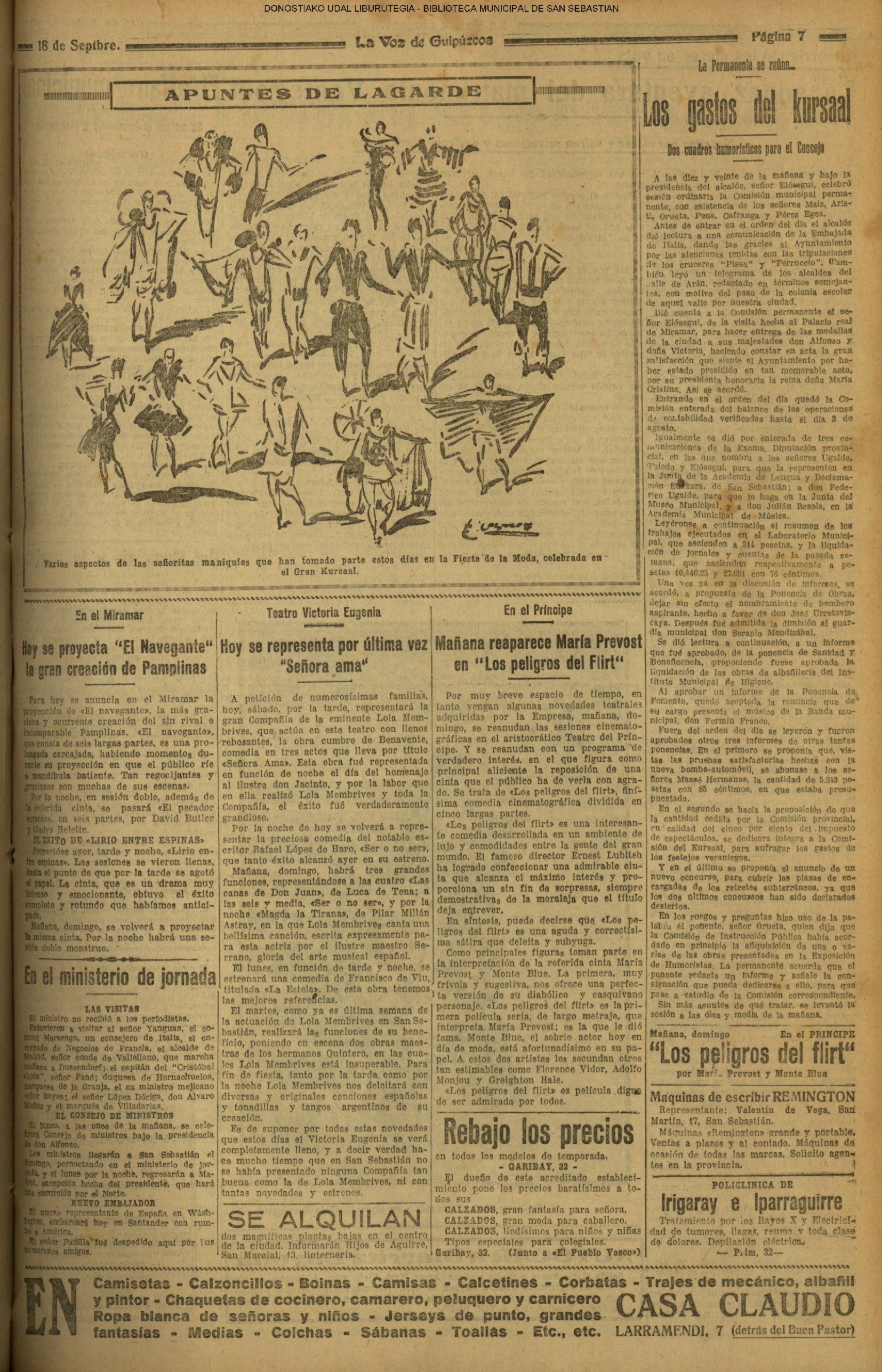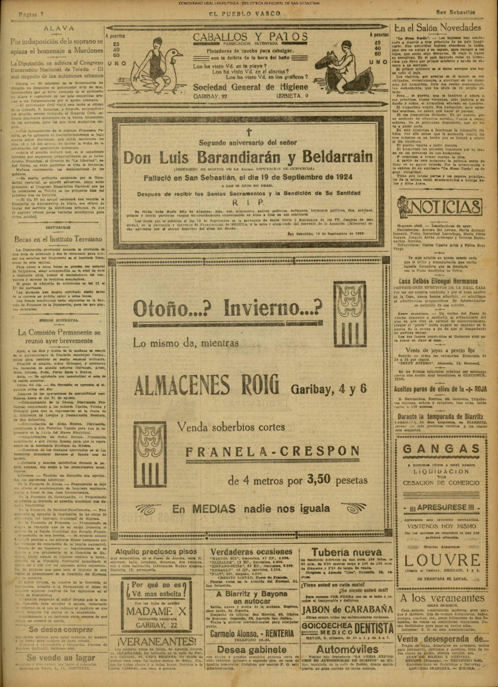 17 - septiembre![]() . | (1947) (1956) Se abre al público en el núm. 7 de la calle de San Marcial el establecimiento de Tejidos y Novedades «Jorge Lasagabáster». (LA VOZ DE ESPAÑA)