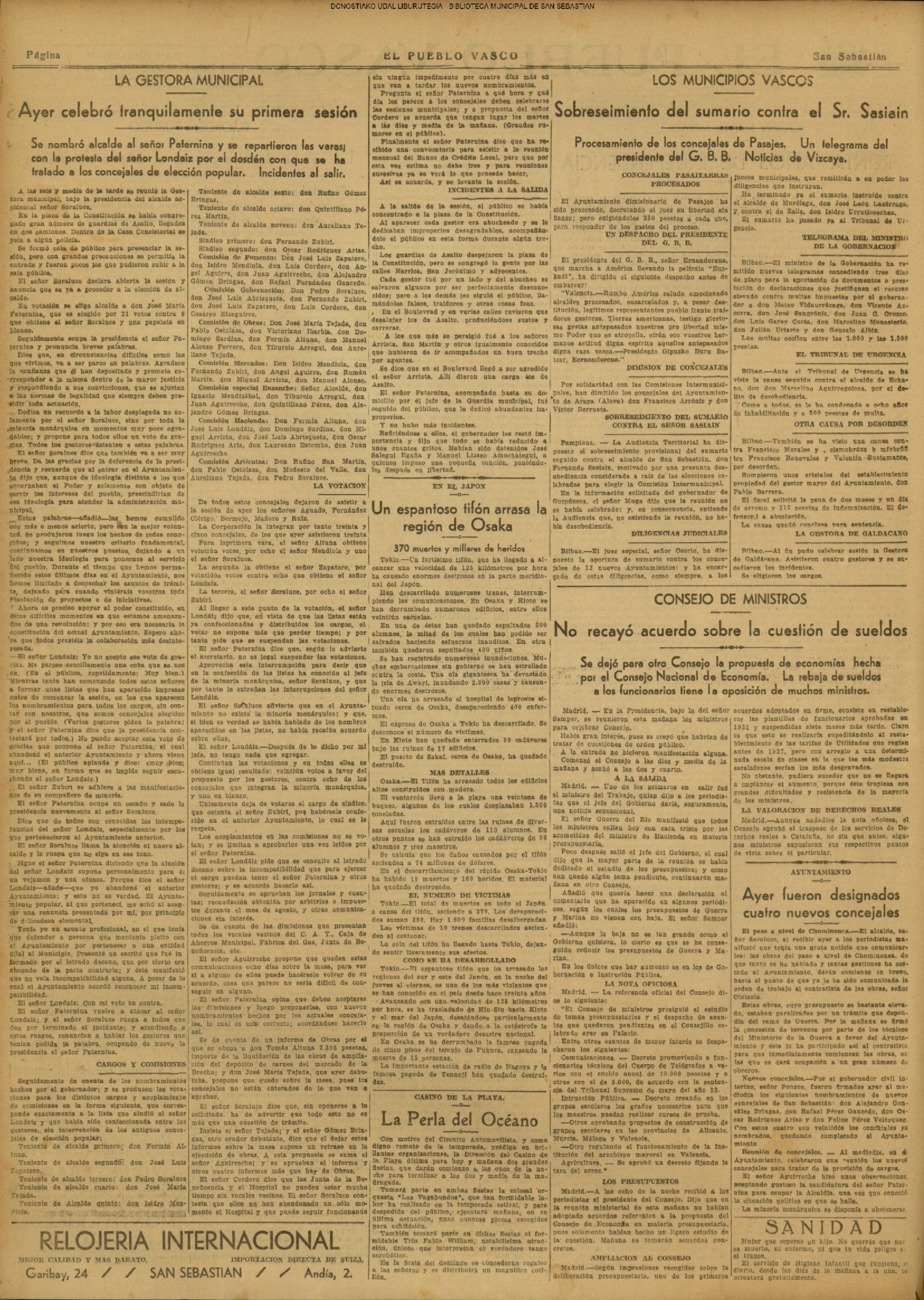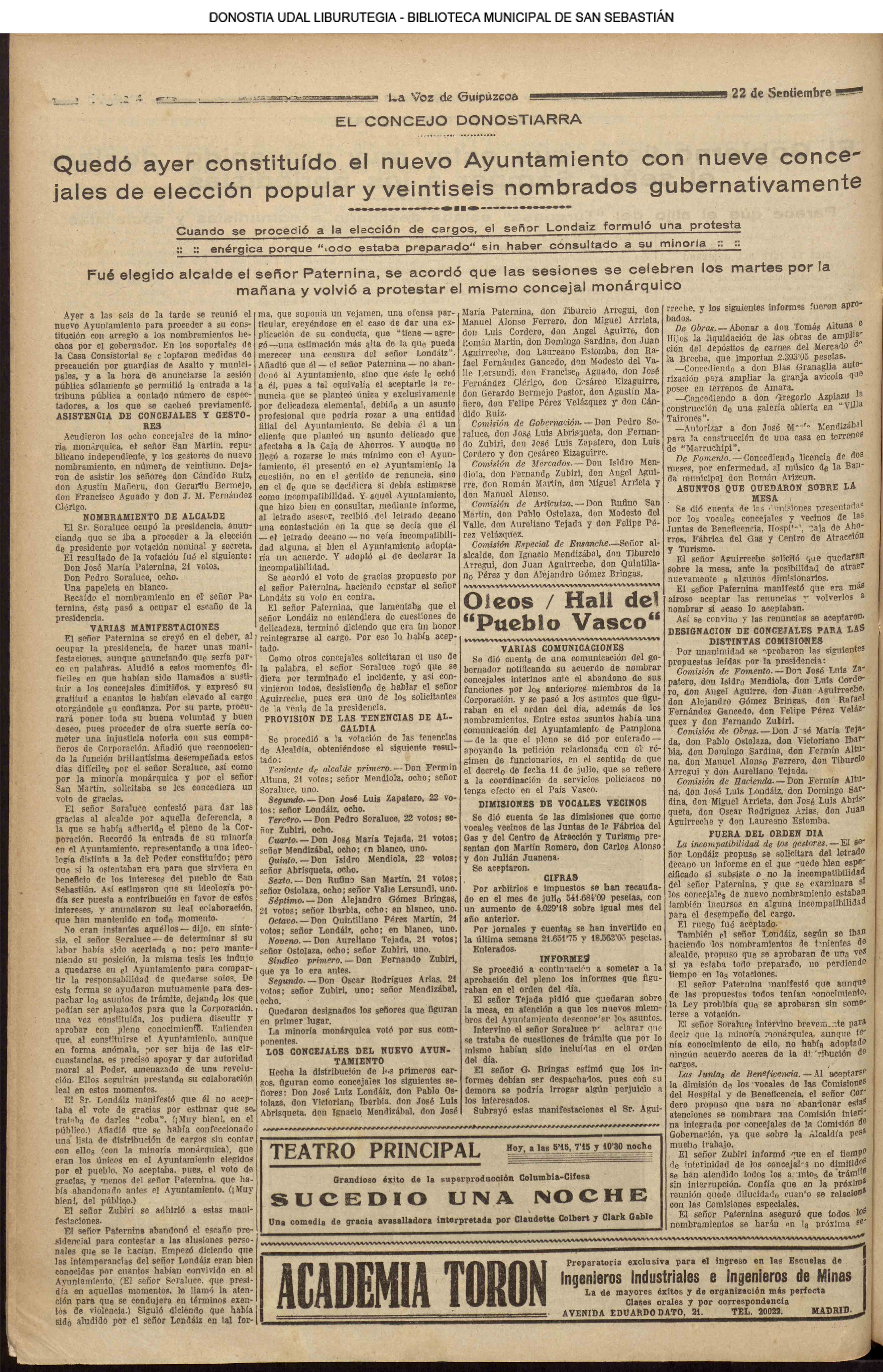# EL CONCEJO DONOSTIARRA.(!!!!) - Quedó constituido el nuevo Ayuntamiento con nueve concejales de elección popular y veintiseis nombrados gubernativamente.- Fue elegido alcalde el señor Paternina