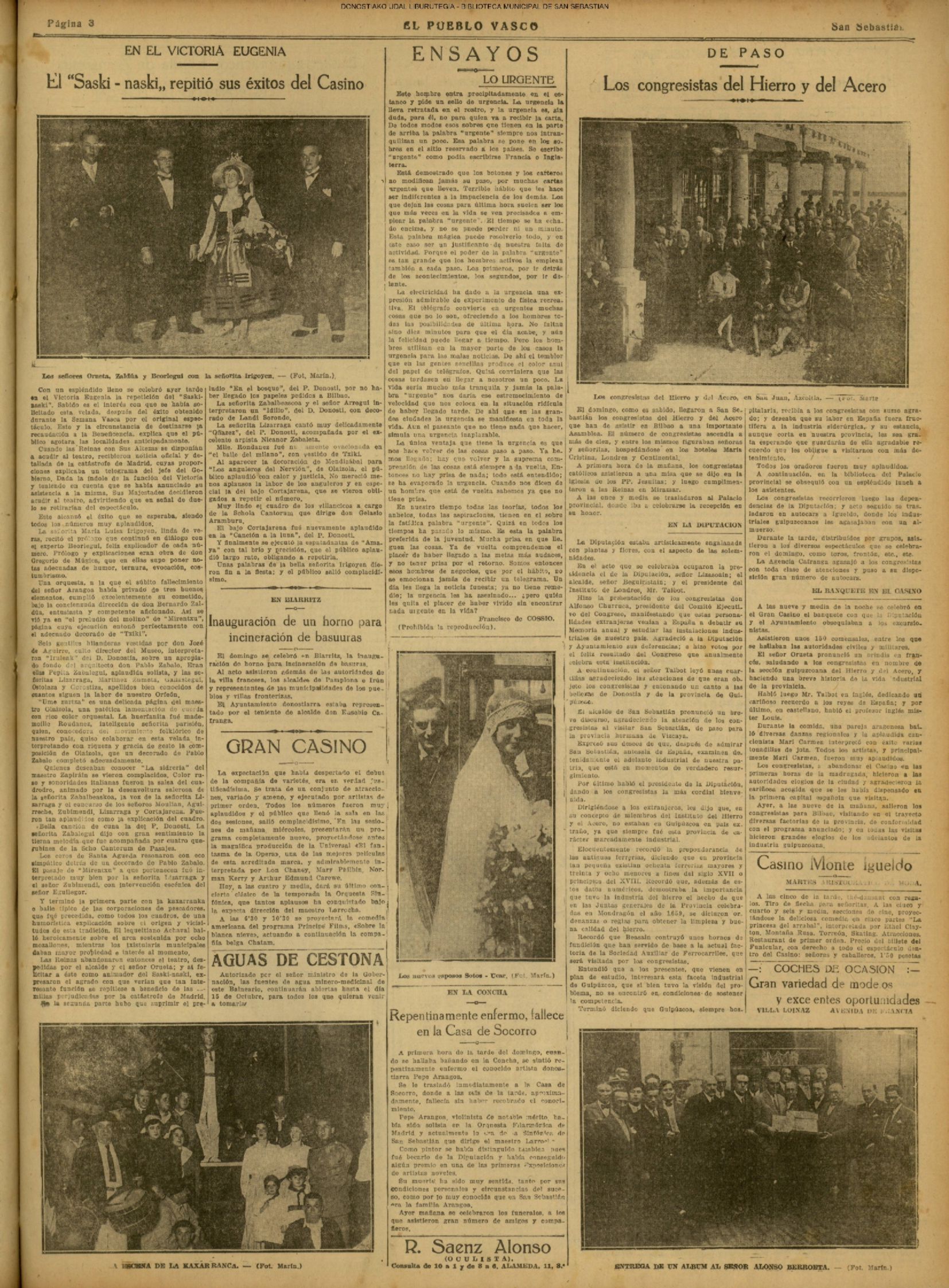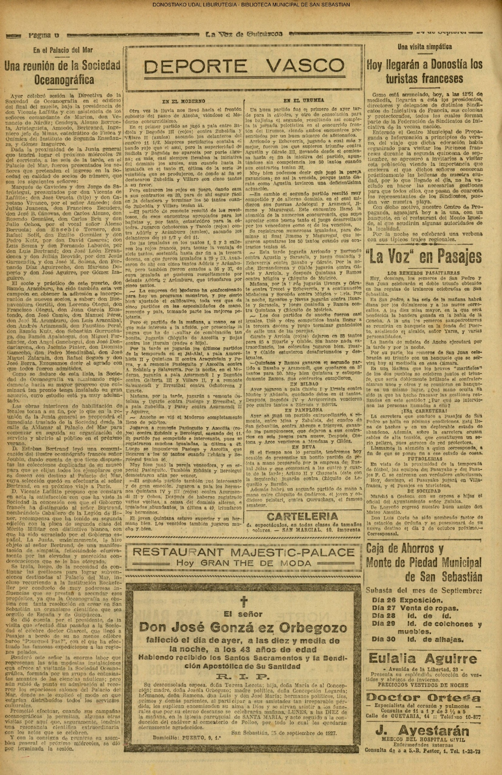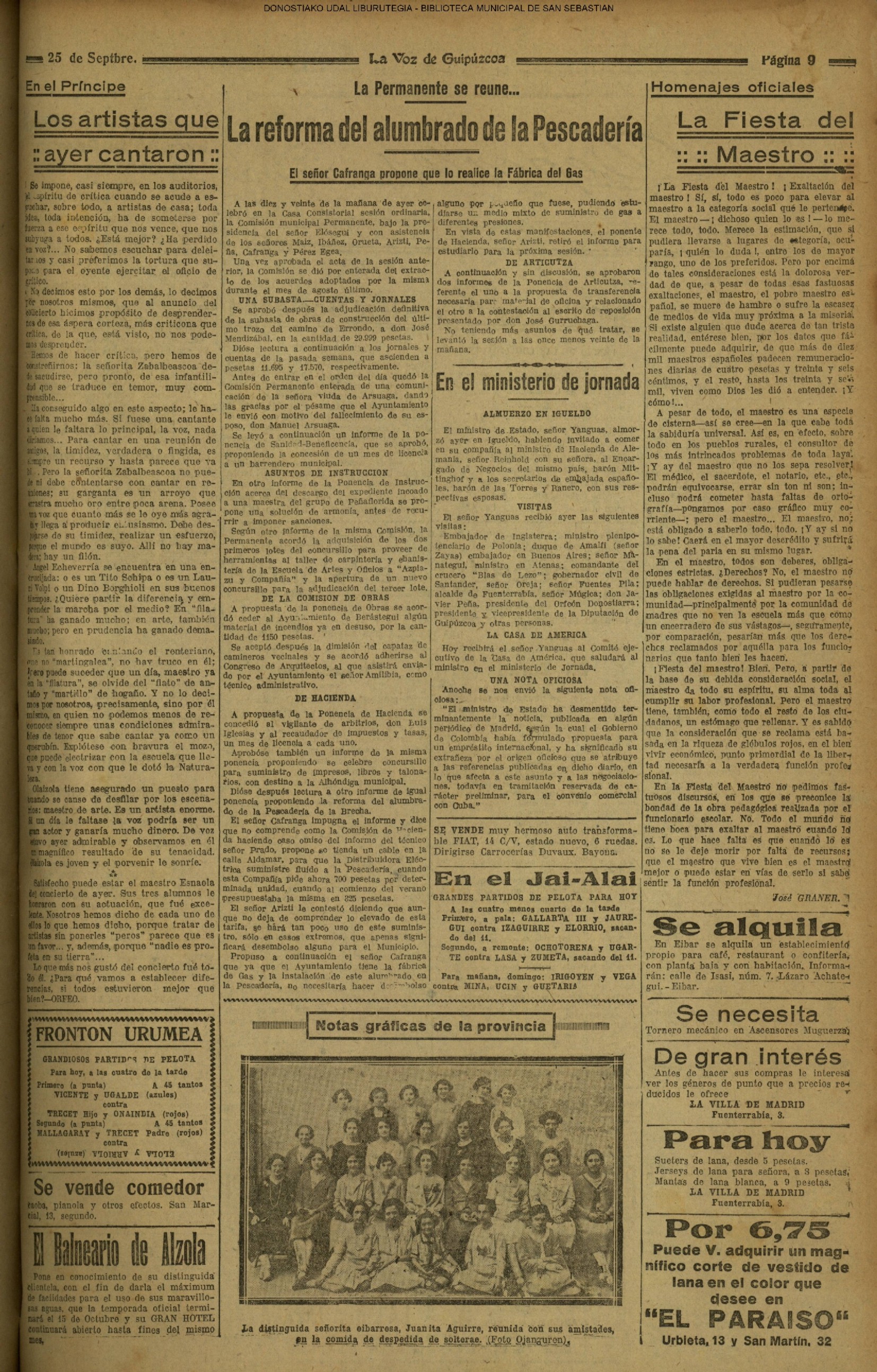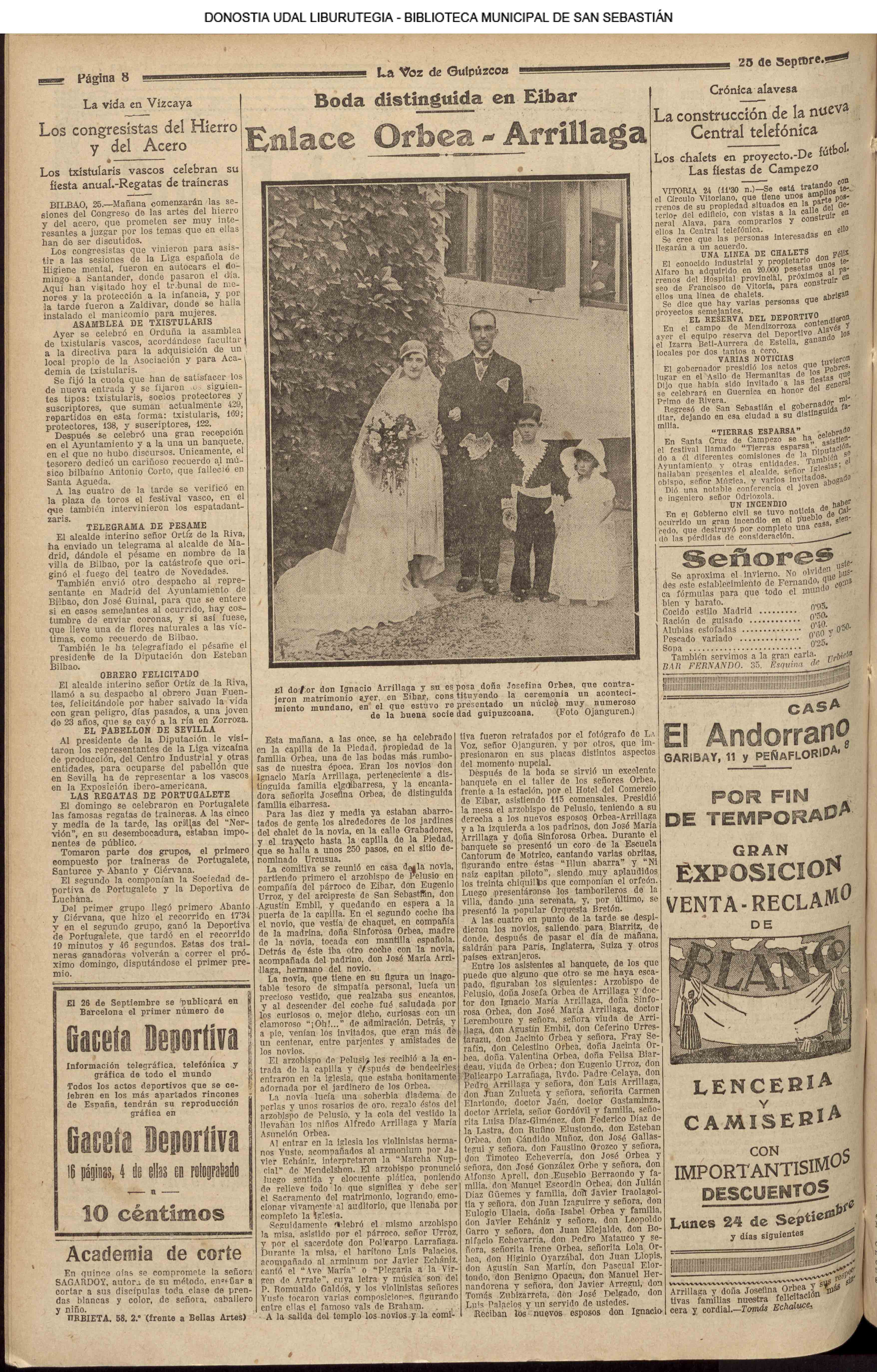 24 - septiembre![]() . | (1931) - LA VOZ DE GUIPUZCOA (CENTROS OFICIALES) # CONCIERTO DE NICANOR ZABALETA (La voz de Guipuzcoa)(El Pueblo Vasco)(El Día)(La Constancia) ++++++++++++++++++++++++++++++++++++++++++++++ # TRIBUNAS DONOSTIARRAS.- La escritora Halma Angélico disertó en el Circulo Radical-Socialista sobre "Mayorazgos espirituales de la mujer". (La voz de Guipuzcoa/cont)(El Pueblo Vasco)(El Día)(La Constancia) # LA SEMANA VASCA (La voz de Guipuzcoa)(El Pueblo Vasco)(El Día)(La Constancia) # CENA, en ZUBI GAIN, en honor de los remeros del AMAIKAK-BAT (La voz de Guipuzcoa)(El Pueblo Vasco)(El Día)(La Constancia) ++++++++++++++++++++++++++++++++++++++++++++++ # EL PRESIDENTE EN SAN SEBASTIÁN.- Después de haber pasado la jornada en el Circuito de Lasarte, S.E. regresó por la noche a Madrid (La voz de Guipuzcoa)(El Pueblo Vasco)(El Día)(La Constancia) # EL ACONTECIMIENTO AUTOMOVILISTA ++++++++++++++++++++++++++++++++++++++++++++++ # LA SEMANA VASCA.- INAUGURACIÓN de la Exposición de escultura,pintura y fotografía (La voz de Guipuzcoa)(El Pueblo Vasco)(El Día)(La Constancia) ++++++++++++++++++++++++++++++++++++++++++++++ # EN LA CASA CONSISTORIAL. PLENO MUNICIPAL .- Pasó a estudio de la Comisión de Hacienda, un informe proponiendo una justa elevación de sueldos para el personal médico municipal.- Tratóse de la honorabilidad -puesta en entredicho- de un gestor contra quien antes de serlo se presentó una denuncia por fraude (La voz de Guipuzcoa)(El Pueblo Vasco)(El Día)(La Constancia) # IX SEMANA VASCA .- Han comenzado con gran éxito los concursos de "aizkolaris" y "bolaris" (La voz de Guipuzcoa)(El Pueblo Vasco)(El Día)(La Constancia) |