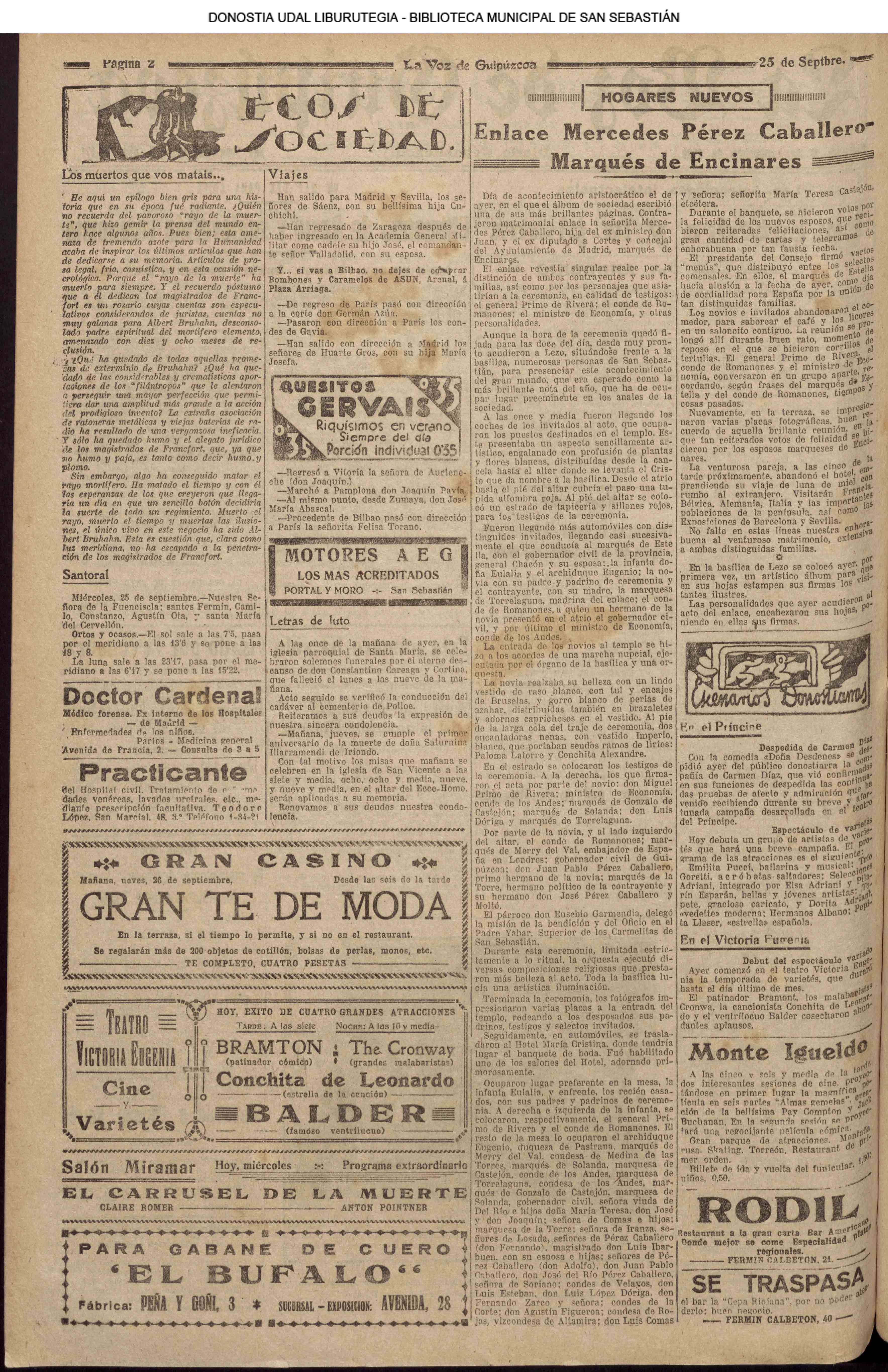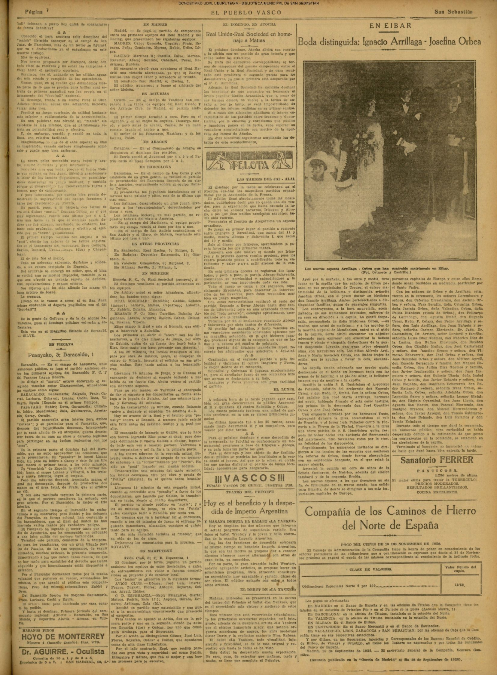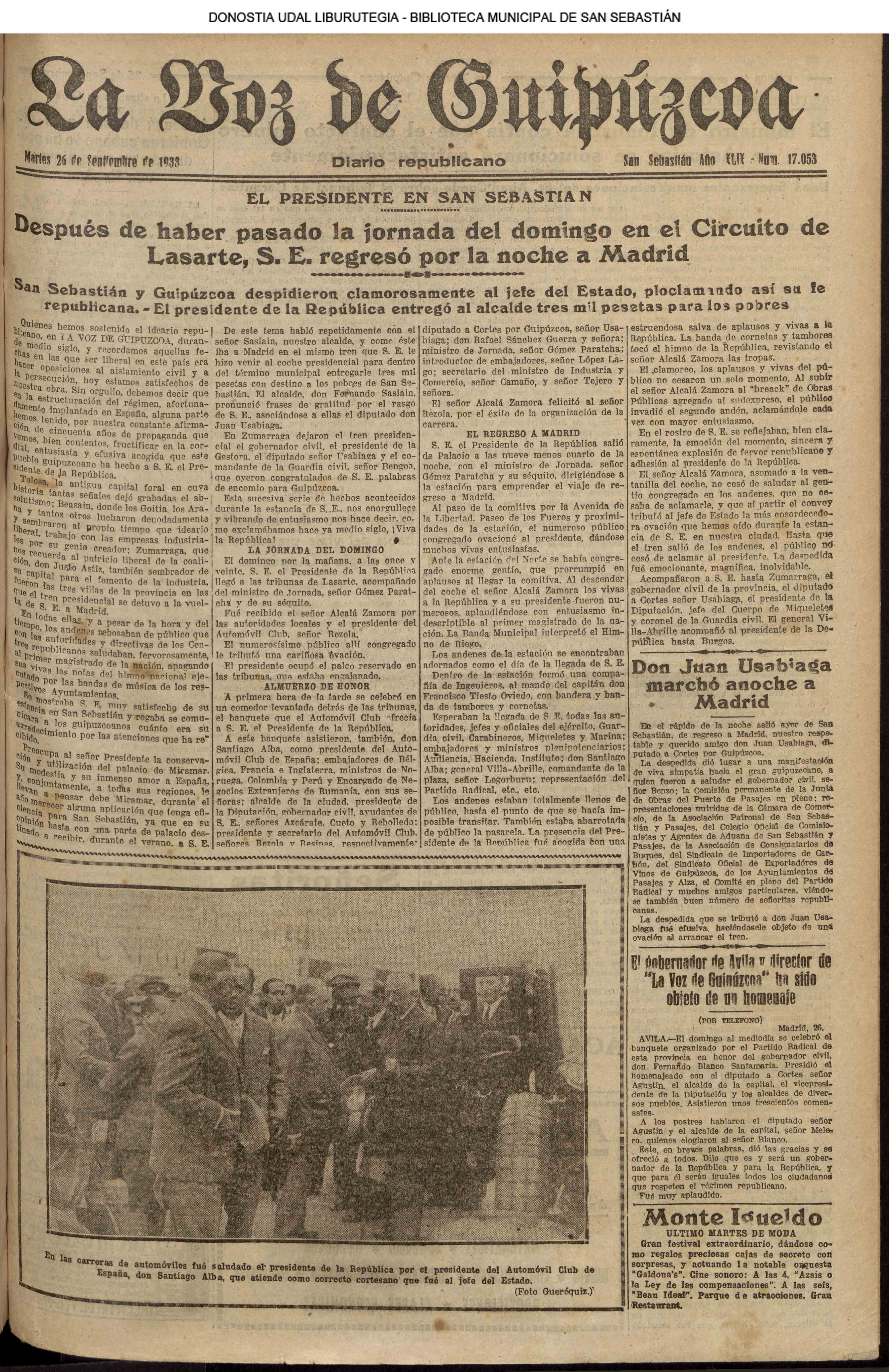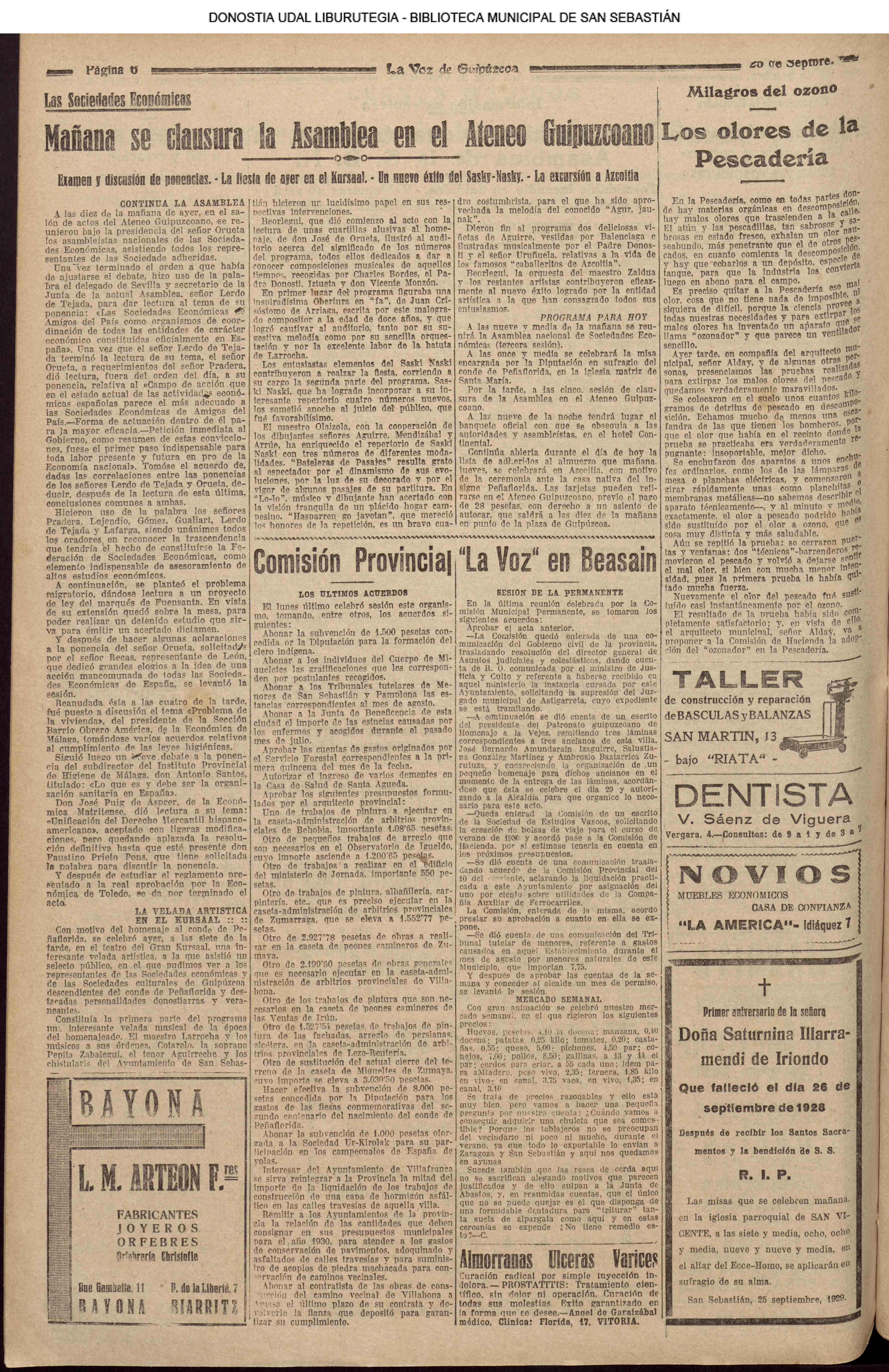 24 - septiembre![]() . | (1931) - LA VOZ DE GUIPUZCOA (CENTROS OFICIALES) # CONCIERTO DE NICANOR ZABALETA (La voz de Guipuzcoa)(El Pueblo Vasco)(El Día)(La Constancia) ++++++++++++++++++++++++++++++++++++++++++++++ # TRIBUNAS DONOSTIARRAS.- La escritora Halma Angélico disertó en el Circulo Radical-Socialista sobre "Mayorazgos espirituales de la mujer". (La voz de Guipuzcoa/cont)(El Pueblo Vasco)(El Día)(La Constancia) # LA SEMANA VASCA (La voz de Guipuzcoa)(El Pueblo Vasco)(El Día)(La Constancia) # CENA, en ZUBI GAIN, en honor de los remeros del AMAIKAK-BAT (La voz de Guipuzcoa)(El Pueblo Vasco)(El Día)(La Constancia) ++++++++++++++++++++++++++++++++++++++++++++++ # EL PRESIDENTE EN SAN SEBASTIÁN.- Después de haber pasado la jornada en el Circuito de Lasarte, S.E. regresó por la noche a Madrid (La voz de Guipuzcoa)(El Pueblo Vasco)(El Día)(La Constancia) # EL ACONTECIMIENTO AUTOMOVILISTA ++++++++++++++++++++++++++++++++++++++++++++++ # LA SEMANA VASCA.- INAUGURACIÓN de la Exposición de escultura,pintura y fotografía (La voz de Guipuzcoa)(El Pueblo Vasco)(El Día)(La Constancia) ++++++++++++++++++++++++++++++++++++++++++++++ # EN LA CASA CONSISTORIAL. PLENO MUNICIPAL .- Pasó a estudio de la Comisión de Hacienda, un informe proponiendo una justa elevación de sueldos para el personal médico municipal.- Tratóse de la honorabilidad -puesta en entredicho- de un gestor contra quien antes de serlo se presentó una denuncia por fraude (La voz de Guipuzcoa)(El Pueblo Vasco)(El Día)(La Constancia) # IX SEMANA VASCA .- Han comenzado con gran éxito los concursos de "aizkolaris" y "bolaris" (La voz de Guipuzcoa)(El Pueblo Vasco)(El Día)(La Constancia) |