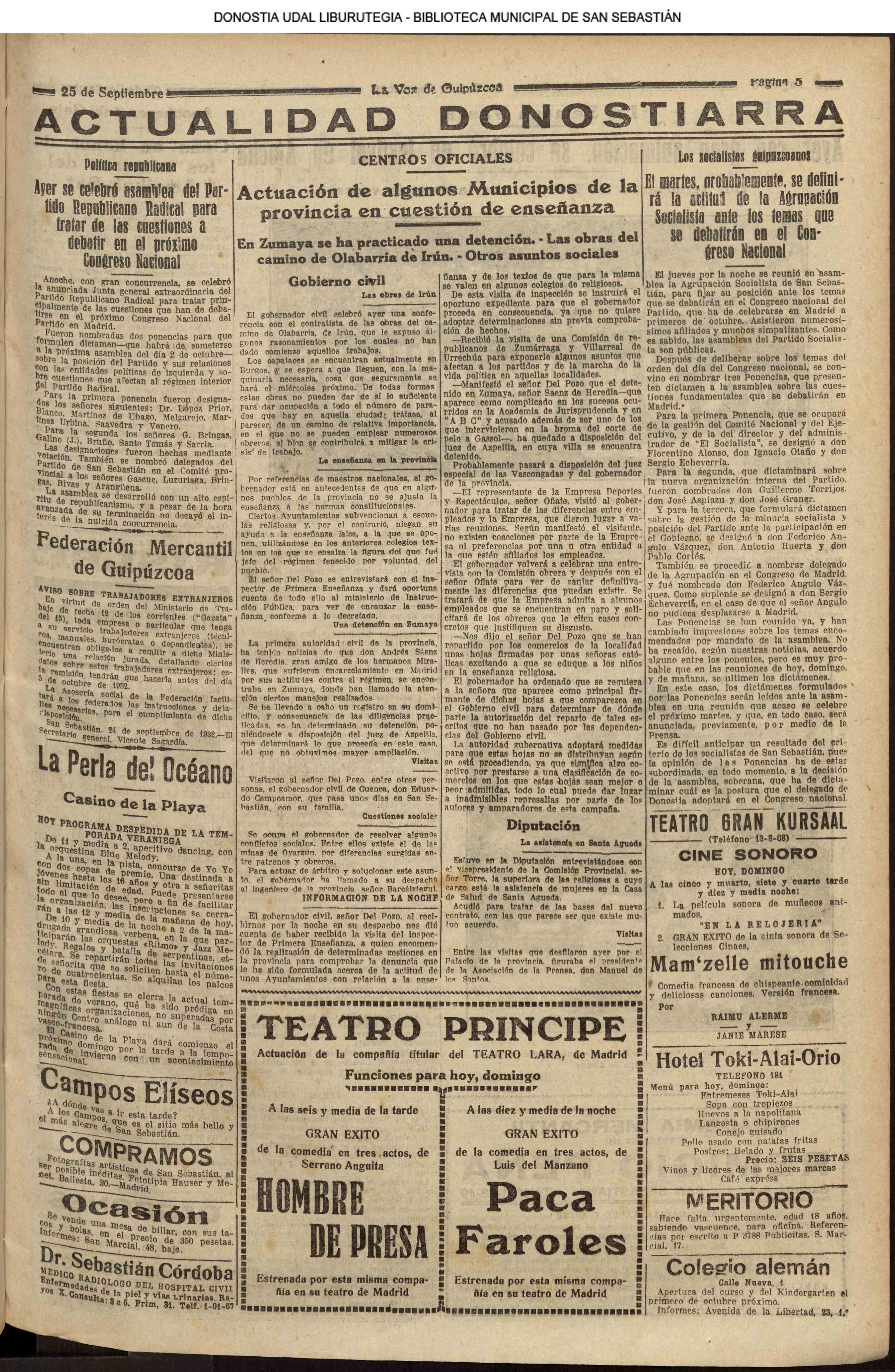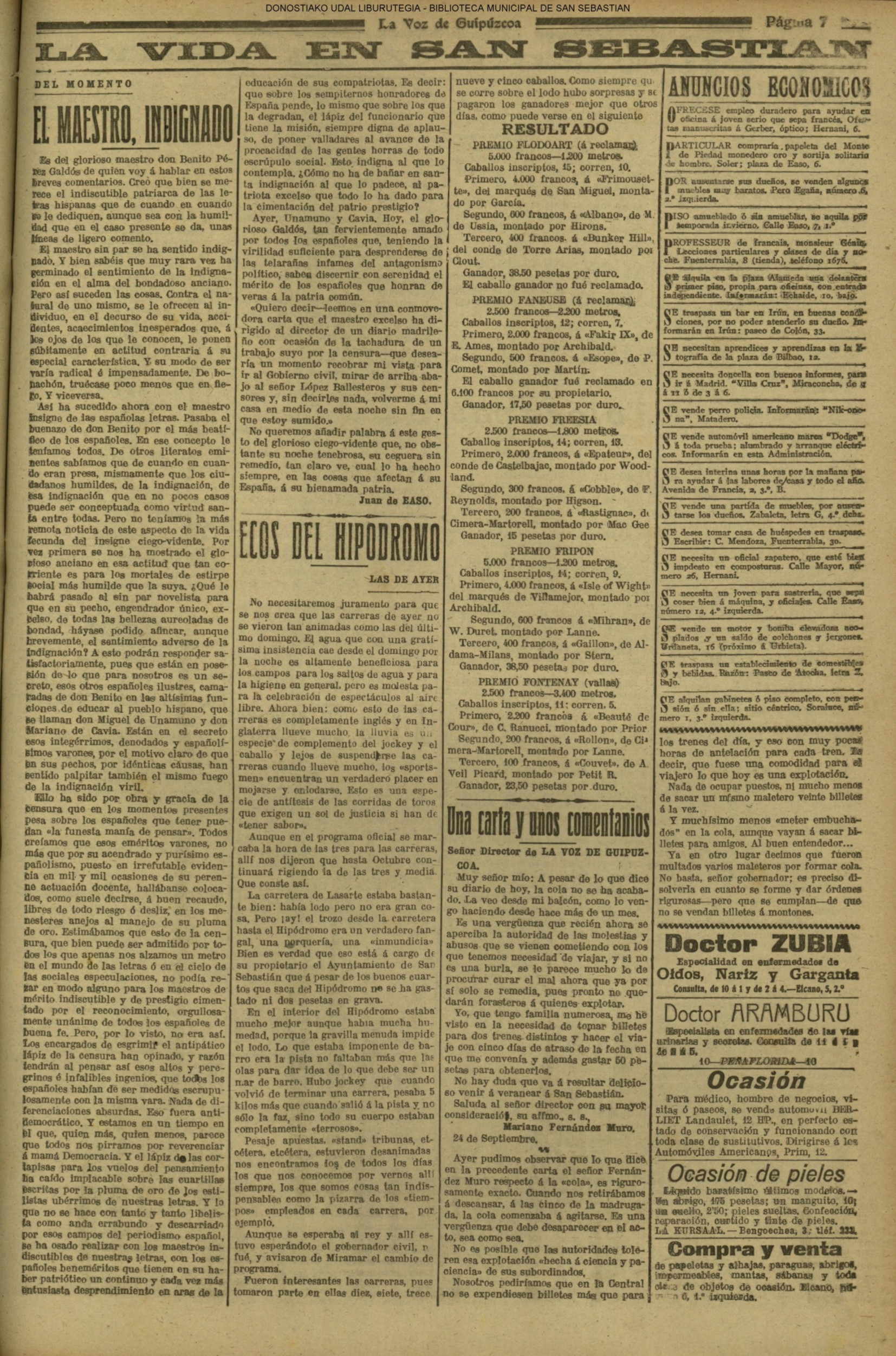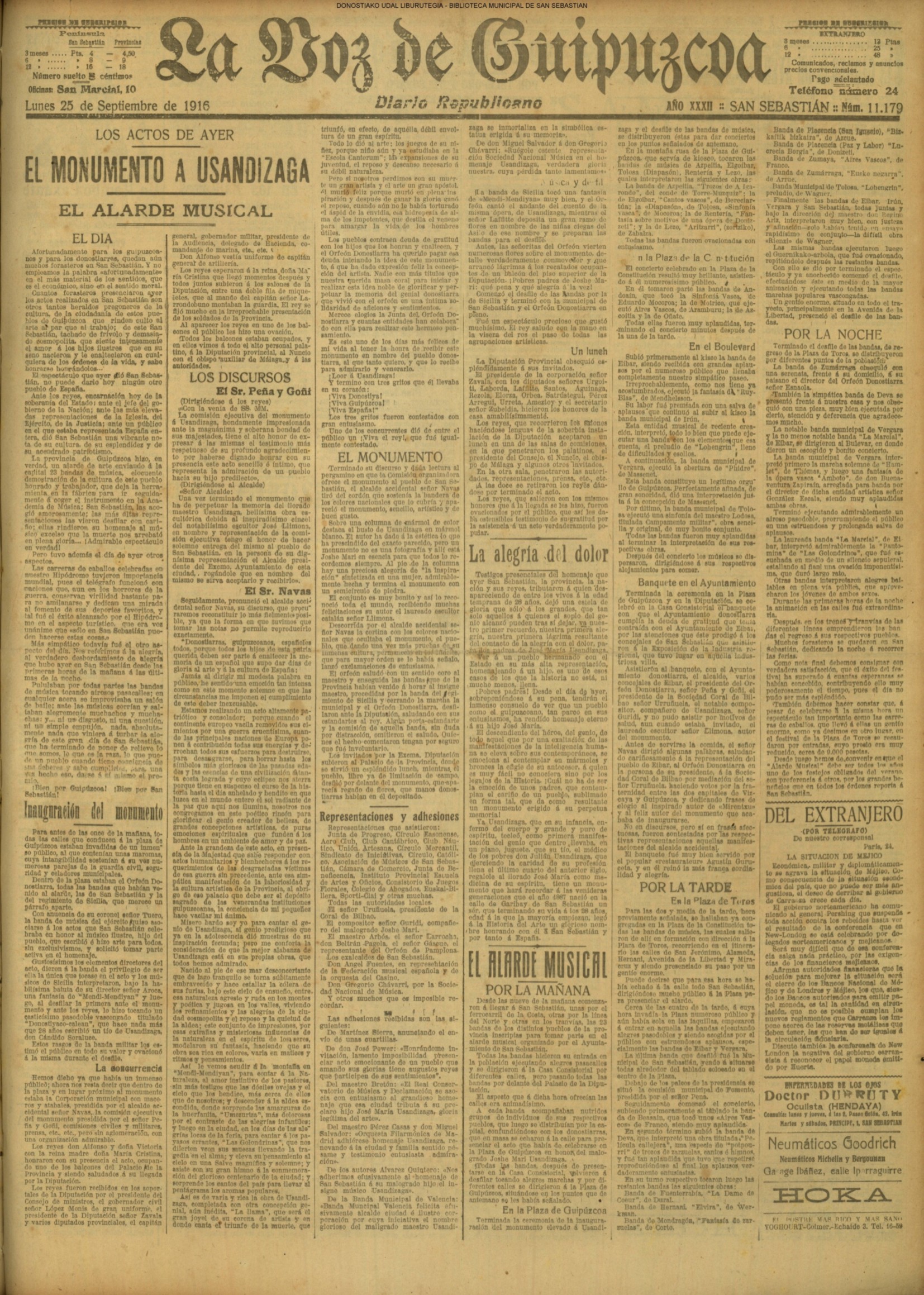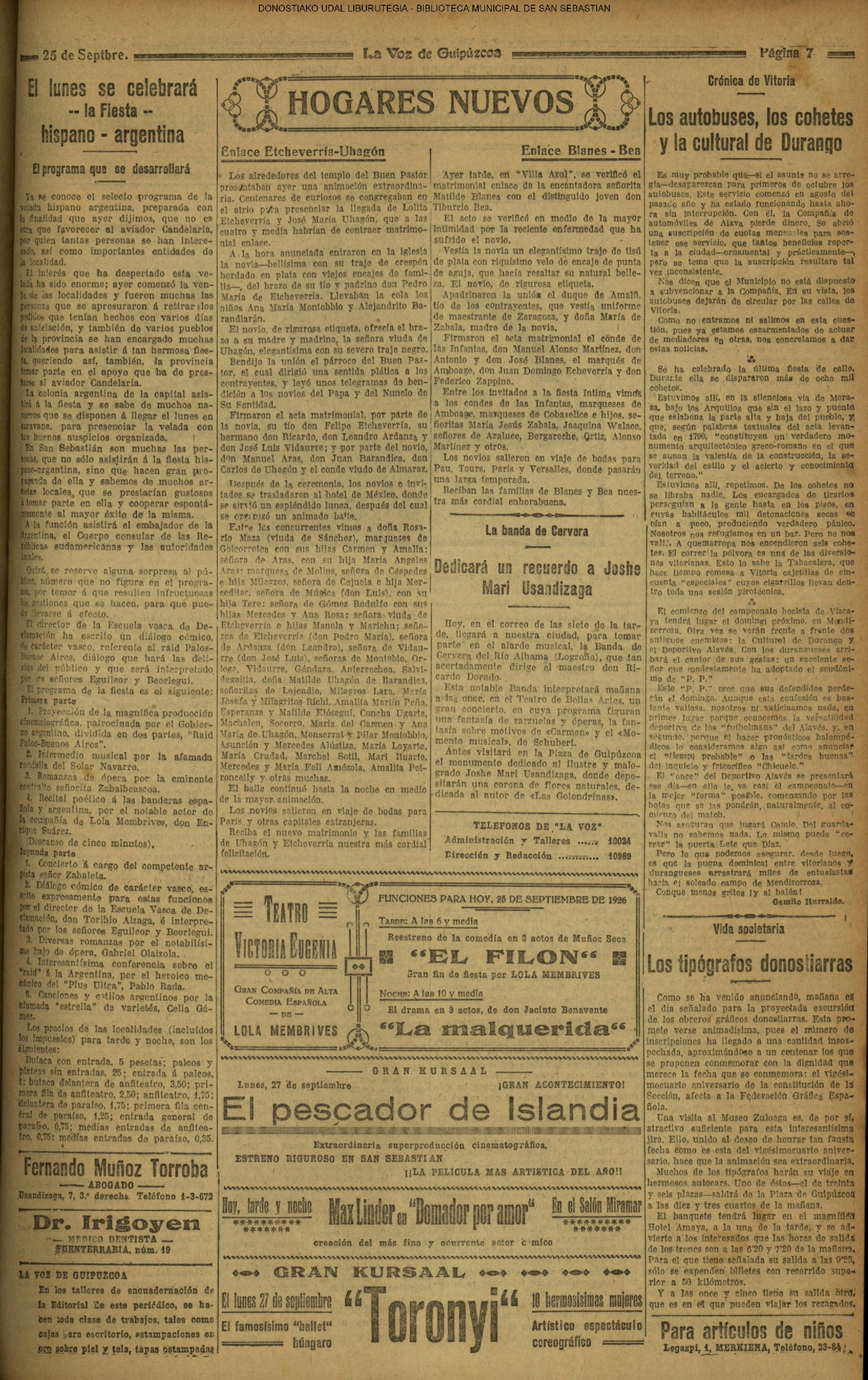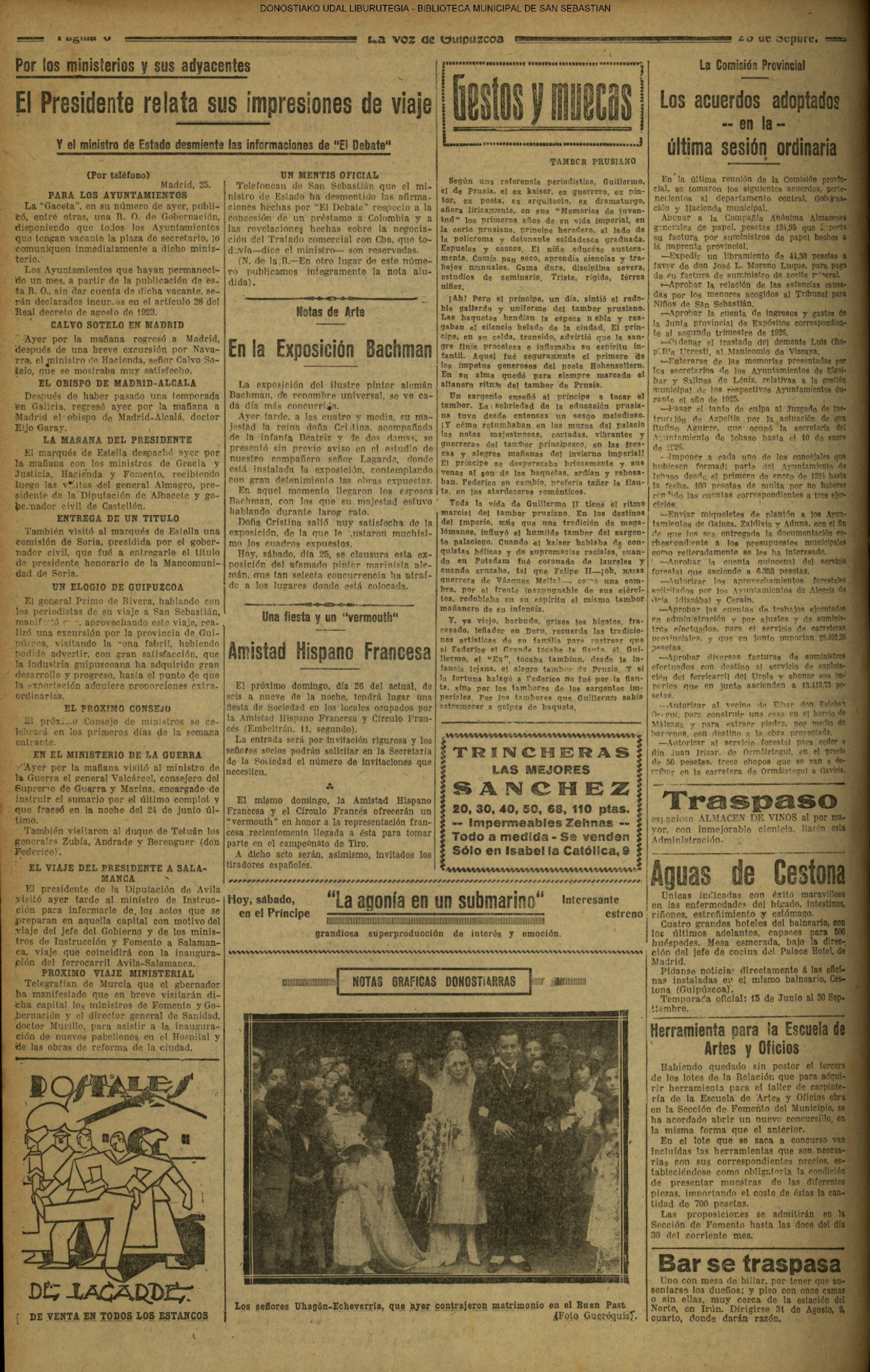 24 - septiembre![]() . | (1931) - LA VOZ DE GUIPUZCOA (CENTROS OFICIALES) # CONCIERTO DE NICANOR ZABALETA (La voz de Guipuzcoa)(El Pueblo Vasco)(El Día)(La Constancia) ++++++++++++++++++++++++++++++++++++++++++++++ # TRIBUNAS DONOSTIARRAS.- La escritora Halma Angélico disertó en el Circulo Radical-Socialista sobre "Mayorazgos espirituales de la mujer". (La voz de Guipuzcoa/cont)(El Pueblo Vasco)(El Día)(La Constancia) # LA SEMANA VASCA (La voz de Guipuzcoa)(El Pueblo Vasco)(El Día)(La Constancia) # CENA, en ZUBI GAIN, en honor de los remeros del AMAIKAK-BAT (La voz de Guipuzcoa)(El Pueblo Vasco)(El Día)(La Constancia) ++++++++++++++++++++++++++++++++++++++++++++++ # EL PRESIDENTE EN SAN SEBASTIÁN.- Después de haber pasado la jornada en el Circuito de Lasarte, S.E. regresó por la noche a Madrid (La voz de Guipuzcoa)(El Pueblo Vasco)(El Día)(La Constancia) # EL ACONTECIMIENTO AUTOMOVILISTA ++++++++++++++++++++++++++++++++++++++++++++++ # LA SEMANA VASCA.- INAUGURACIÓN de la Exposición de escultura,pintura y fotografía (La voz de Guipuzcoa)(El Pueblo Vasco)(El Día)(La Constancia) ++++++++++++++++++++++++++++++++++++++++++++++ # EN LA CASA CONSISTORIAL. PLENO MUNICIPAL .- Pasó a estudio de la Comisión de Hacienda, un informe proponiendo una justa elevación de sueldos para el personal médico municipal.- Tratóse de la honorabilidad -puesta en entredicho- de un gestor contra quien antes de serlo se presentó una denuncia por fraude (La voz de Guipuzcoa)(El Pueblo Vasco)(El Día)(La Constancia) # IX SEMANA VASCA .- Han comenzado con gran éxito los concursos de "aizkolaris" y "bolaris" (La voz de Guipuzcoa)(El Pueblo Vasco)(El Día)(La Constancia) |