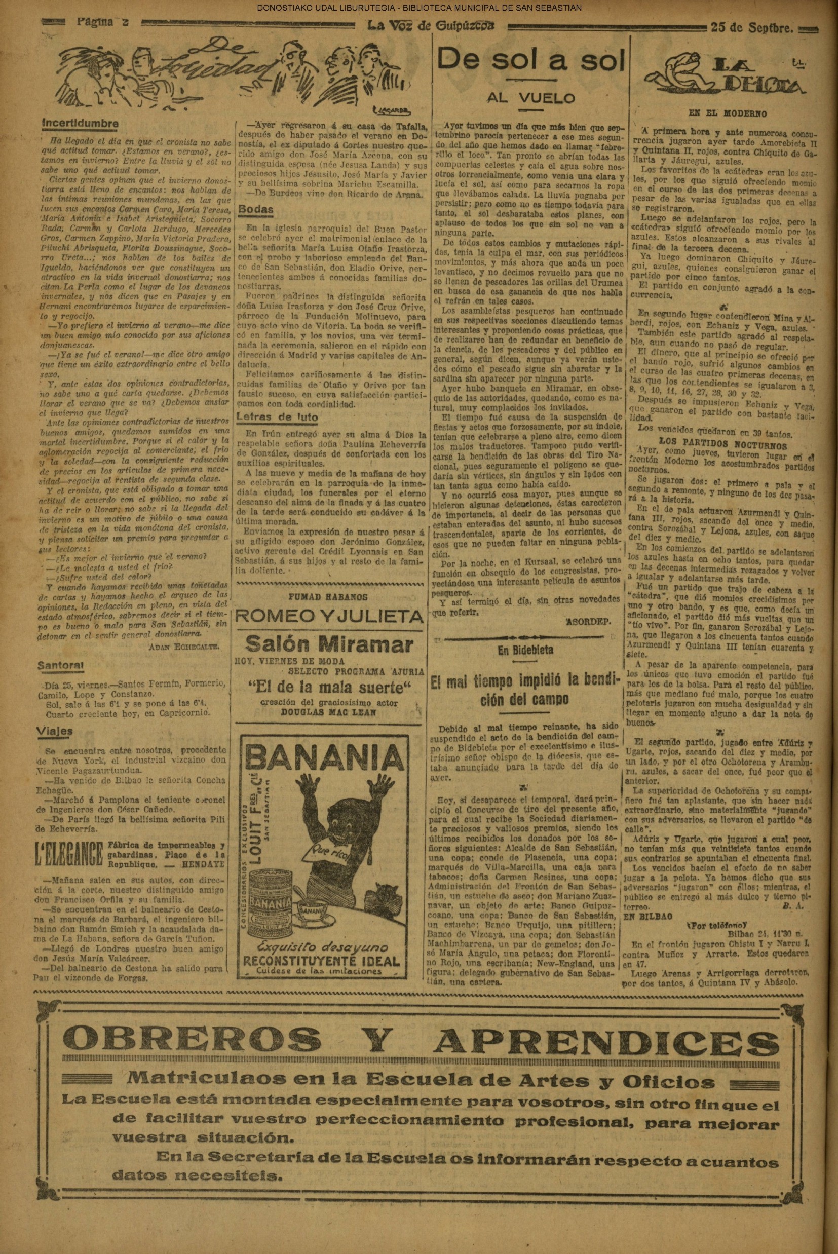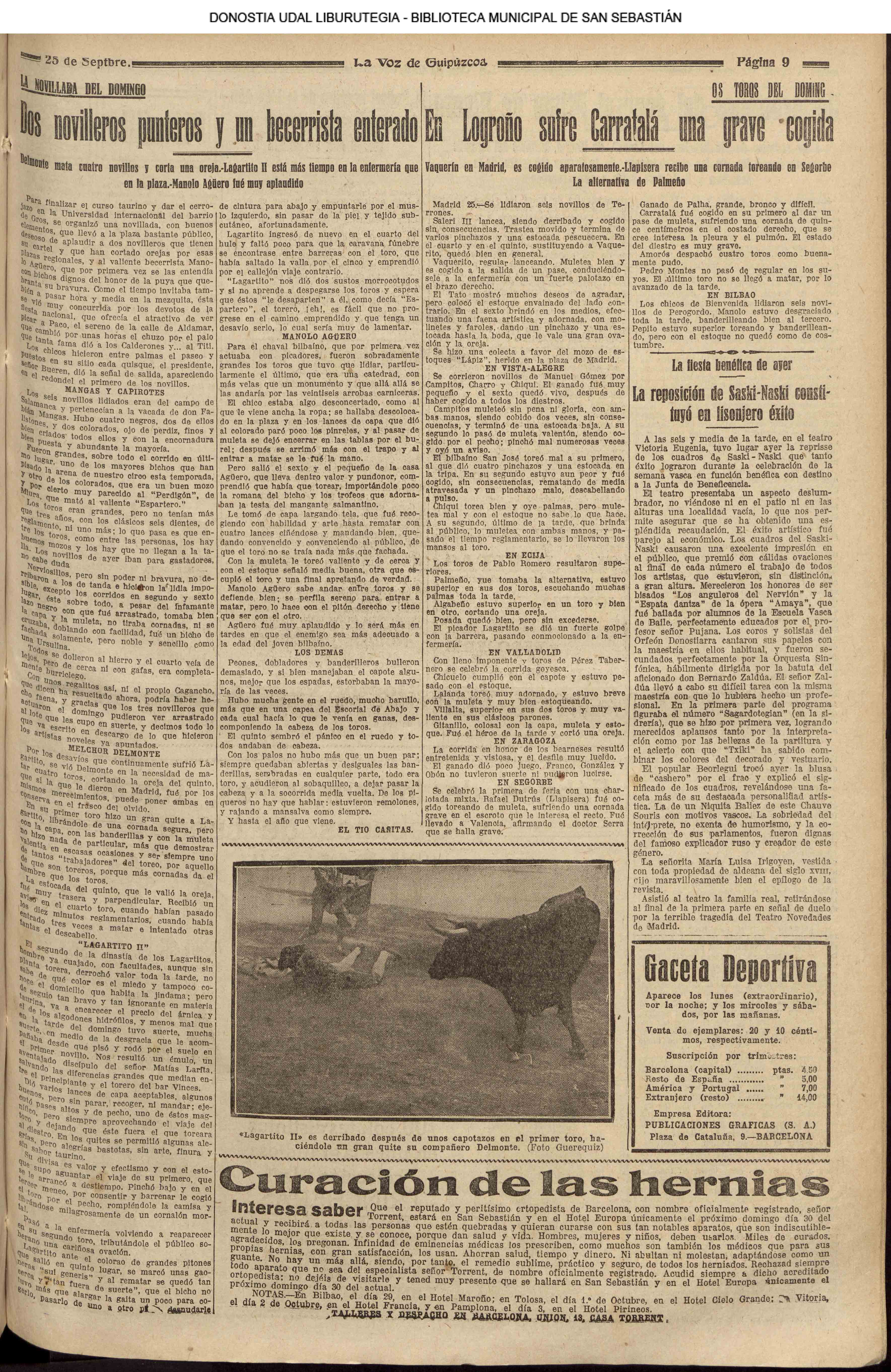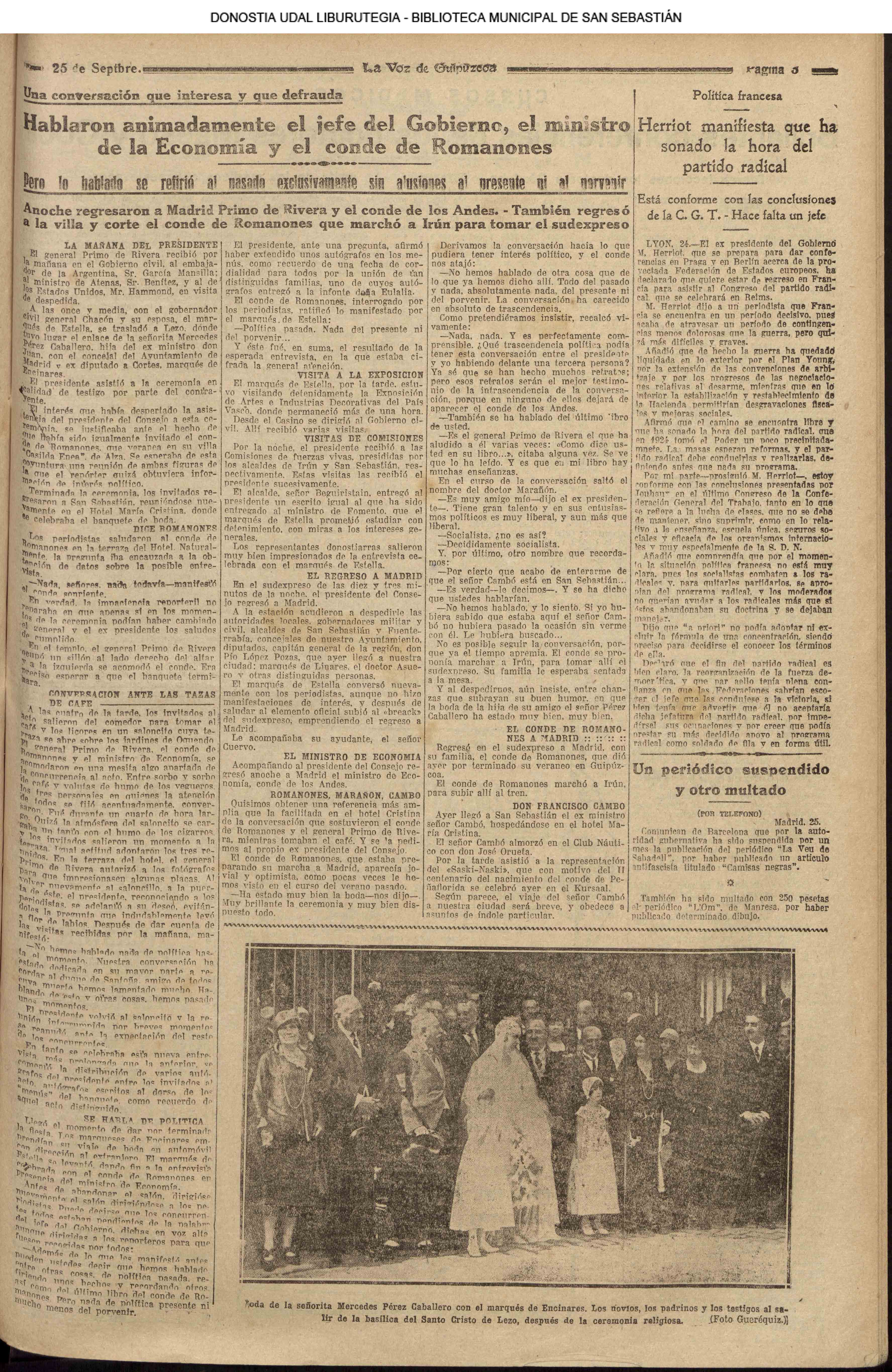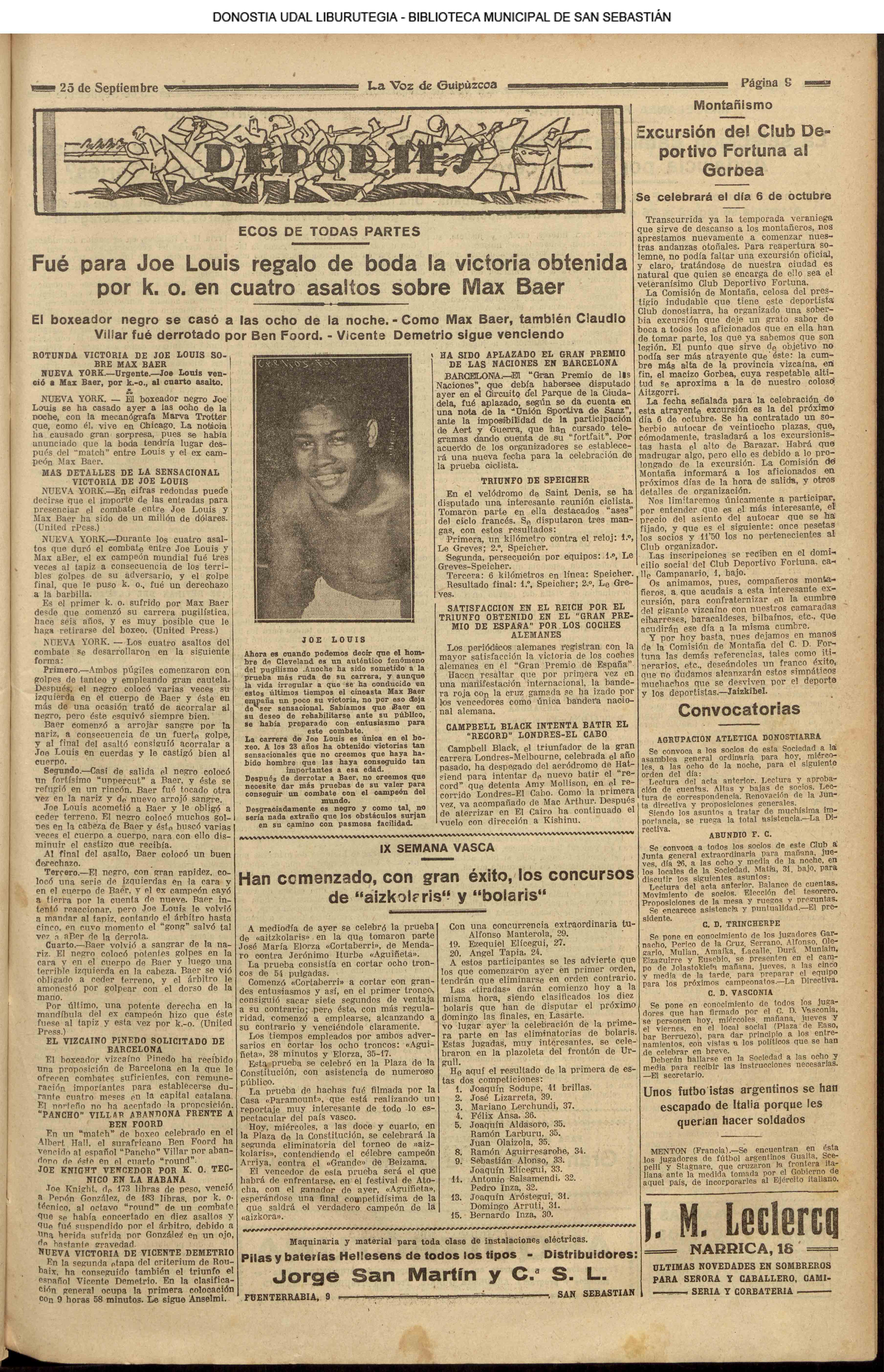 24 - septiembre![]() . | (1931) - LA VOZ DE GUIPUZCOA (CENTROS OFICIALES) # CONCIERTO DE NICANOR ZABALETA (La voz de Guipuzcoa)(El Pueblo Vasco)(El Día)(La Constancia) ++++++++++++++++++++++++++++++++++++++++++++++ # TRIBUNAS DONOSTIARRAS.- La escritora Halma Angélico disertó en el Circulo Radical-Socialista sobre "Mayorazgos espirituales de la mujer". (La voz de Guipuzcoa/cont)(El Pueblo Vasco)(El Día)(La Constancia) # LA SEMANA VASCA (La voz de Guipuzcoa)(El Pueblo Vasco)(El Día)(La Constancia) # CENA, en ZUBI GAIN, en honor de los remeros del AMAIKAK-BAT (La voz de Guipuzcoa)(El Pueblo Vasco)(El Día)(La Constancia) ++++++++++++++++++++++++++++++++++++++++++++++ # EL PRESIDENTE EN SAN SEBASTIÁN.- Después de haber pasado la jornada en el Circuito de Lasarte, S.E. regresó por la noche a Madrid (La voz de Guipuzcoa)(El Pueblo Vasco)(El Día)(La Constancia) # EL ACONTECIMIENTO AUTOMOVILISTA ++++++++++++++++++++++++++++++++++++++++++++++ # LA SEMANA VASCA.- INAUGURACIÓN de la Exposición de escultura,pintura y fotografía (La voz de Guipuzcoa)(El Pueblo Vasco)(El Día)(La Constancia) ++++++++++++++++++++++++++++++++++++++++++++++ # EN LA CASA CONSISTORIAL. PLENO MUNICIPAL .- Pasó a estudio de la Comisión de Hacienda, un informe proponiendo una justa elevación de sueldos para el personal médico municipal.- Tratóse de la honorabilidad -puesta en entredicho- de un gestor contra quien antes de serlo se presentó una denuncia por fraude (La voz de Guipuzcoa)(El Pueblo Vasco)(El Día)(La Constancia) # IX SEMANA VASCA .- Han comenzado con gran éxito los concursos de "aizkolaris" y "bolaris" (La voz de Guipuzcoa)(El Pueblo Vasco)(El Día)(La Constancia) |