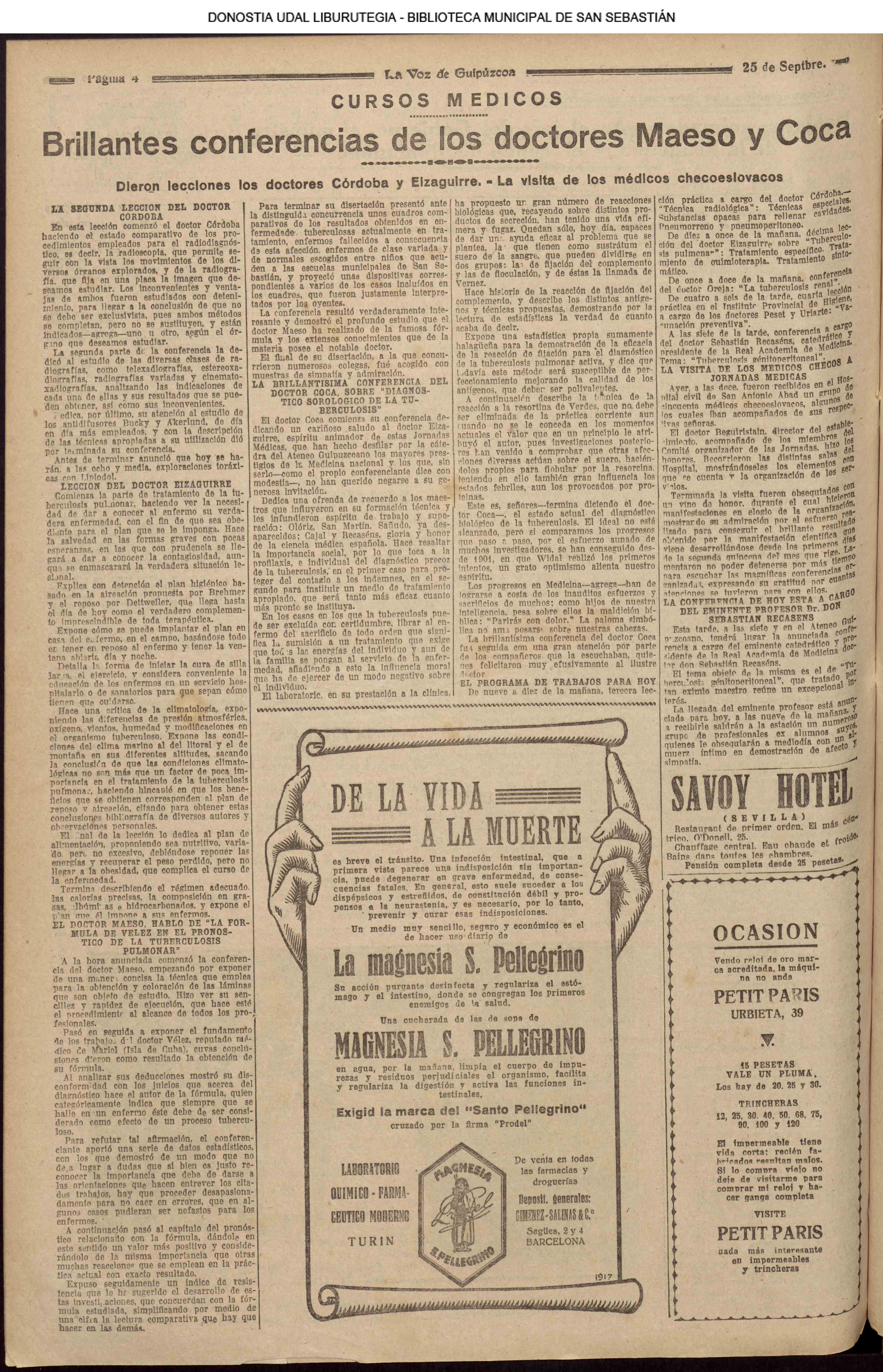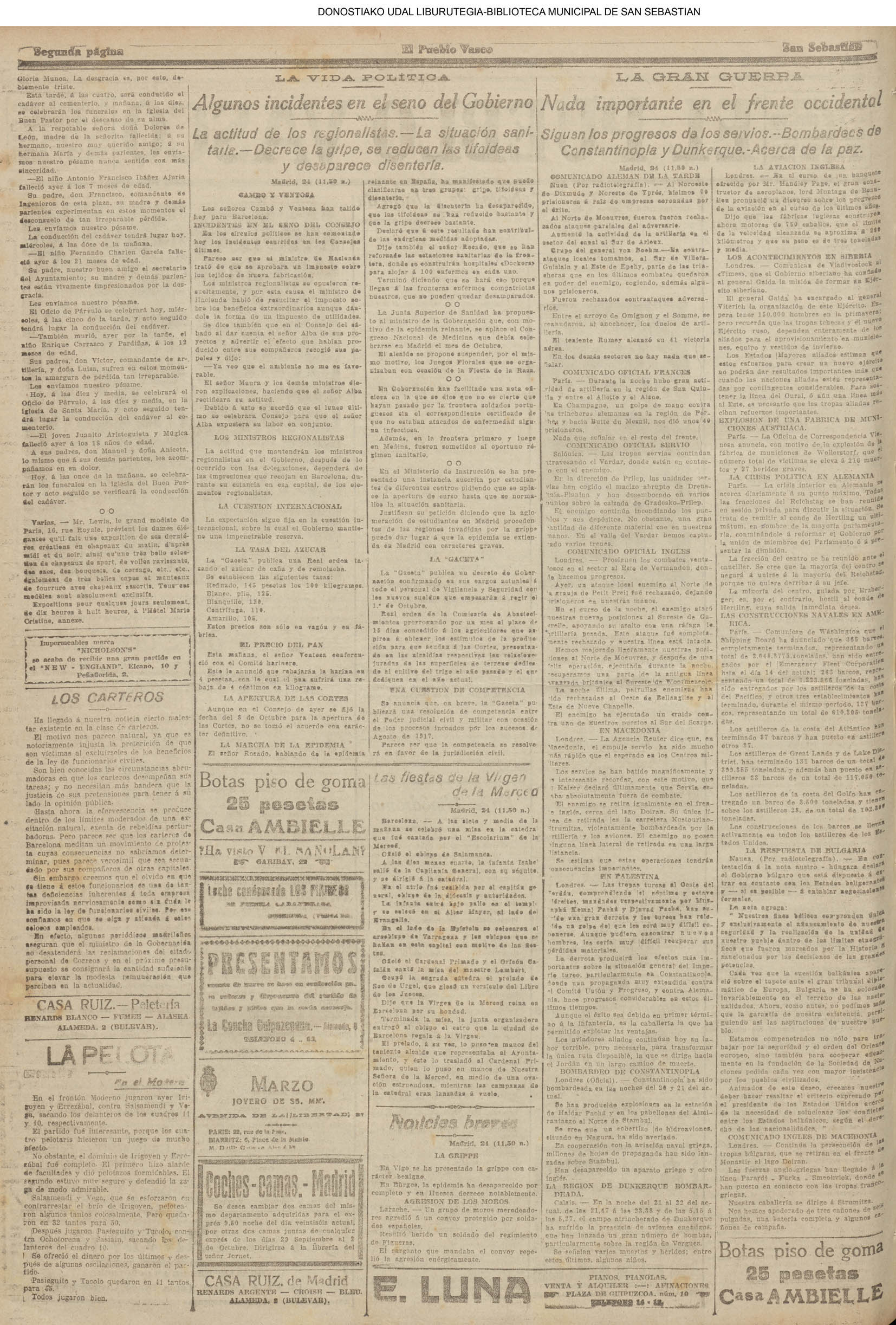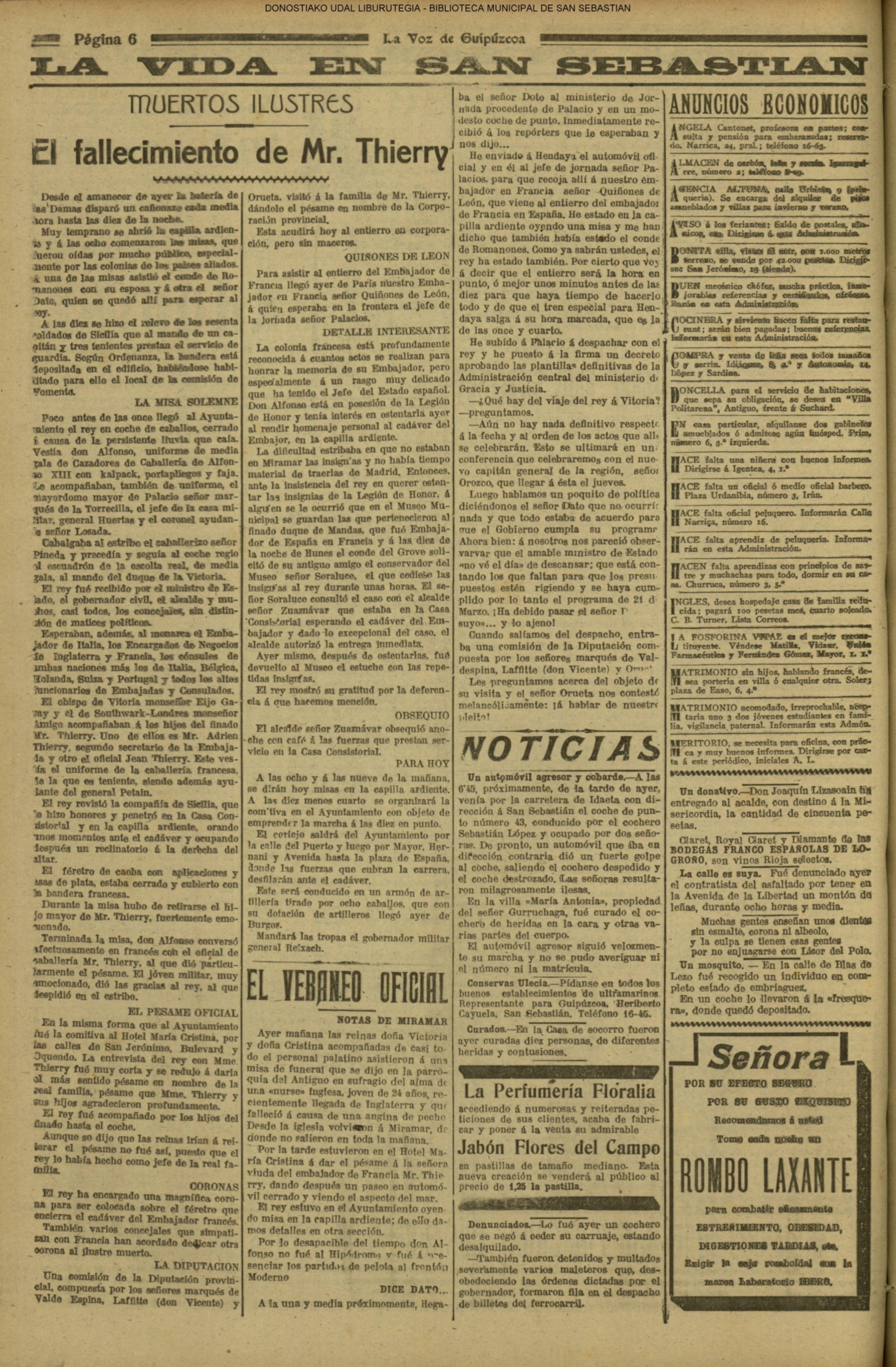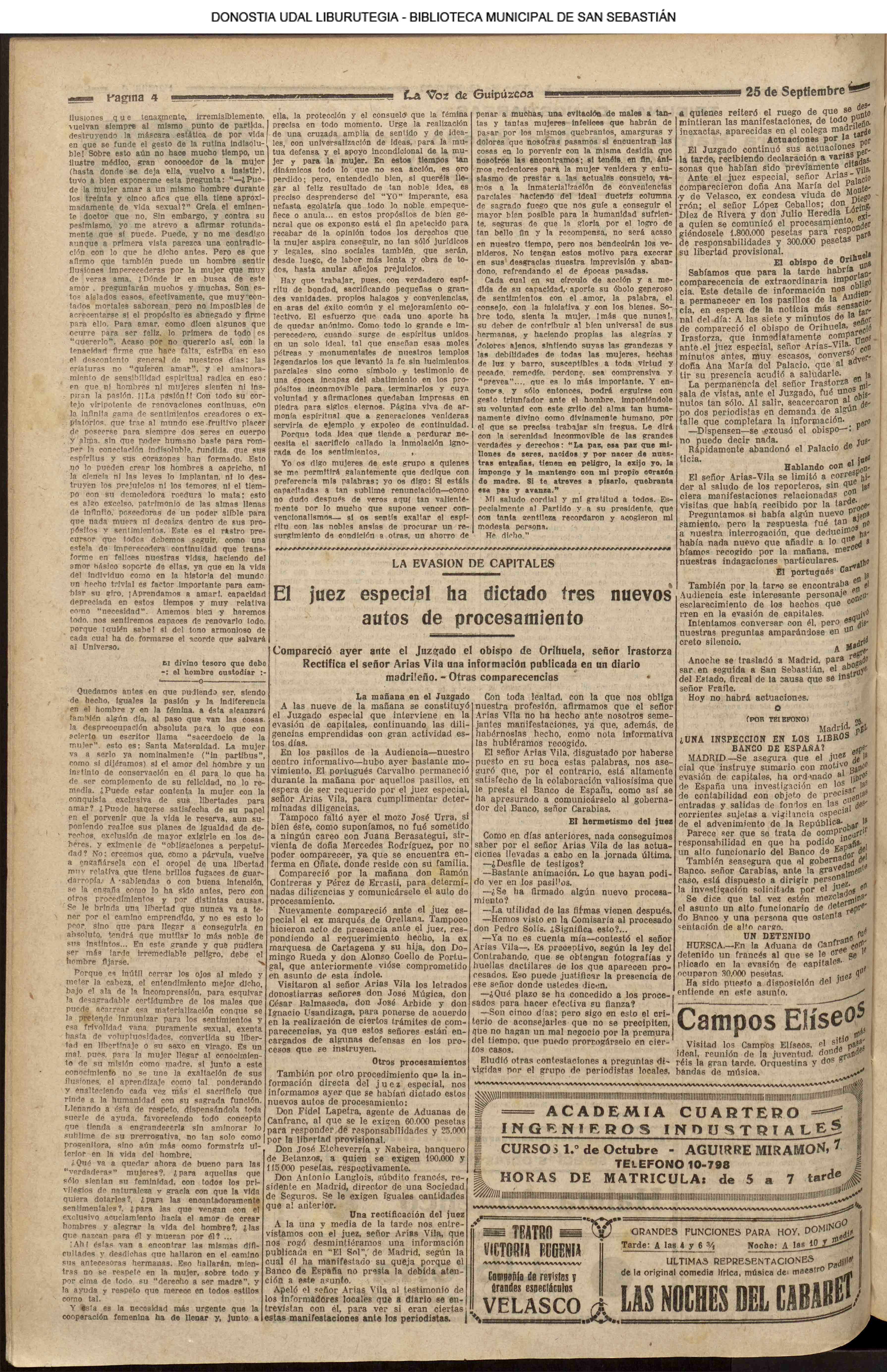 24 - septiembre![]() . | (1931) - LA VOZ DE GUIPUZCOA (CENTROS OFICIALES) # CONCIERTO DE NICANOR ZABALETA (La voz de Guipuzcoa)(El Pueblo Vasco)(El Día)(La Constancia) ++++++++++++++++++++++++++++++++++++++++++++++ # TRIBUNAS DONOSTIARRAS.- La escritora Halma Angélico disertó en el Circulo Radical-Socialista sobre "Mayorazgos espirituales de la mujer". (La voz de Guipuzcoa/cont)(El Pueblo Vasco)(El Día)(La Constancia) # LA SEMANA VASCA (La voz de Guipuzcoa)(El Pueblo Vasco)(El Día)(La Constancia) # CENA, en ZUBI GAIN, en honor de los remeros del AMAIKAK-BAT (La voz de Guipuzcoa)(El Pueblo Vasco)(El Día)(La Constancia) ++++++++++++++++++++++++++++++++++++++++++++++ # EL PRESIDENTE EN SAN SEBASTIÁN.- Después de haber pasado la jornada en el Circuito de Lasarte, S.E. regresó por la noche a Madrid (La voz de Guipuzcoa)(El Pueblo Vasco)(El Día)(La Constancia) # EL ACONTECIMIENTO AUTOMOVILISTA ++++++++++++++++++++++++++++++++++++++++++++++ # LA SEMANA VASCA.- INAUGURACIÓN de la Exposición de escultura,pintura y fotografía (La voz de Guipuzcoa)(El Pueblo Vasco)(El Día)(La Constancia) ++++++++++++++++++++++++++++++++++++++++++++++ # EN LA CASA CONSISTORIAL. PLENO MUNICIPAL .- Pasó a estudio de la Comisión de Hacienda, un informe proponiendo una justa elevación de sueldos para el personal médico municipal.- Tratóse de la honorabilidad -puesta en entredicho- de un gestor contra quien antes de serlo se presentó una denuncia por fraude (La voz de Guipuzcoa)(El Pueblo Vasco)(El Día)(La Constancia) # IX SEMANA VASCA .- Han comenzado con gran éxito los concursos de "aizkolaris" y "bolaris" (La voz de Guipuzcoa)(El Pueblo Vasco)(El Día)(La Constancia) |