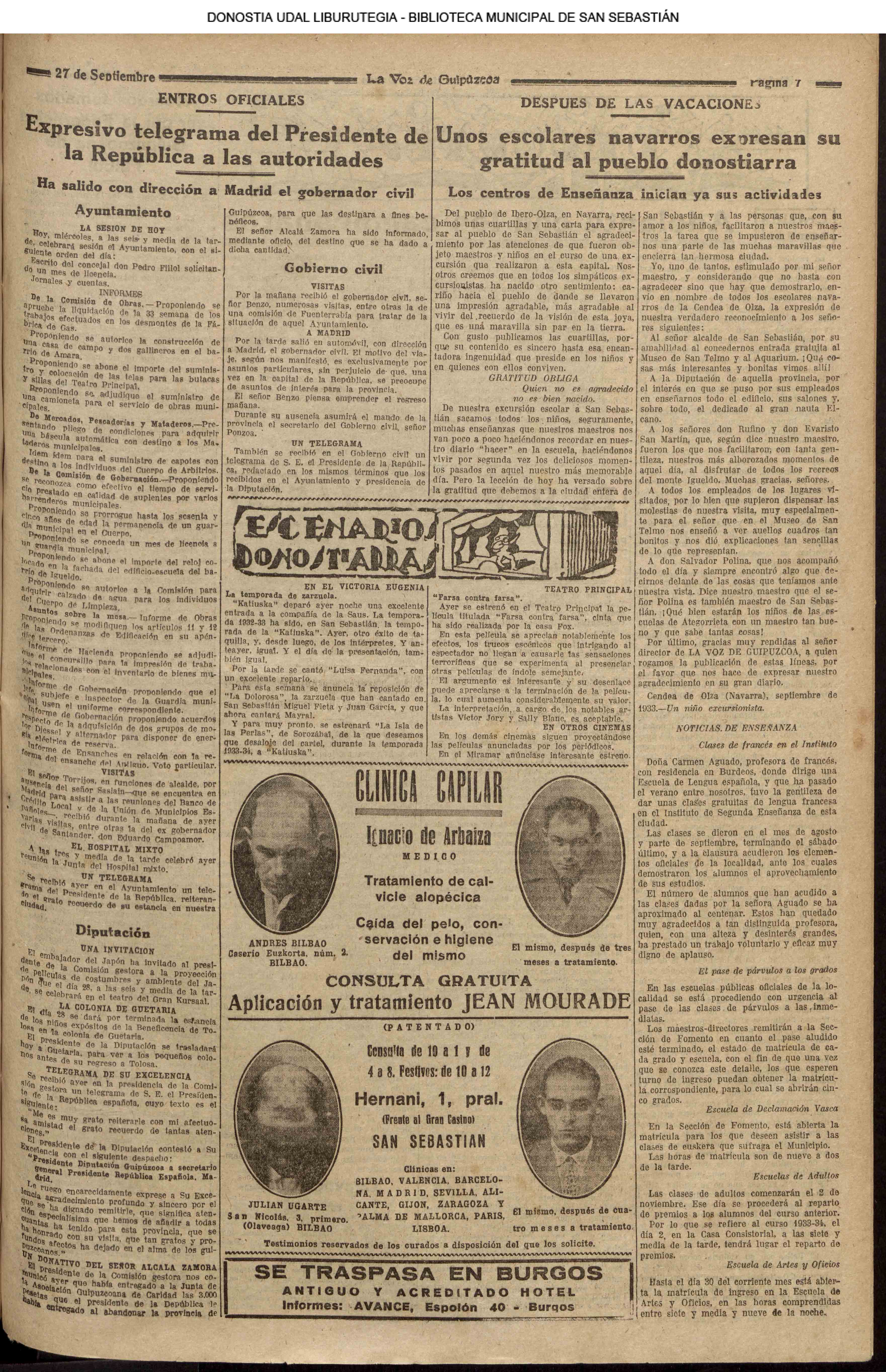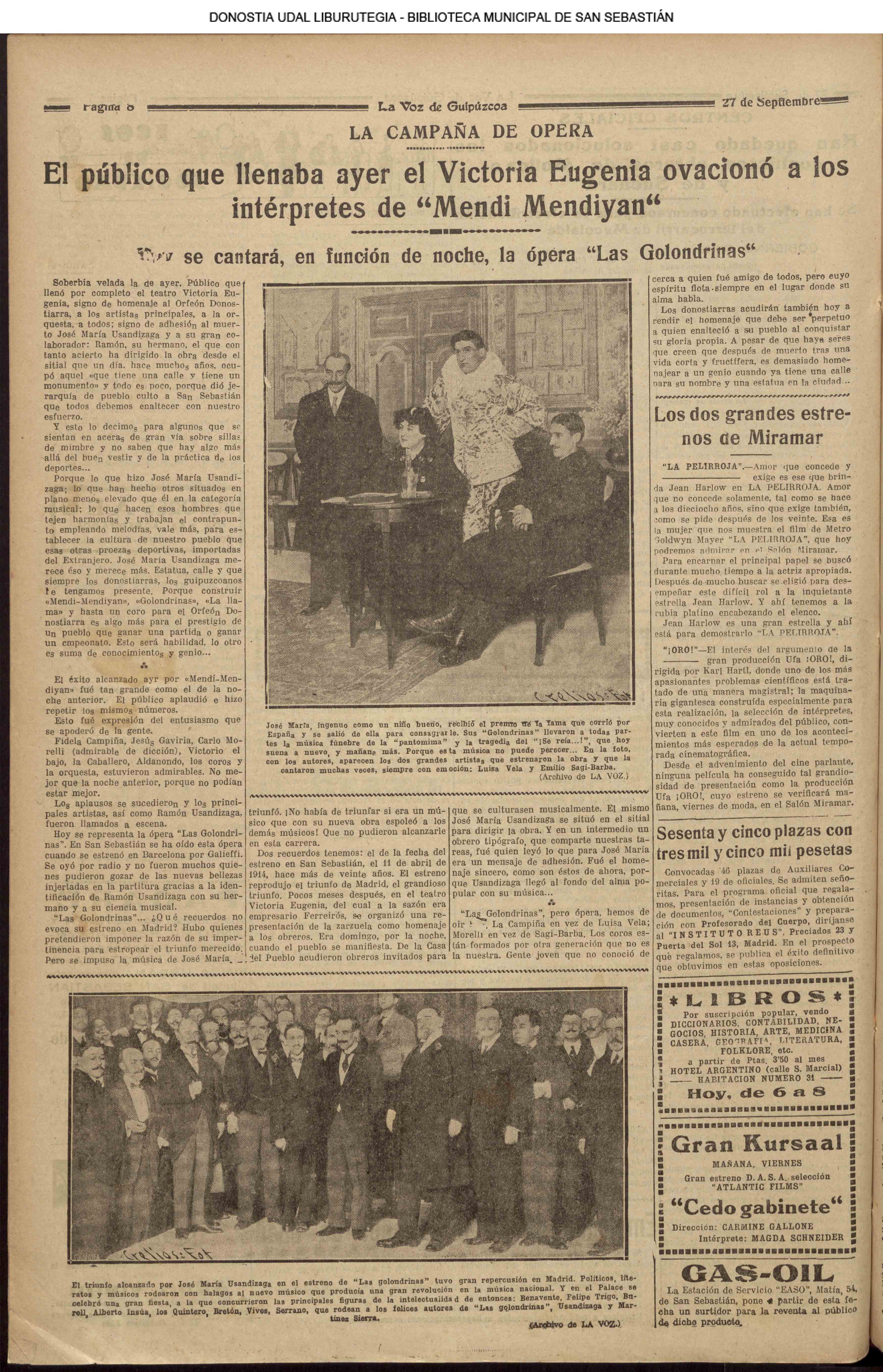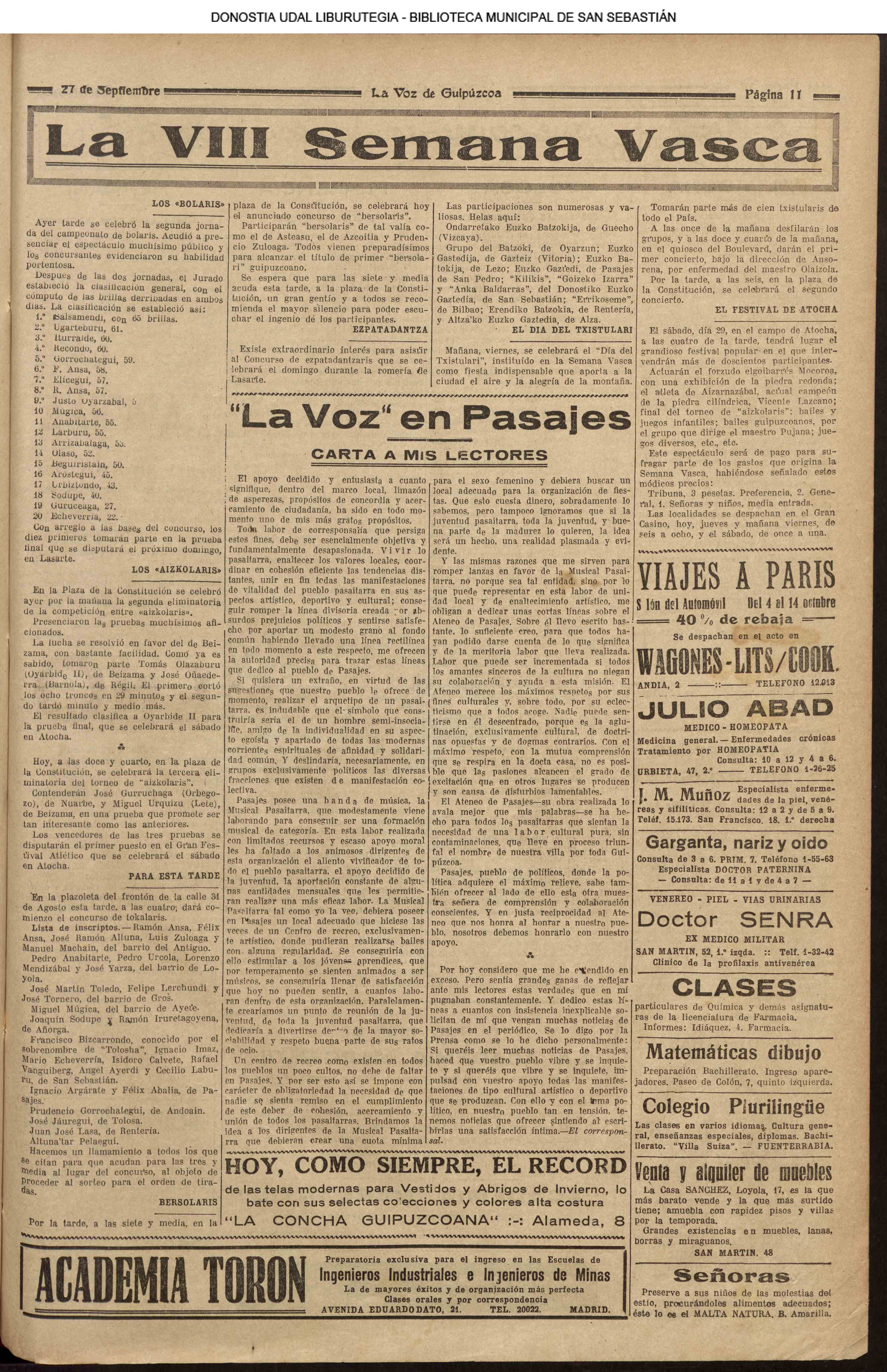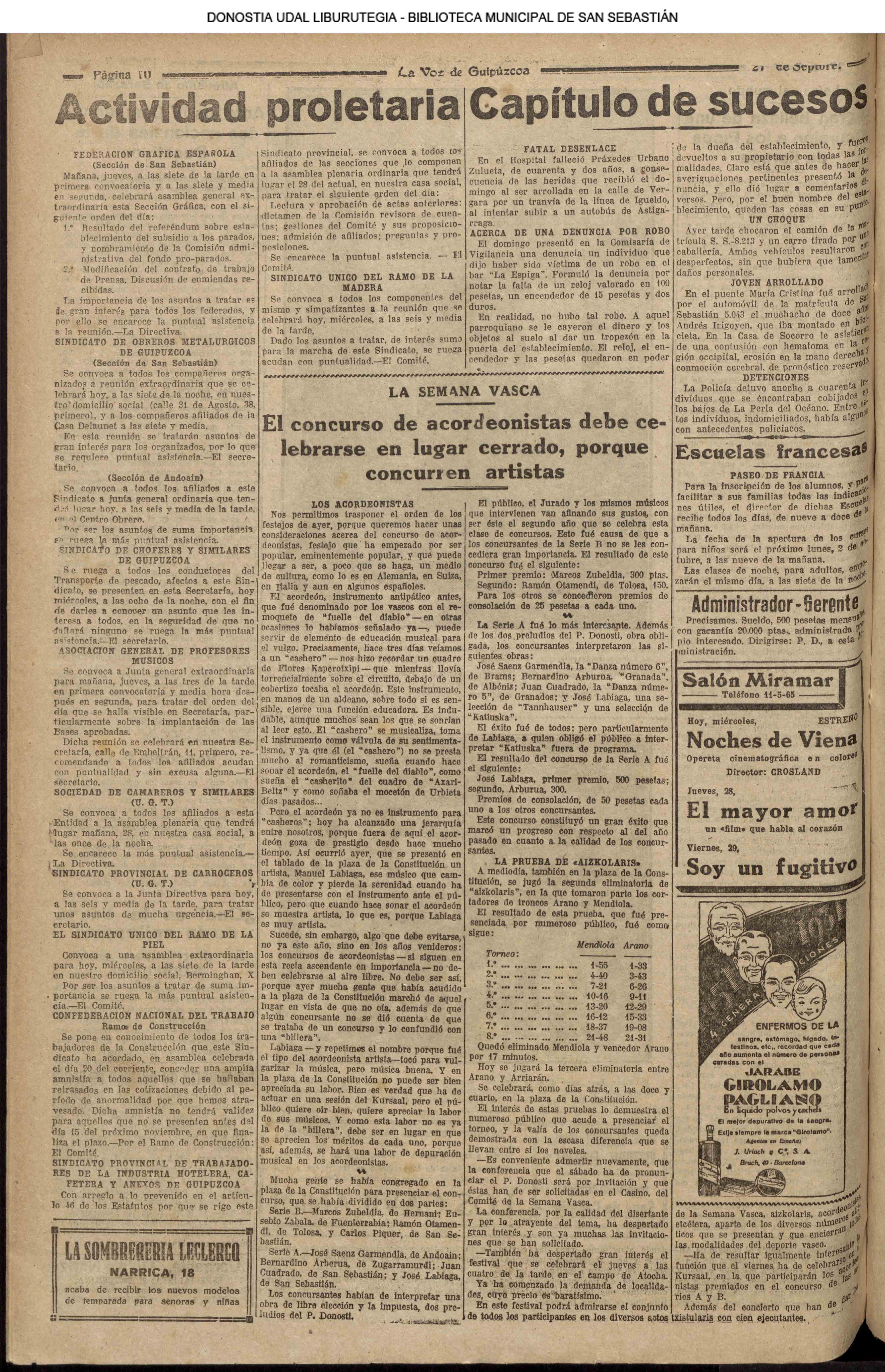 26 - septiembre![]() . | (1931) - LA VOZ DE GUIPUZCOA (CENTROS OFICIALES) # EL HOMENAJE A LUIS IRASTORZA.- Un acto magníficamente cordial. (La voz de Guipuzcoa)(El Pueblo Vasco)(El Día)(La Constancia) ++++++++++++++++++++++++++++++++++++++++++++++ (La voz de Guipuzcoa)(El Pueblo Vasco)(El Día)(La Constancia) ++++++++++++++++++++++++++++++++++++++++++++++ # EN EL INSTITUTO.- Se INAUGURÓ el II Congreso Internacional de Orientación Profesional Aplicada (La voz de Guipuzcoa)(El Pueblo Vasco)(El Día)(La Constancia) # LA SEMANA VASCA.- El concurso de acordeonistas debe celebrarse en lugar cerrado, porque concurren artistas (La voz de Guipuzcoa)(El Pueblo Vasco)(El Día)(La Constancia) ++++++++++++++++++++++++++++++++++++++++++++++ # LA CAMPAÑA DE ÓPERA.- El público que llenaba el Victoria Eugenia ovacionó a los intérpretes del "Mendi Mendiyan" (La voz de Guipuzcoa)(El Pueblo Vasco)(El Día)(La Constancia) # LA VIII SEMANA VASCA (La voz de Guipuzcoa)(El Pueblo Vasco)(El Día)(La Constancia) ++++++++++++++++++++++++++++++++++++++++++++++ # EN EL PALACIO PROVINCIAL- SESIÓN DE LA COMISIÓN GESTORA (La voz de Guipuzcoa)(El Pueblo Vasco)(El Día)(La Constancia) # COMISIÓN PROVINCIAL DE MONUMENTOS (La voz de Guipuzcoa)(El Pueblo Vasco)(El Día)(La Constancia) |