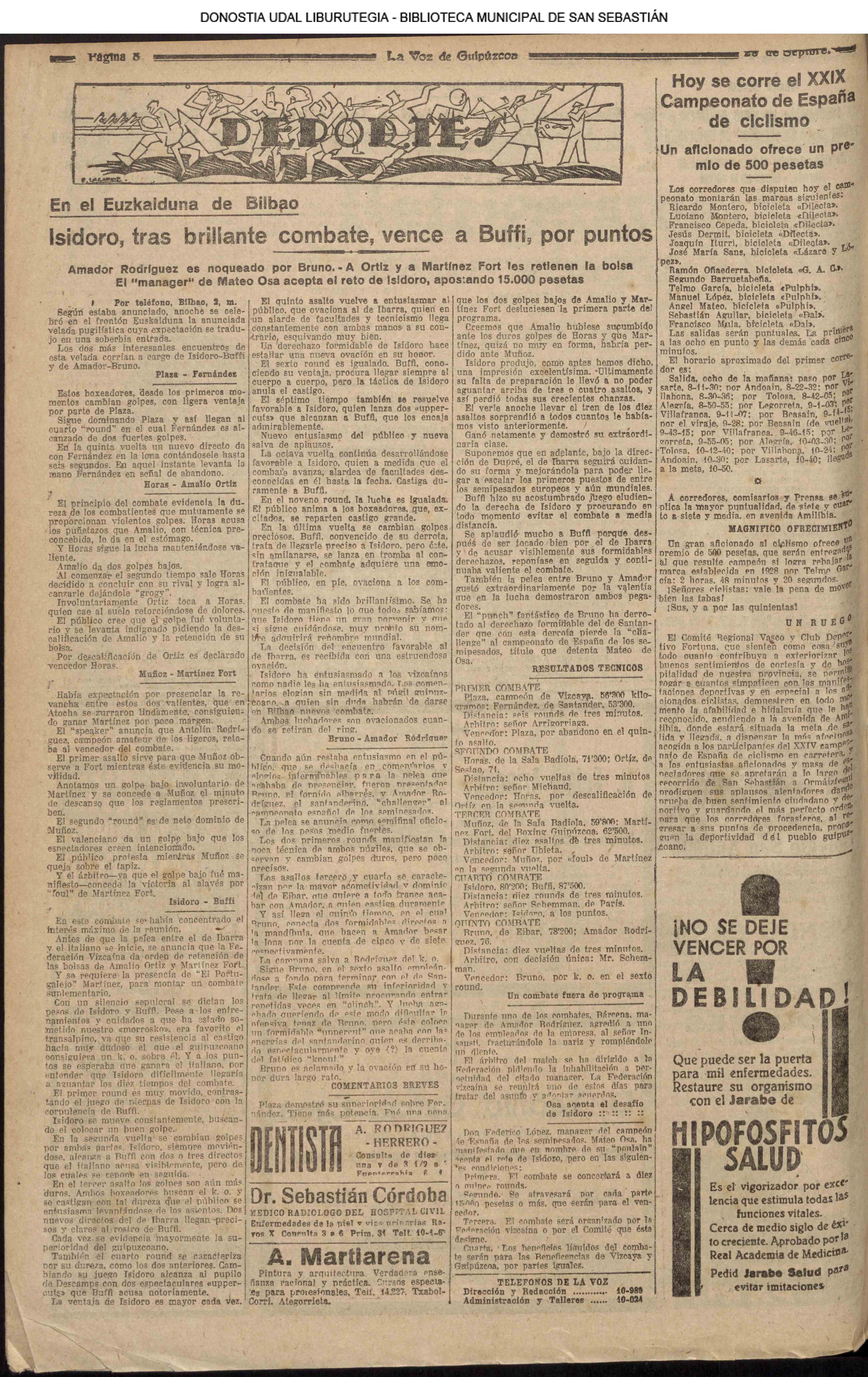(*).- Se realizó el sorteo de los "partants" que correrán en el Gran Premio automovilista de San Sebastián (p.11) (*).- LA PESCA # Mal día también hoy, al menos hasta mediada la tarde, para nuestros pescadores de vaporcitos y motoras. Sin embargo, hacia las cuatro arribó al puerto una embarcación conduciendo a bordo regular cantidad de acula. Los demás retrasaron su regreso al puerto, lo que hace suponer que traerían pescado. De pesca mayor llegó regular cantidad. Aunque declarada y efectiva la huelga, ésta ha cogido a muchos barcos en la mar y van regresando todos los días, desembarcando las capturas. Llegaron camiones de Santander, con pescado capturado por nuestros pesqueros que allí amarraron. (p.12)