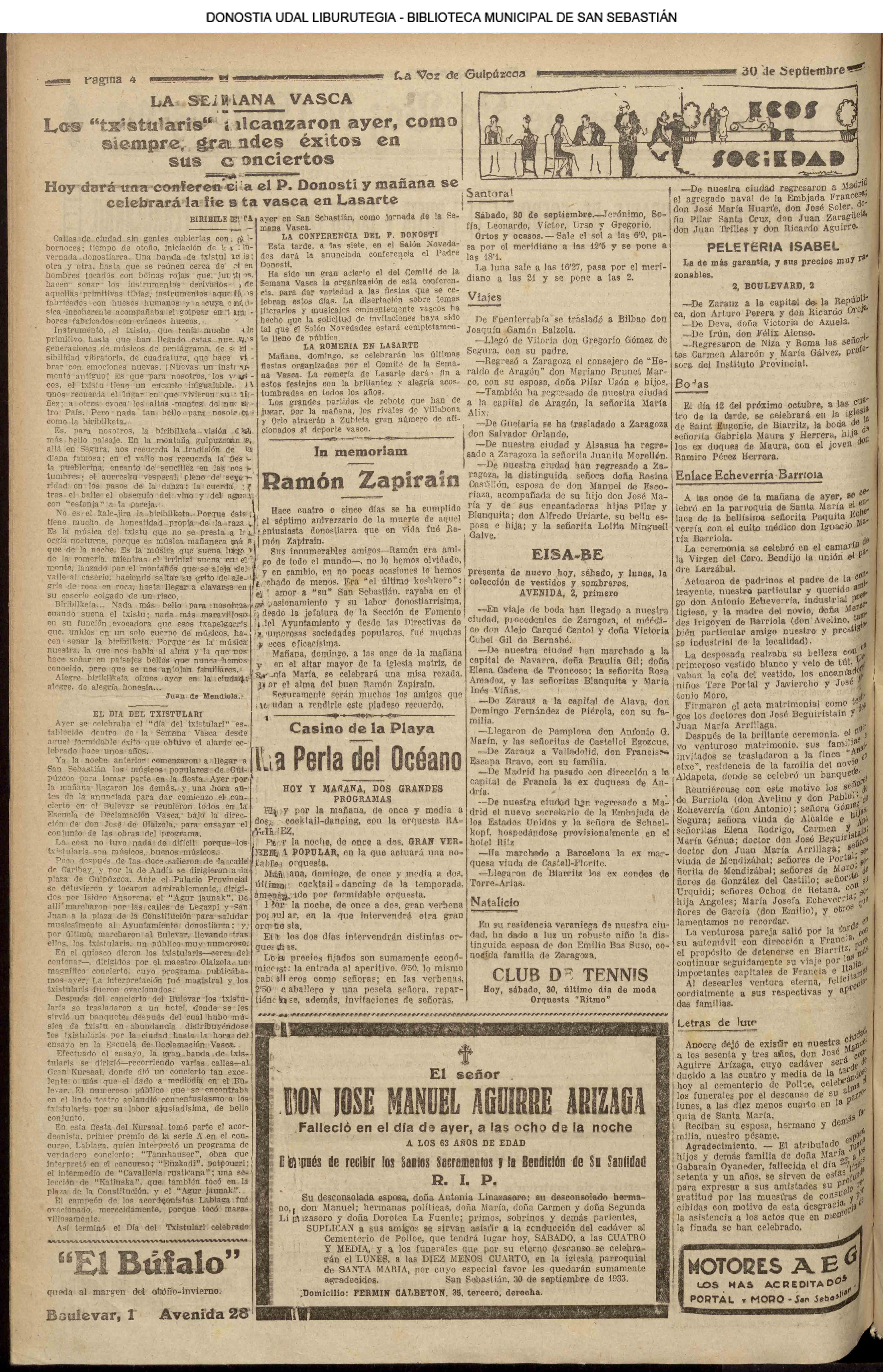 (*).- Frío al amanecer, temperatura suave durante todo el día, cielo azul. (SIRIMIRI. EL DIARIO VASCO. 30/09. p.12) (*).- SUCESOS: .- Dos jóvenes de Azkoitia muertos al estrellarse su coche contra un camión. Regresaban a casa después de haber pasado la noche en las fiestas de San Miguel de Oñati. .- Un hombre de 45 años se ahorca en Alza y deja una nota explicando el suicidio. (EL DIARIO VASCO. 30/09. p.07)