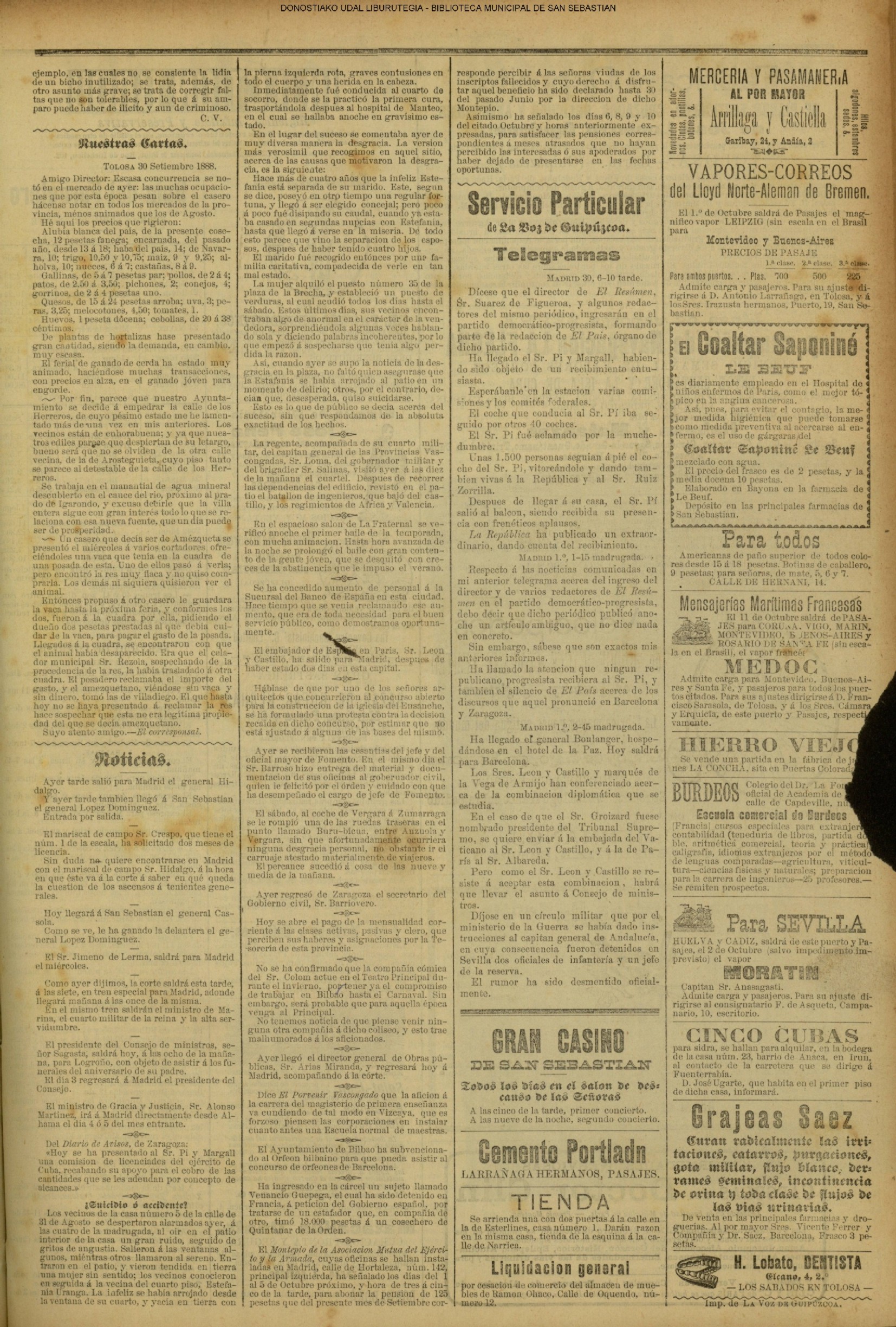 Animados de la bondad que V. E. nos manifiesta, no podemos menos de expresarle que a pesar de que nuestra esperanza se lisonjea, que por las representaciones hechas por V. E. al Lord y a nuestro gobierno, se darán mediaos para el restablecimiento de San Sebastián, recelamos con grave fundamento que la dispersión de la mayor parte de sus habitantes será indispensable si no se socorre con prontitud a aquel pueblo para los objetos más urgentes y no se remueven los obstáculos que deben necesariamente retraer a las gentes de ir a ocupar los pocos edificios que han quedado o las chozas que pudieran plantar provisionalmente.