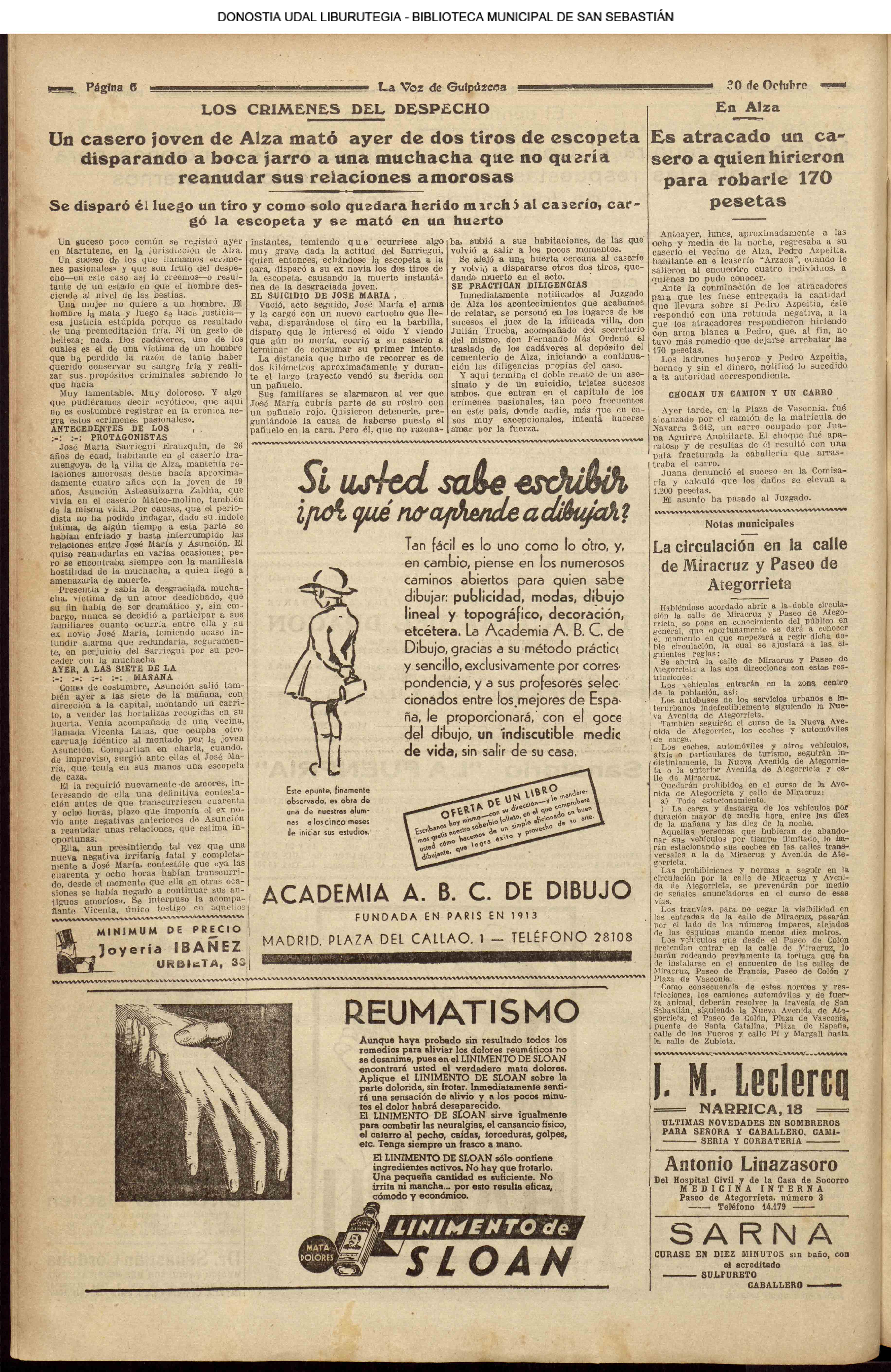 | @ - TRÁGICO SUCESO (Entre Alza y Martutene se registró una horrible tragedia.- Cumplido el plazo de cuarenta y ocho horas para su decisión, una joven fue muerta por su novio, que después se suicidó.- “Para qué voy a coser el abrigo si me van a matar?”.- “Mañana iré a confesar y comulgar”.- La infame acción fue objeto durante el día de innúmeros comentarios.) // LOS CRÍMENES DEL DESPECHO (Un casero joven de Alza mató de dos disparos de escopeta, disparando a bocajarro, a una muchacha que no quería reanudar sus relaciones amorosas.- Se disparó él,luego, un tiro y como quedara herido marchó al caserio, cargó la escopeta y se mató en un huerto ) // EN MARTUTENE .- Un joven cashero mata a su novia y se suicida con tesón.- El crimen fue porque la novia renunció a casarse en vista del peligroso carácter violento del novio |